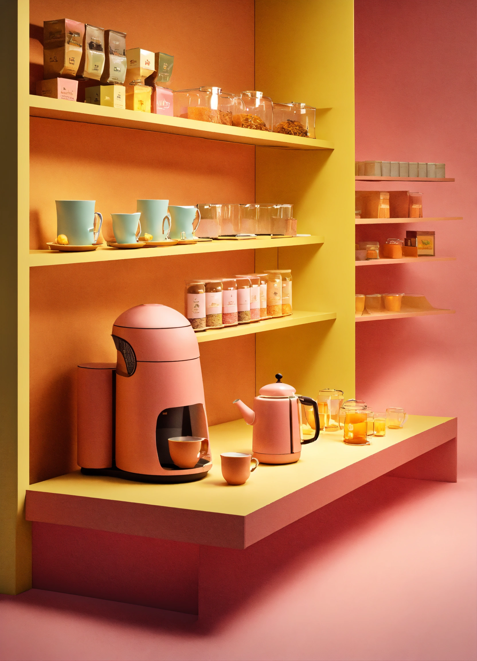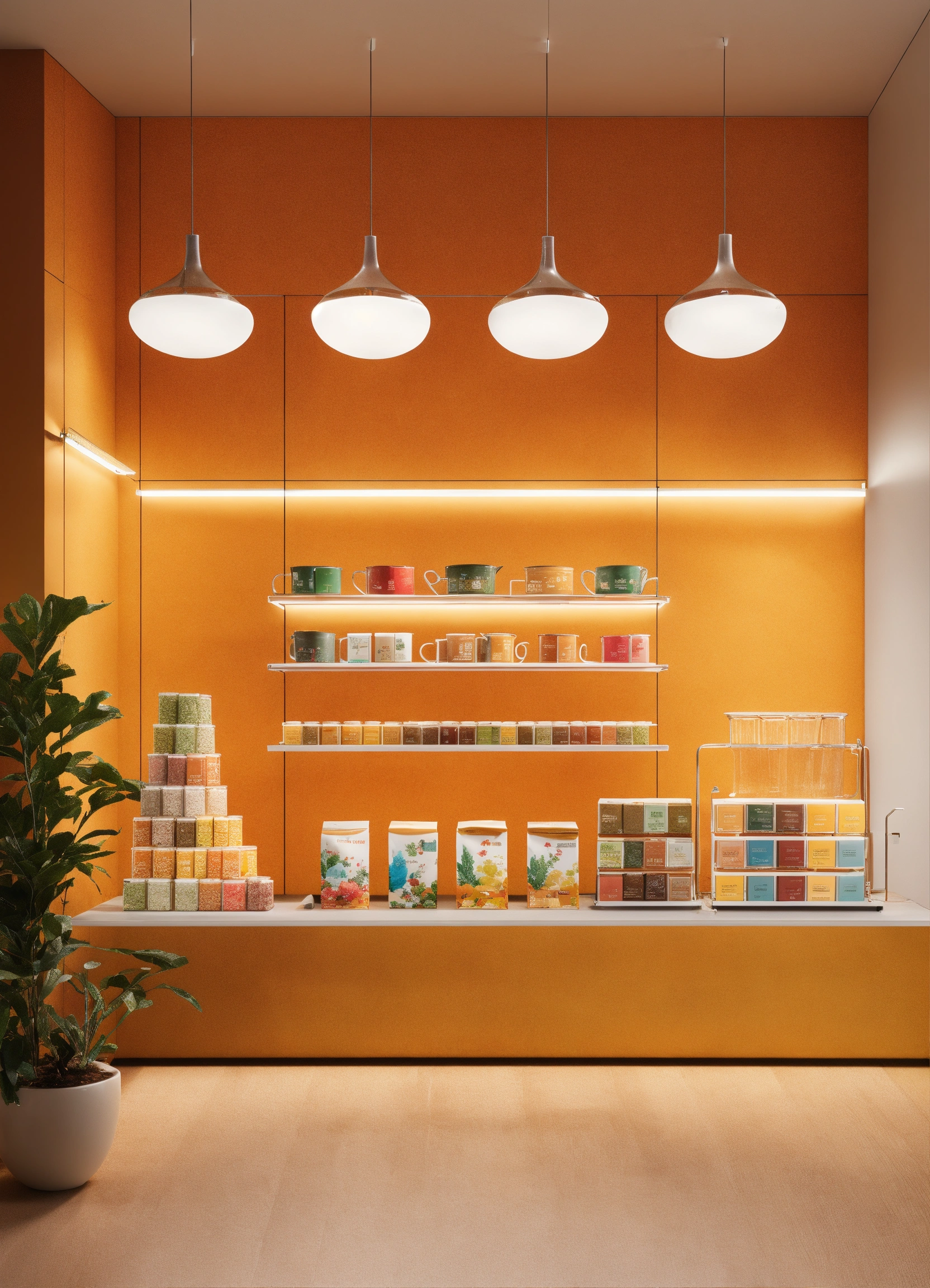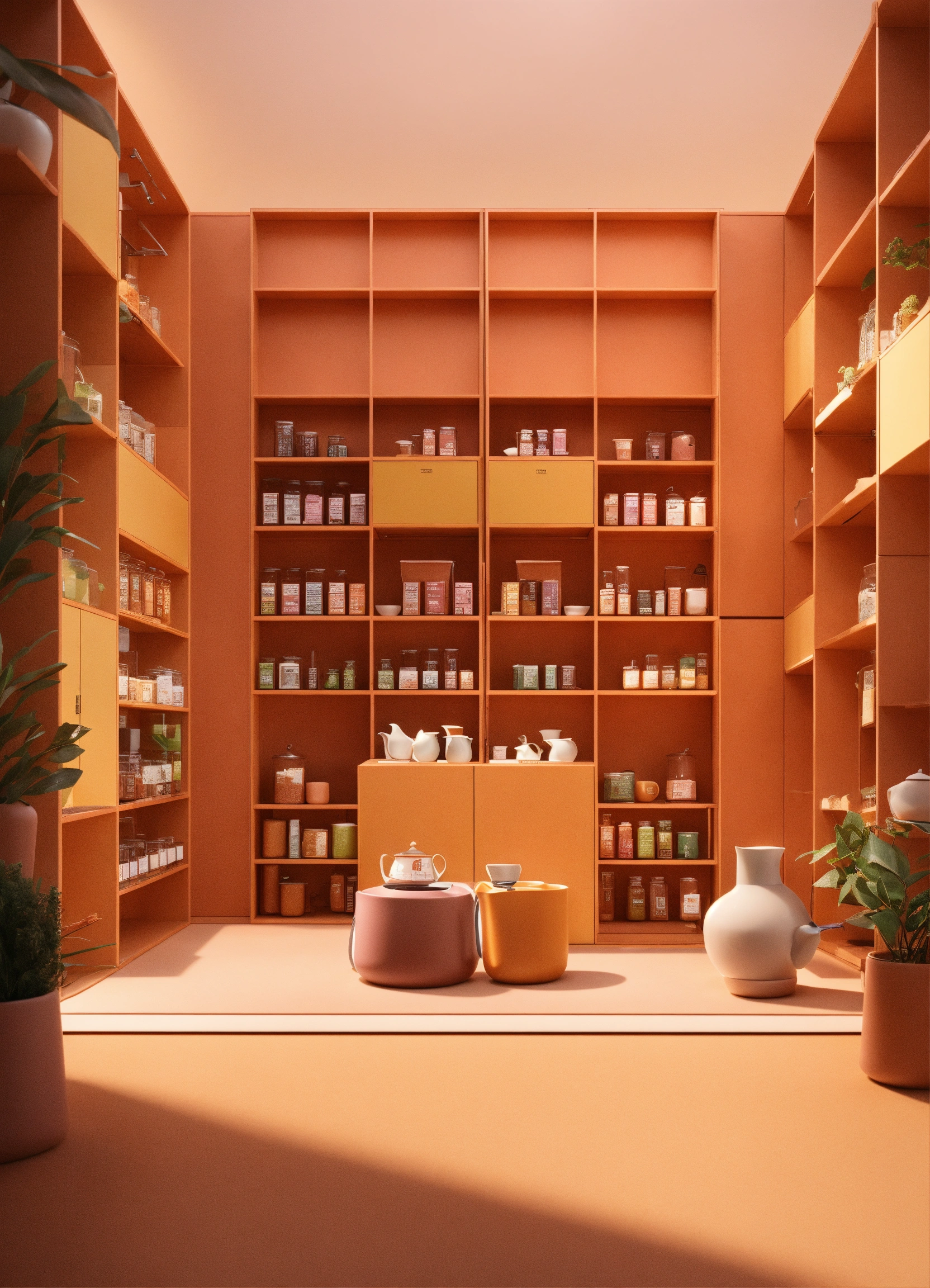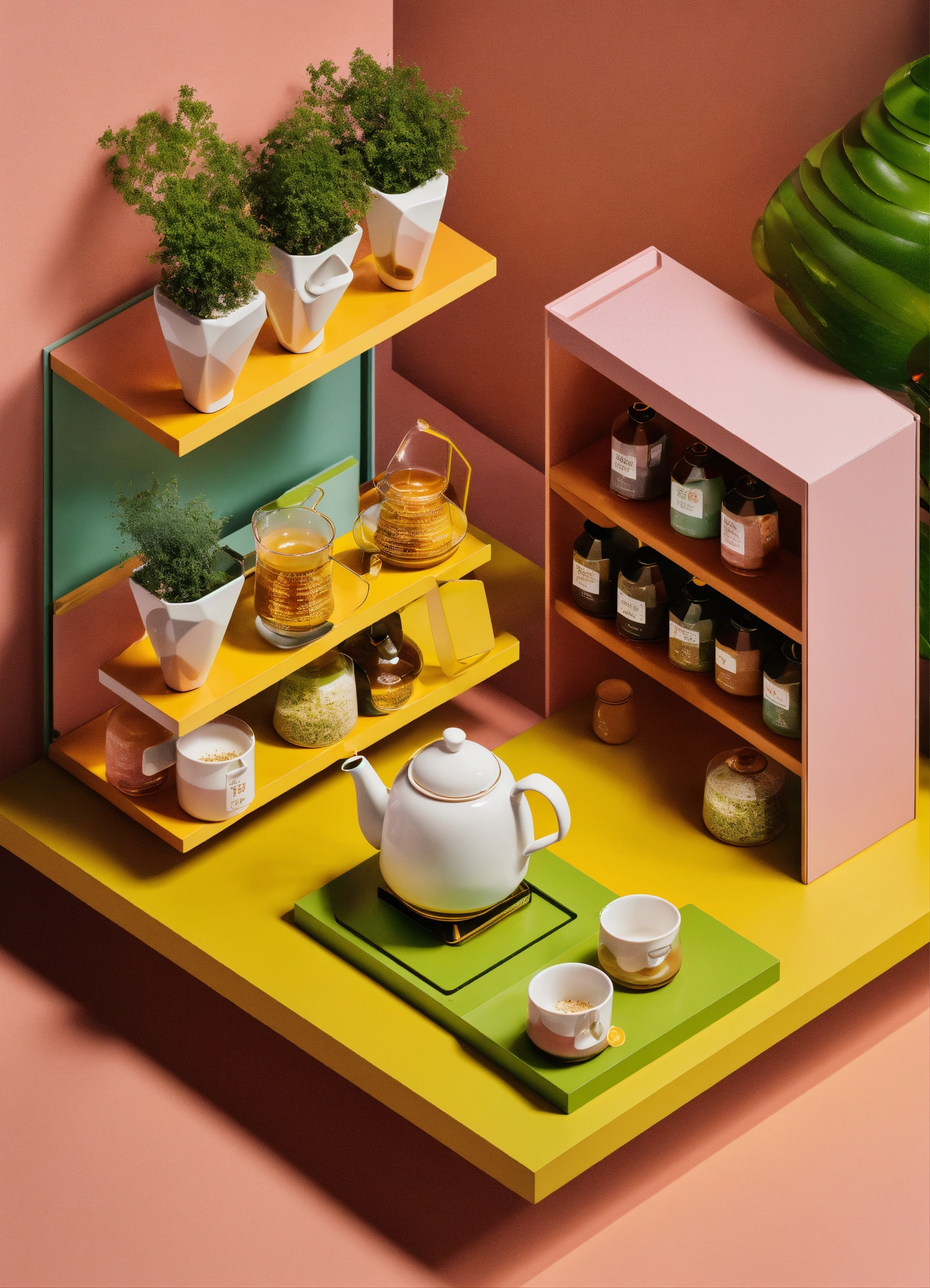 Bright and enormous isometric tea product display minimalistic, sleek and efficient tiny isometric environment in blender & product photography set design for a tea company with bright and eccentric enclosed 3d environment design with unique futuristic contemporary design qualities with minimal props and shelving but optimal lumen that highlights the color palette of the interior design and the tea leaves product, equipment to steep brew pour store and serve tea.