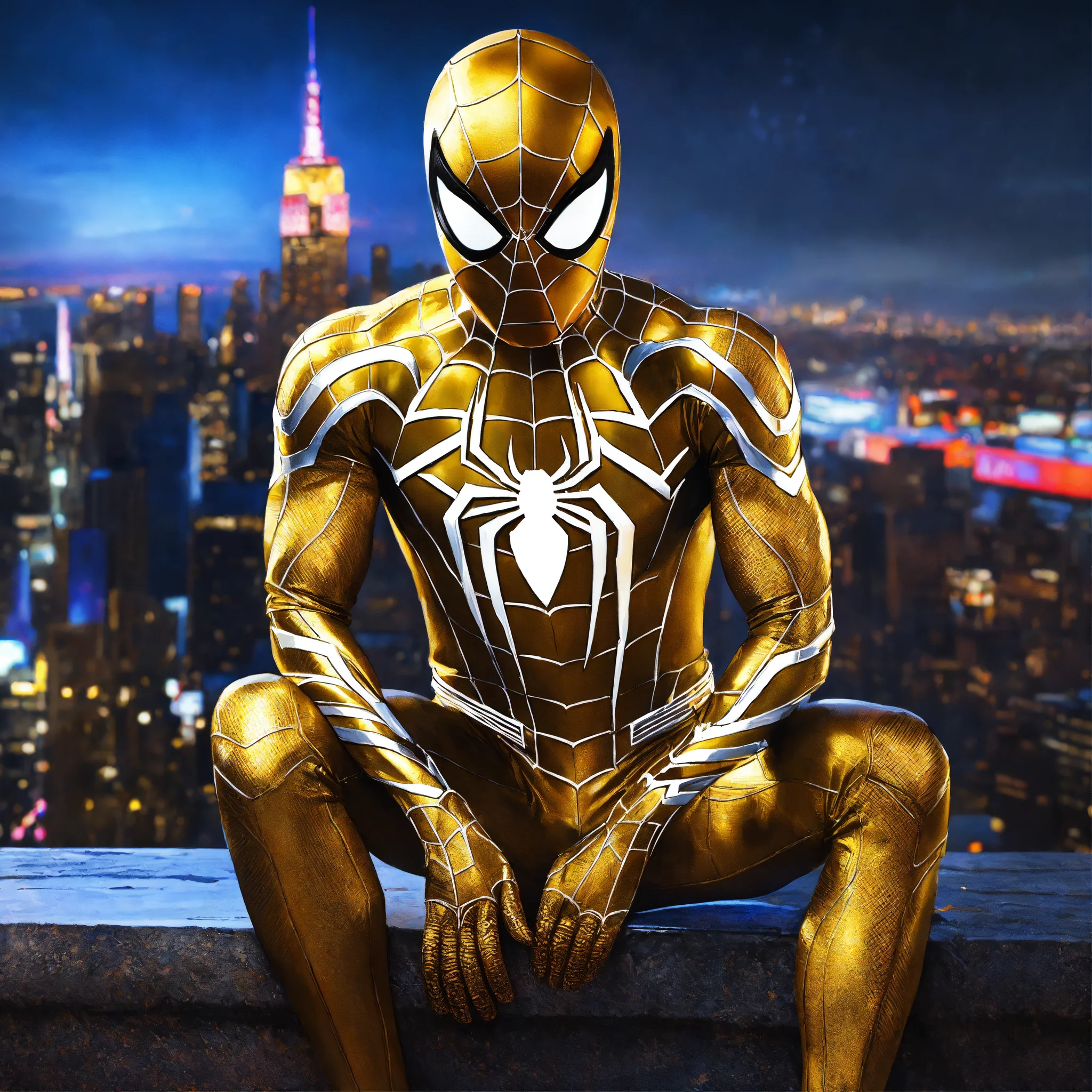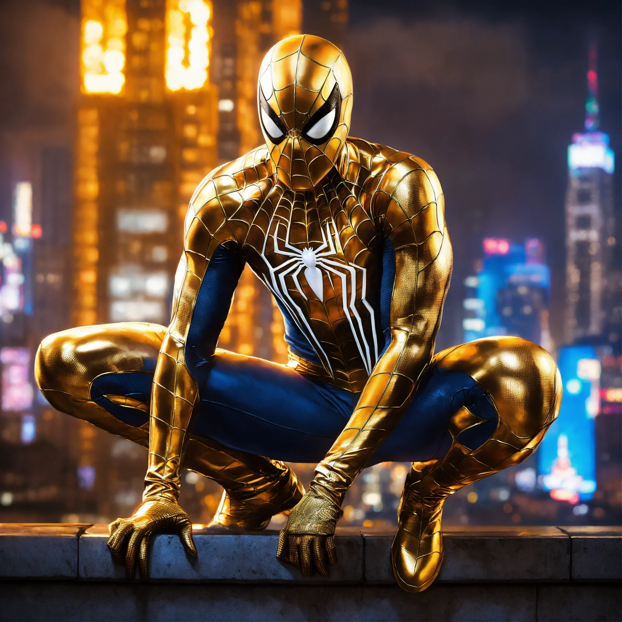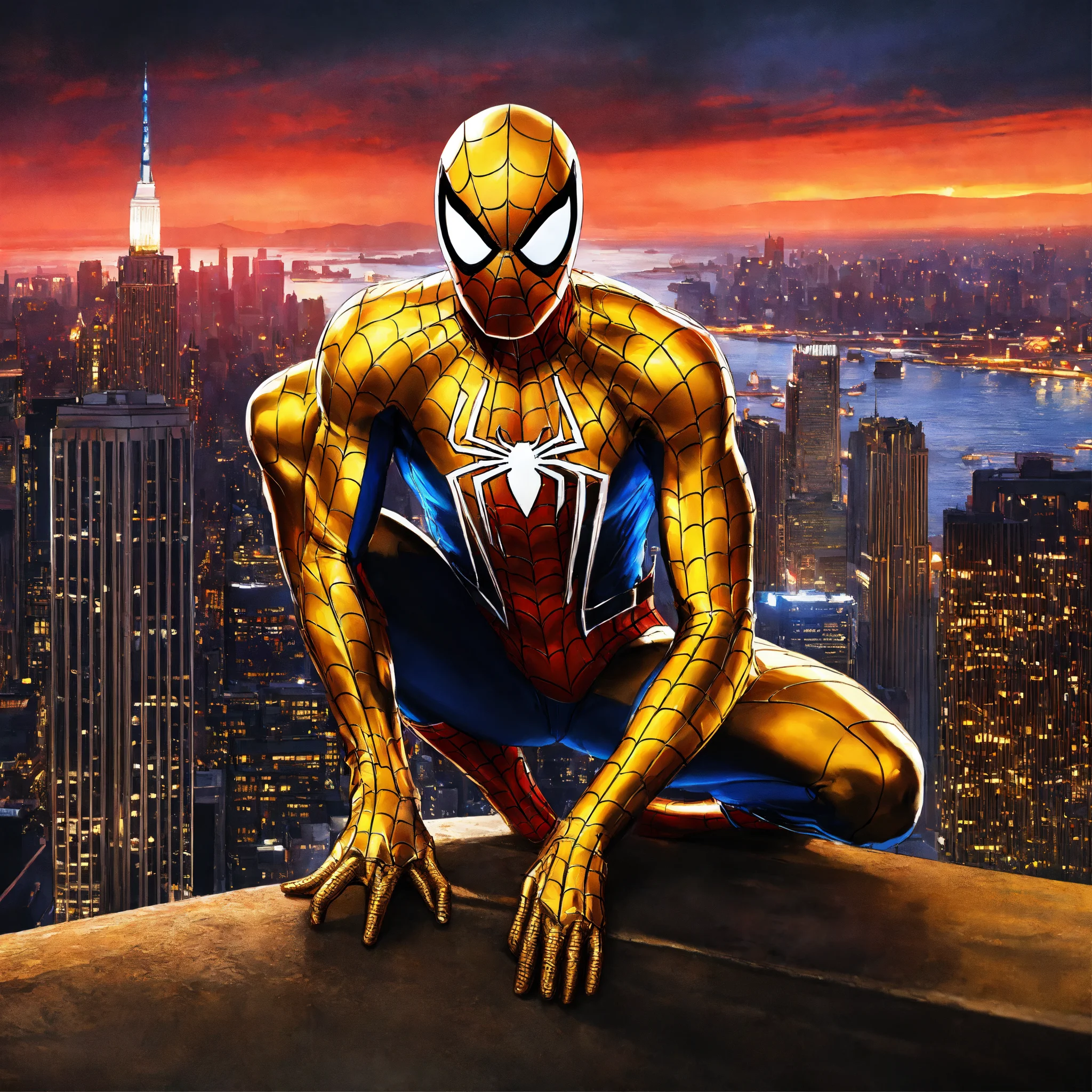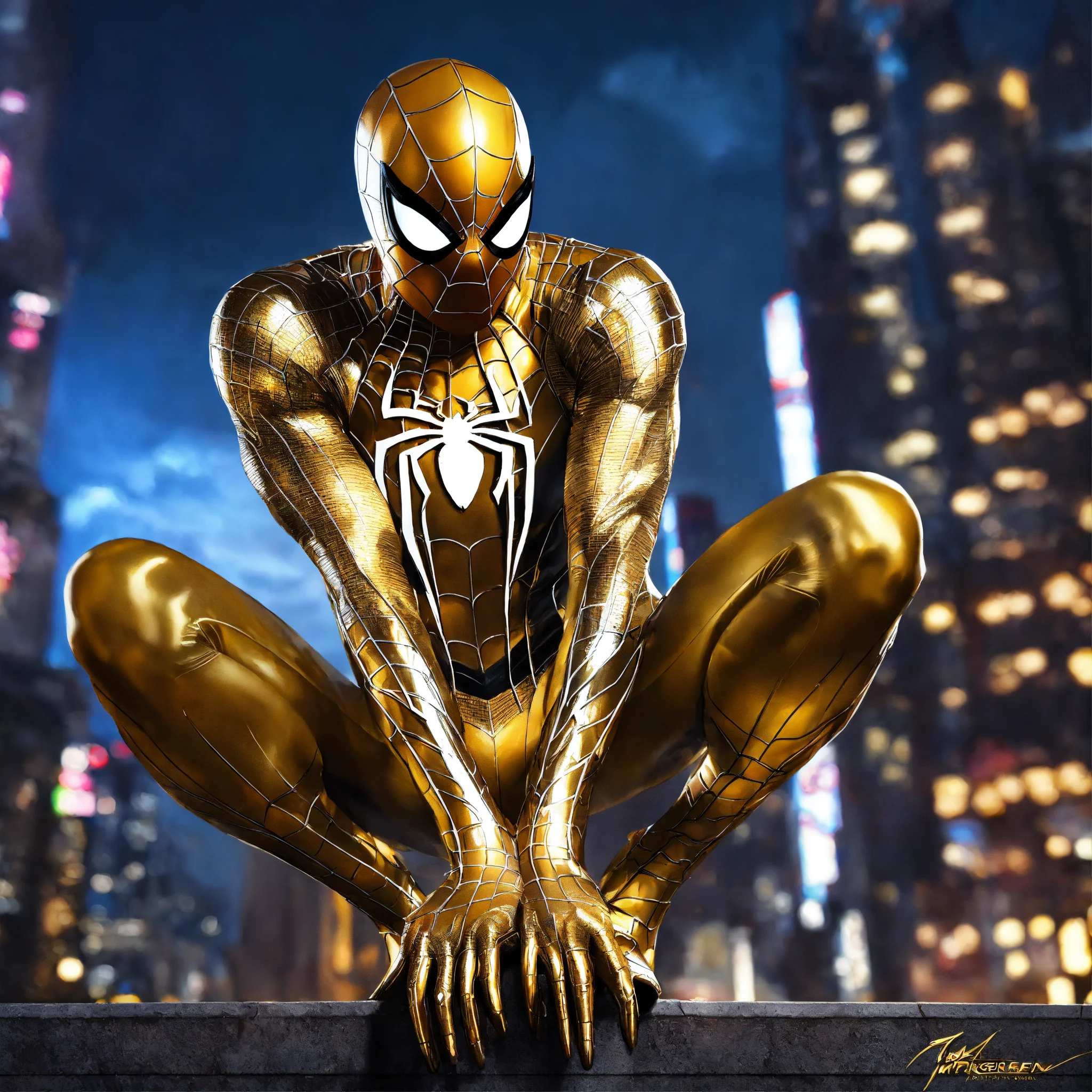 Portrait painting of spider-man wearing a gold metallic suit, ultra realistic, concept art, intricate details, eerie, highly detailed, photorealistic, octane render, 8k, unreal engine. art by artgerm and jim lee, nyc in the background, full body, night time, photshoot
