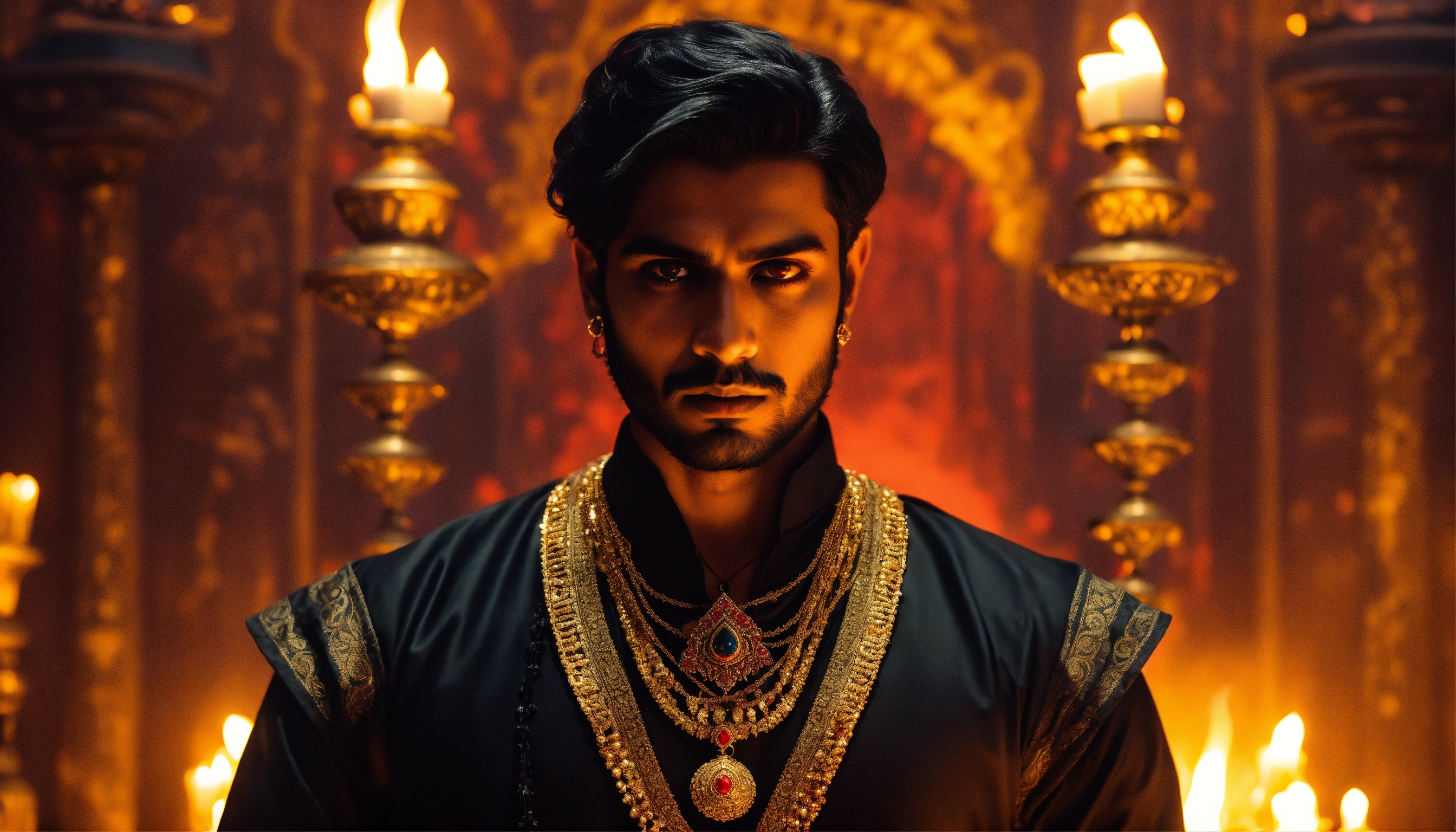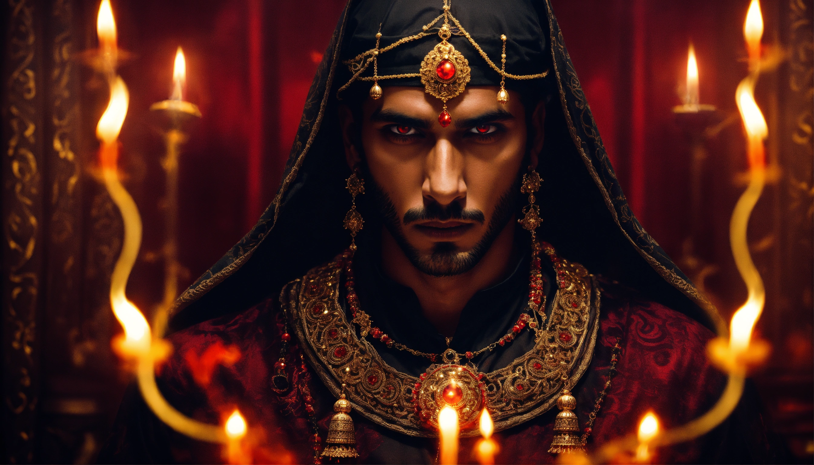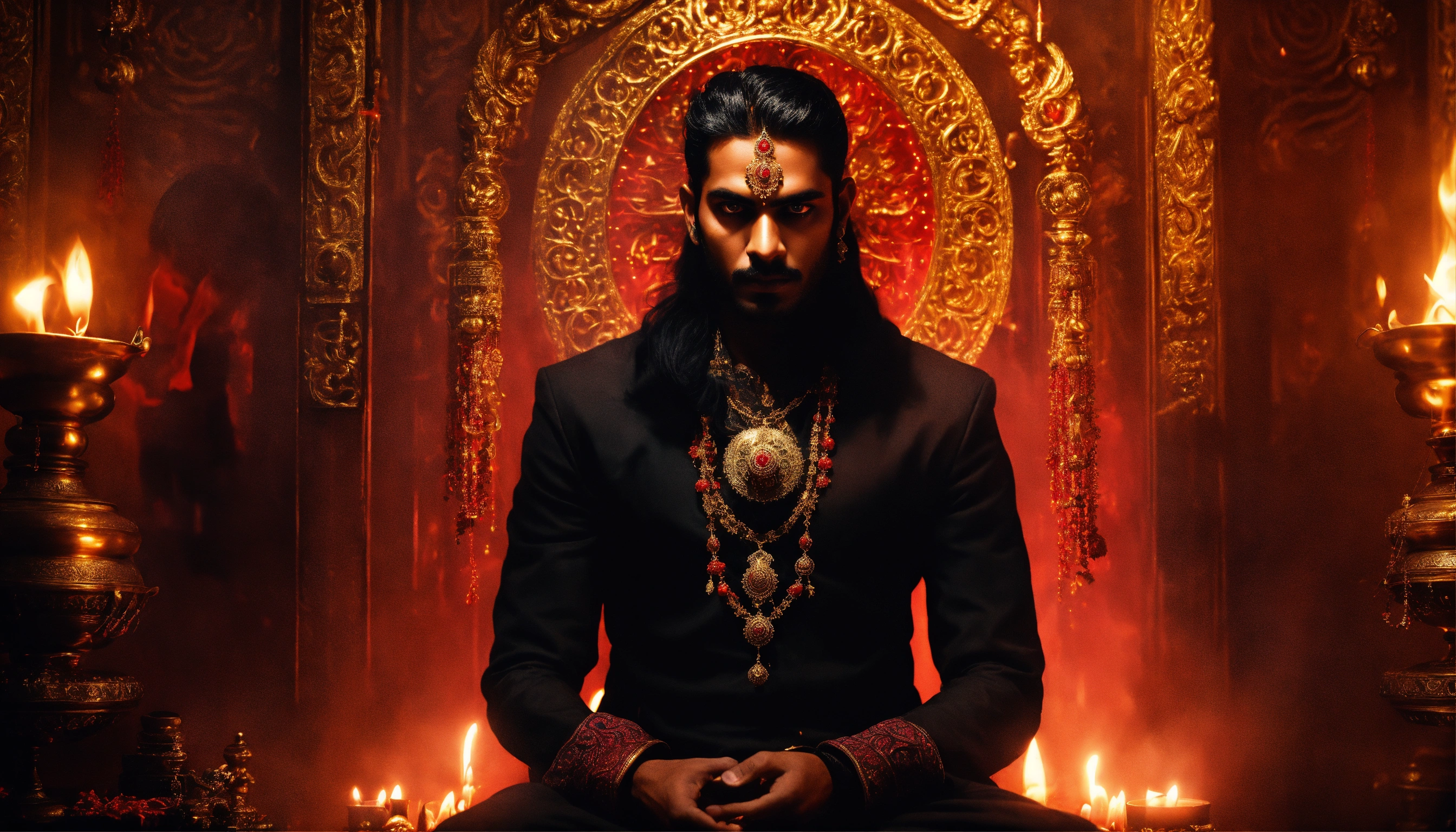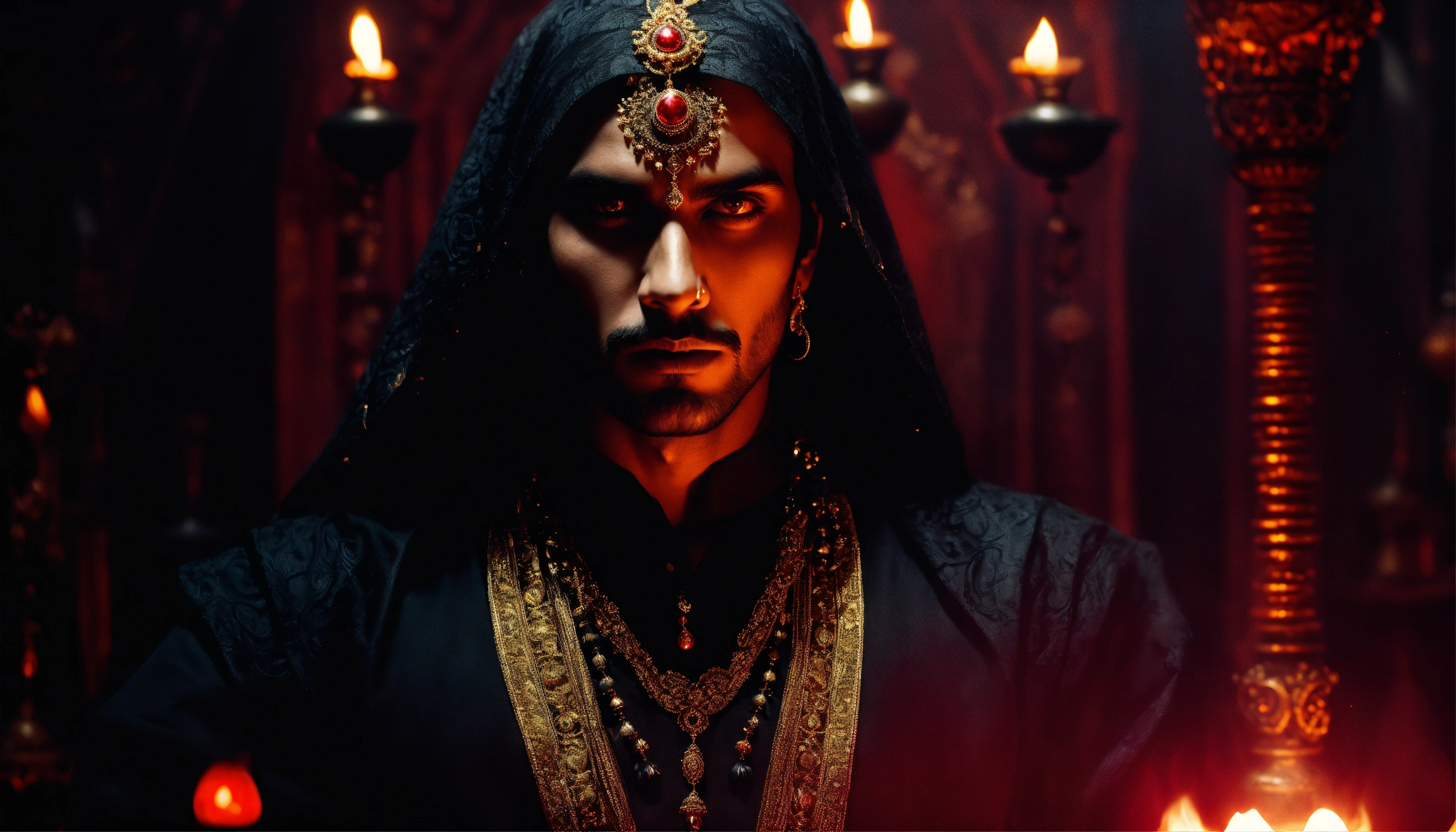 Sinister and dramatic picture of a young handsome indian diabolical sorcerer with hypnotic red glowing eyes wearing black clothes and ornate gold jewellery in a dimly-lit incense filled secret chamber