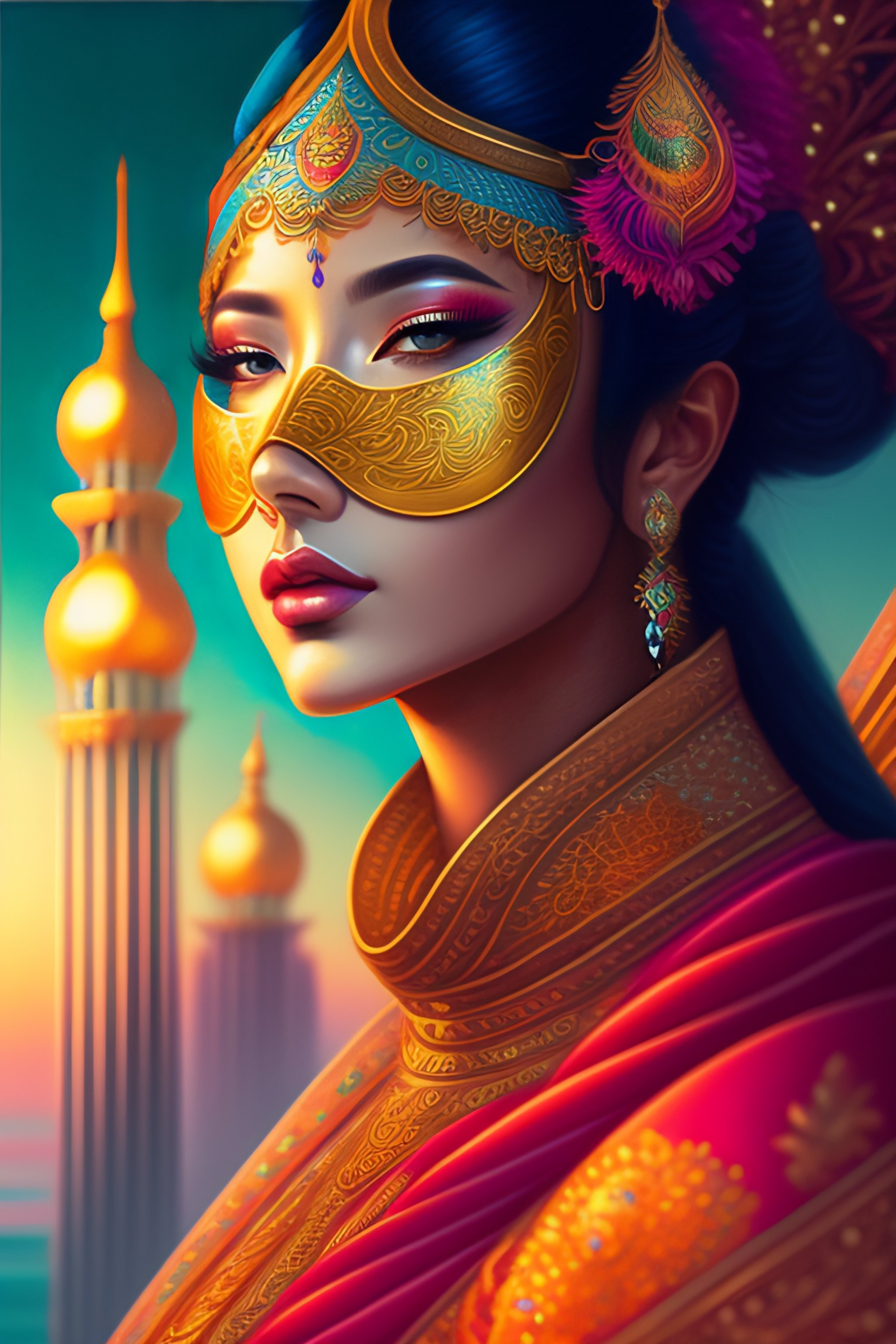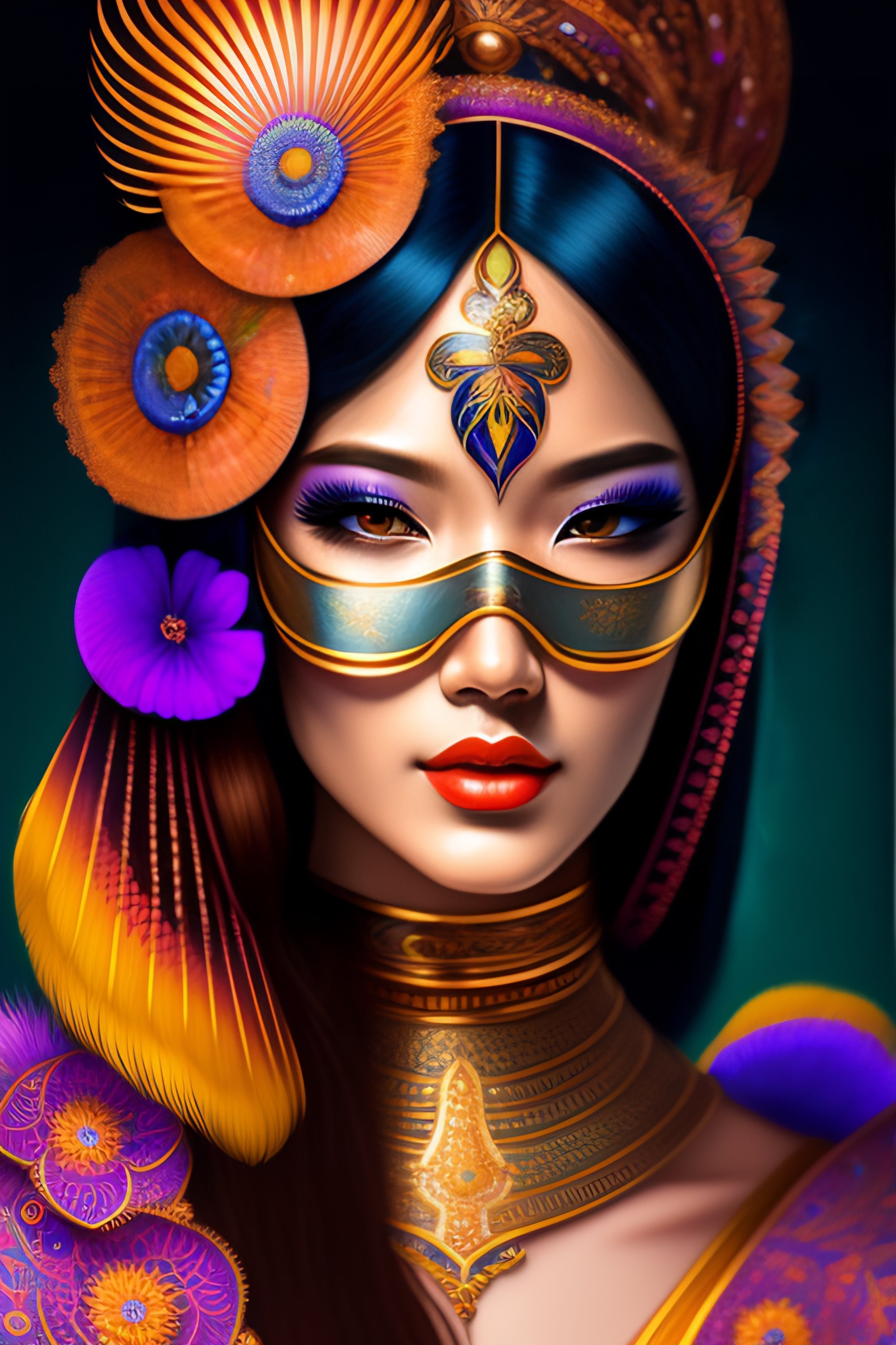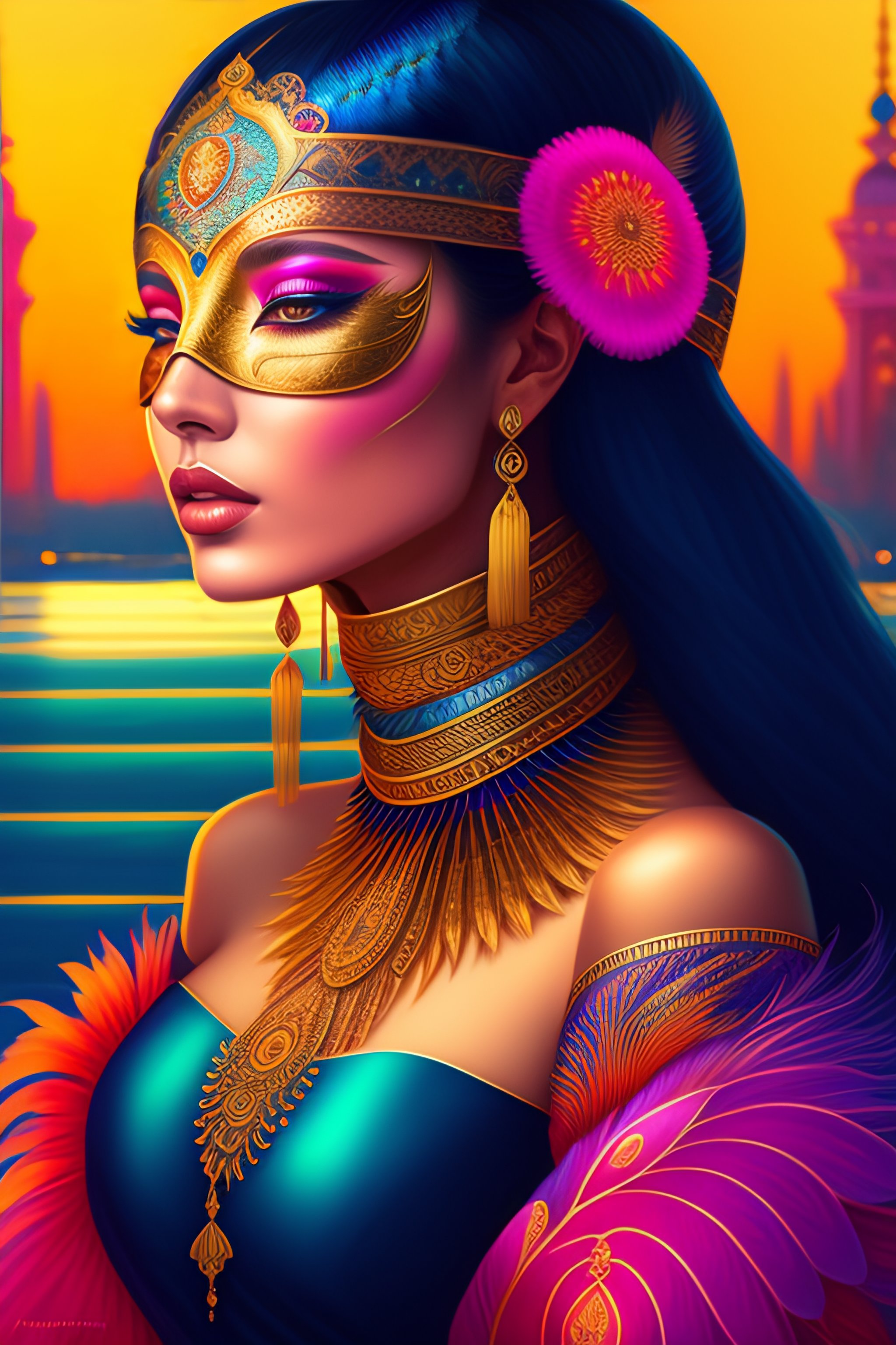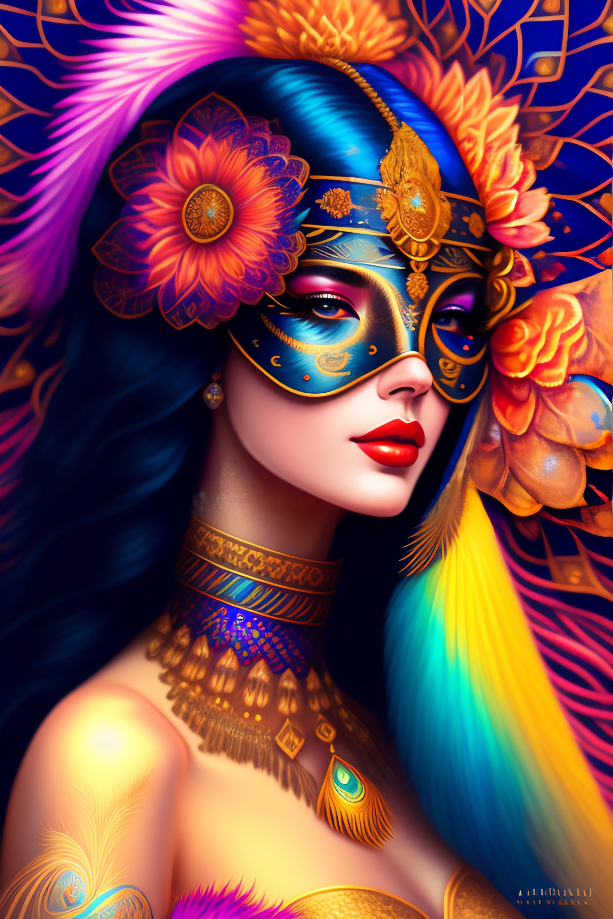 Centered detailed portrait of a masked woman wearing a venetian mask, vibrant peacock feathers, intricate, elegant, highly detailed, digital painting, artstation, smooth, sharp focus, illustration, illuminated lines, outrun, vaporware, intricate venetian patterns, cyberpunk darksynth, by audrey kawasaki and ilya kuvshinov and alphonse mucha