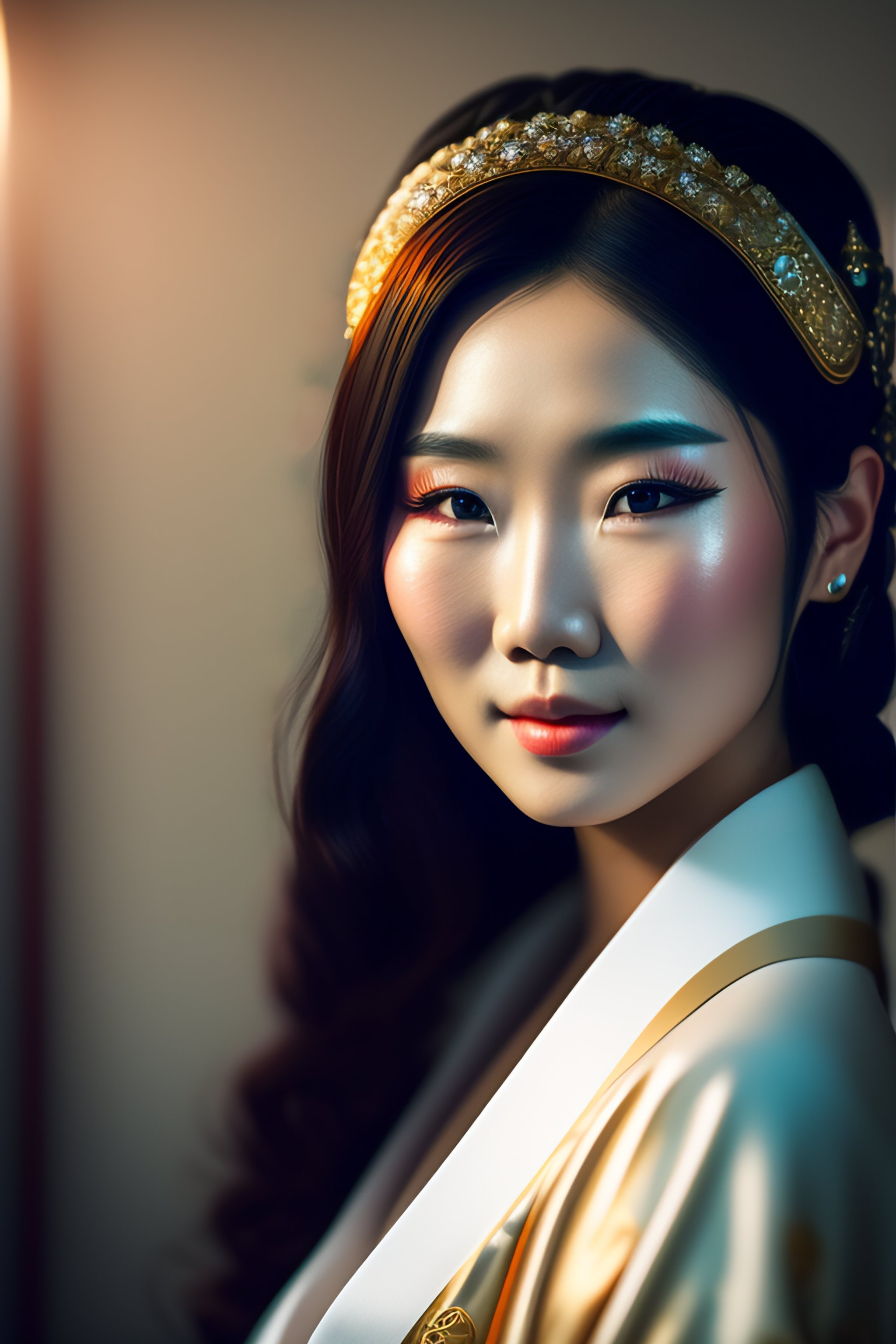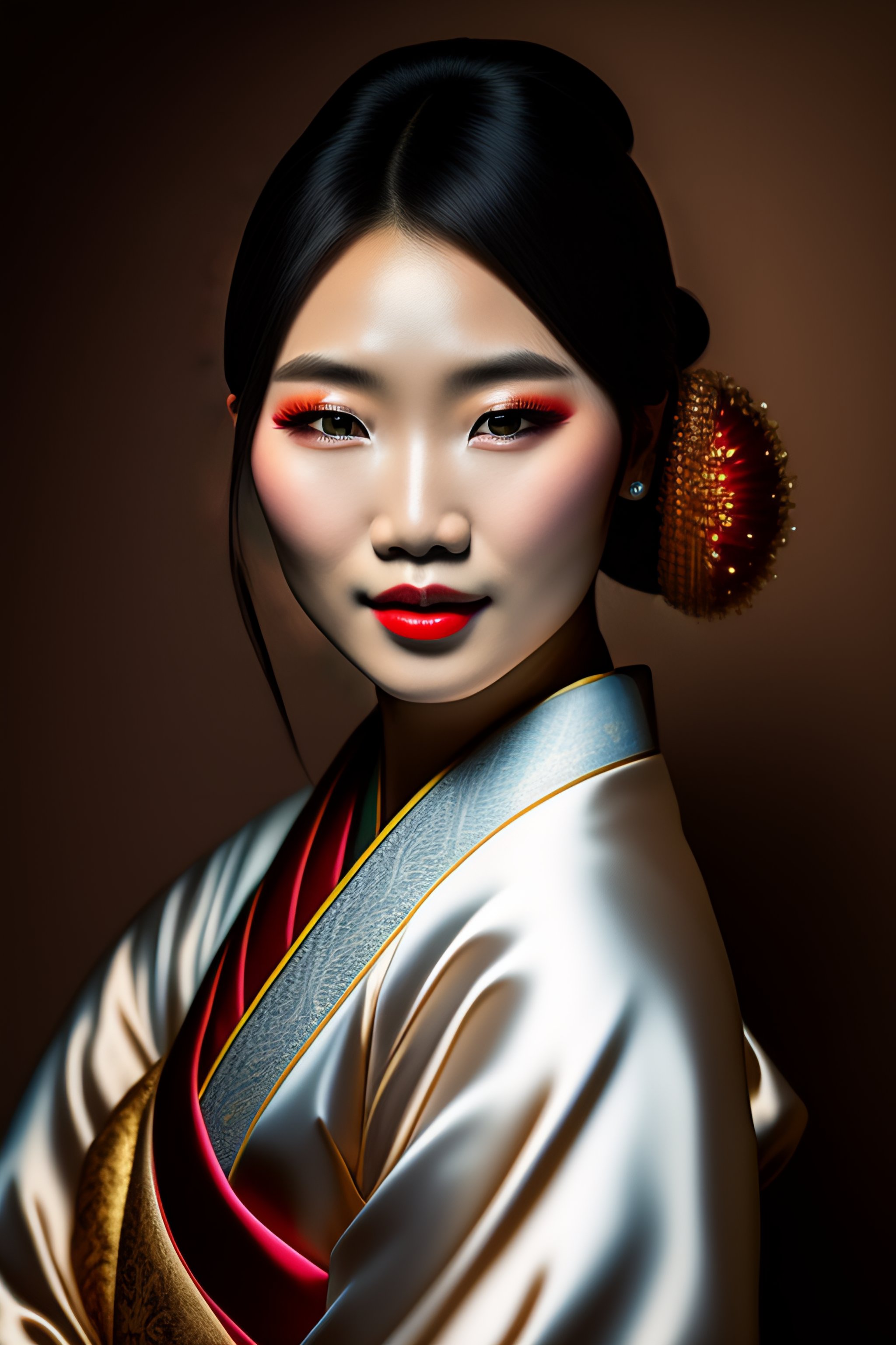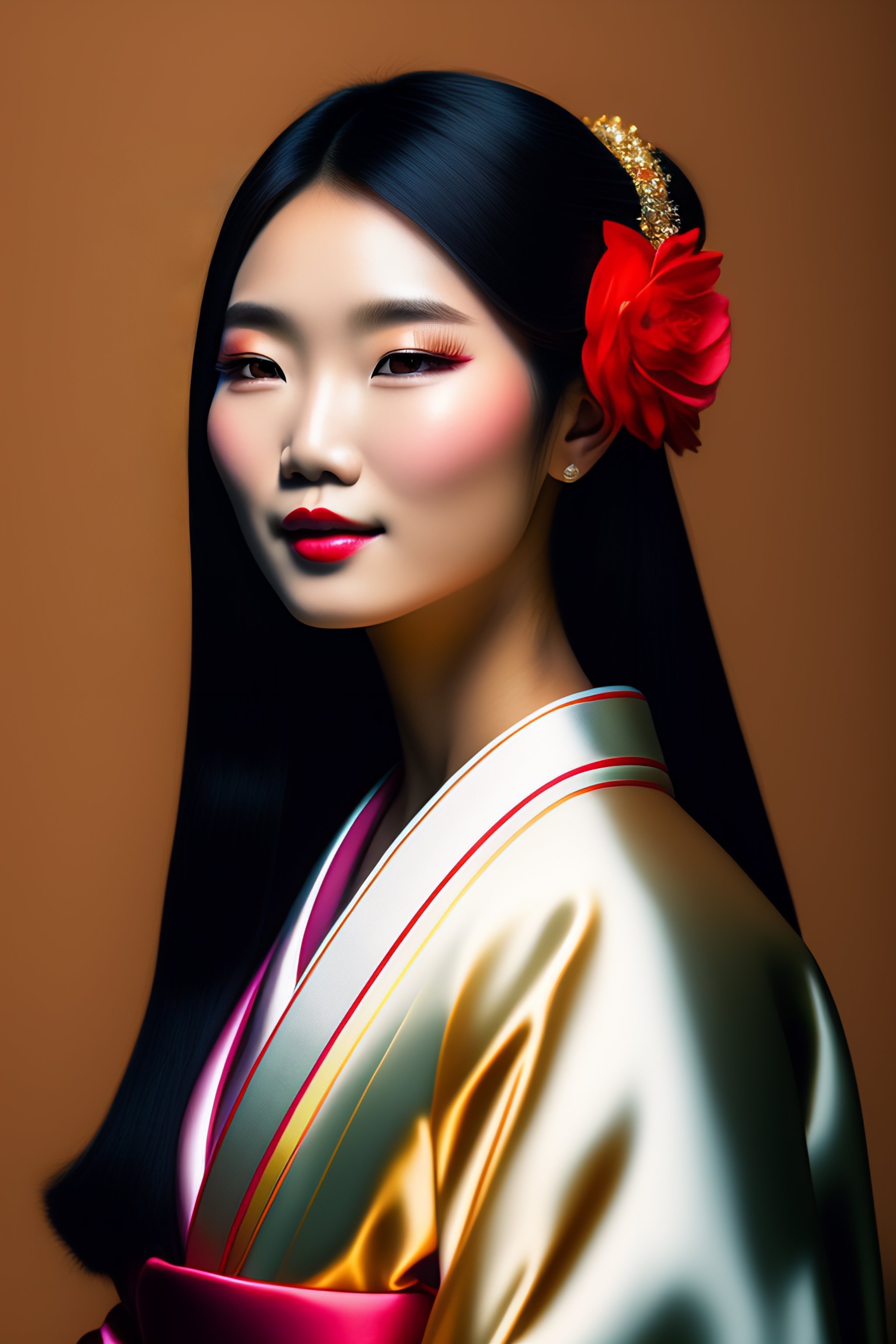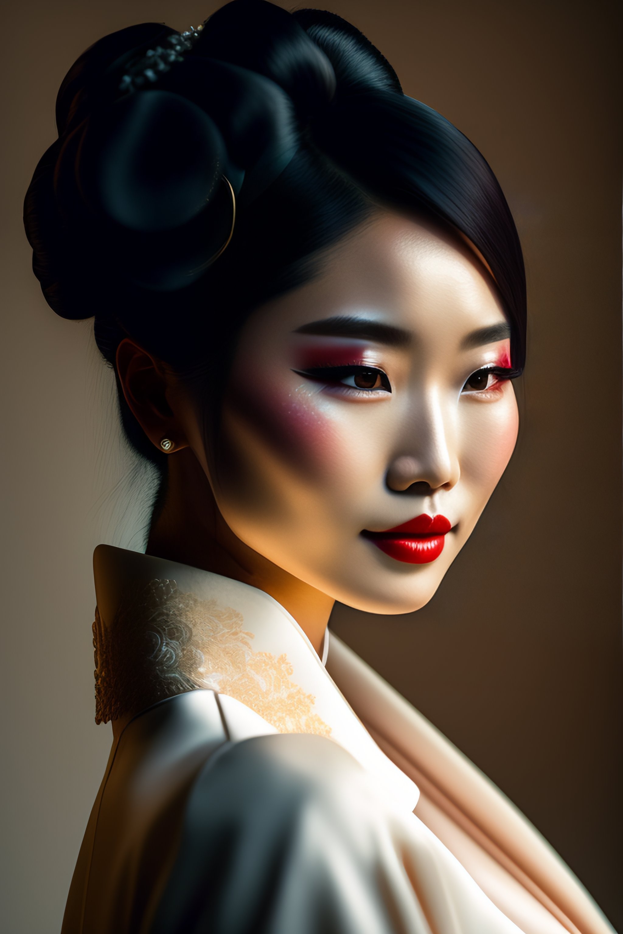 Portrait of a stunningly beautiful, young, japanese geisha smiling, fashion editorial, studio photography, magazine photography, pointed nose, blurry background