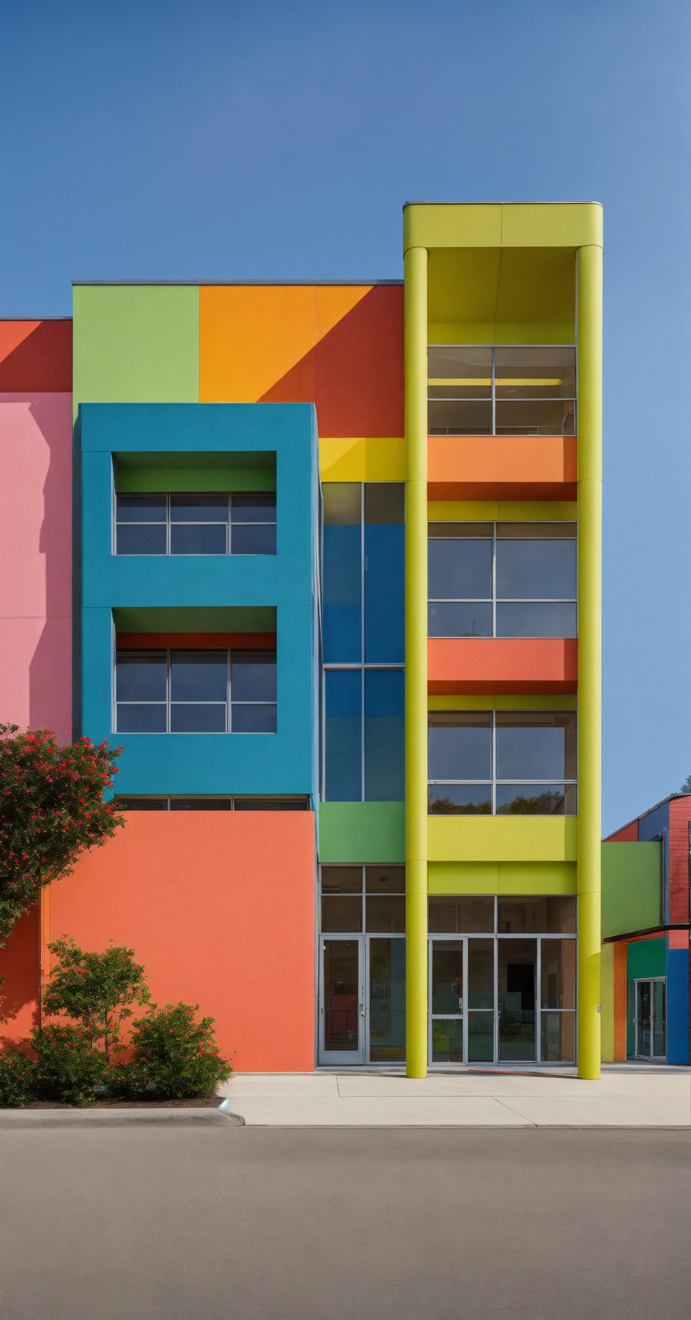 I want a real 4k resolution photograph of the facade of a daycare center, the photograph should feature a color palette of no more than four shades