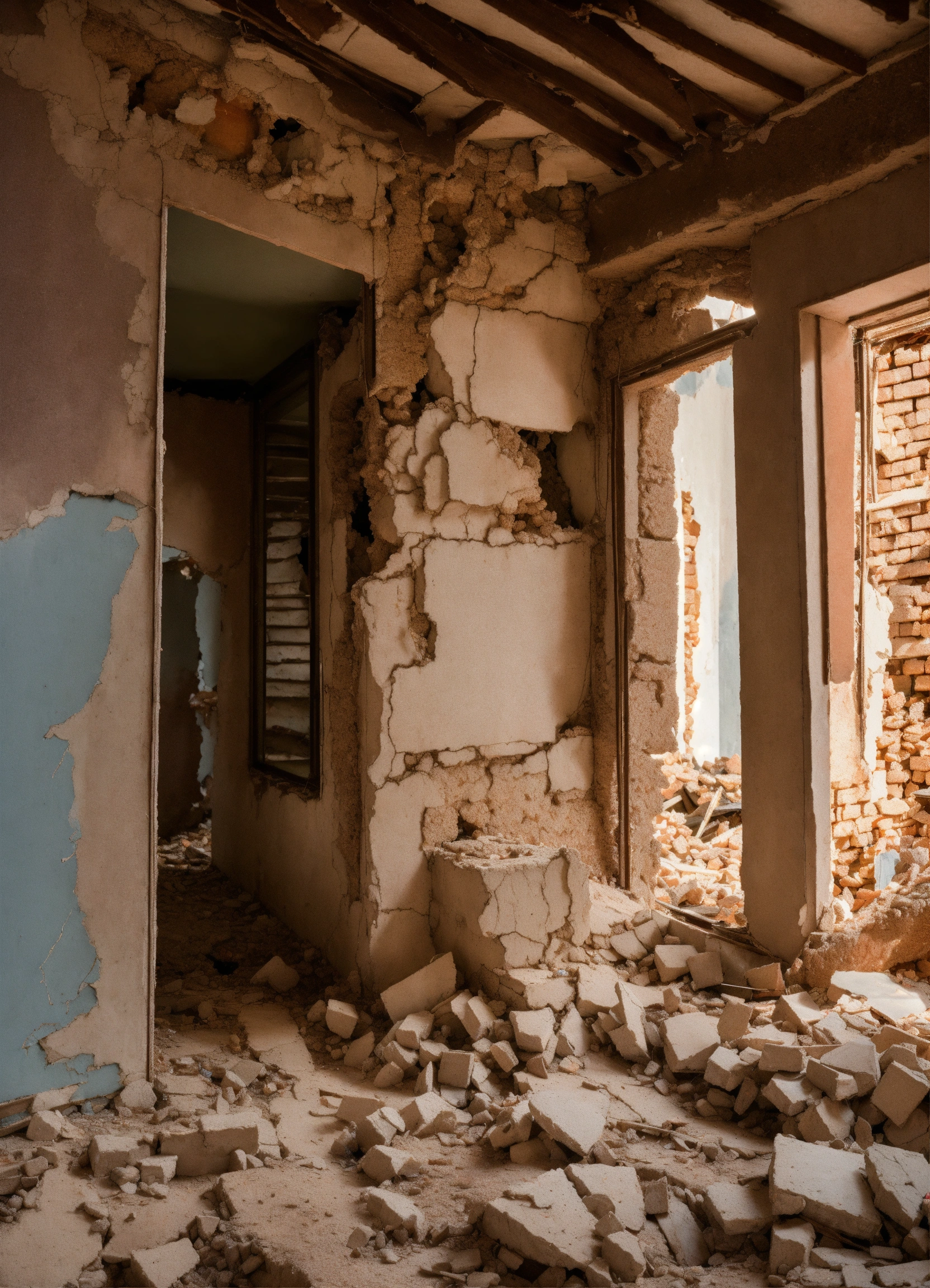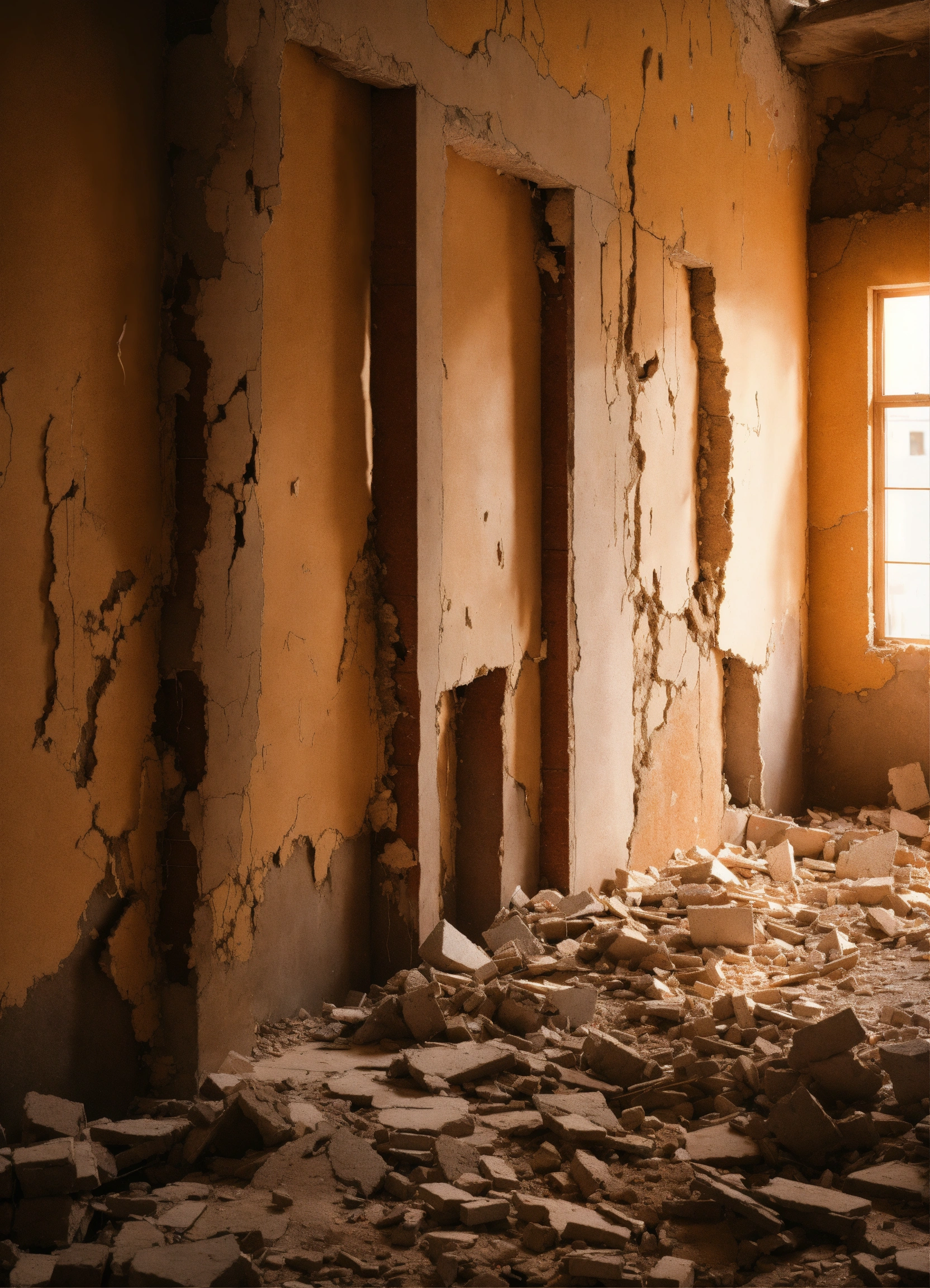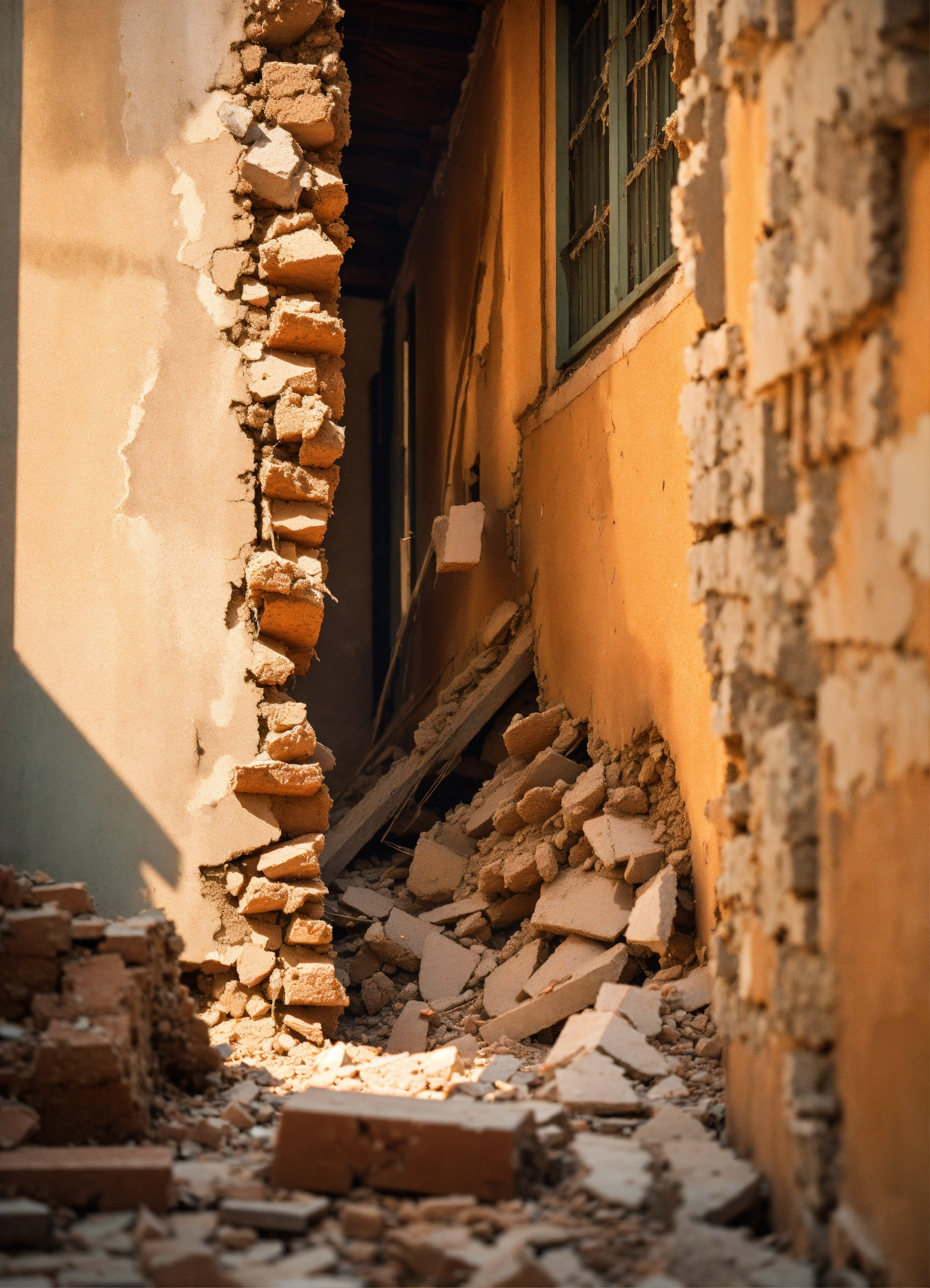 After the earthquake, crumbling wall of a building, unsafe condition or damage, report it, high quality photography of texture, lighting, volumetric, sharp focus photography, exquisite details, ultra photorealism, depth of field, 8k.