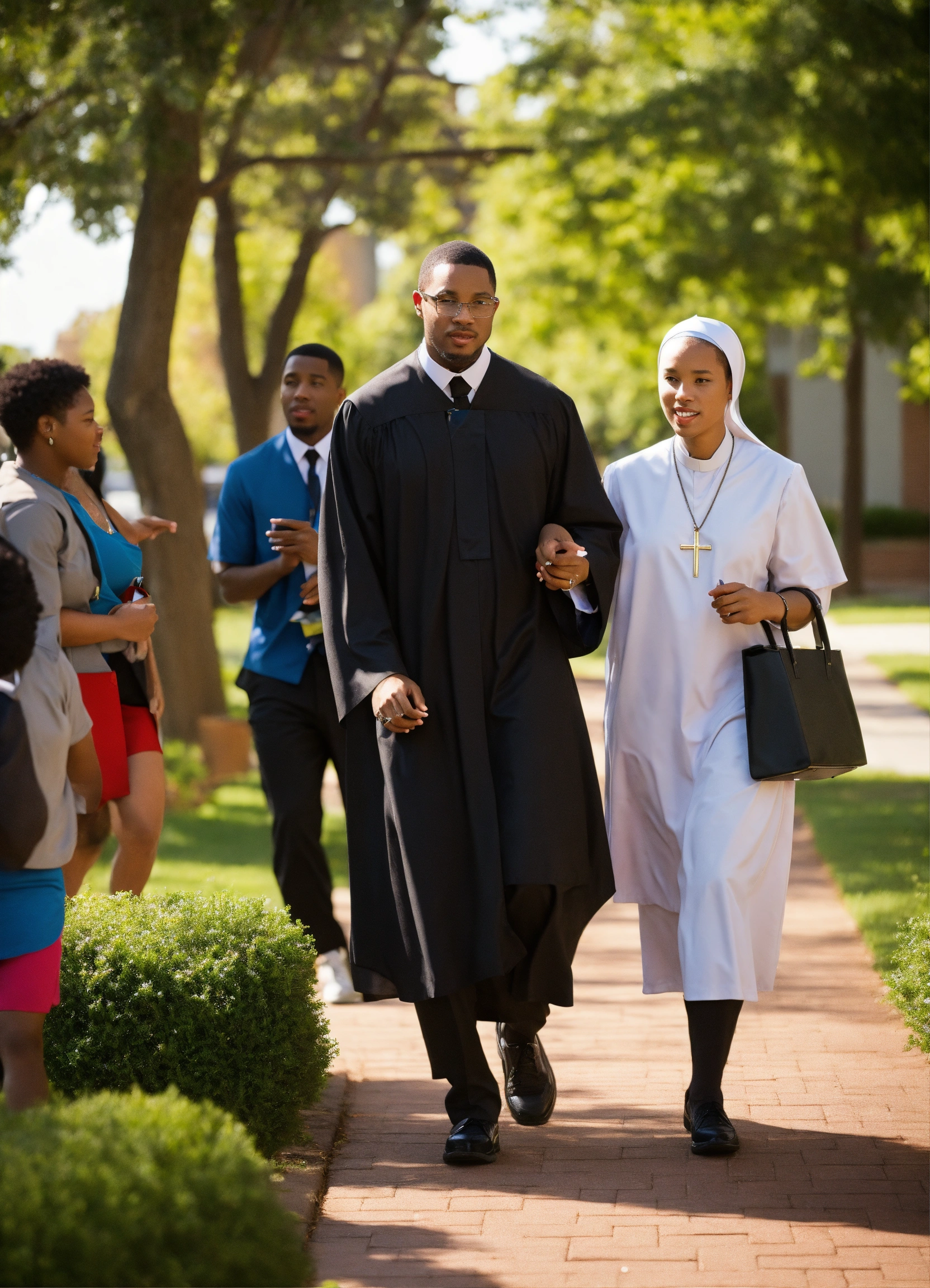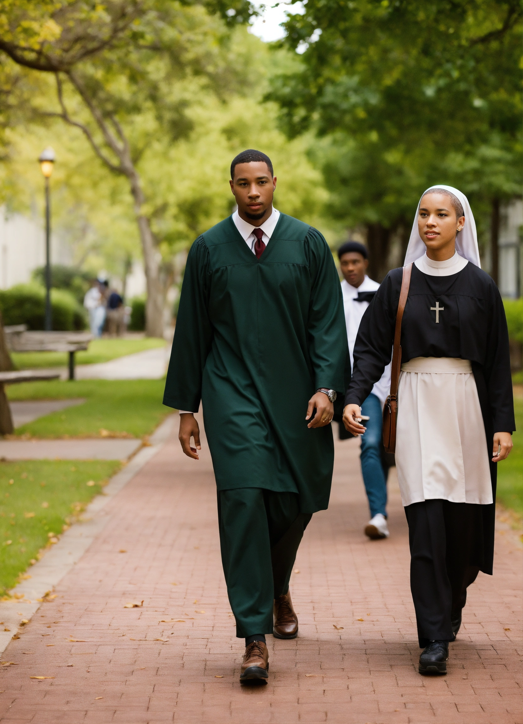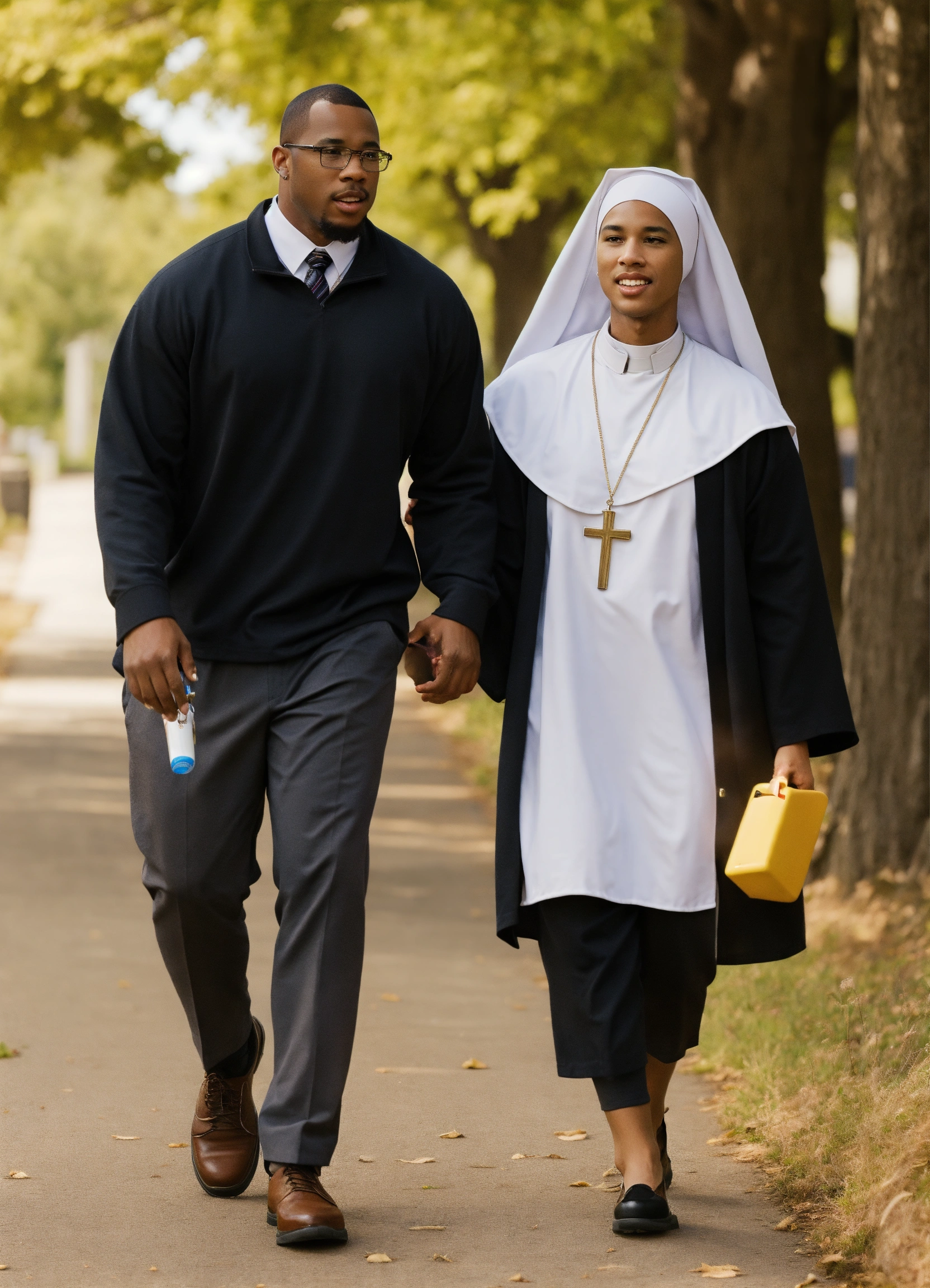 Biracial nun walking with black male teacher