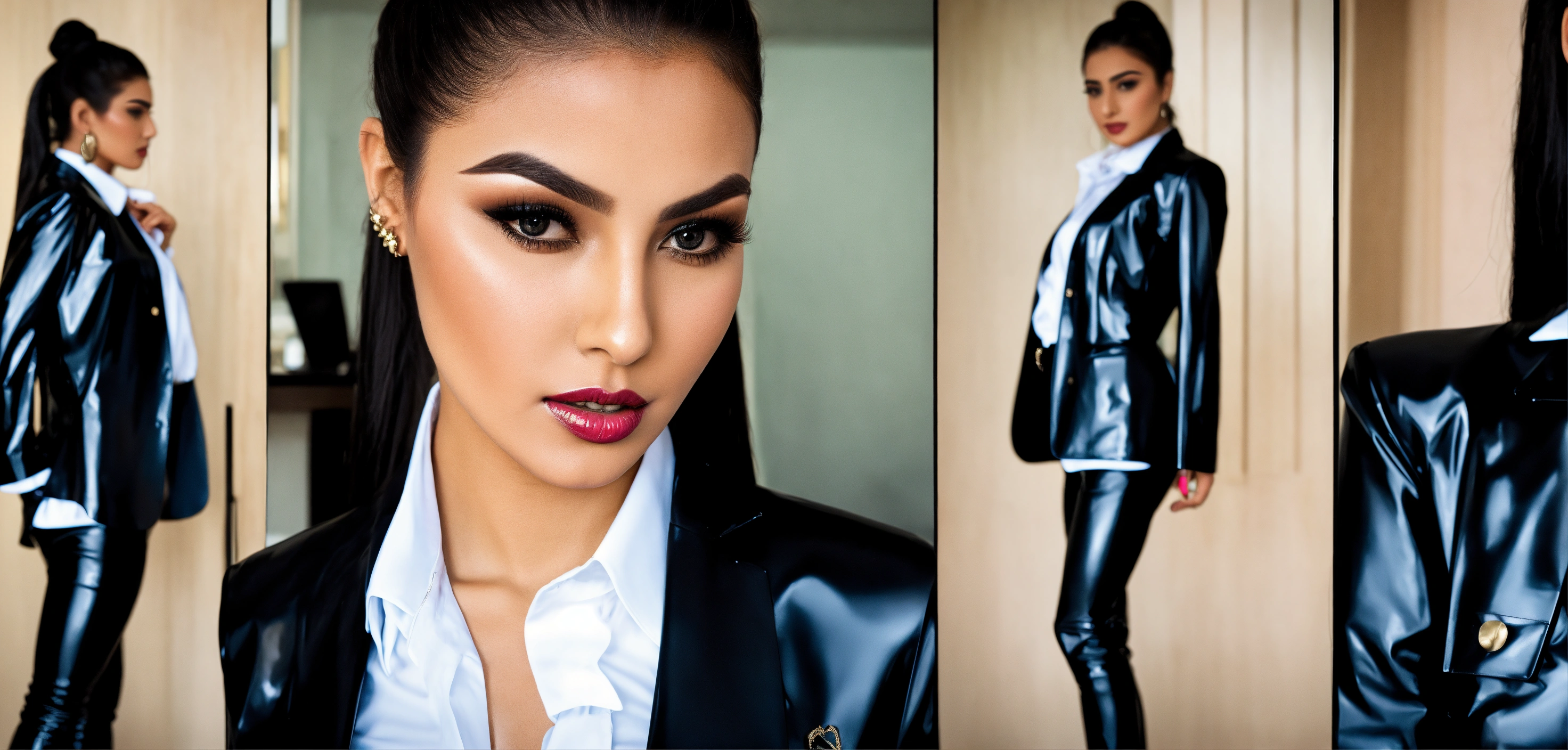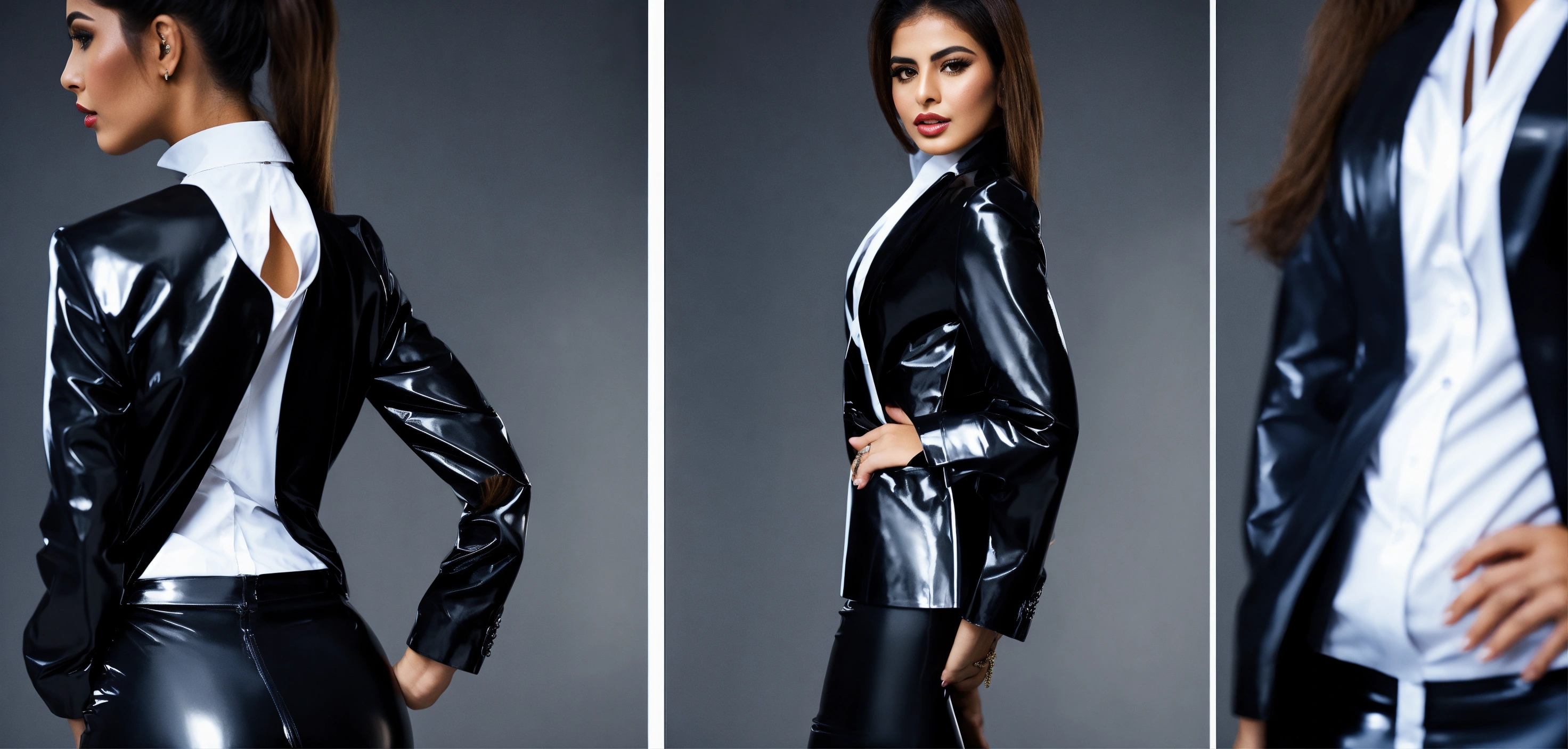 Stunning seductress arab woman model, straight high ponytail, black pvc business blazer, read latex office shirt