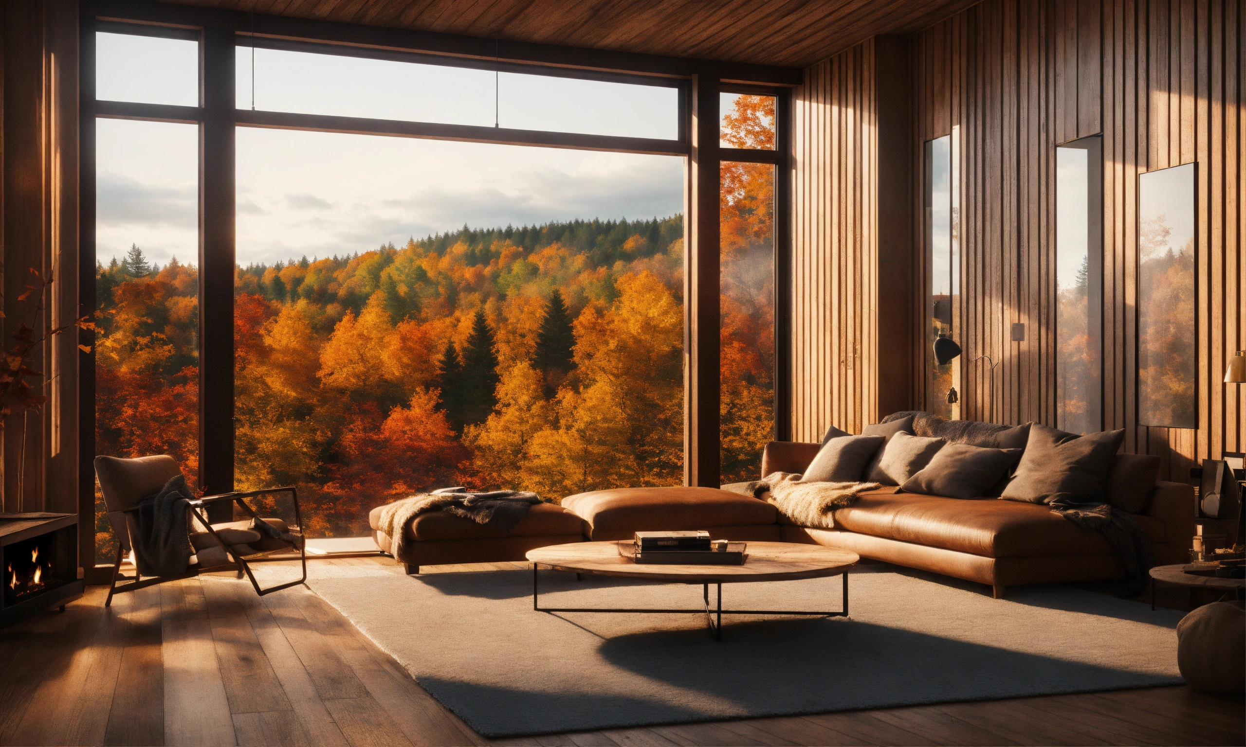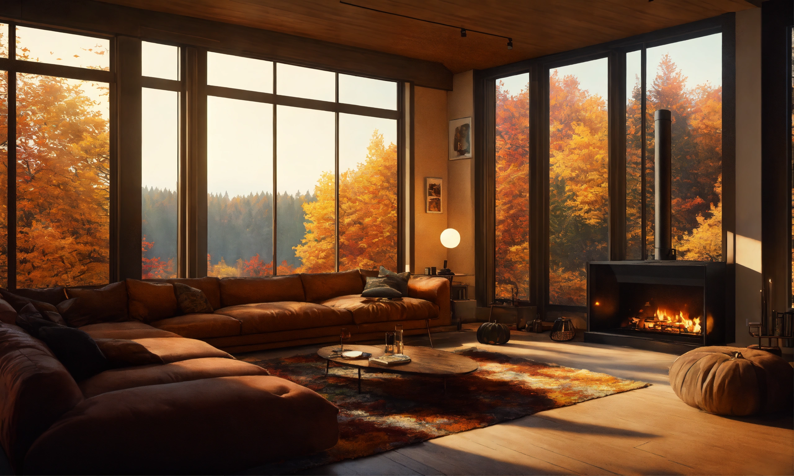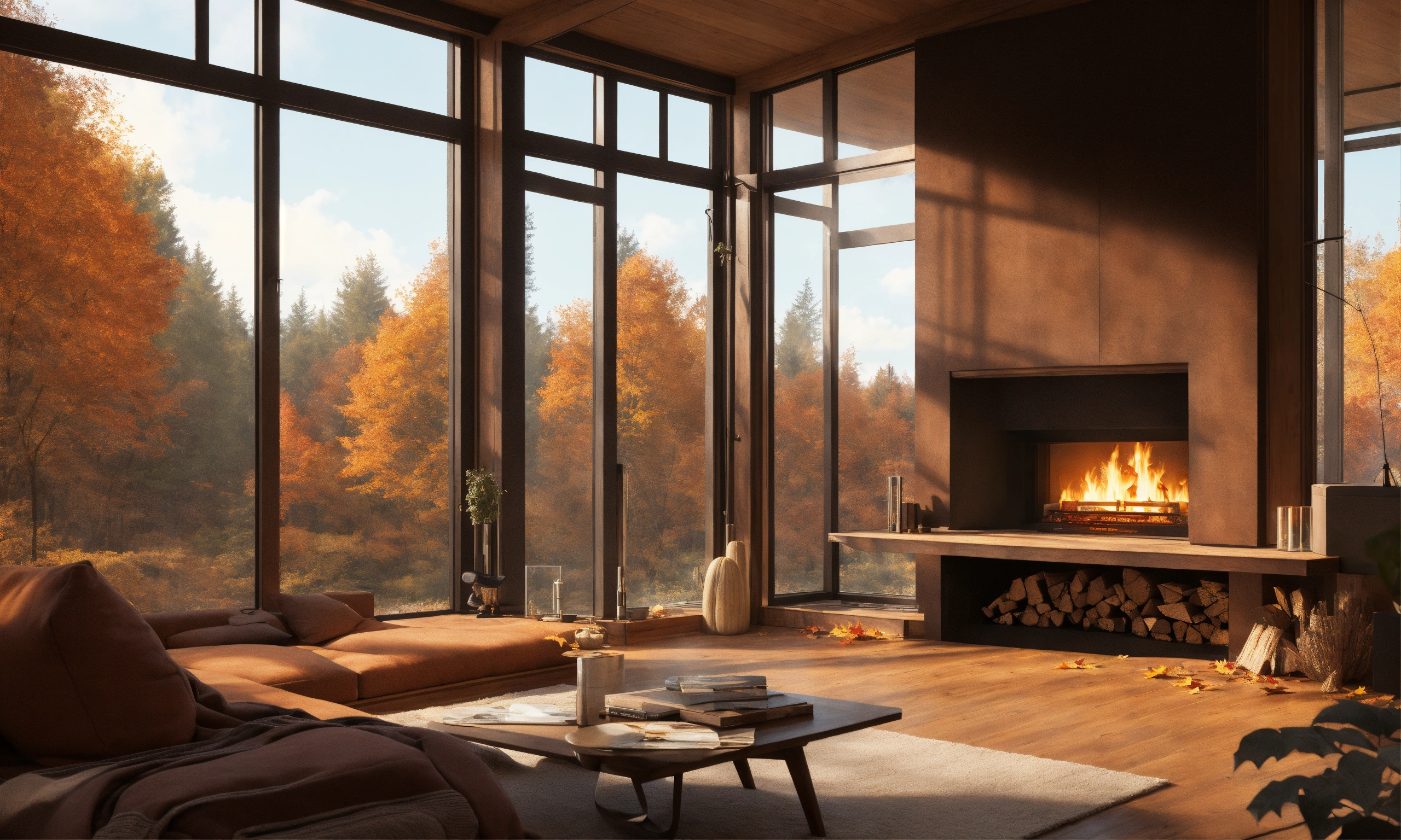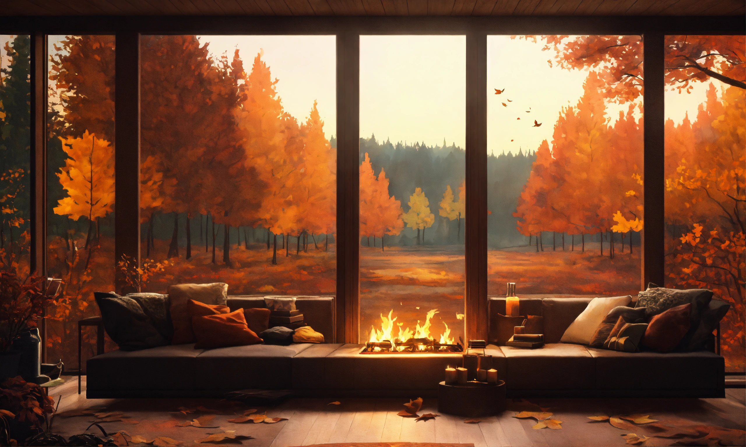 Anime nordic forrest house minimalistic living room with fireplace, big centered window with view over forrest, big open living room, fireplace in the middle, dark brown wooden living room, fall season, fall lofi artwork, fall view, fall leaves