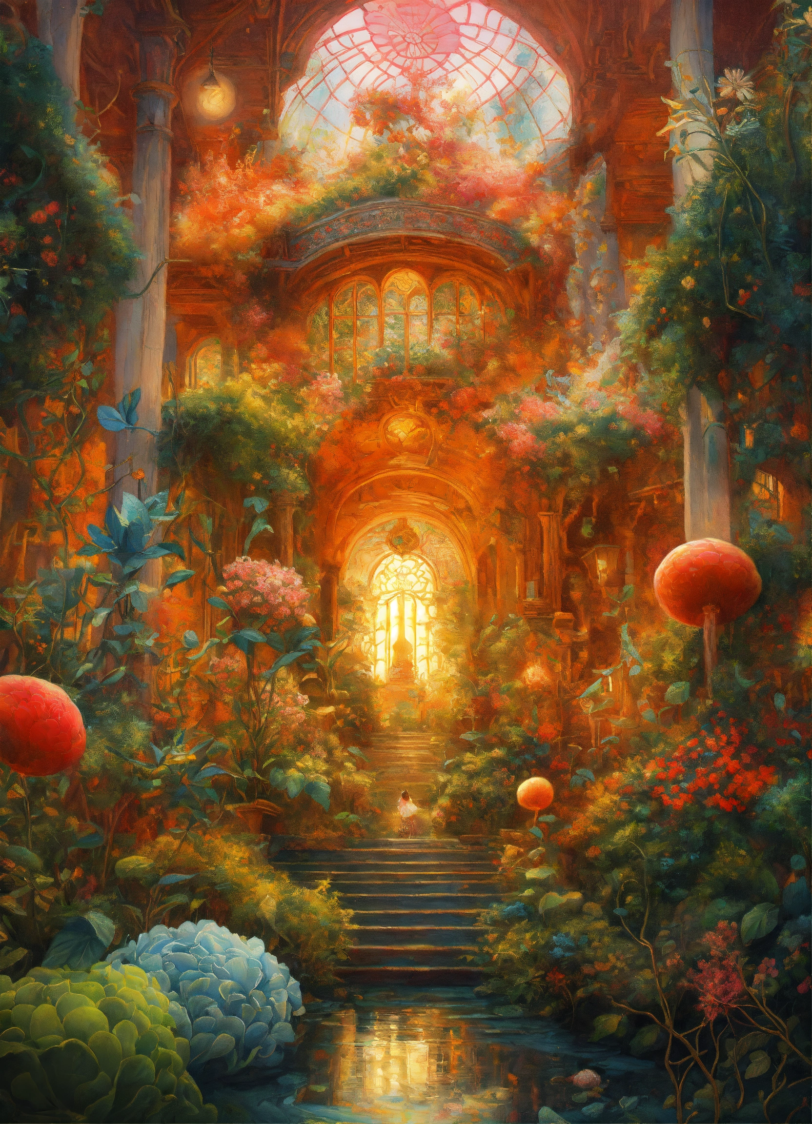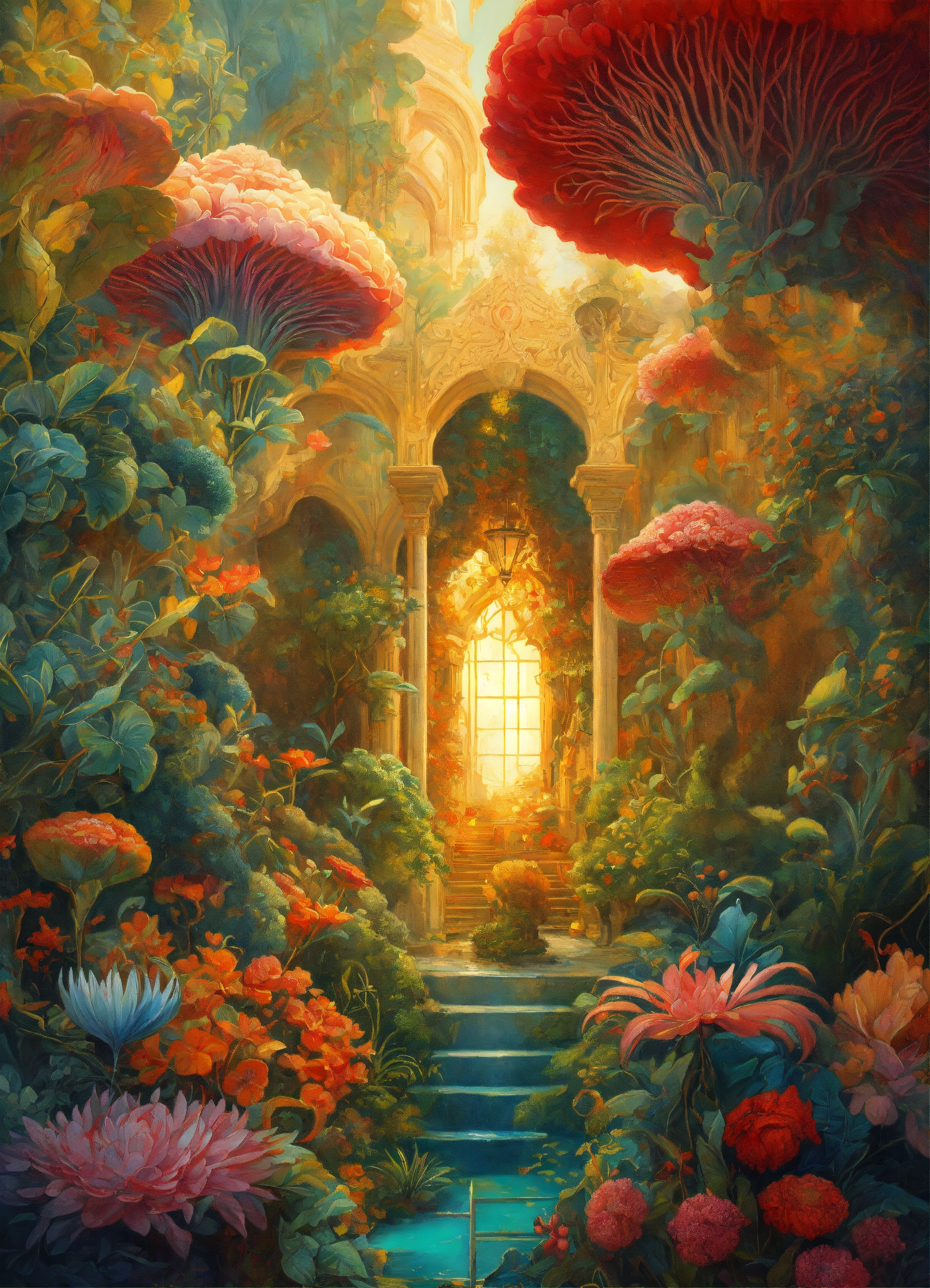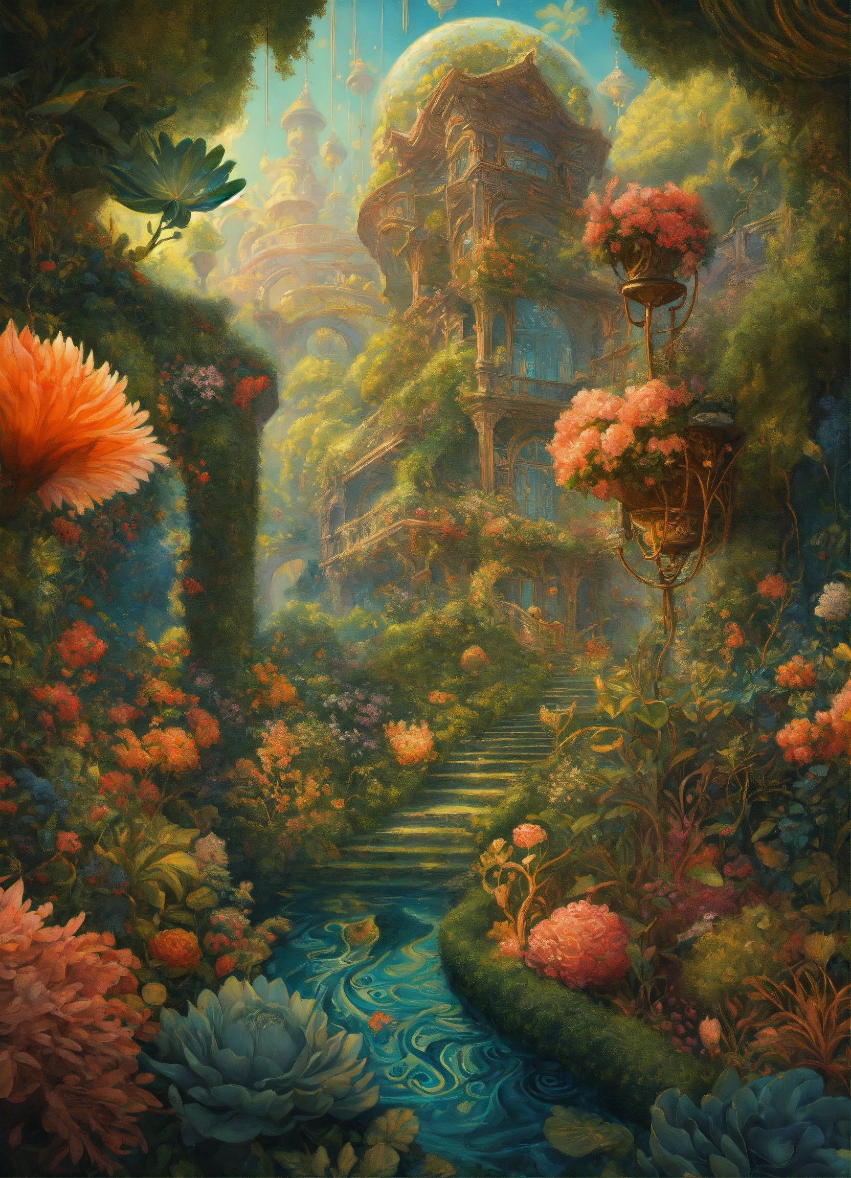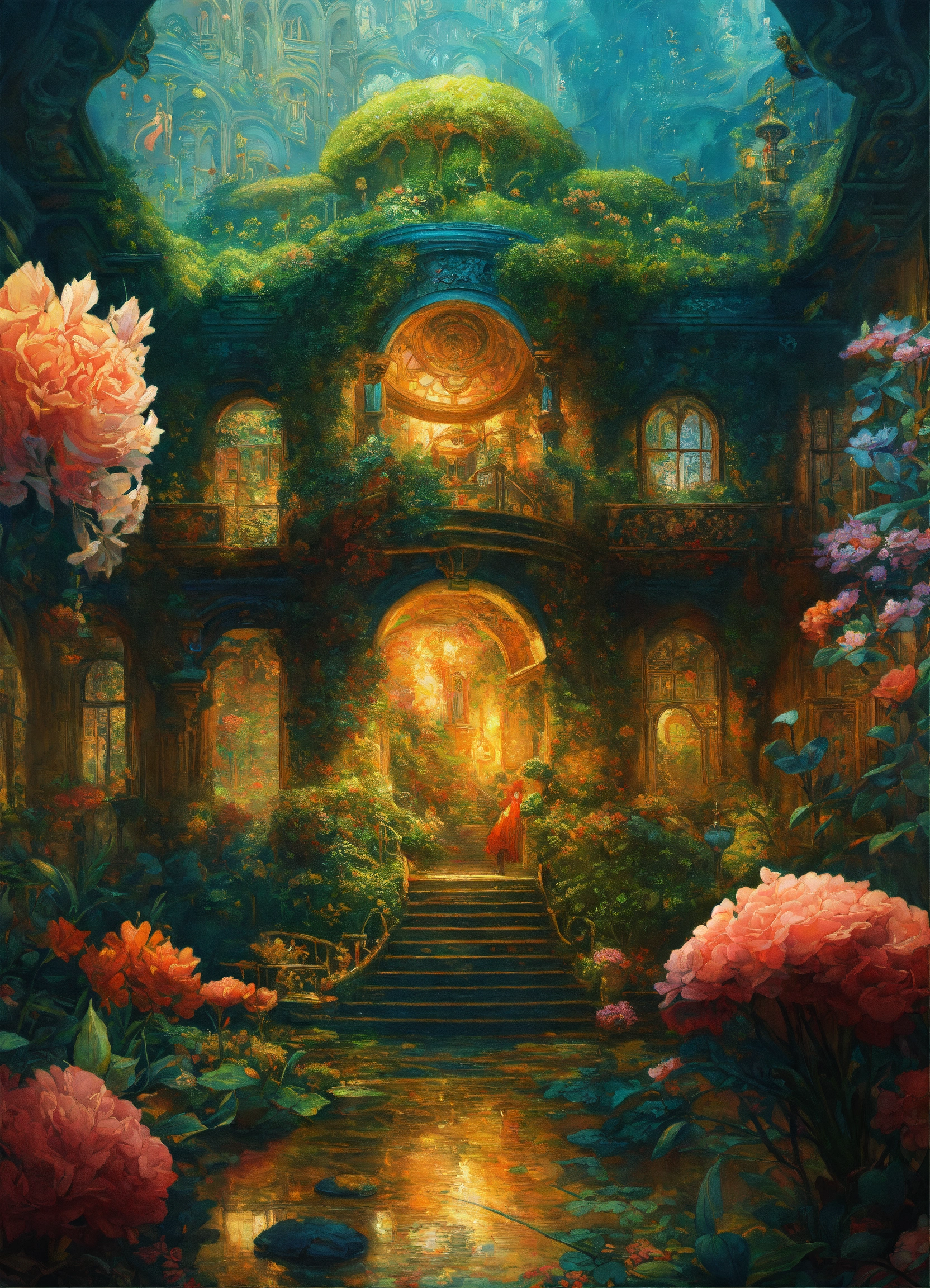 An ultra hd detailed painting of secret garden by android jones, earnst haeckel, james jean. behance contest winner, generative art, baroque, intricate patterns, fractalism, movie still, photorealistic