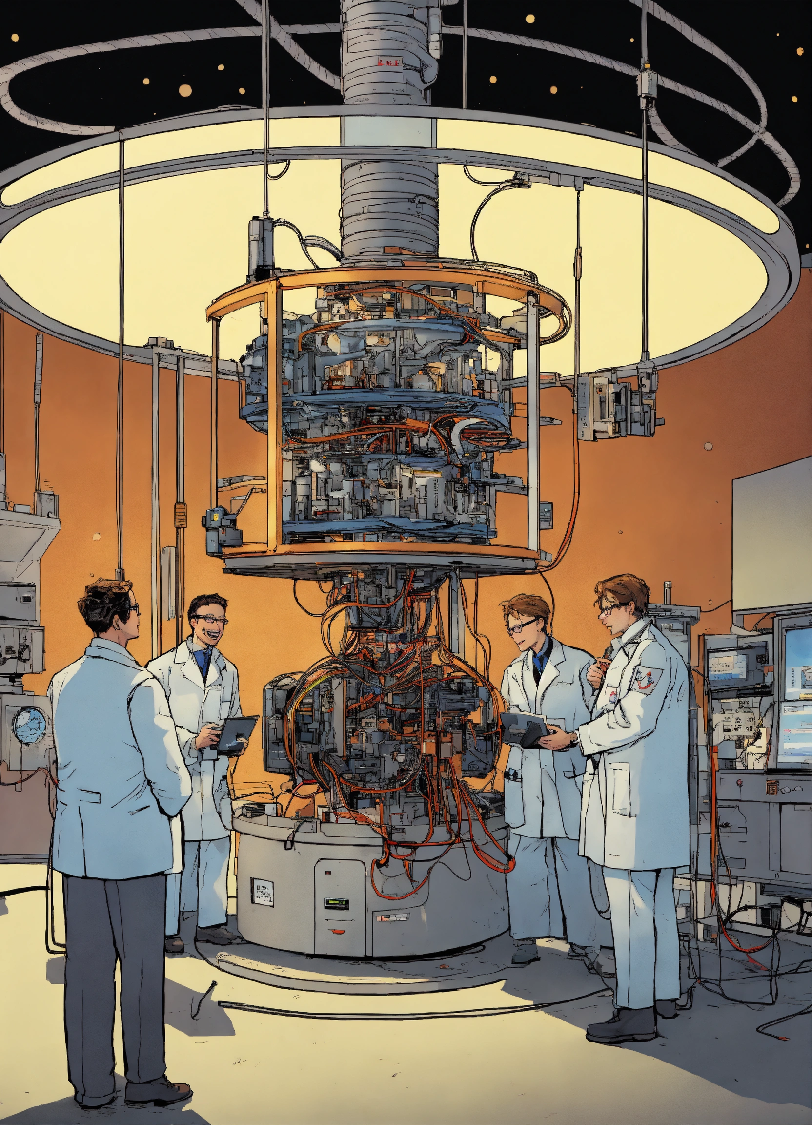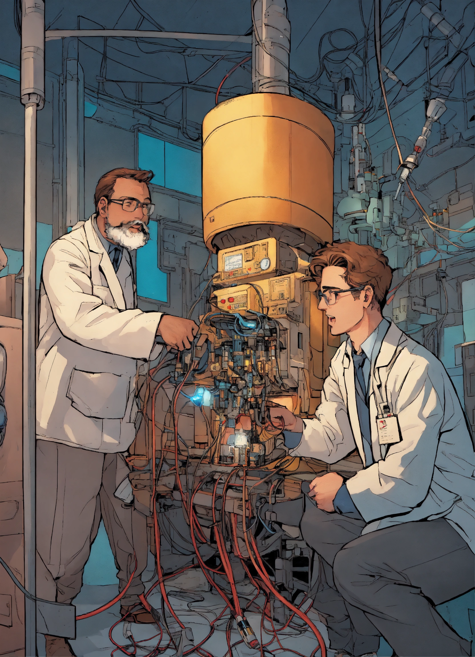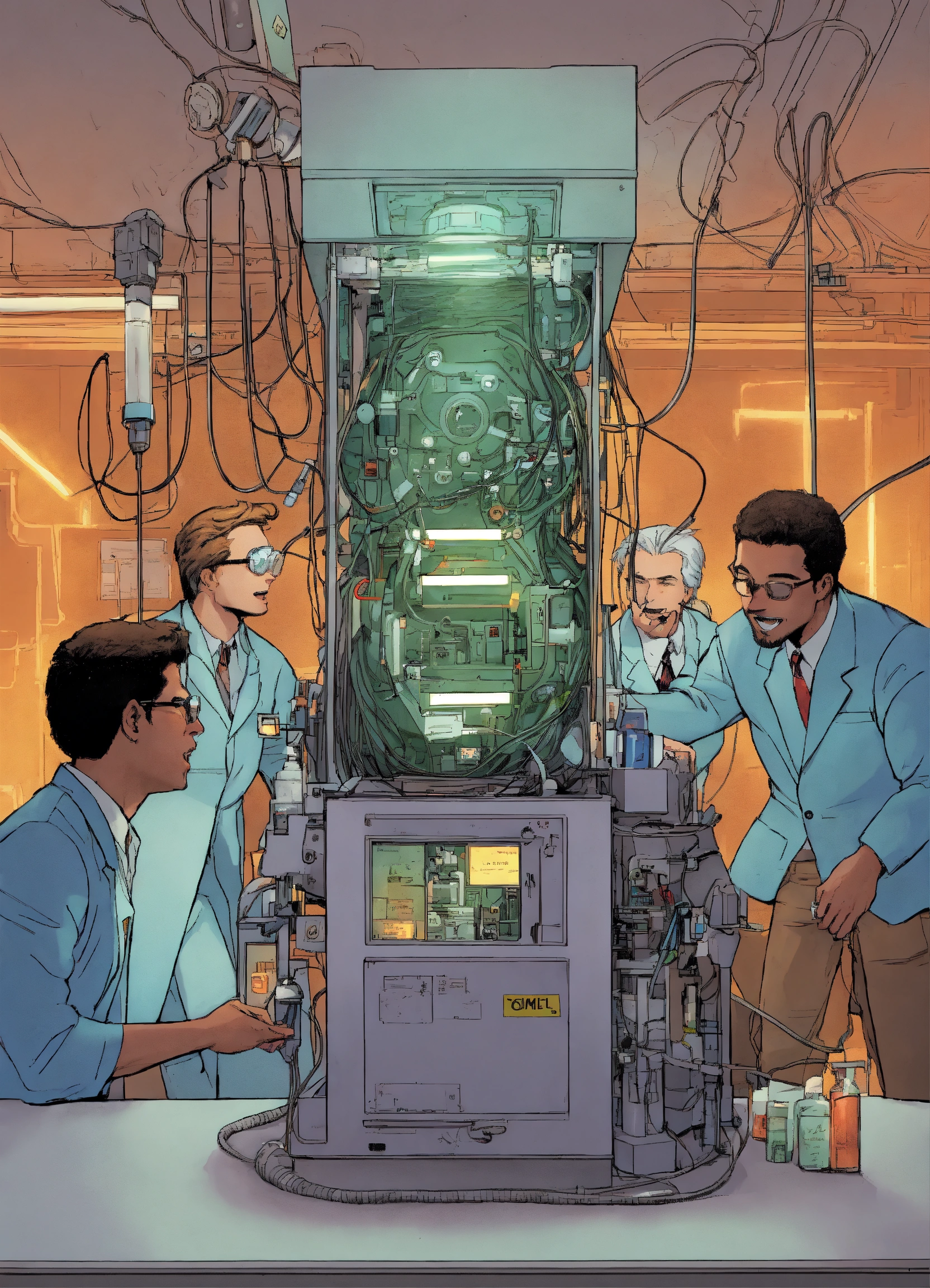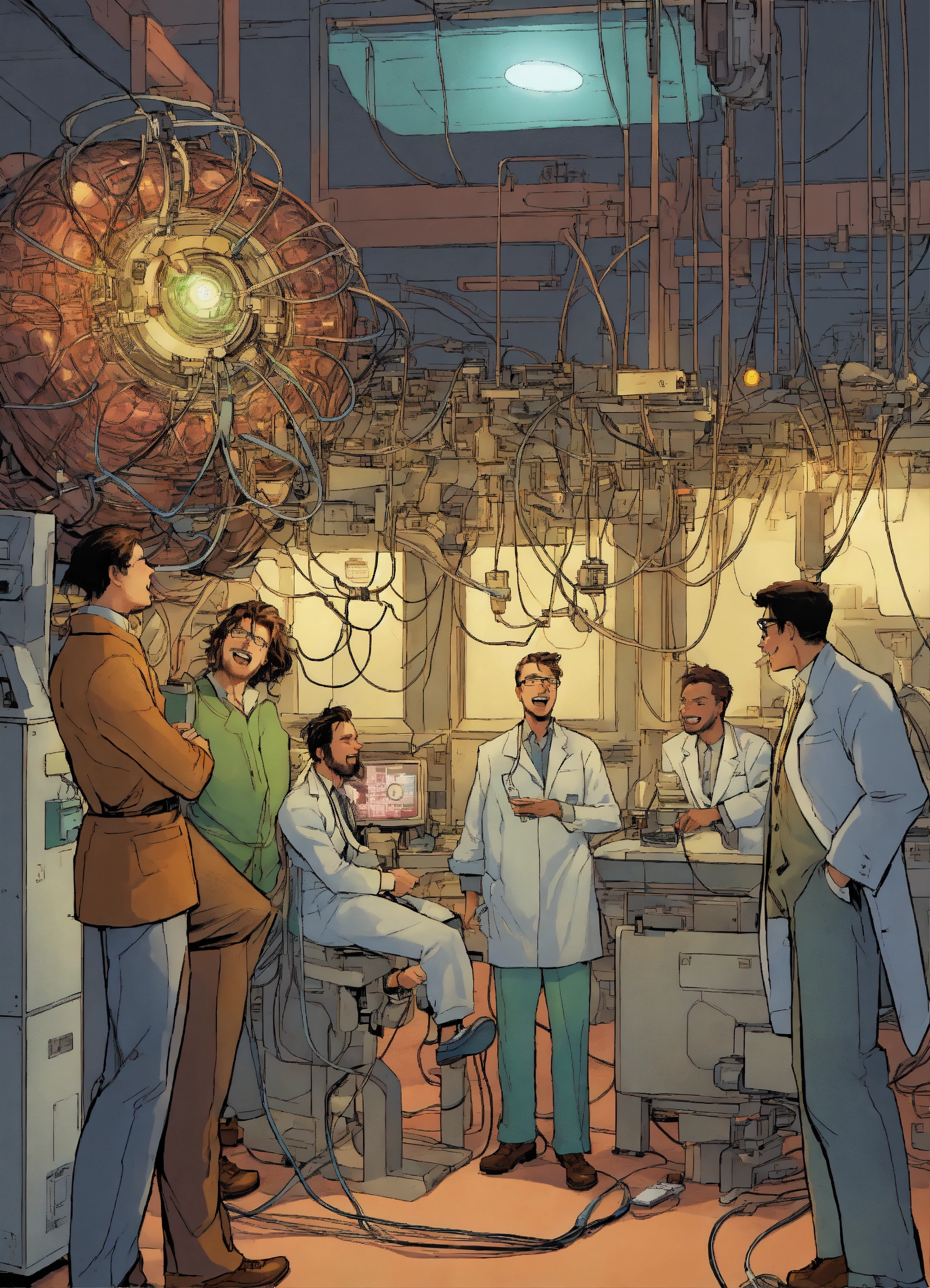 Comic a group of scientists excitedly gather around a machine with wires connecting to john's head