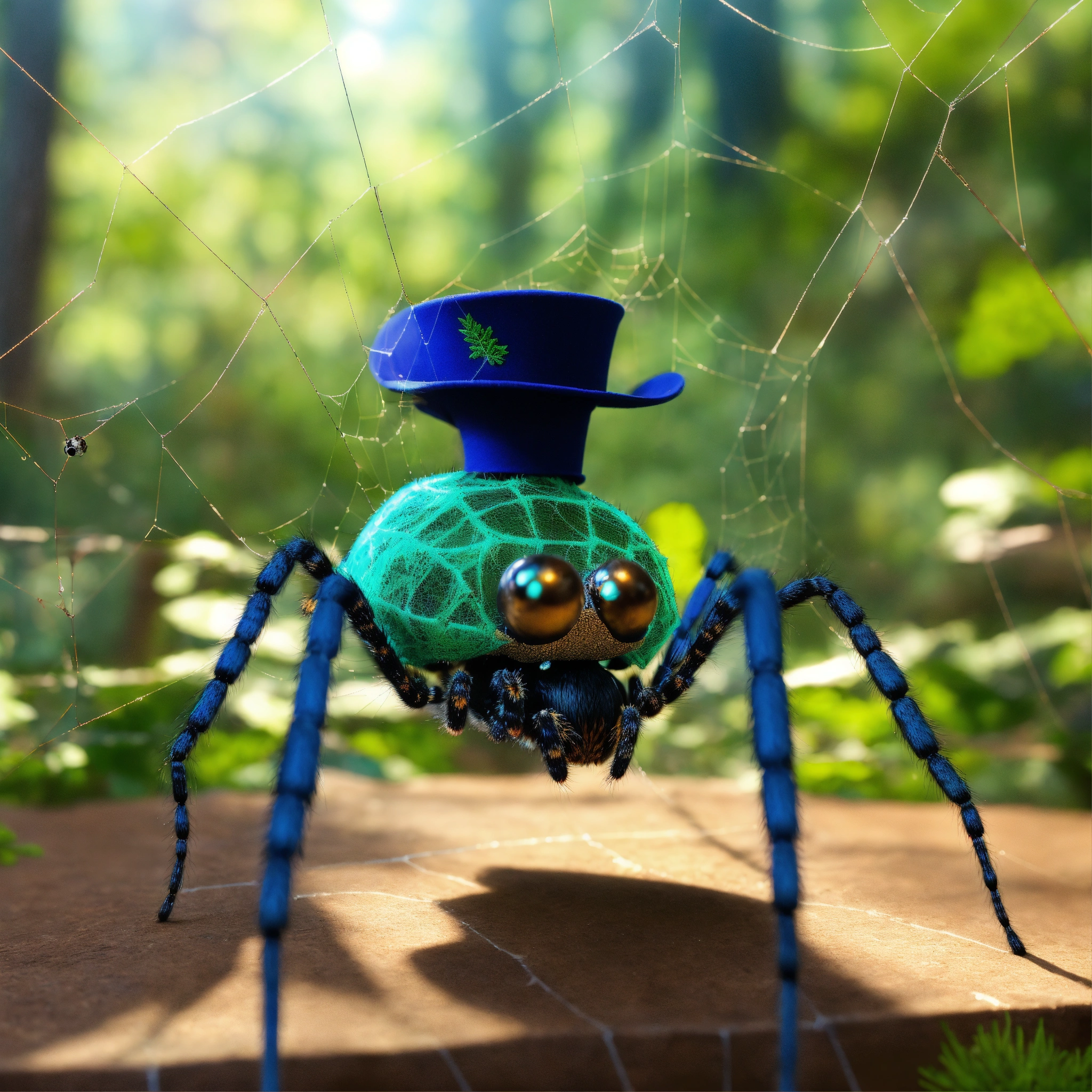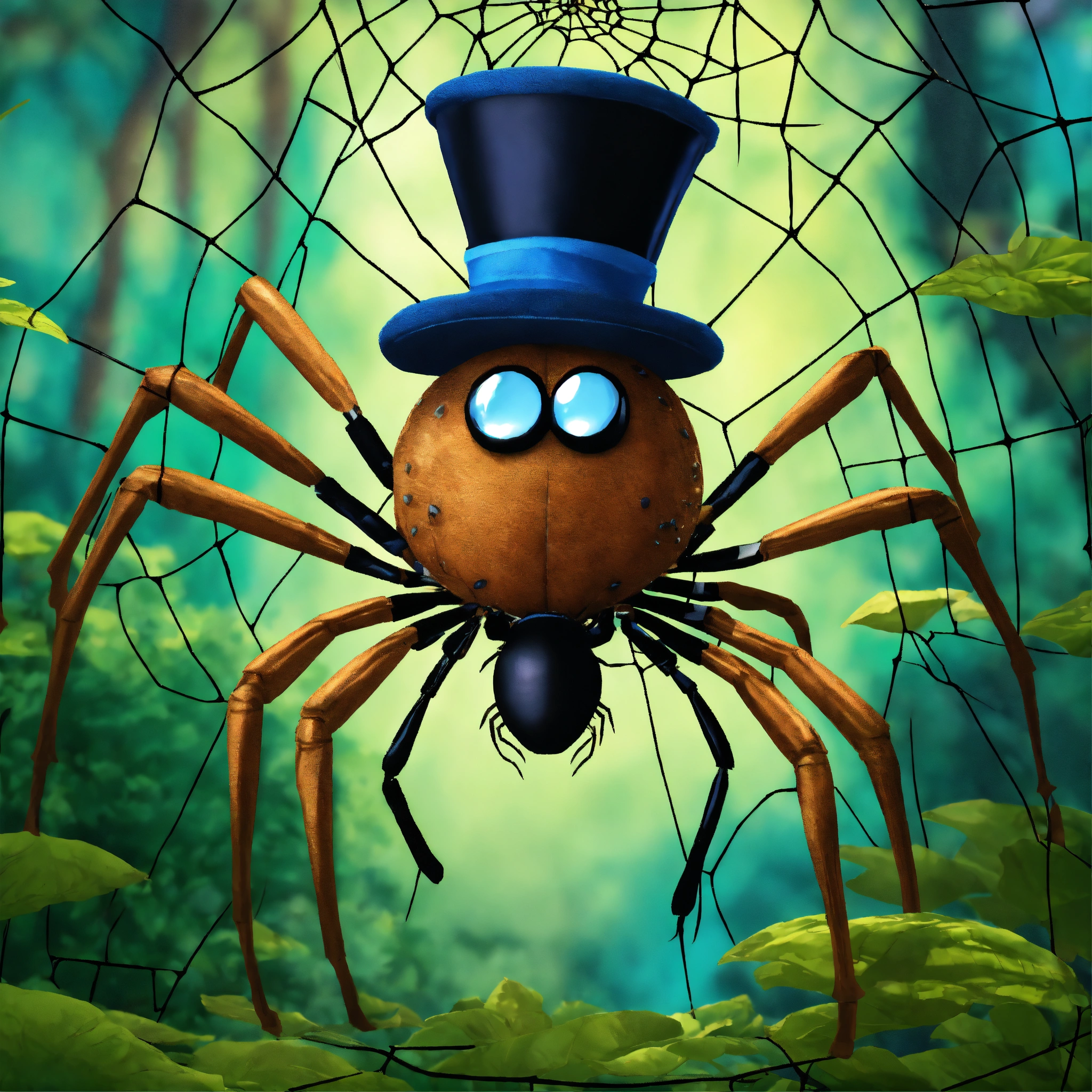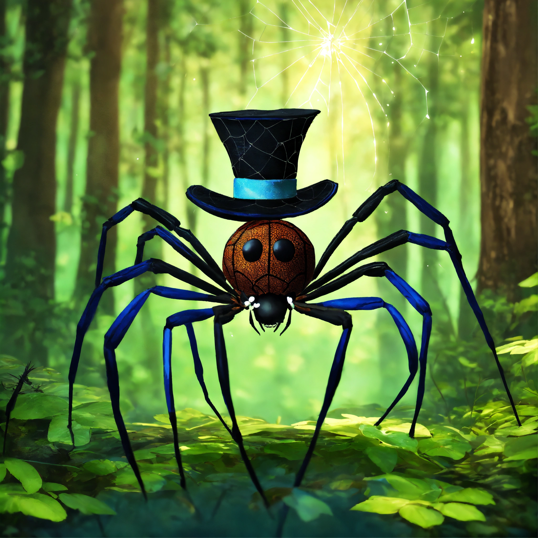 A digital animation of a charming spider with expressive eyes, wearing a dapper top hat, tap-dancing on a shimmering web. the web is in a forest setting with dappled sunlight filtering through the trees. greens and browns in the background harmonize with the spider's vivid blue and black colors.