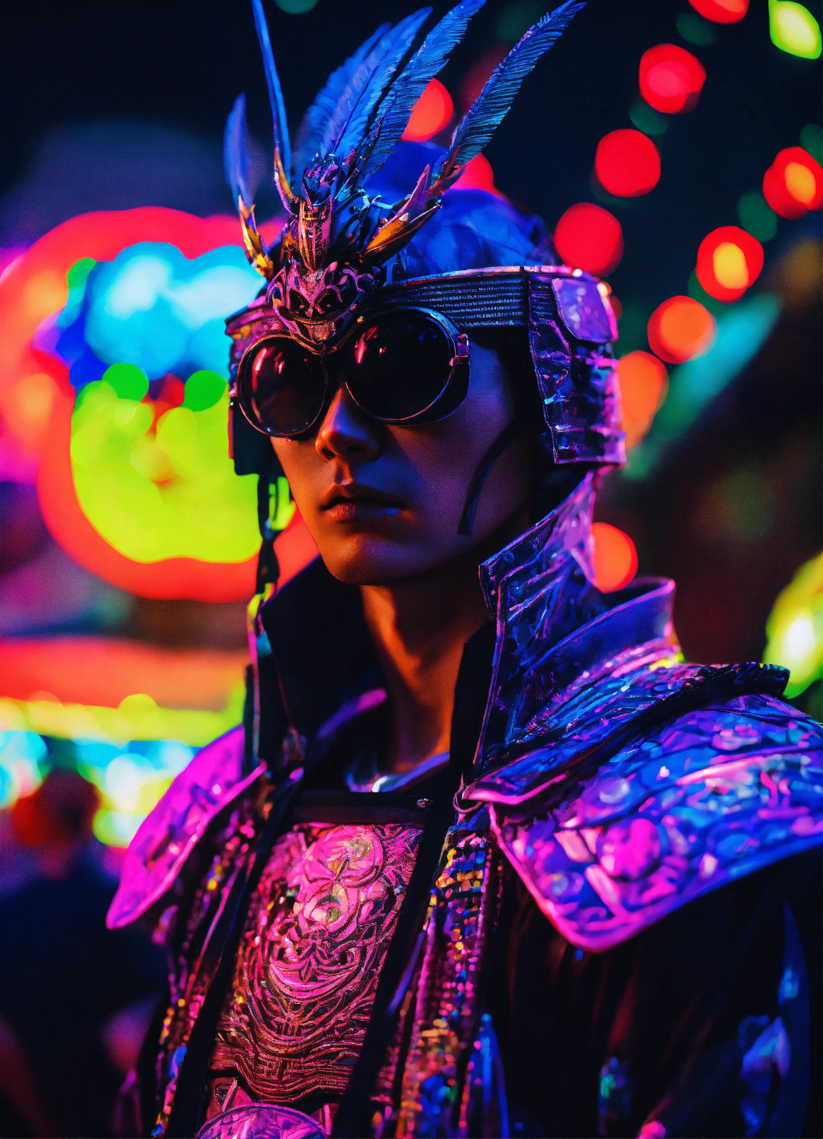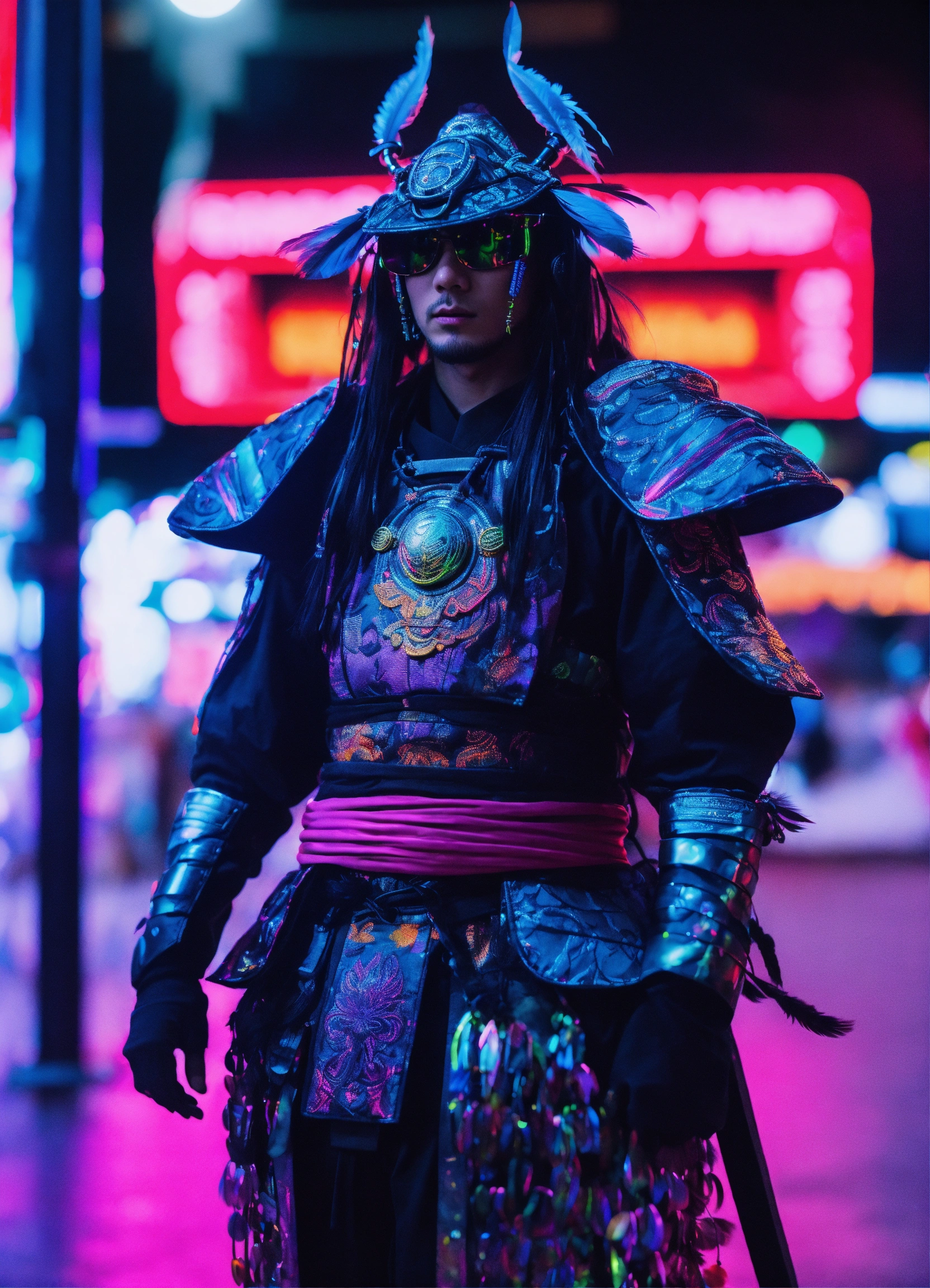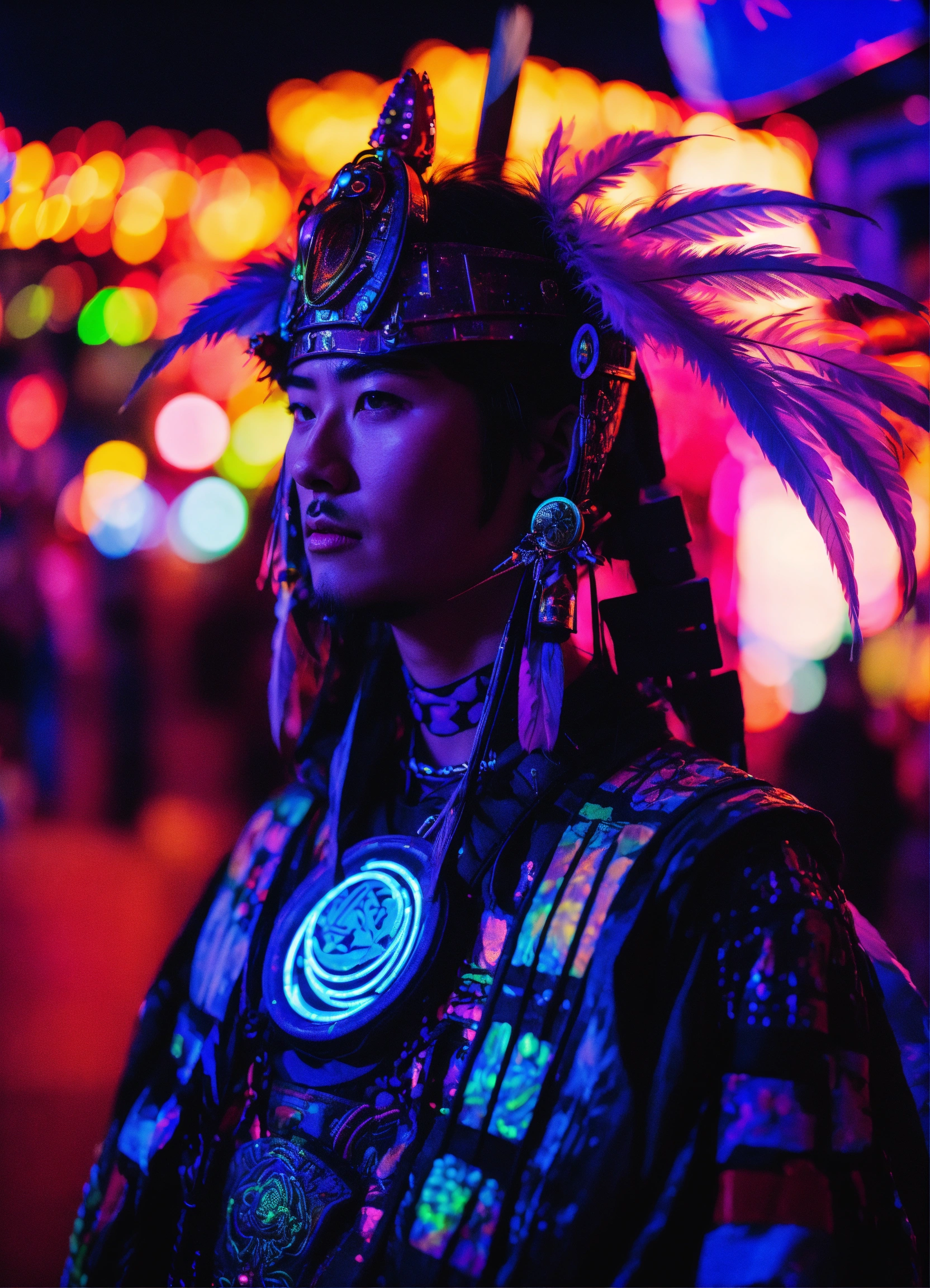 Photorealistic 3d portrait samurai alien in colorado festival metal feather raver outfit in dmt black light neon moon tokyo city night 35mm film, akira anime.