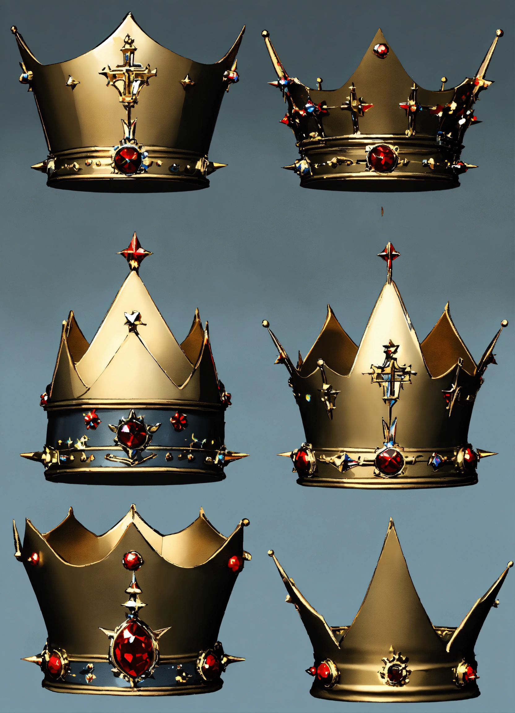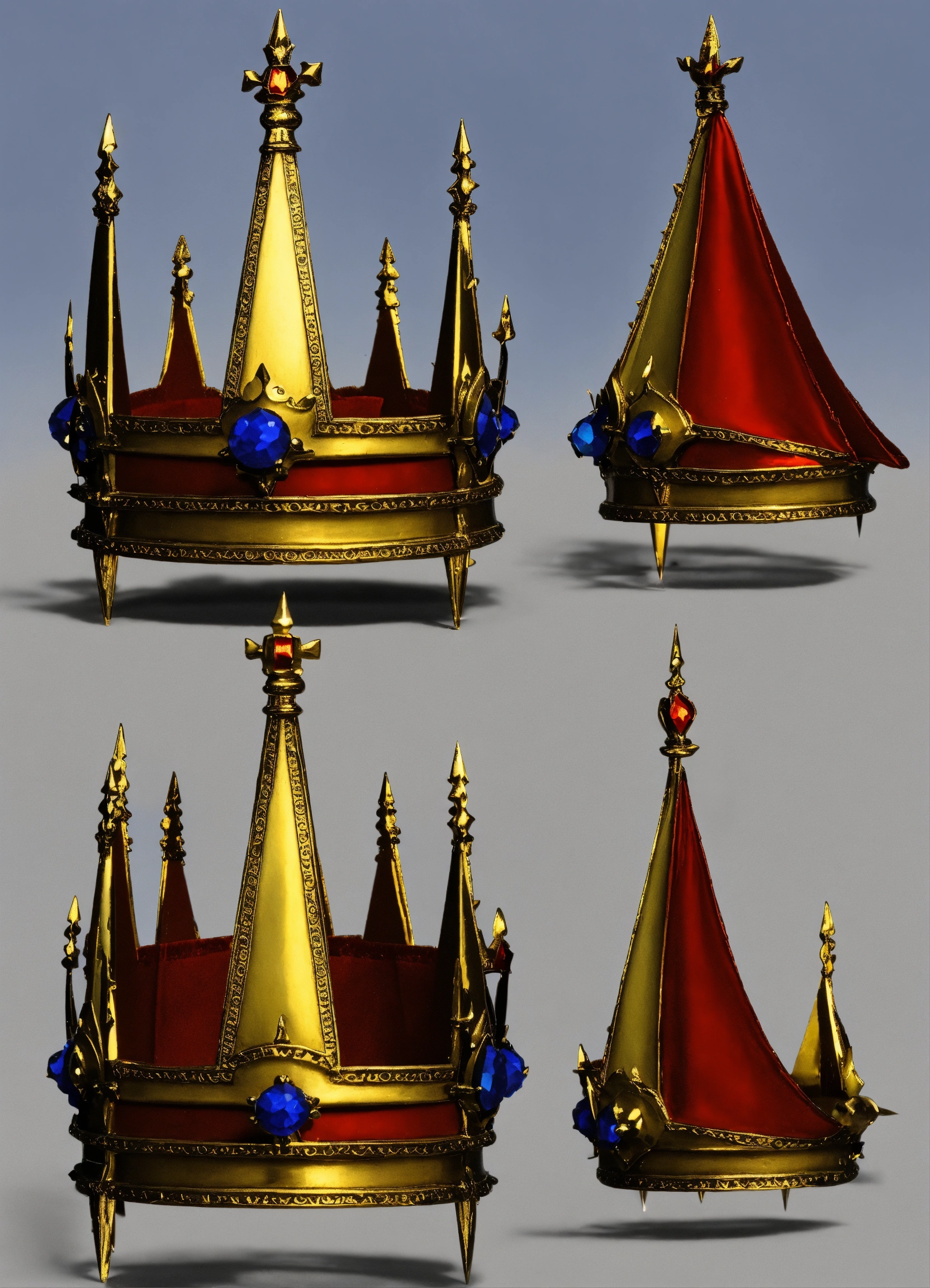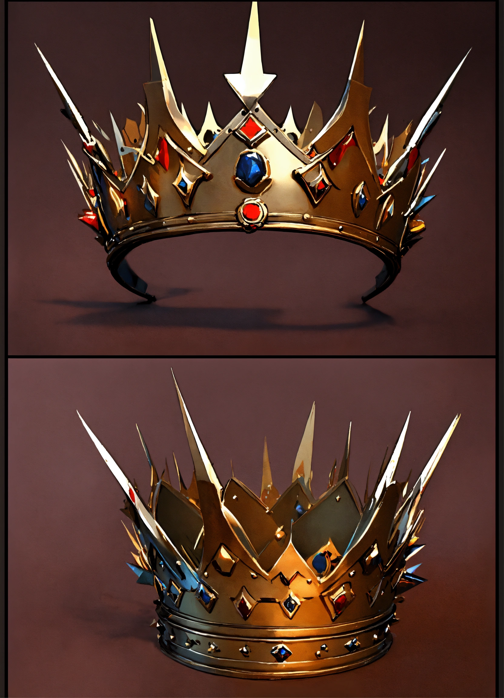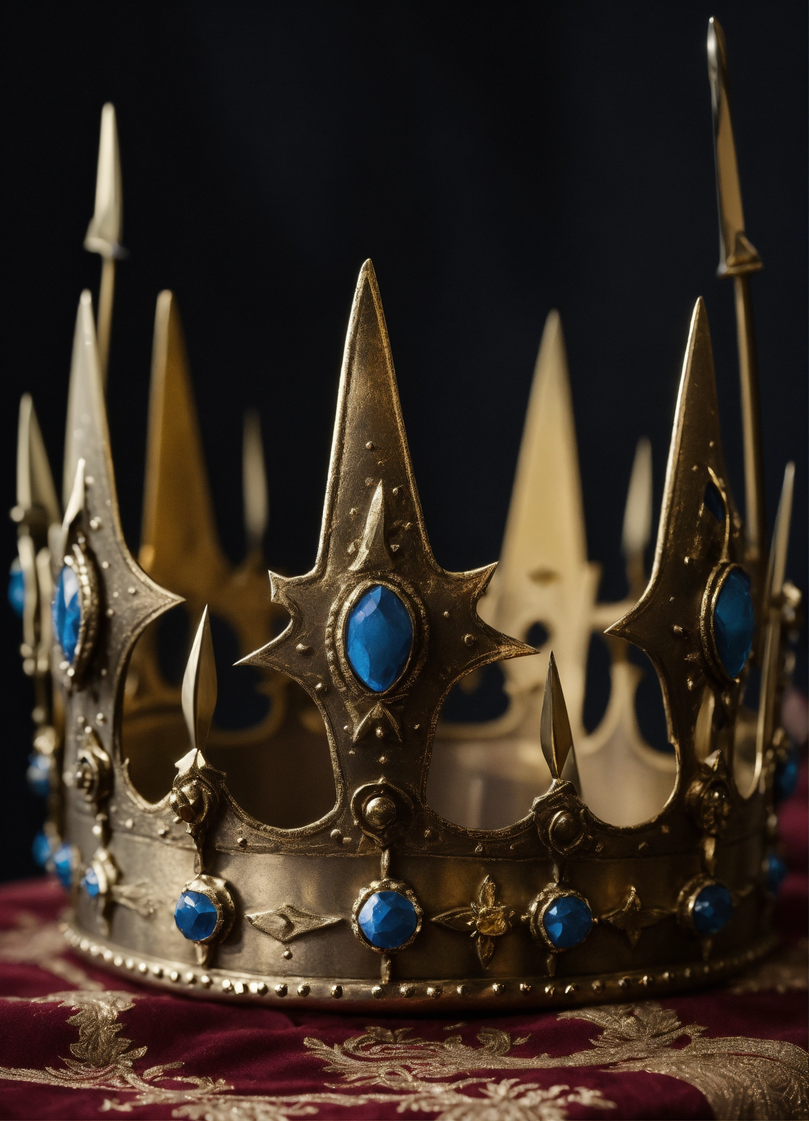 Create a crown medieval king crown with 5 spike in front, it has 5 tips, they are the tips of like swords, but smaller. side view, only 5 tips, 5 spike crown only