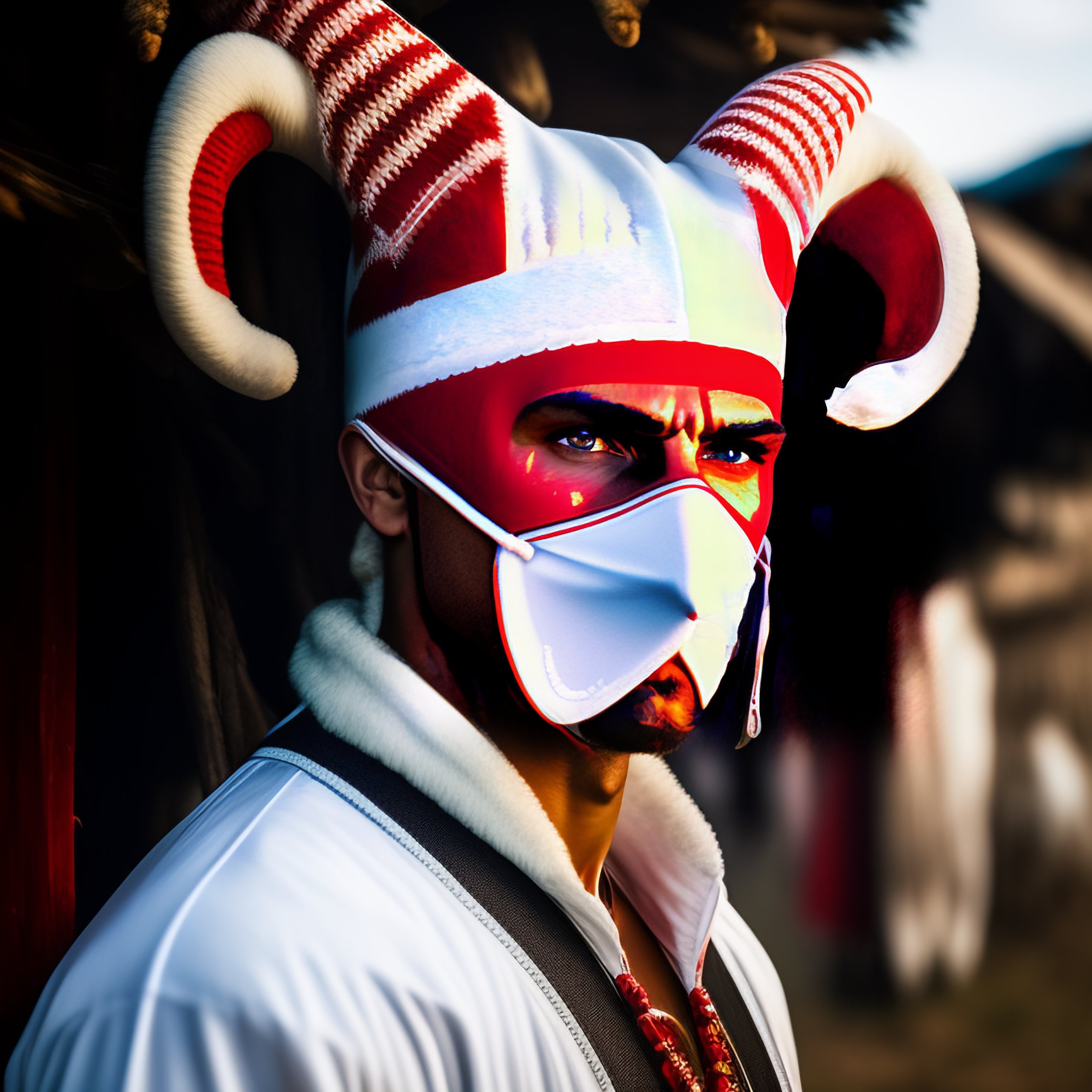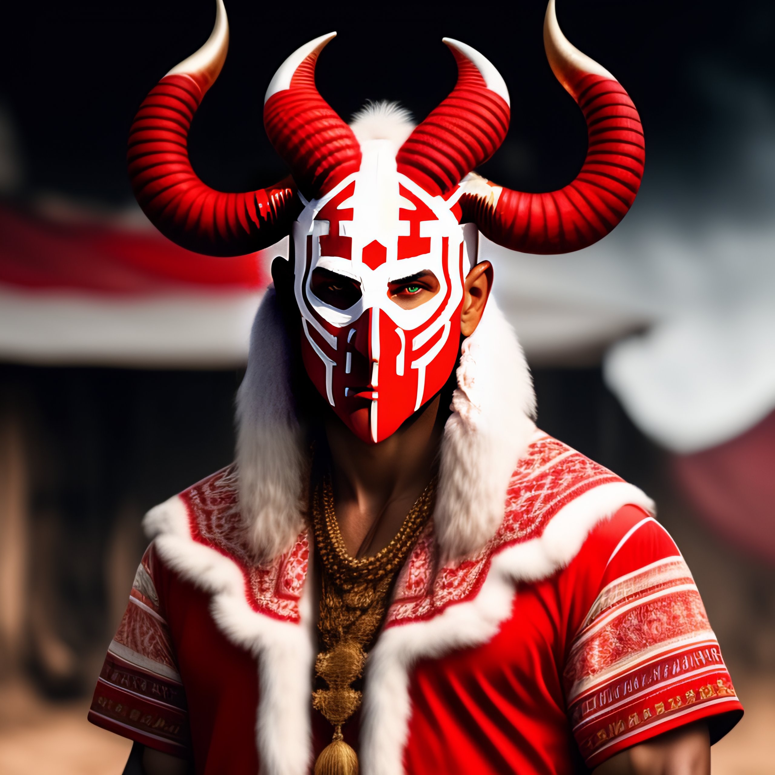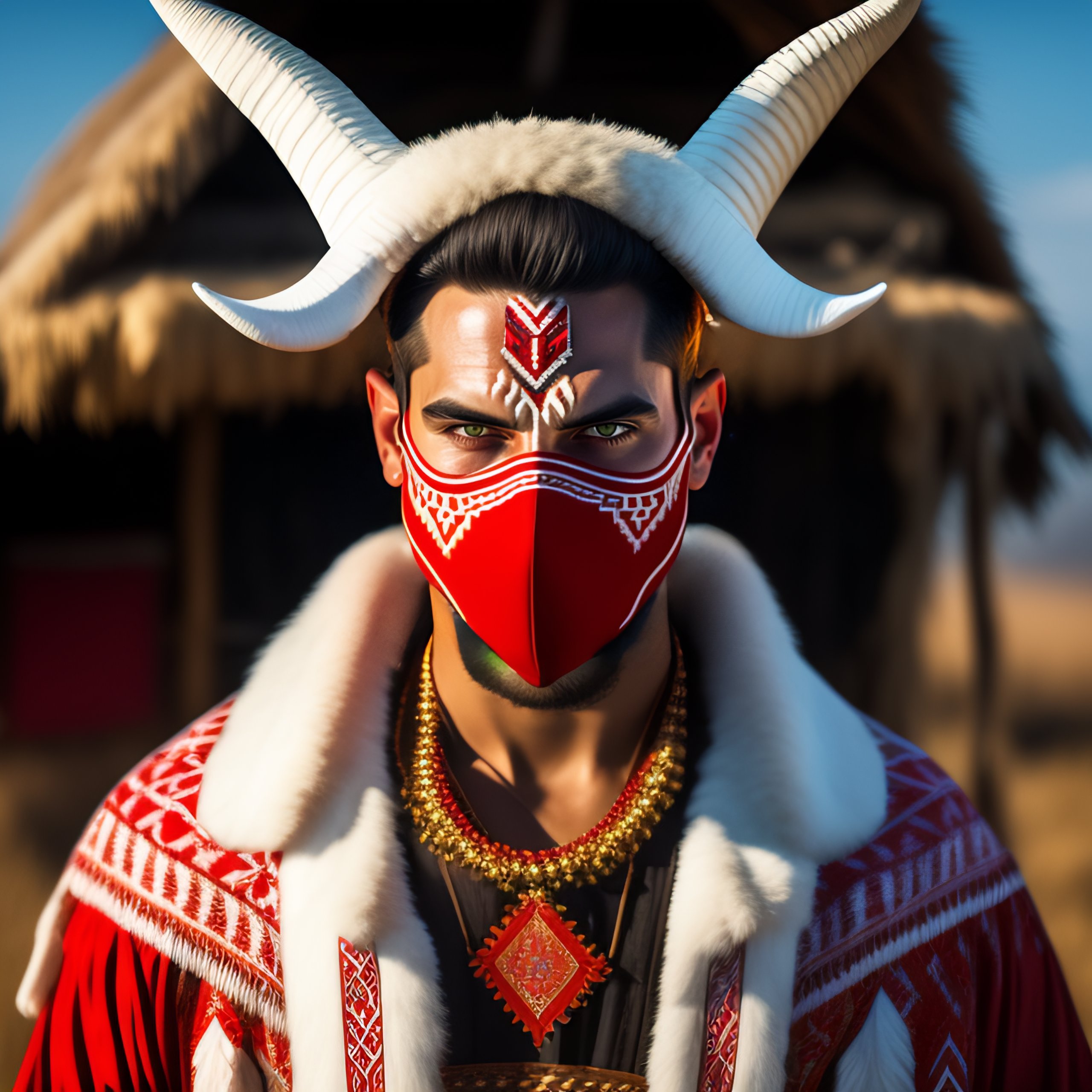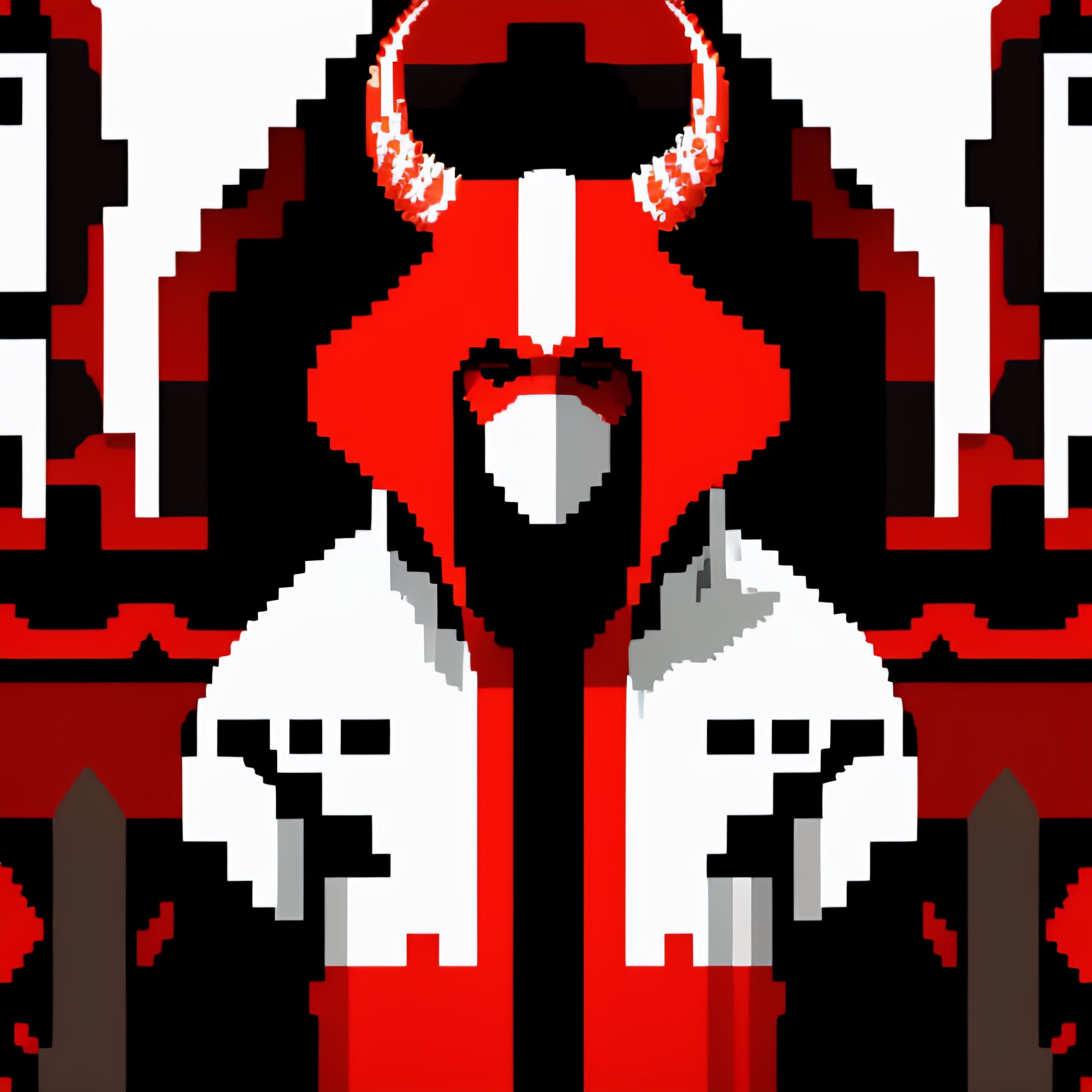 Pixel art style, low resolution, wide angle environmental shot of a mysterious slavic man wearing a white mask with big goat horns in tribal clothing with red and white balkan type patterns, hidden face, cluttered and messy shack, pixelart