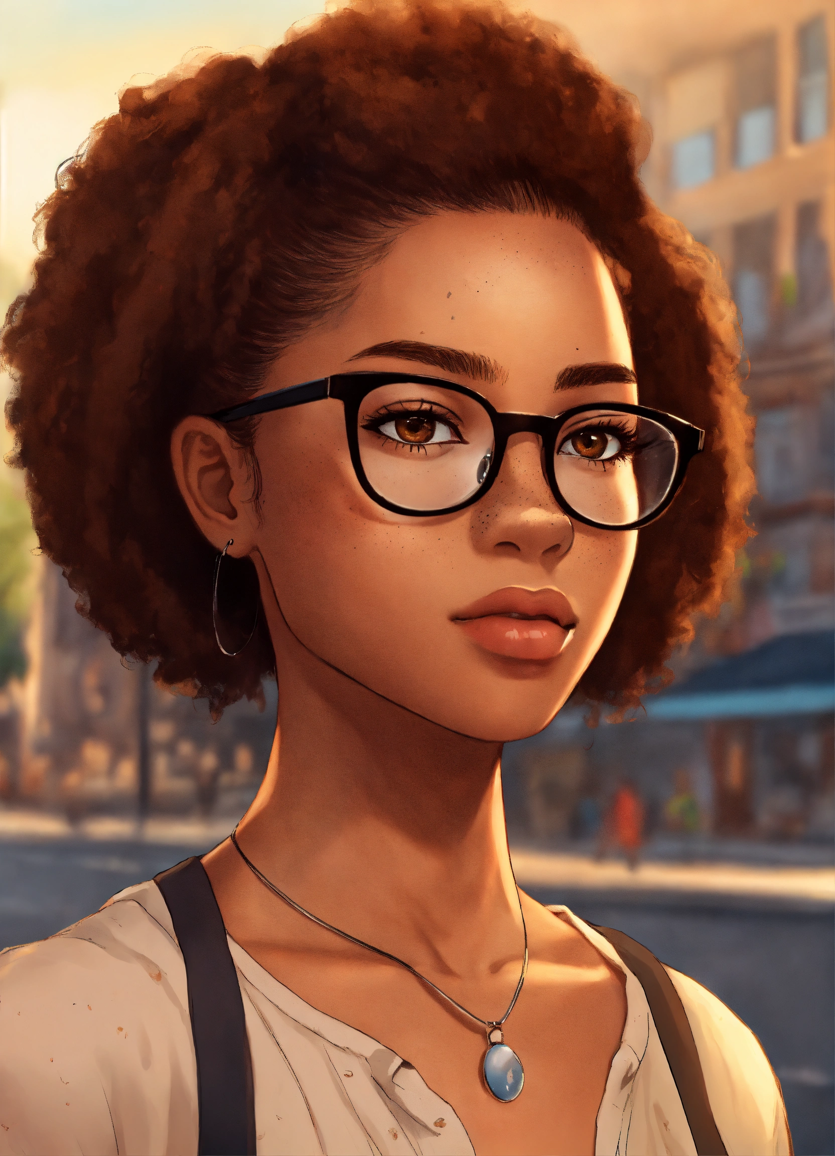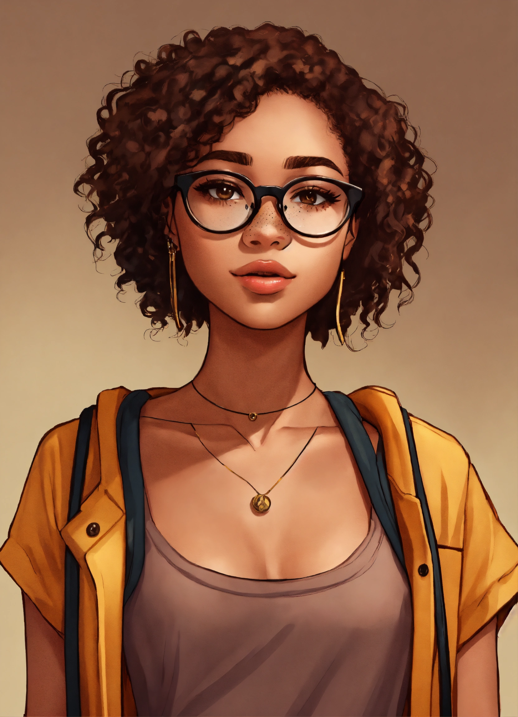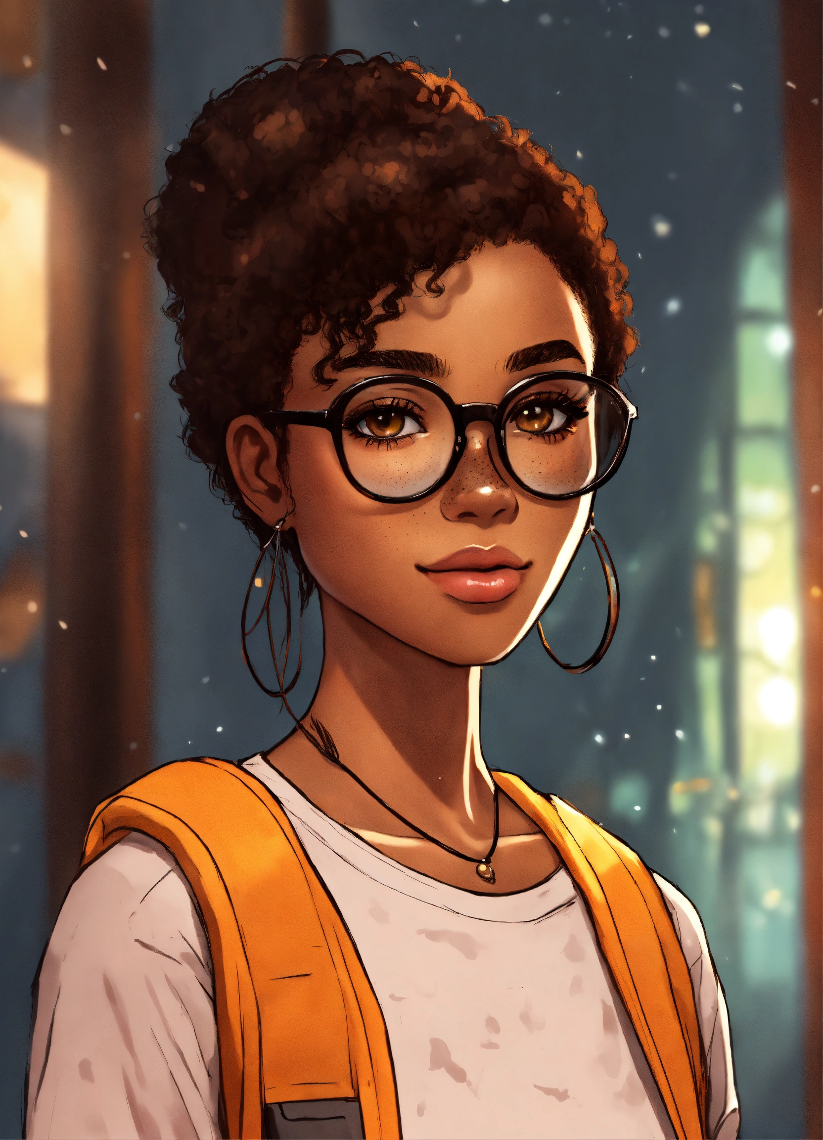 Short light skinned black female, long straight & fluffy brown hair, glasses, freckles, brown eyes, no imperfections, cartoon