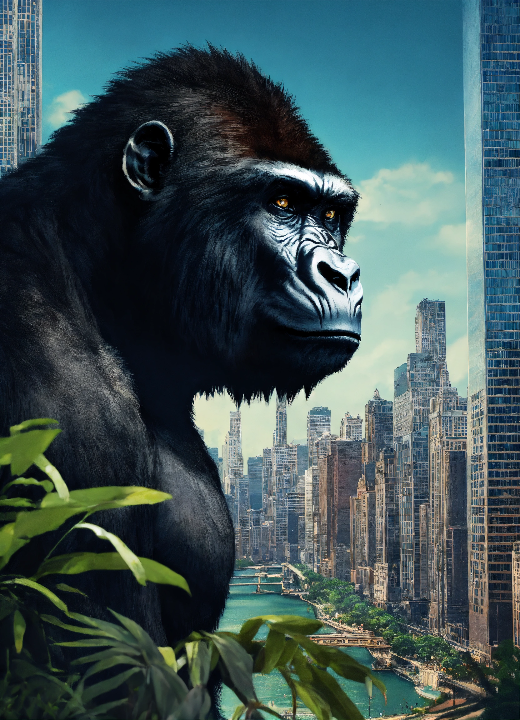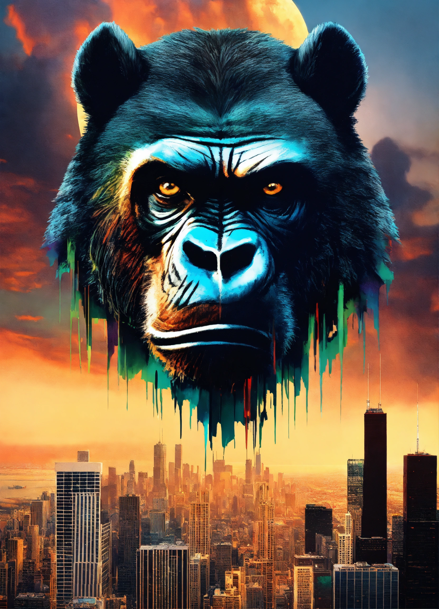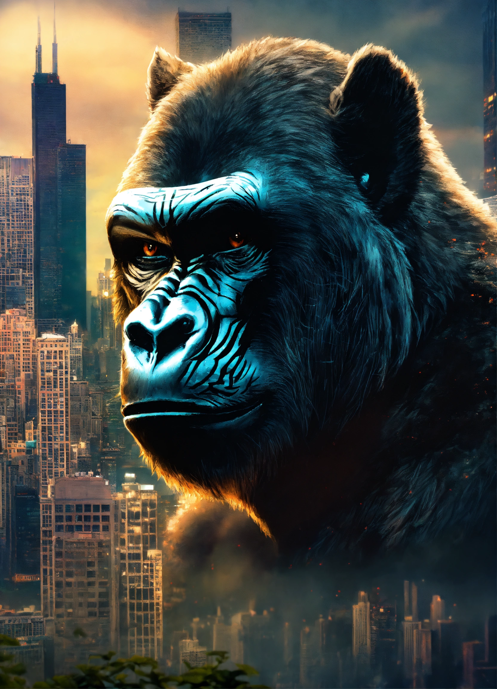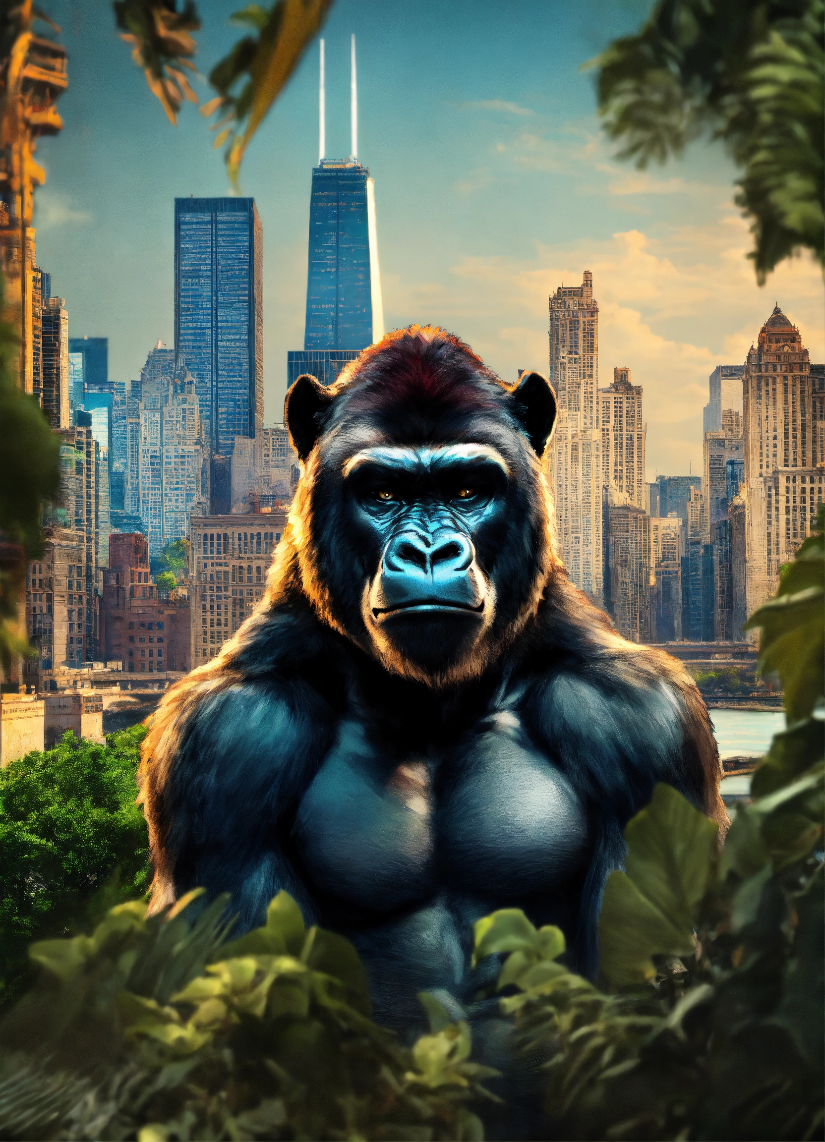 Half wolf half gorilla hybrid face with an jungle and urban city chicago background