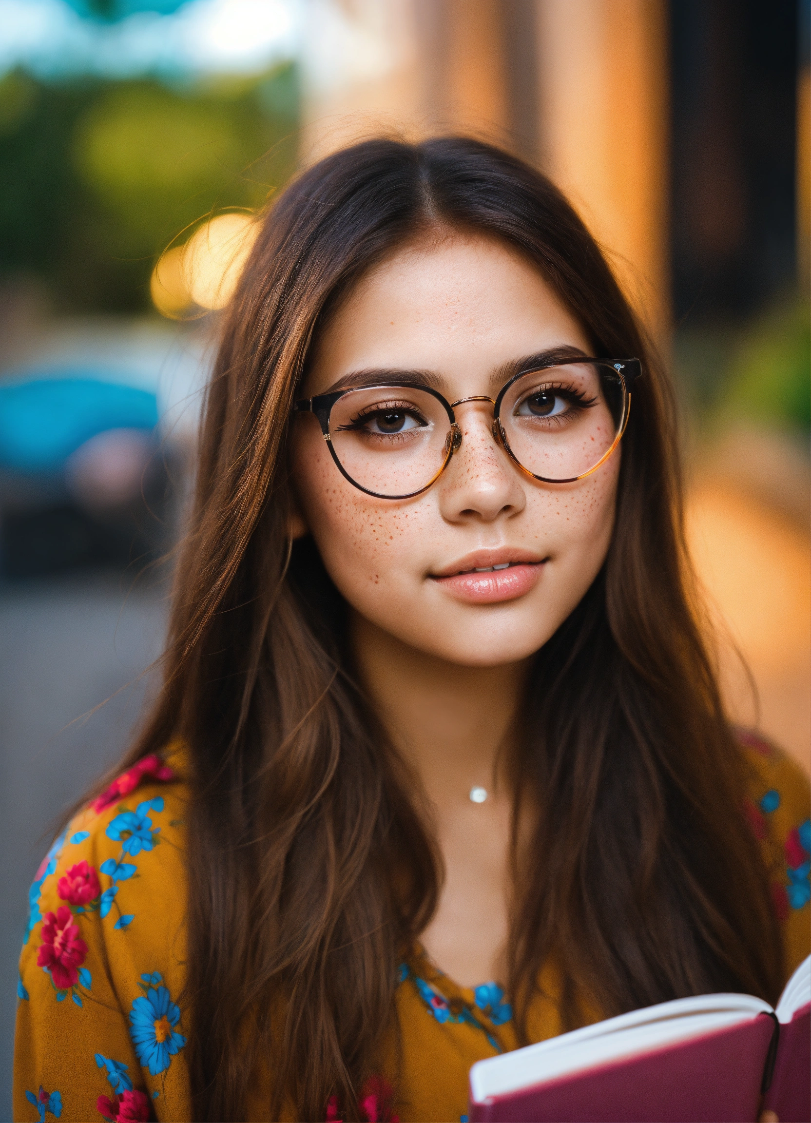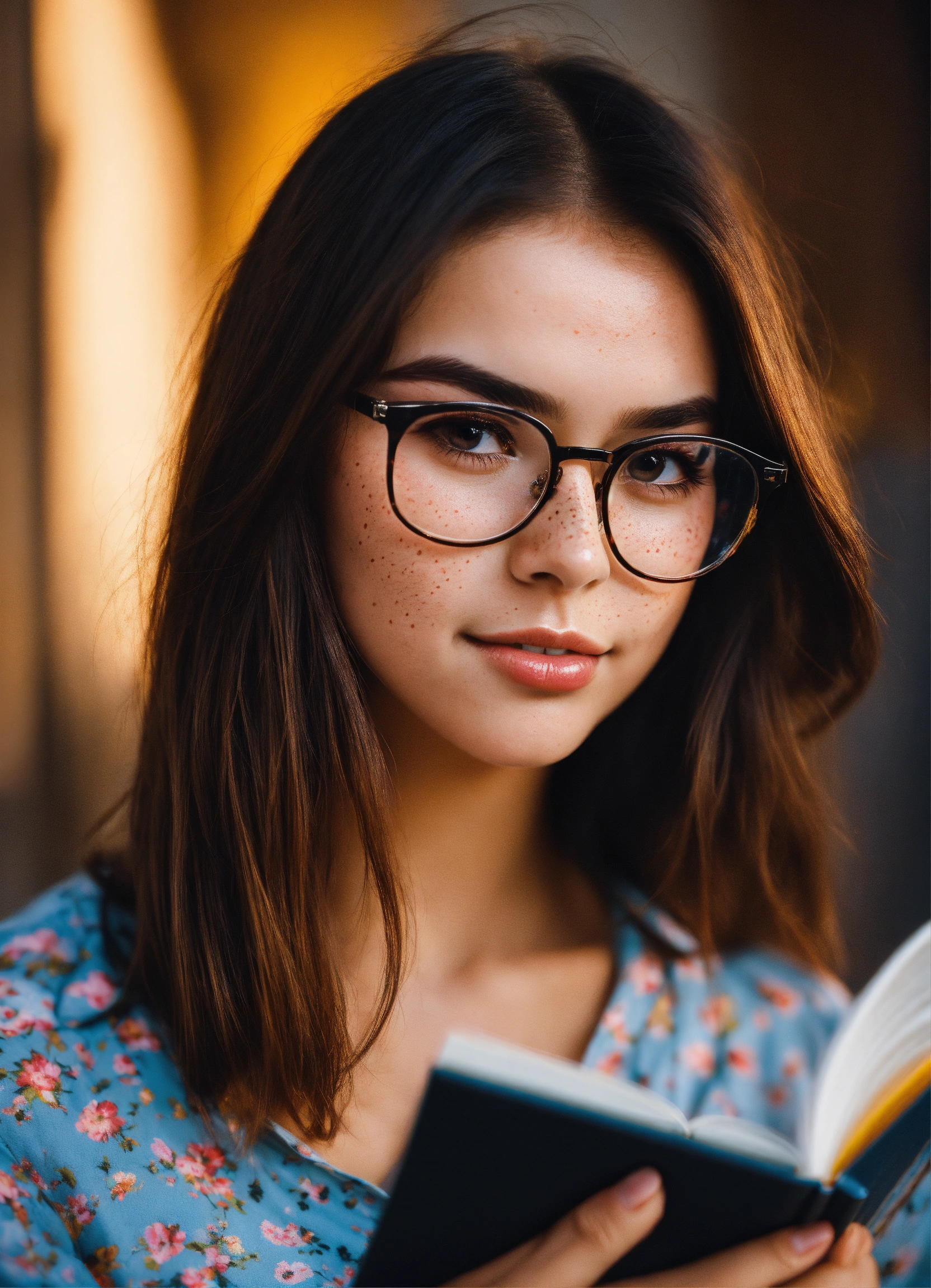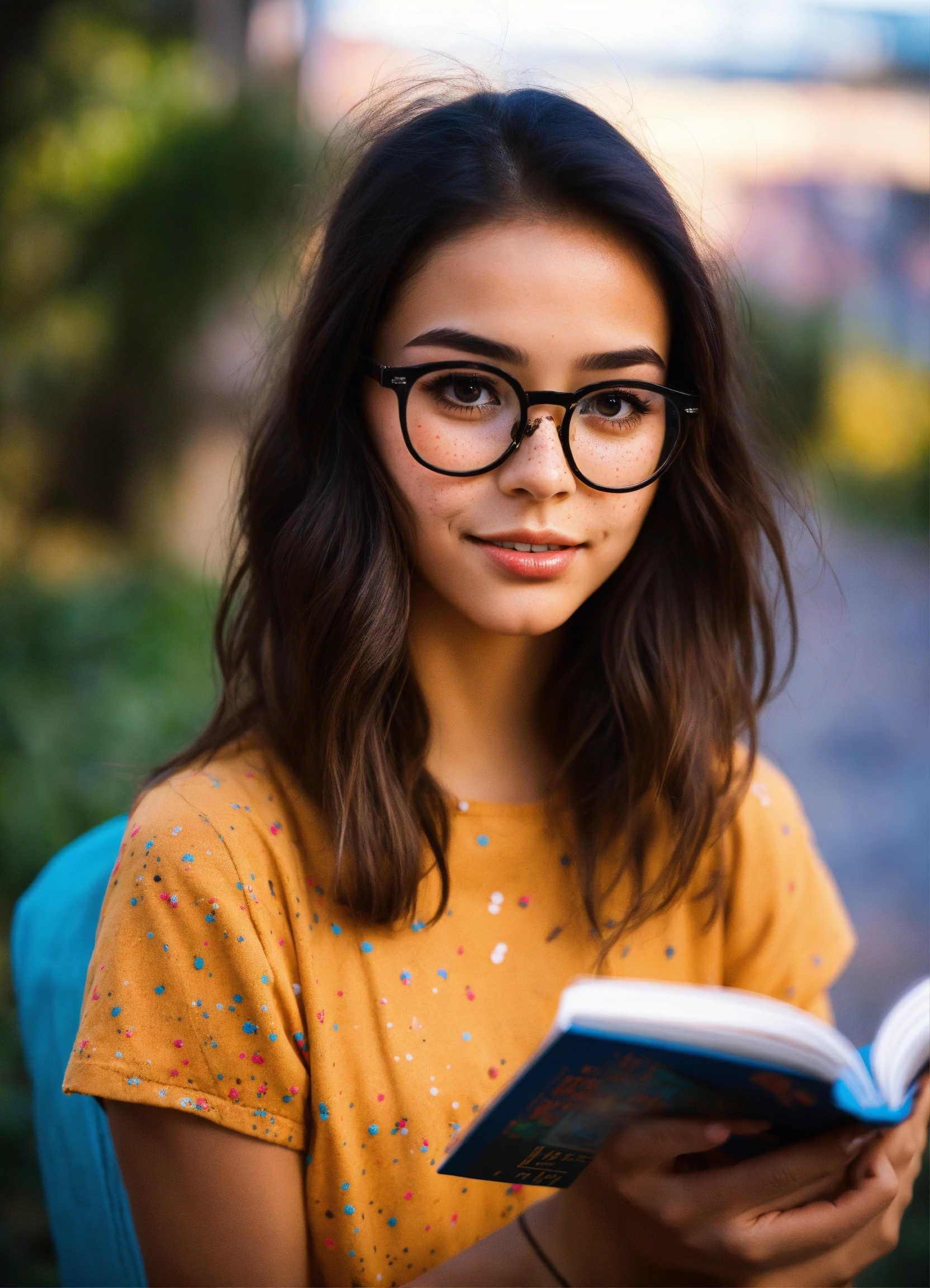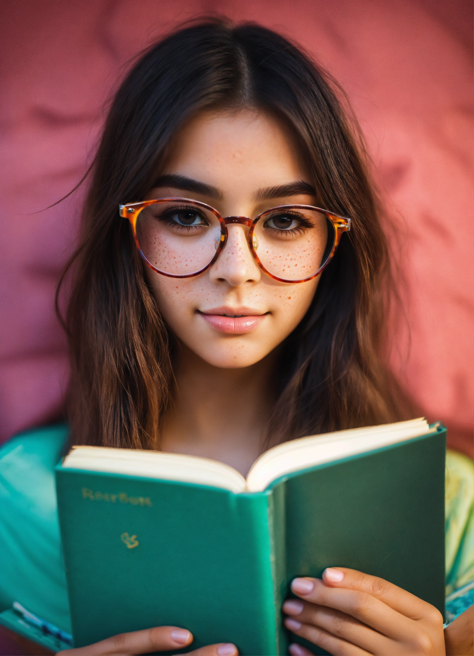 Cute girl straight hair black brown eyes blushing vibrant colors glasses reading a book with freckles on her face arrugas en la frente