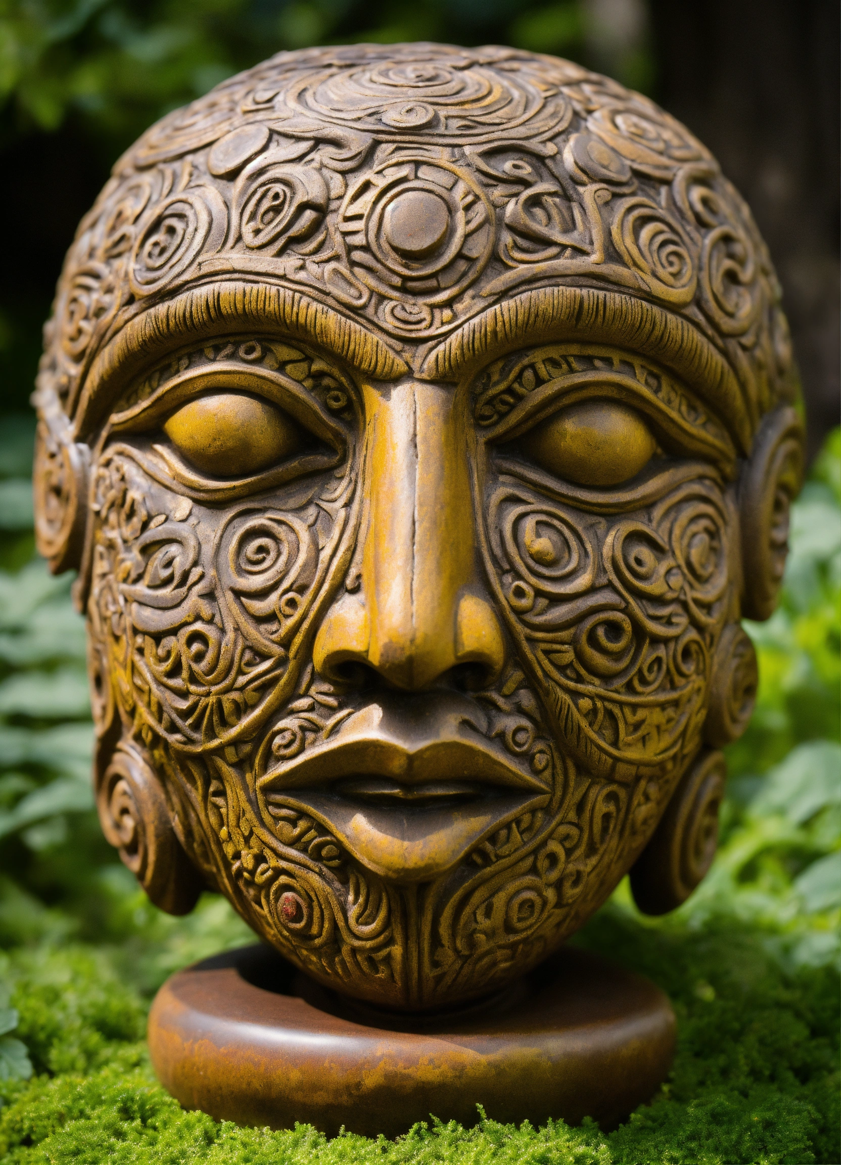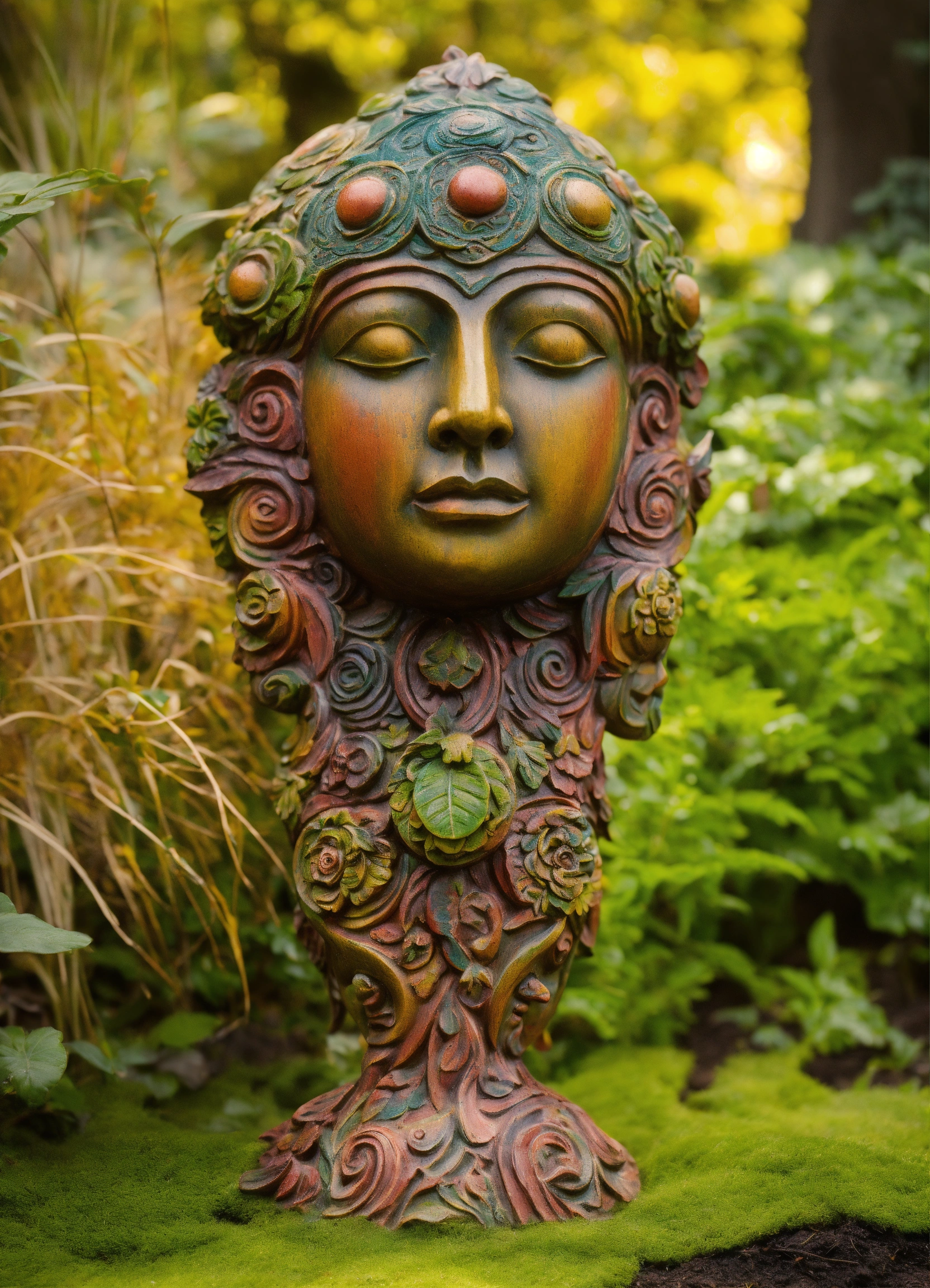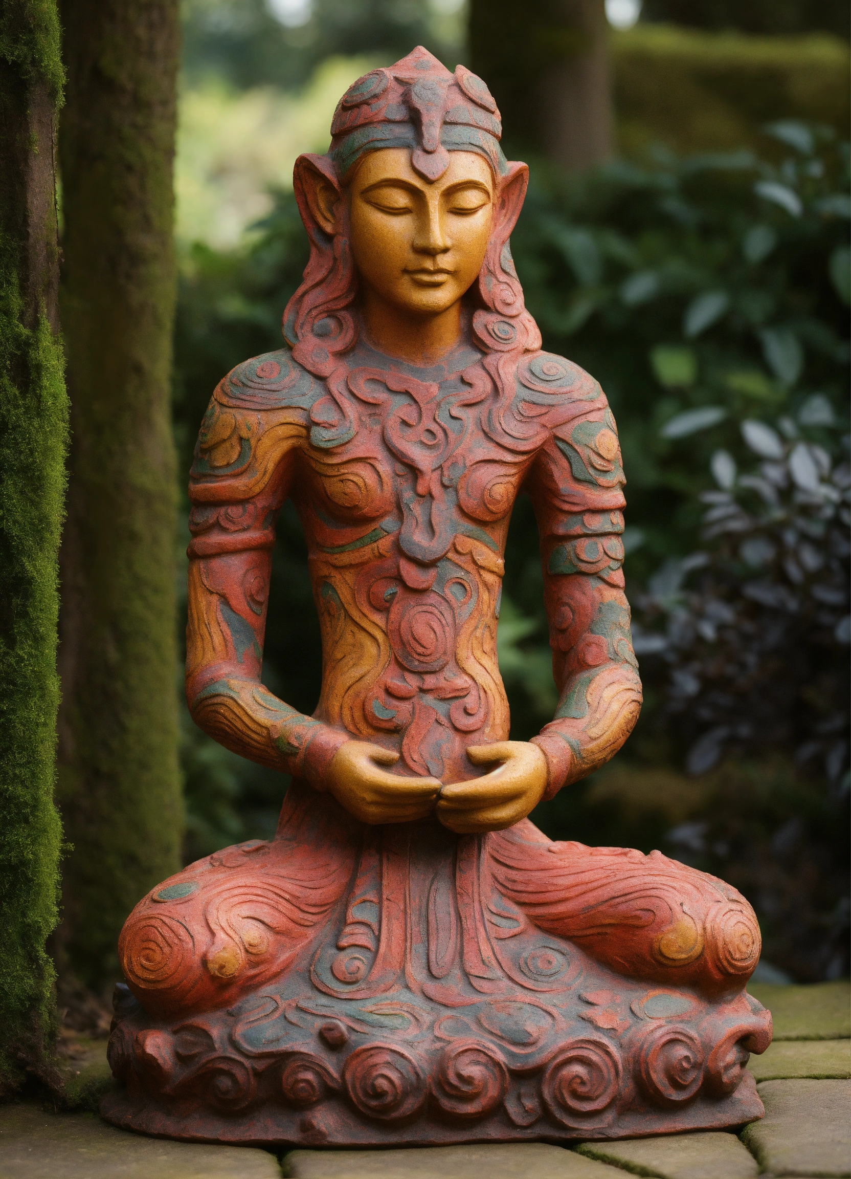 Ancient woodland deity sculpted garden ornament in the style of alex grey