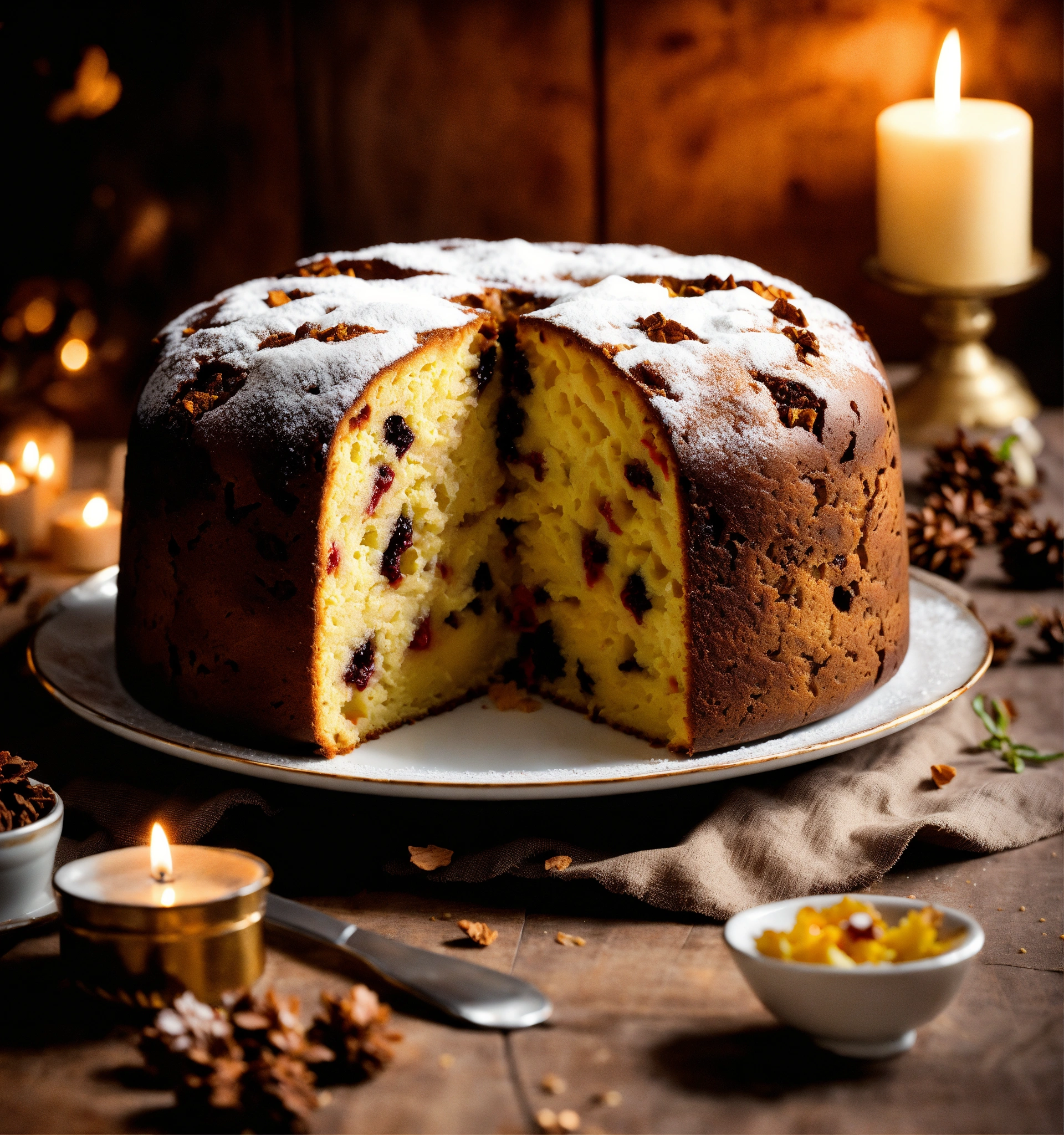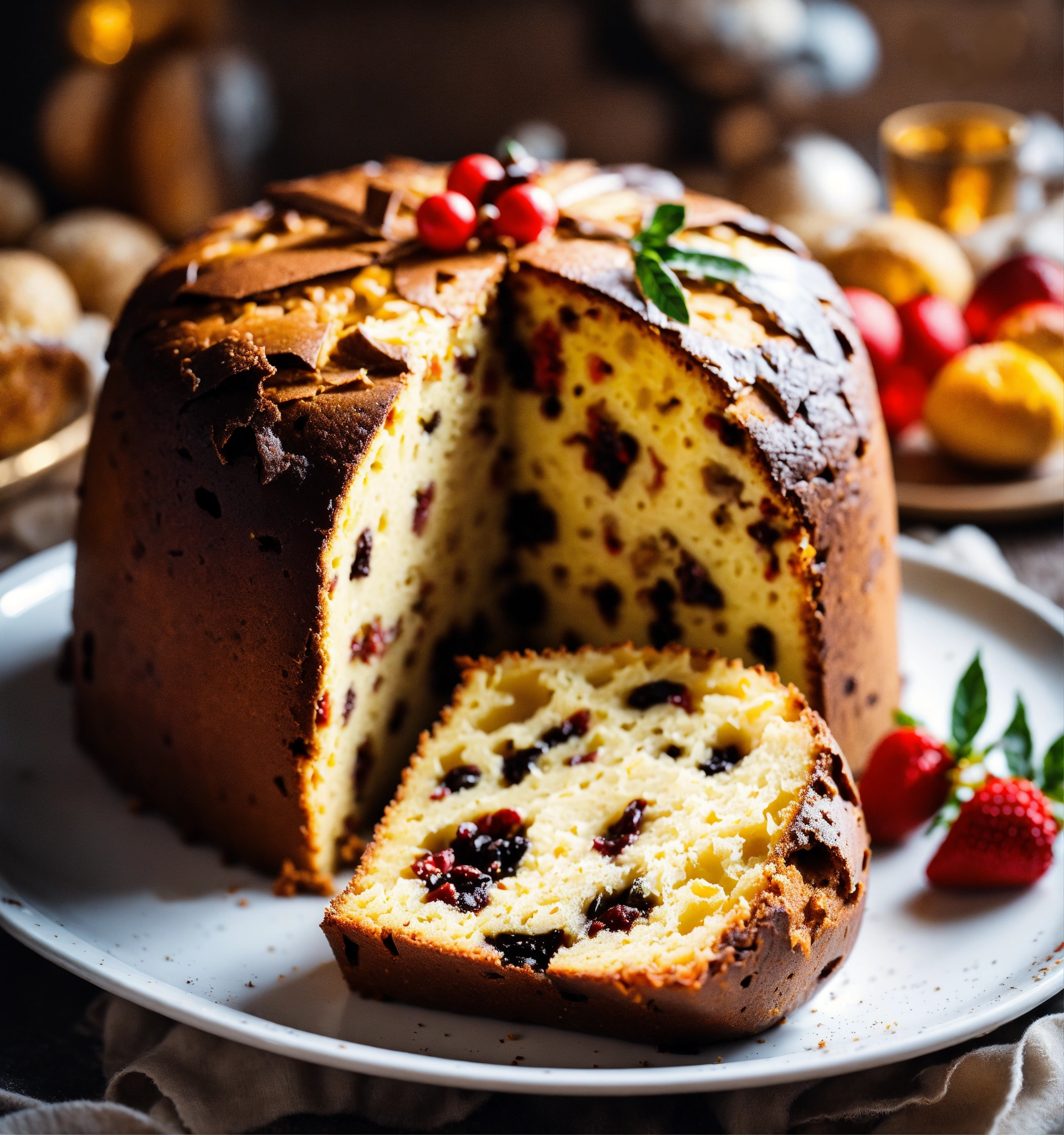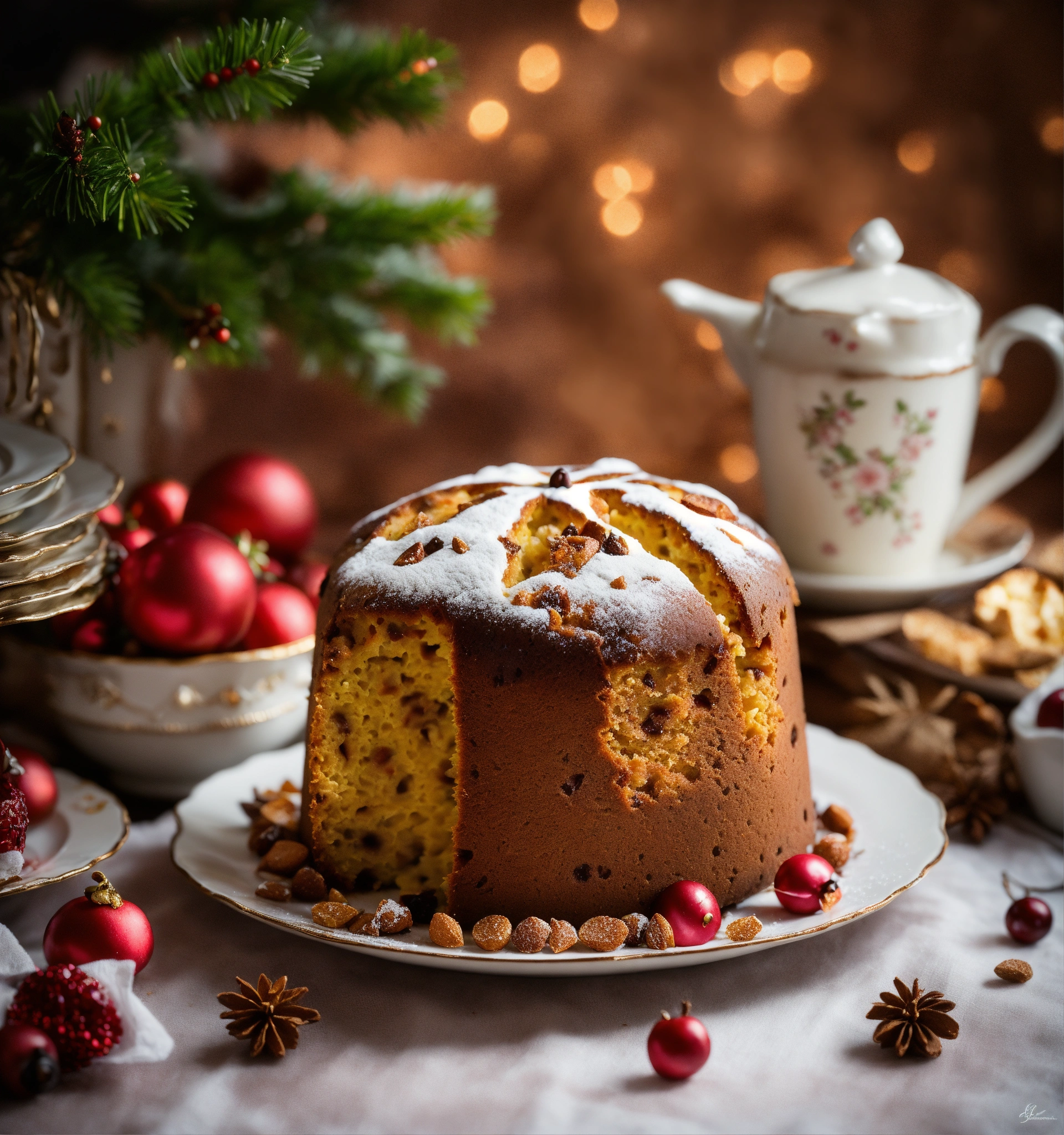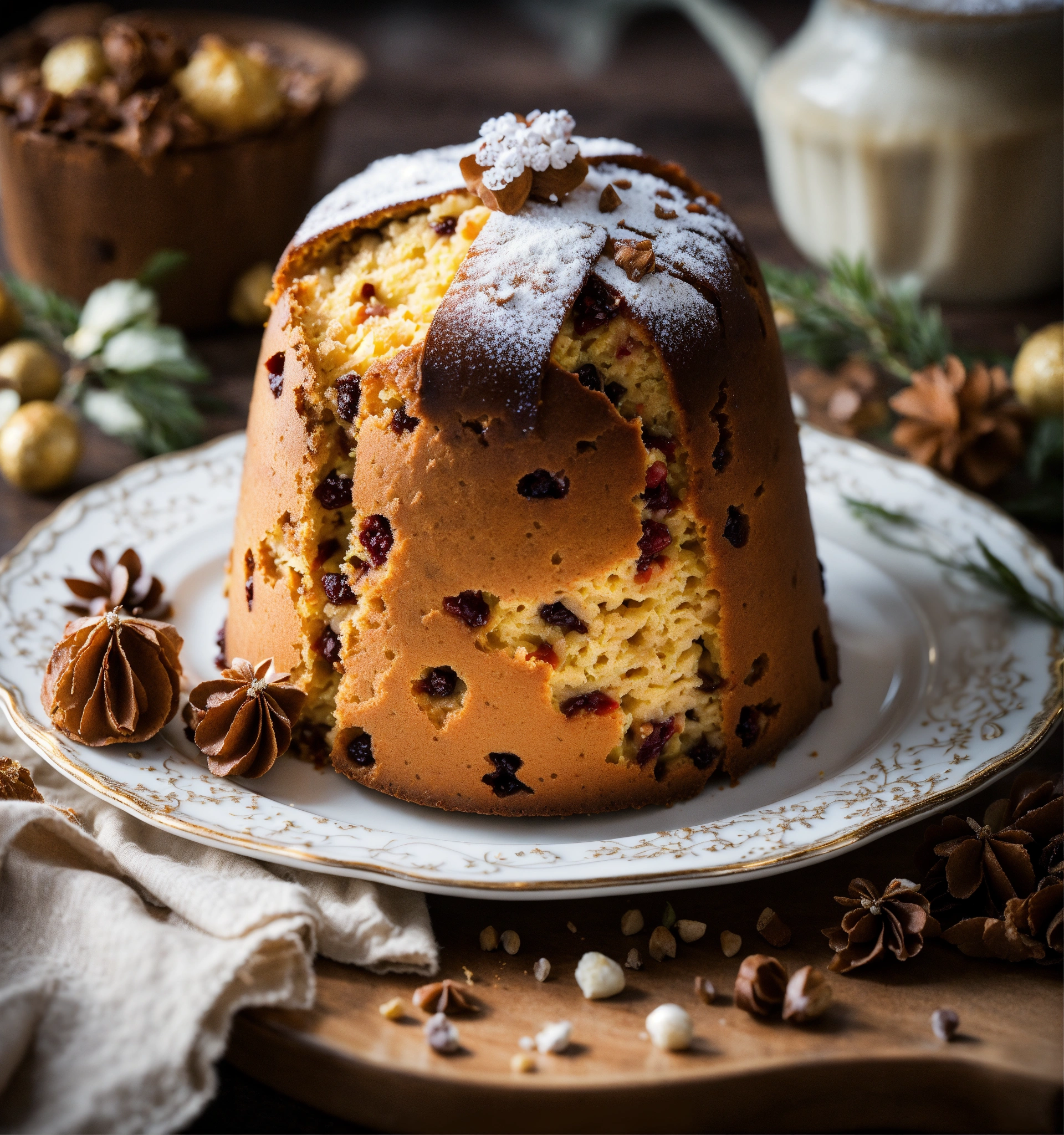 On a clear morning, there is a panettone on a white plate with some decorations on the sides of the panettone. photography, exquisite detail.