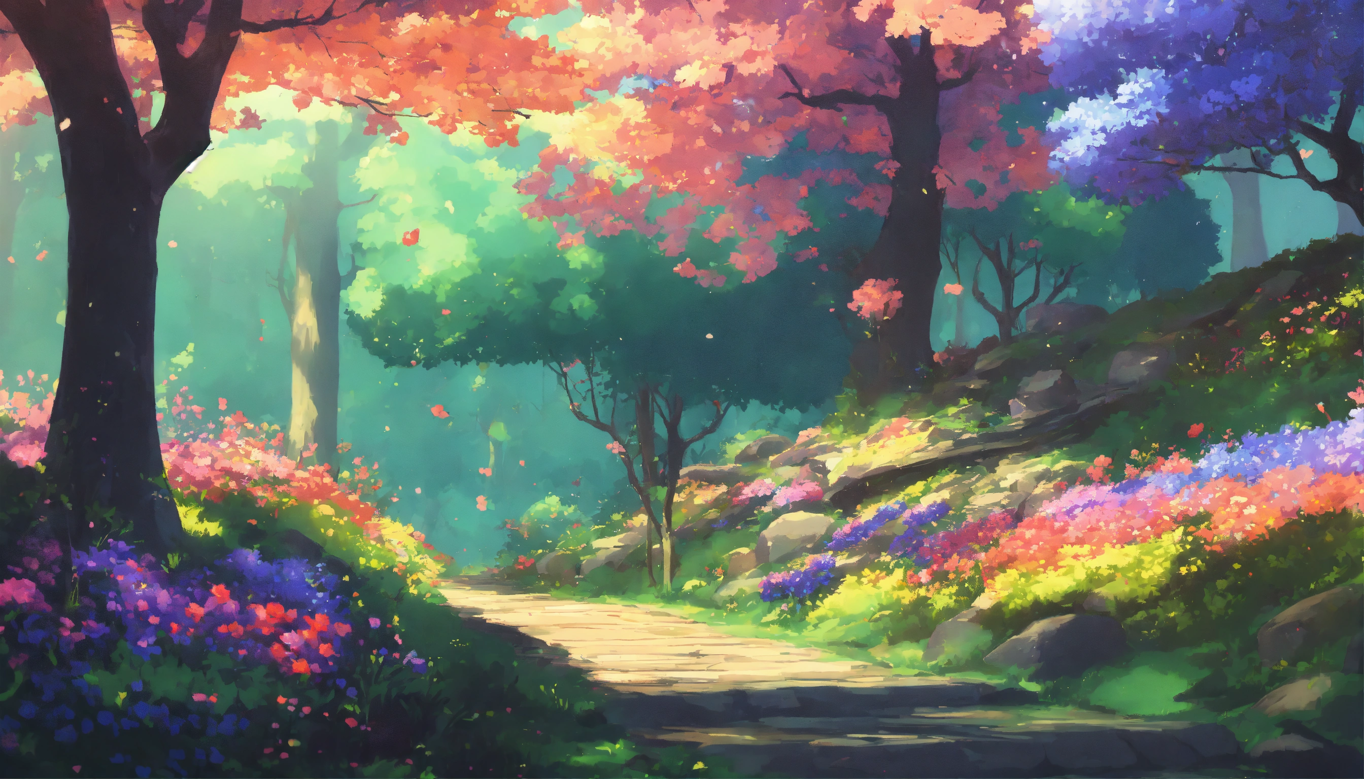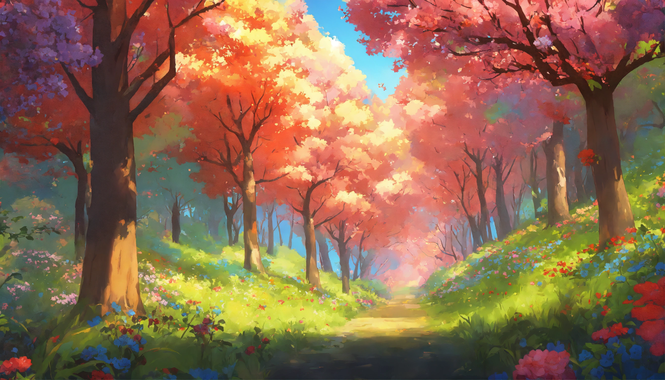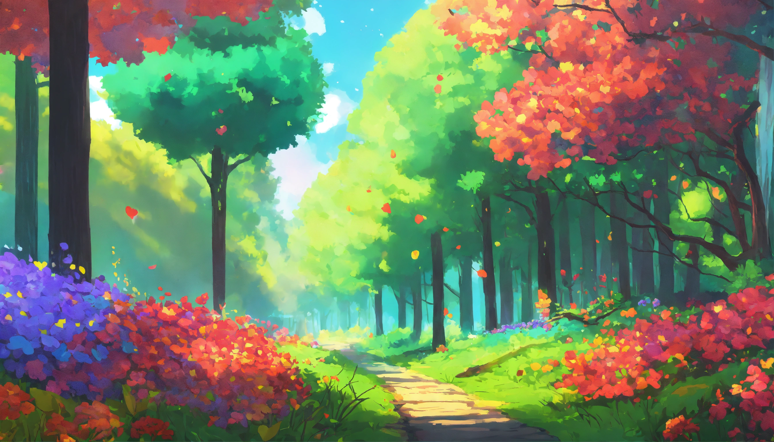 An anime-style picture of a forest with colorful flowers on branches