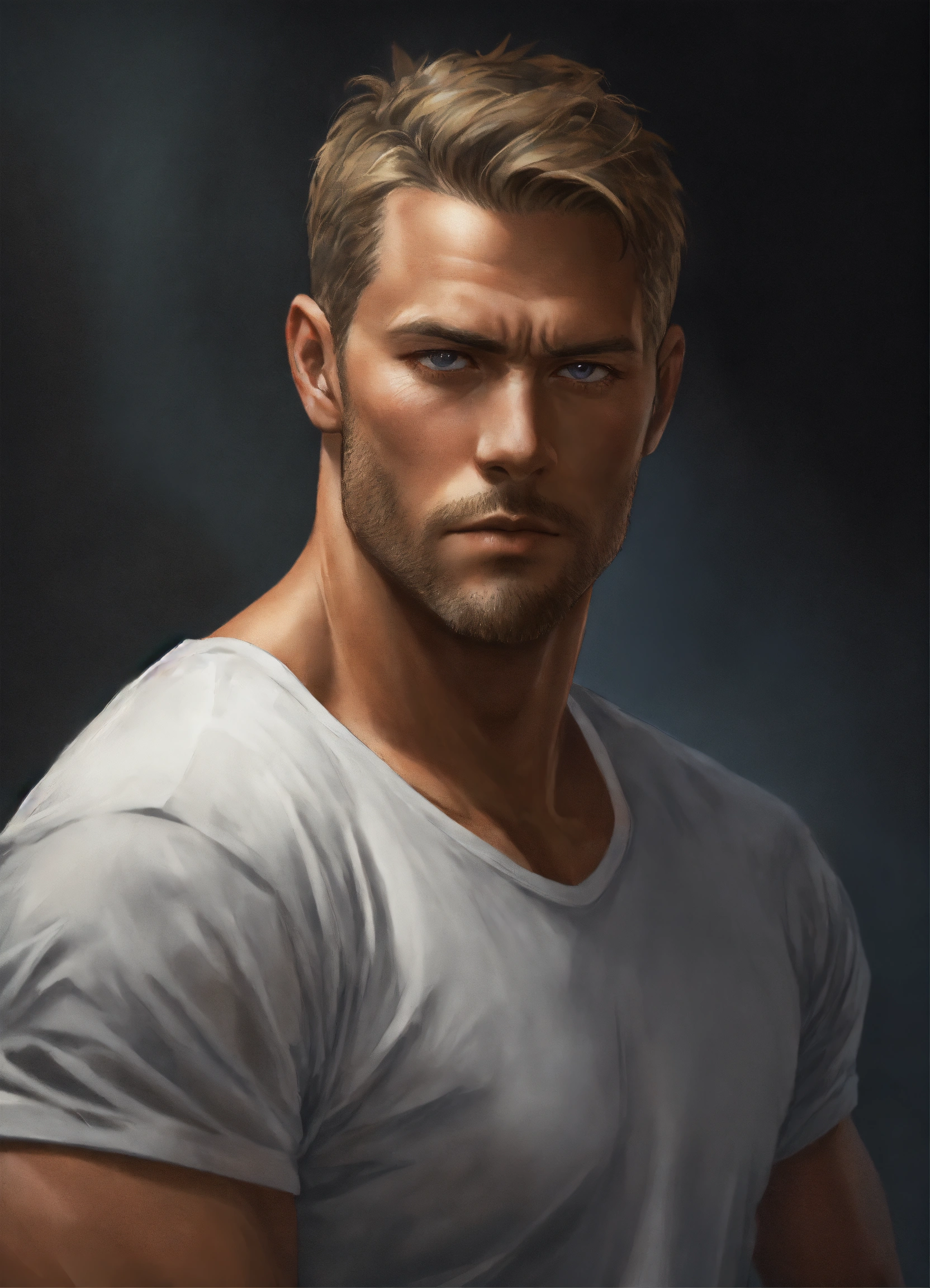 Realistic man, waist-up, tall, broad-shouldered, 35 years, haunted, tough, clean-shaven, realistic dark blond hair, tired, focused realistic light gray eyes, solid black background, well-built, wearing white t-shirt, no pockets