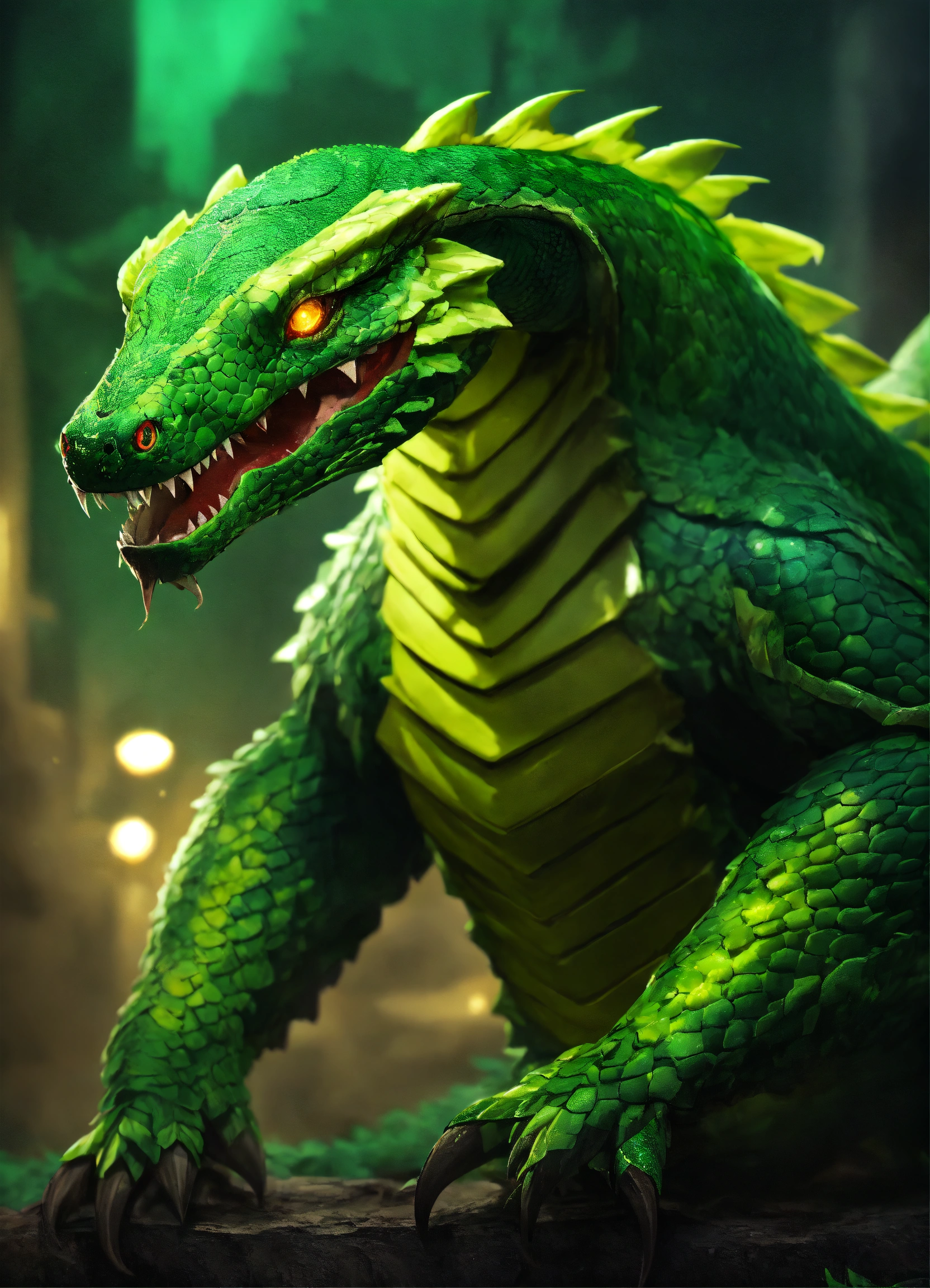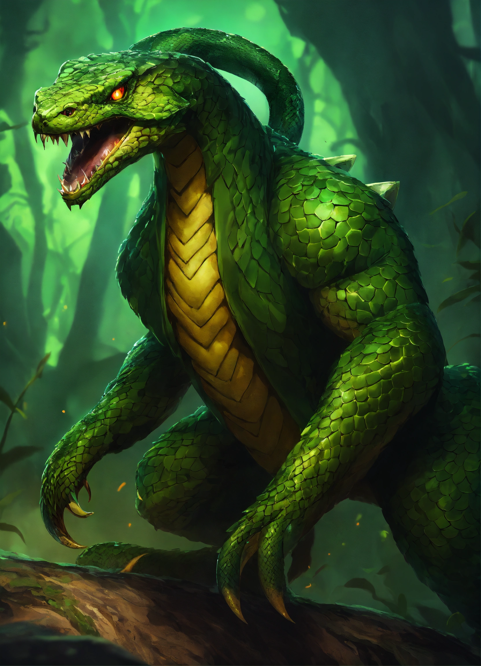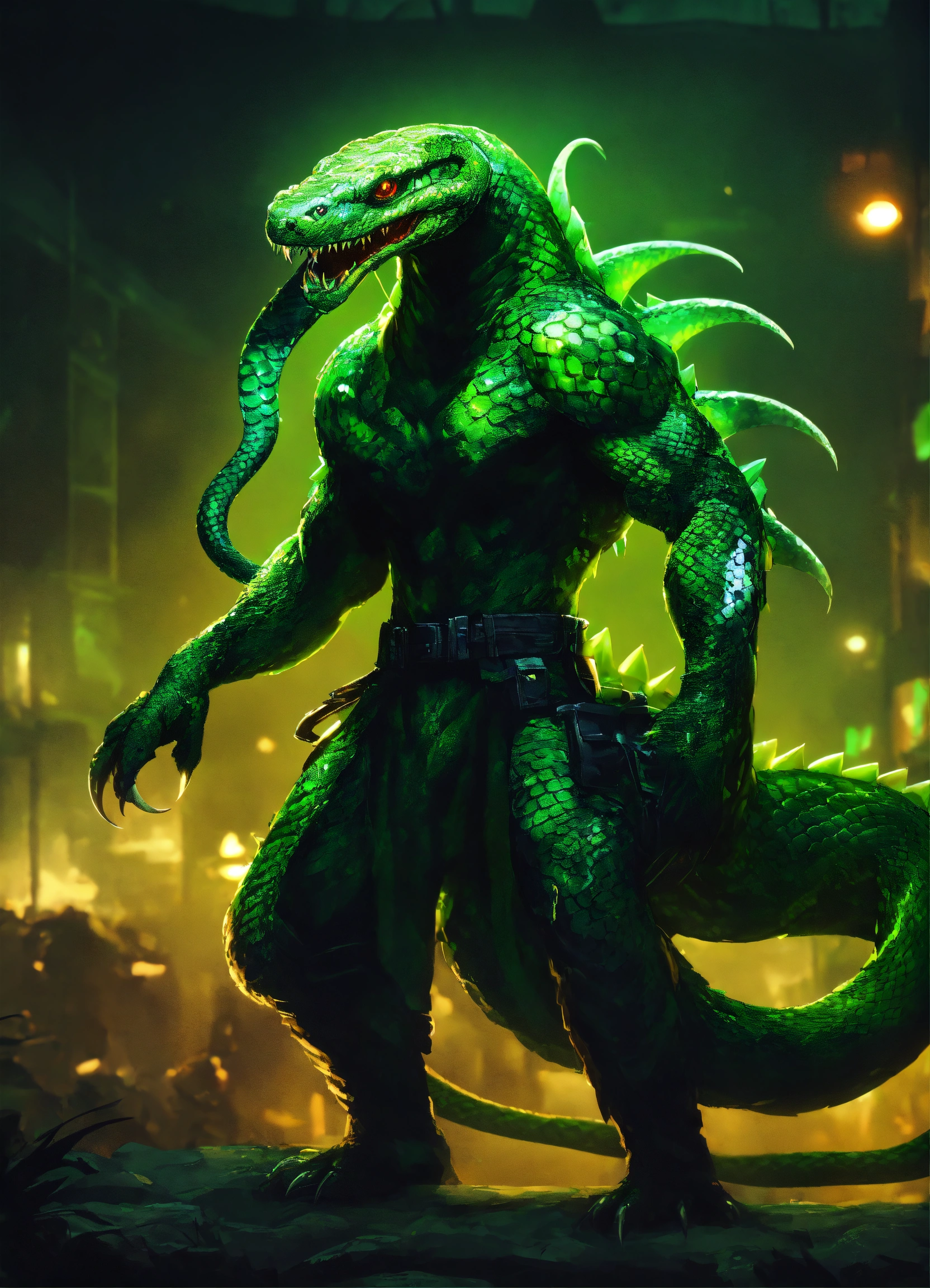 A bipedal snake monster with arms and leg, dark green scales, sharp fangs, and glowing green eyes. the snake monster is wearing up torn up green military gear