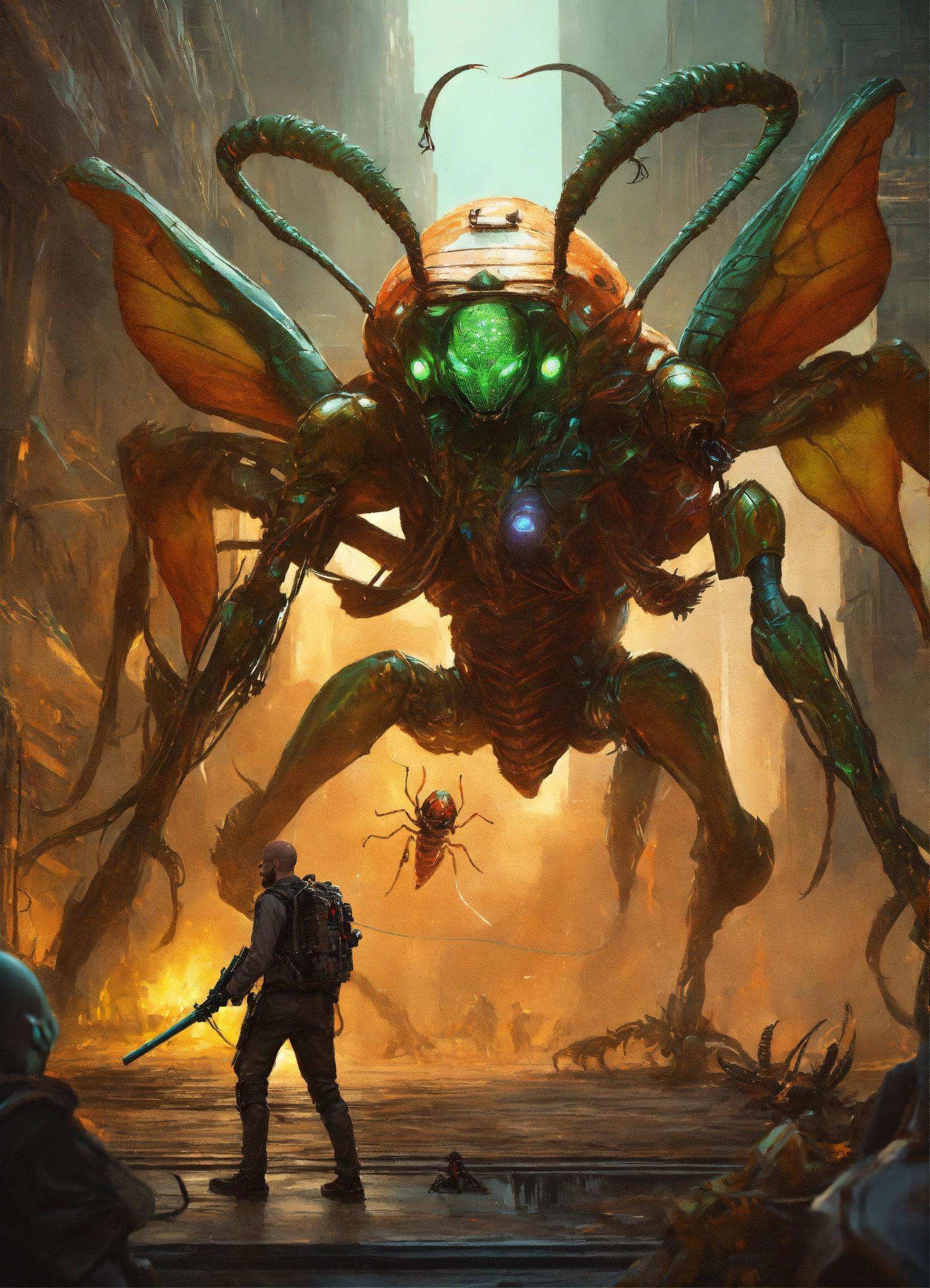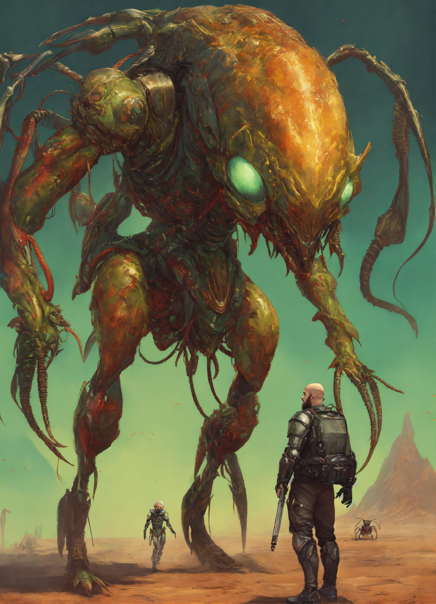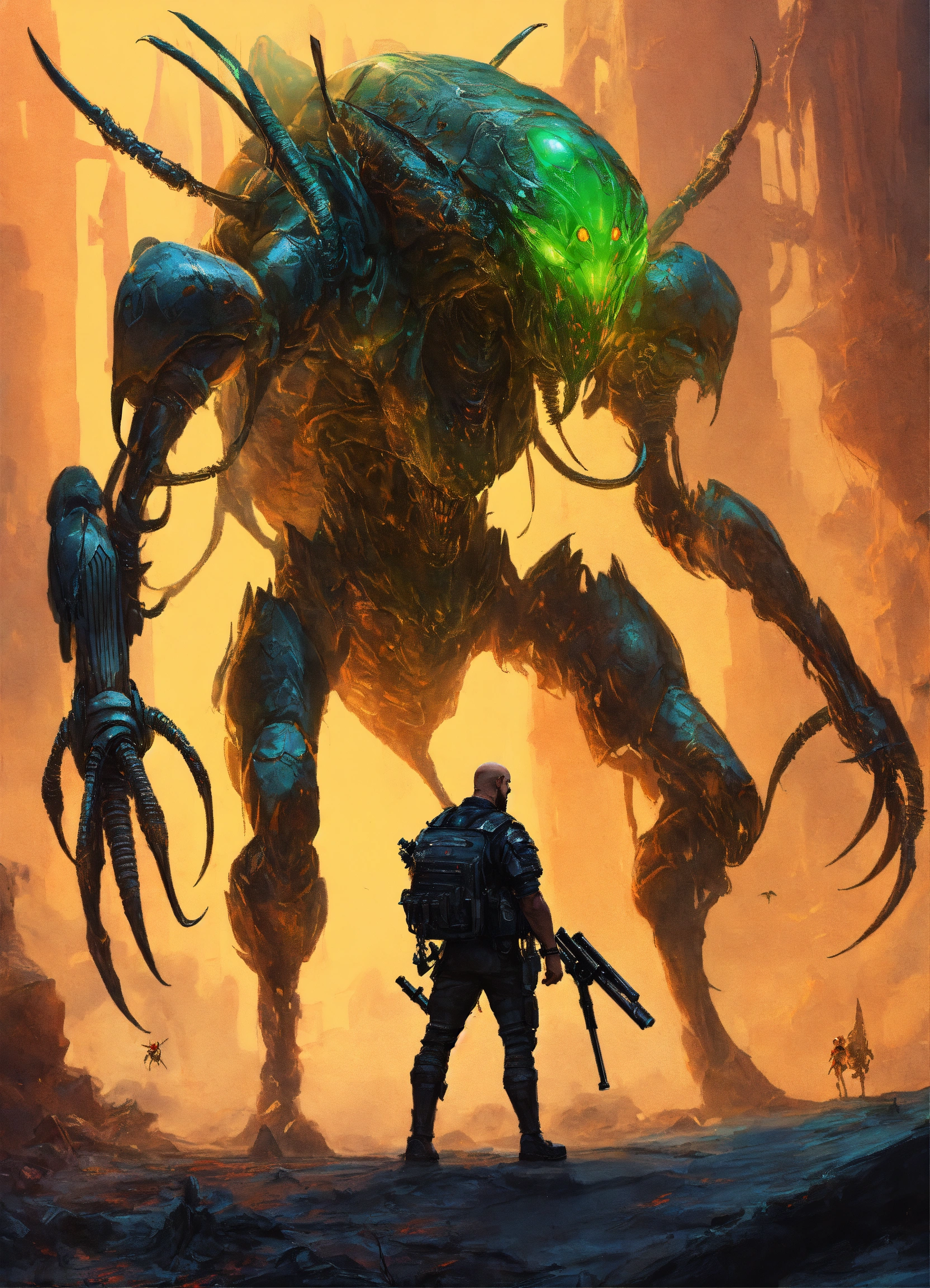 A young bald man with beard terrifying a monstrous insectoid alien from another world, with exoskeletal armor, multiple legs, and alien weaponry