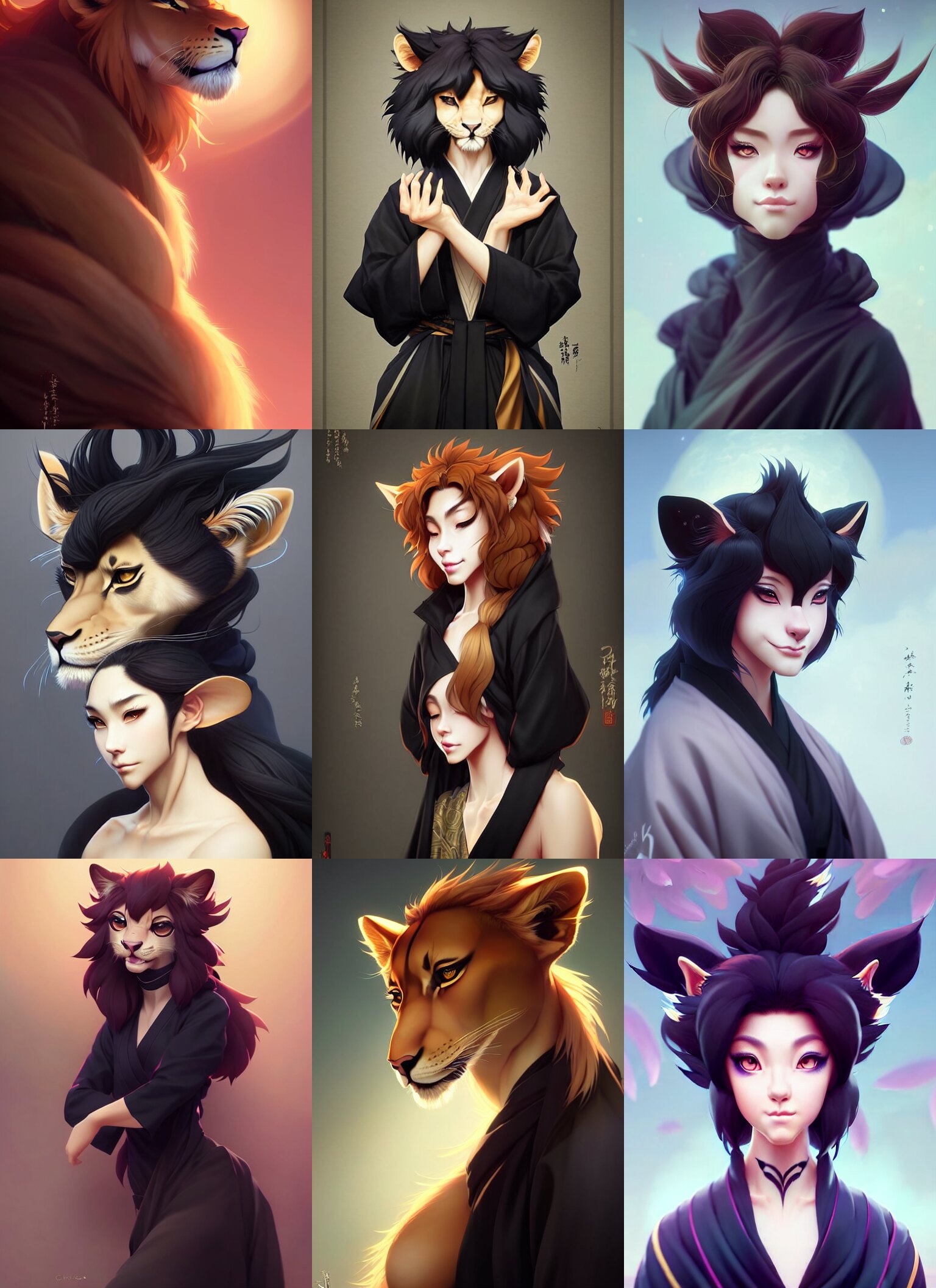Beautiful portrait of a female anthropomorphic lioness fursona dressed in a black kimono. character design by disney, charlie bowater, ross tran, artgerm, and makoto shinkai, detailed, soft lighting, rendered in octane