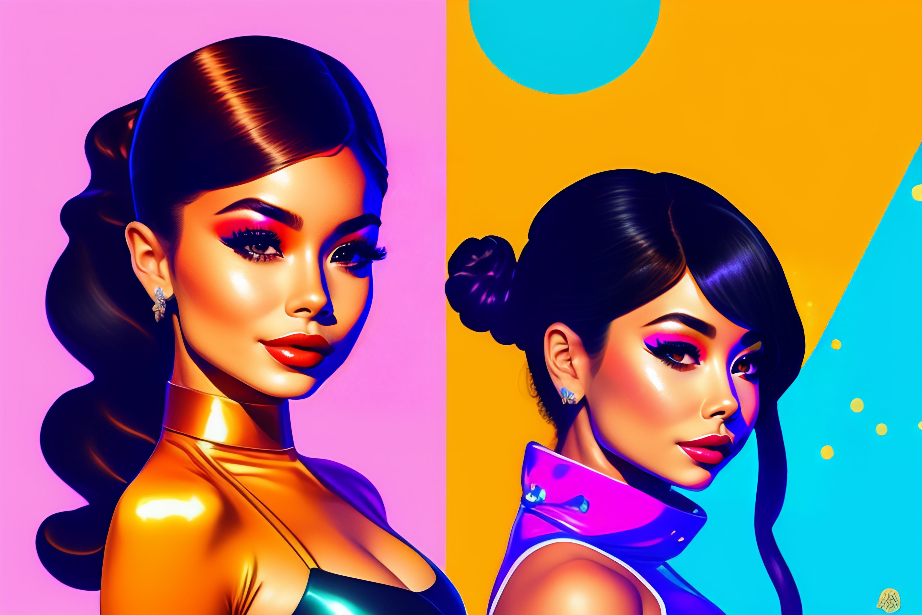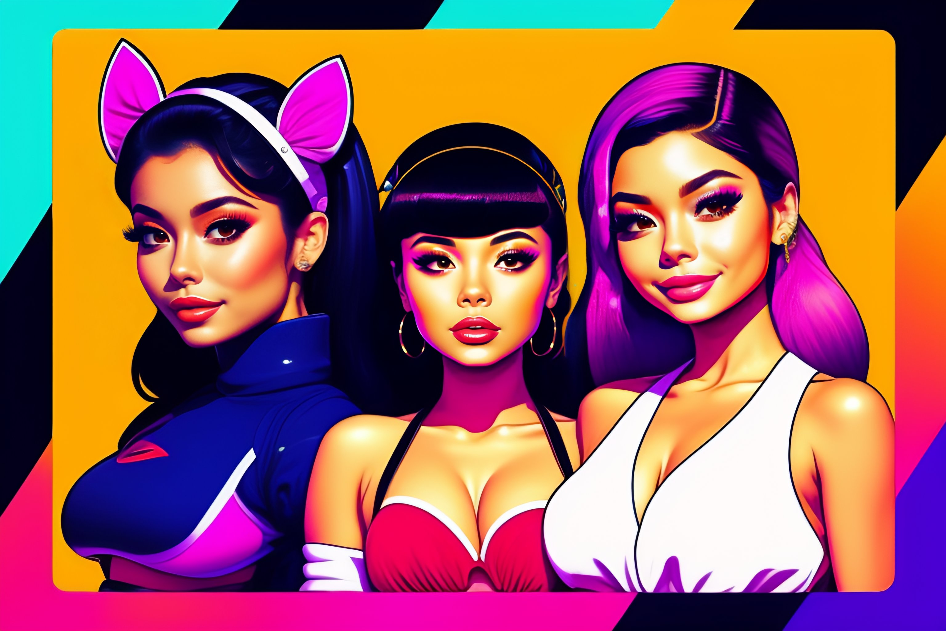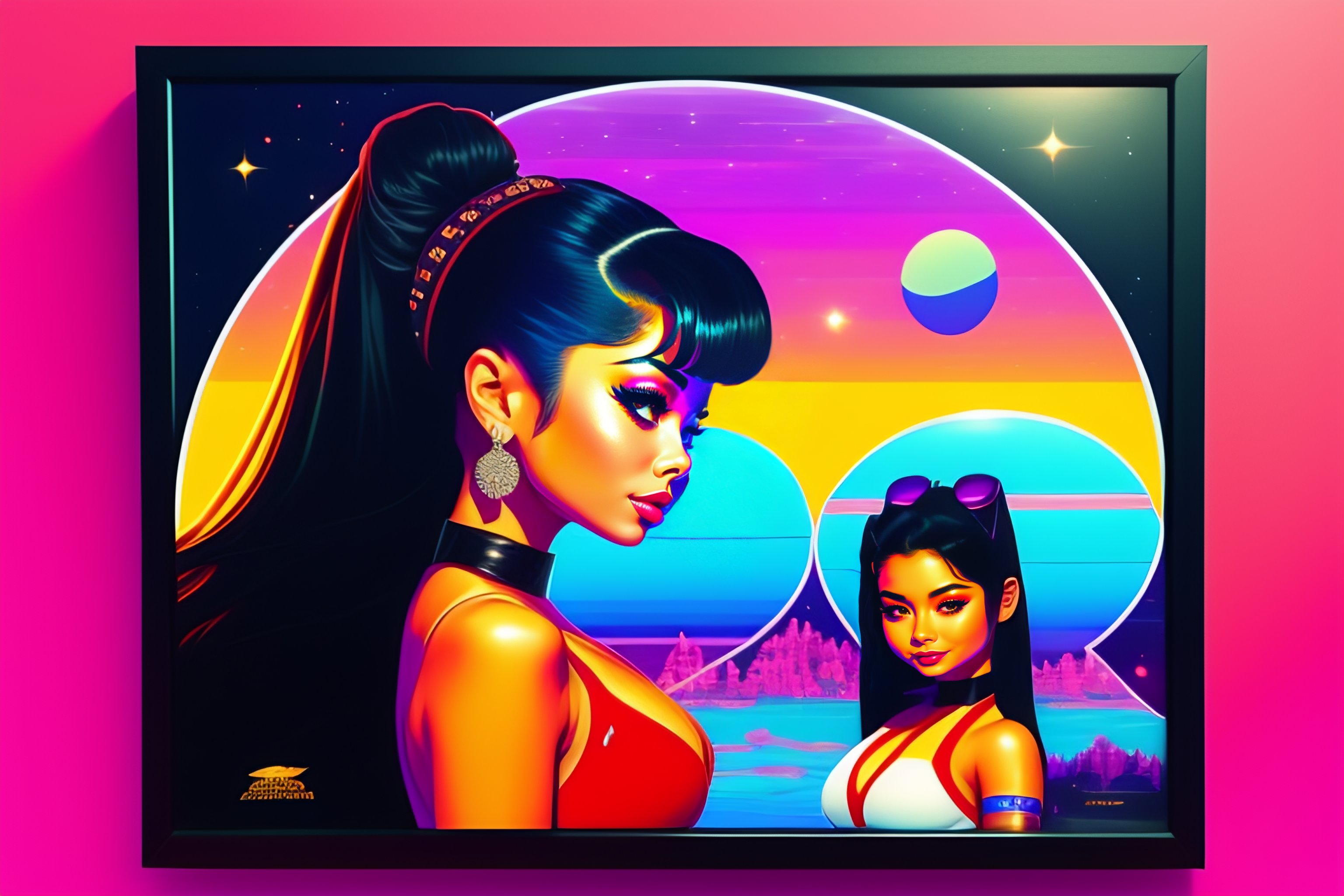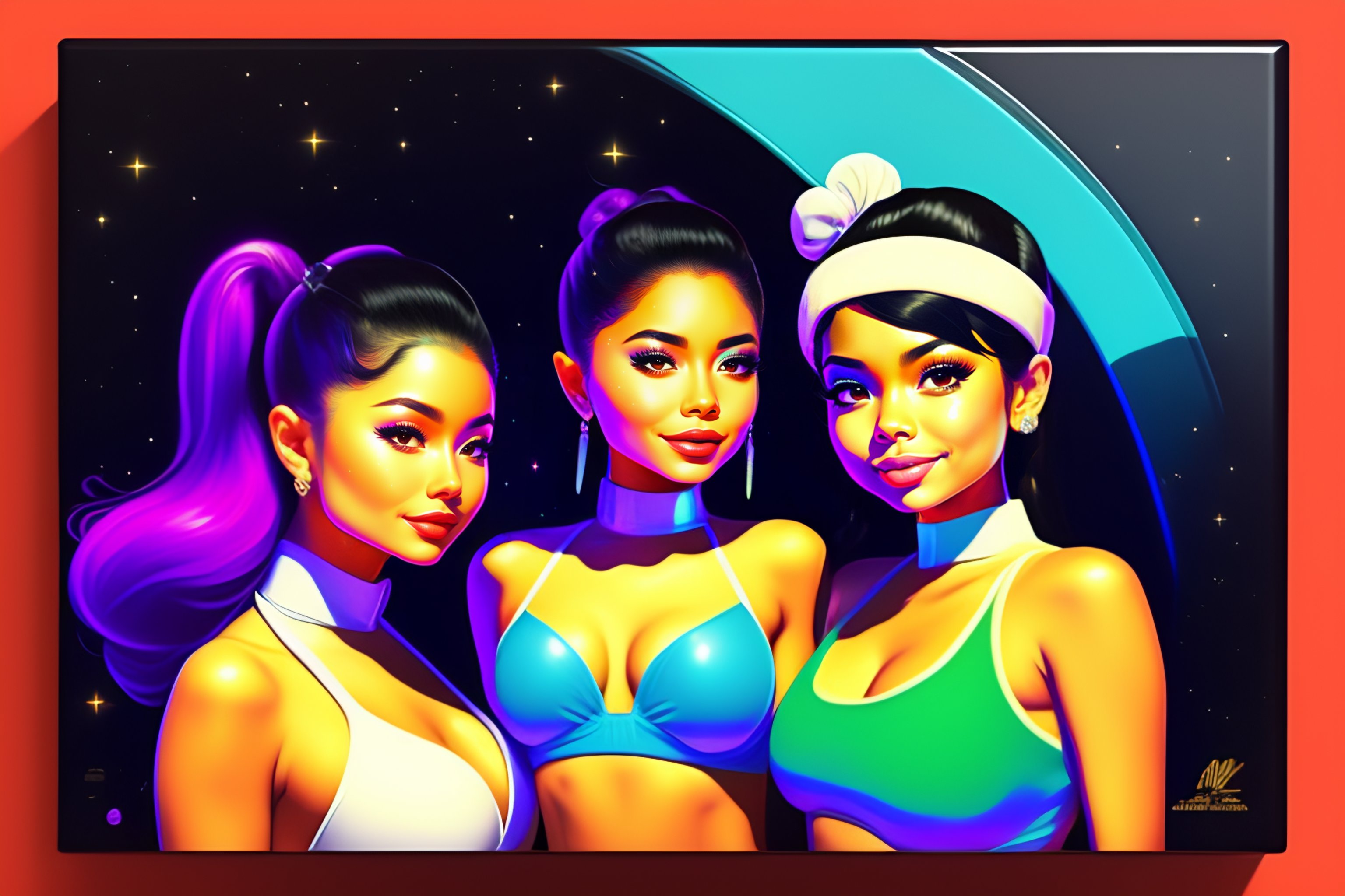 Photo of ariana grande, selena gomez and miranda cosgrove with bikini in space background, style of laurie greasley, studio ghibli, akira toriyama, james gilleard, genshin impact, trending pixiv fanbox, acrylic palette knife, 4k, vibrant colors, devinart, trending on artstation, low details
