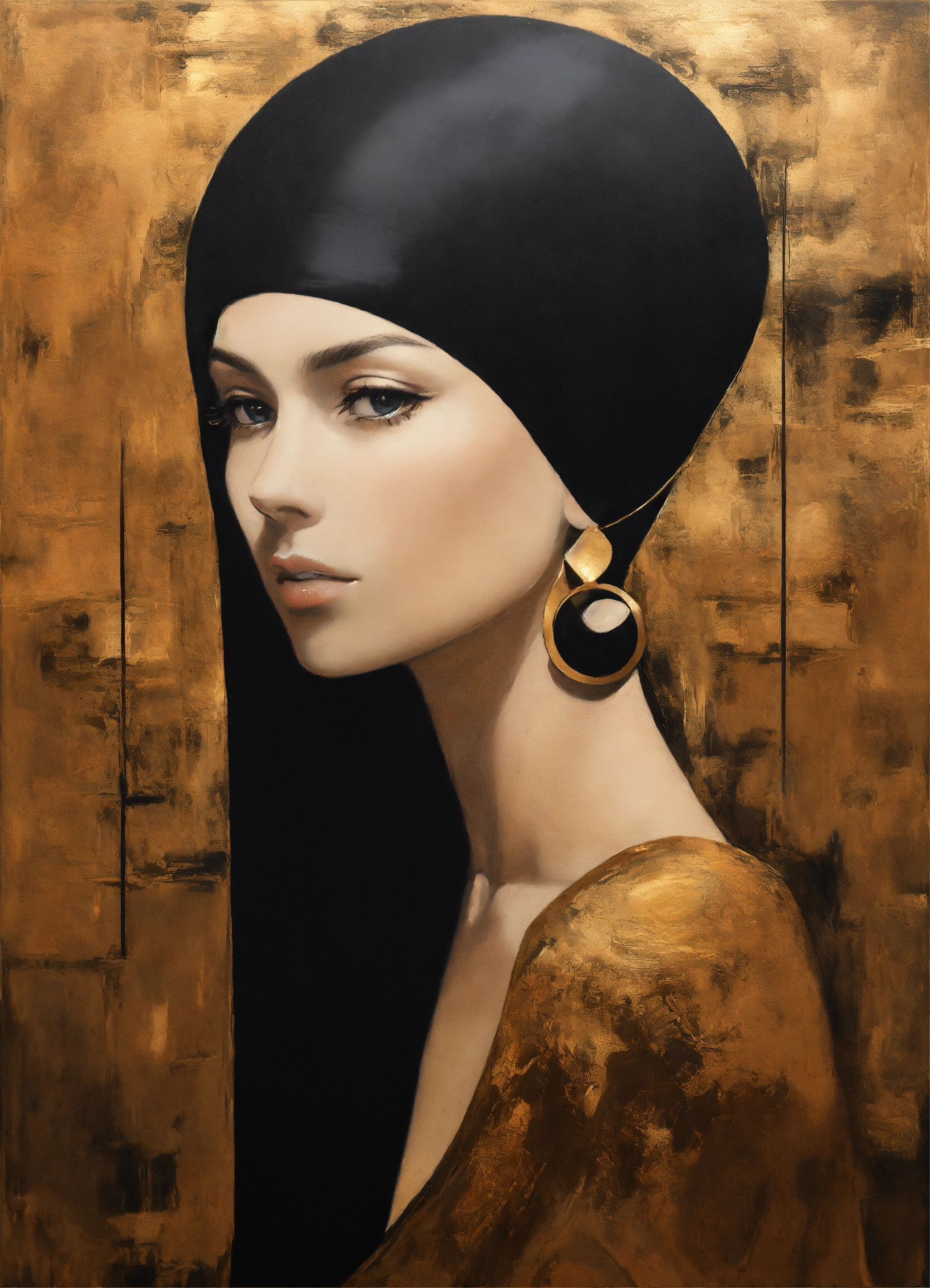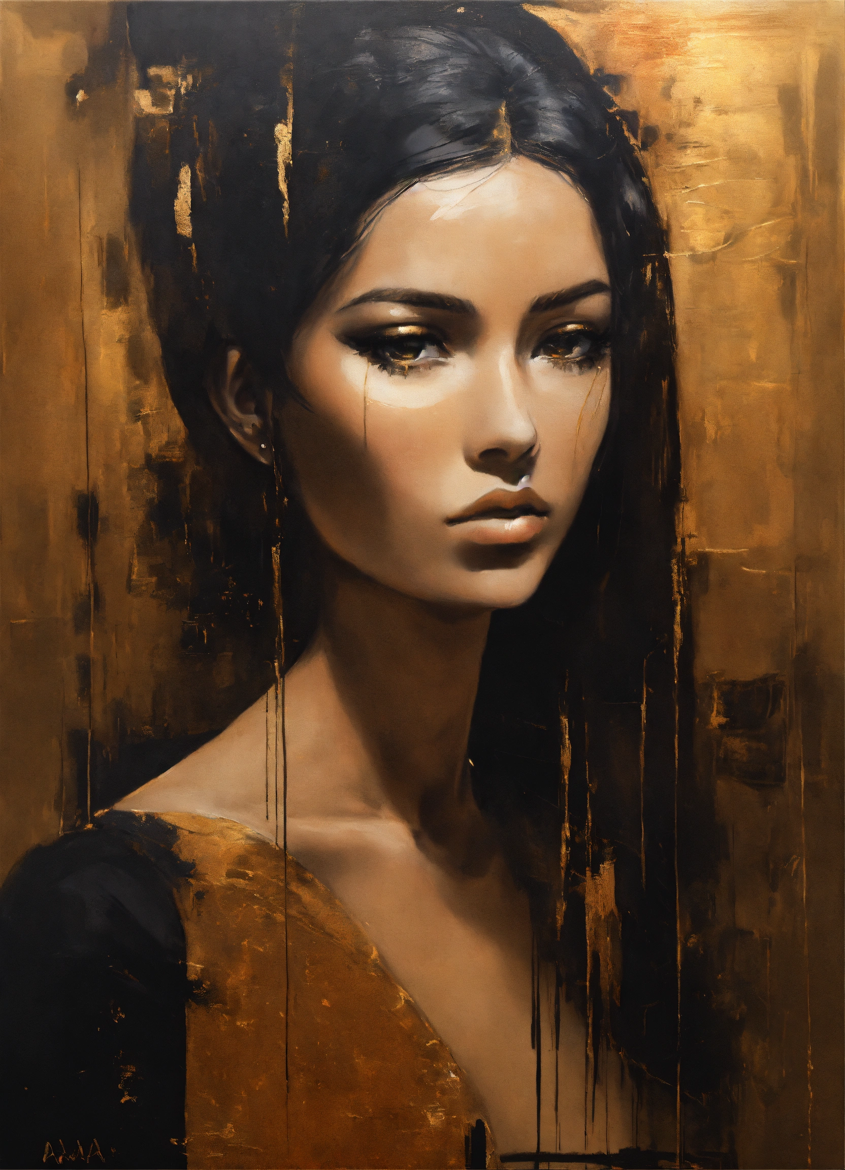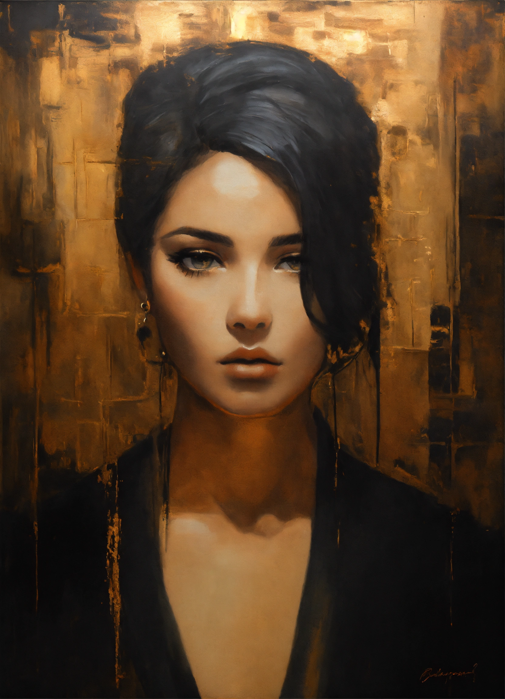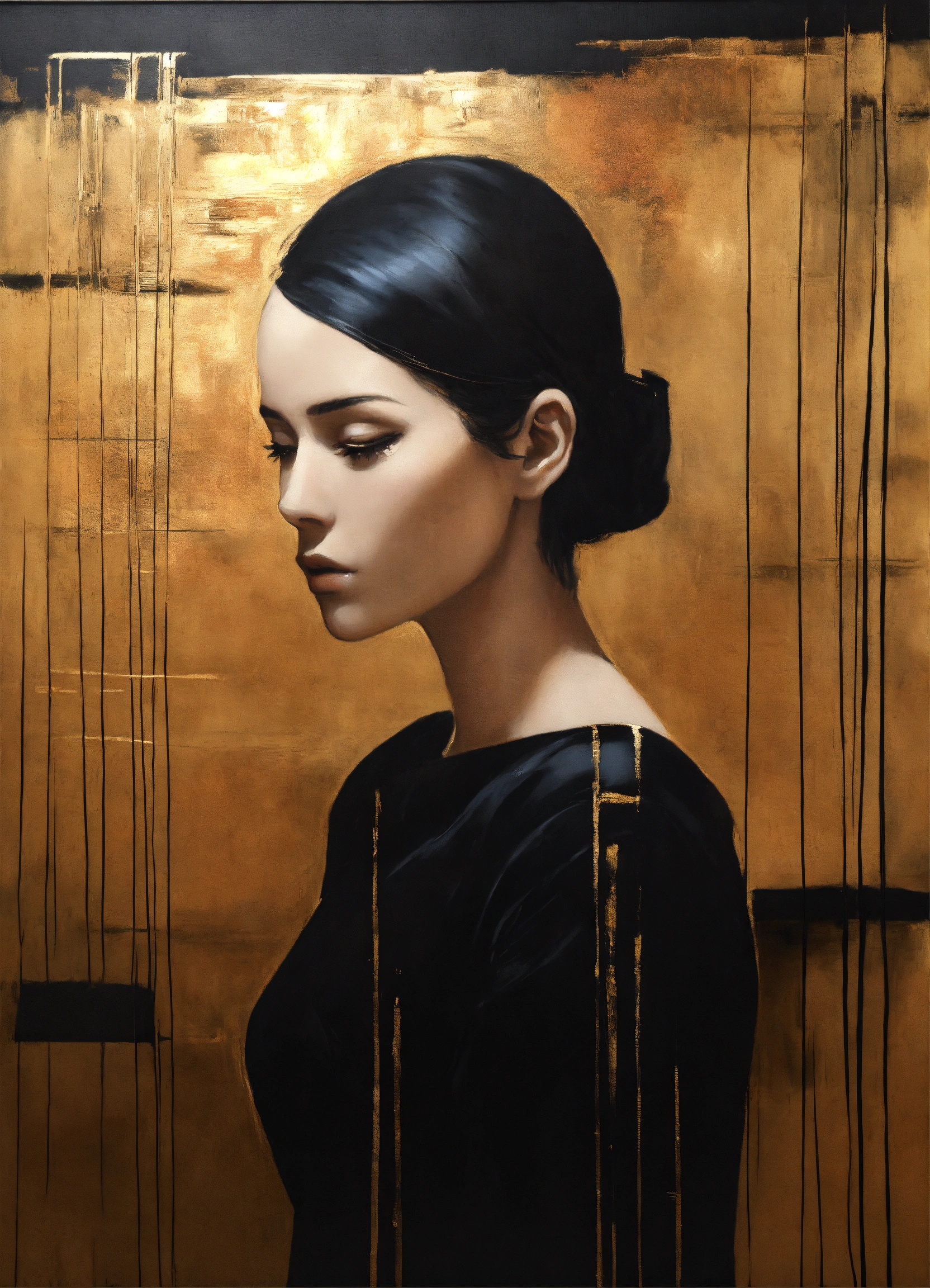 Minimalist, elegant, discreet, enigmatic, sophisticated, modern, mysterious painting of portraits in black, gold and copper