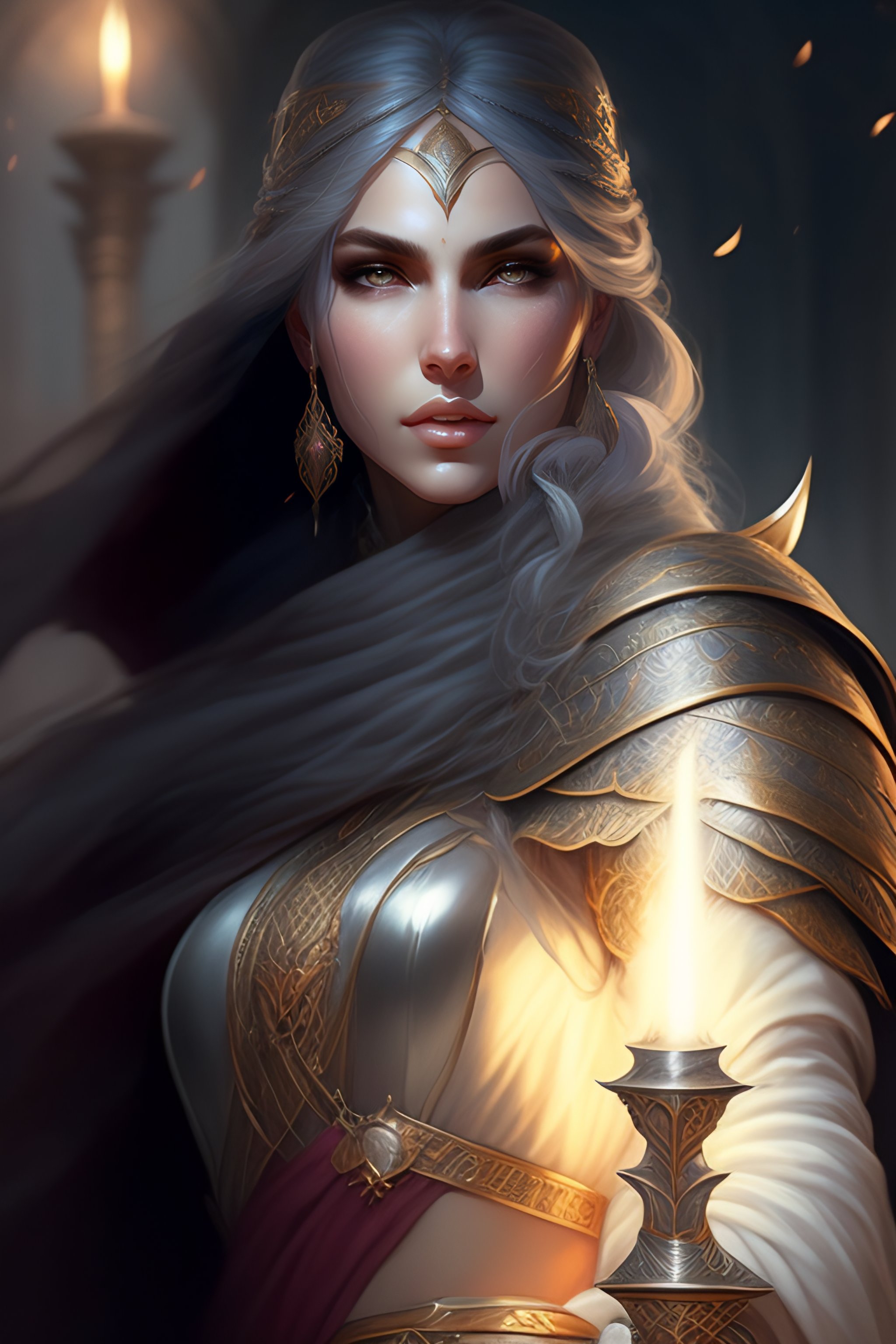 Female cleric in center, dnd, fantasy, gray hair, holding sword, dark light night, intricate, elegant, sharp focus, illustration, highly detailed, dark lighting, full body, digital painting, concept art, matte, art by wlop and artgerm and greg rutkowski and alphonse mucha, masterpiece