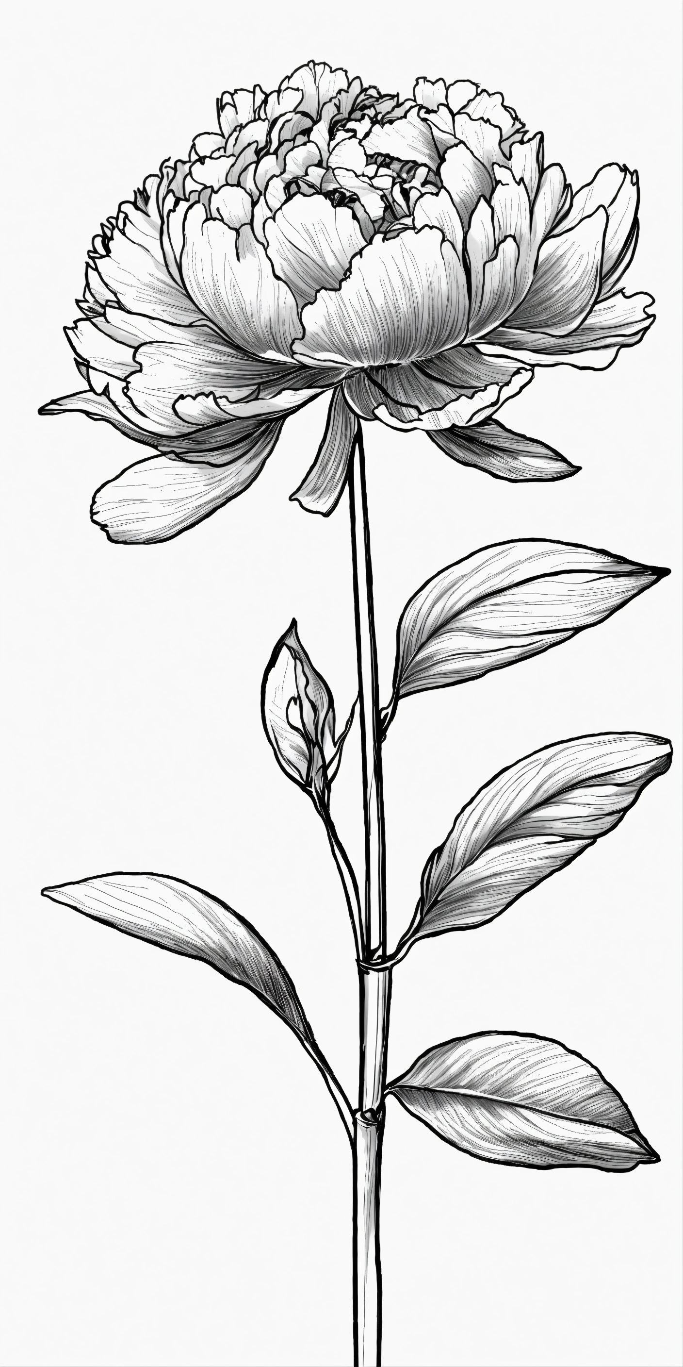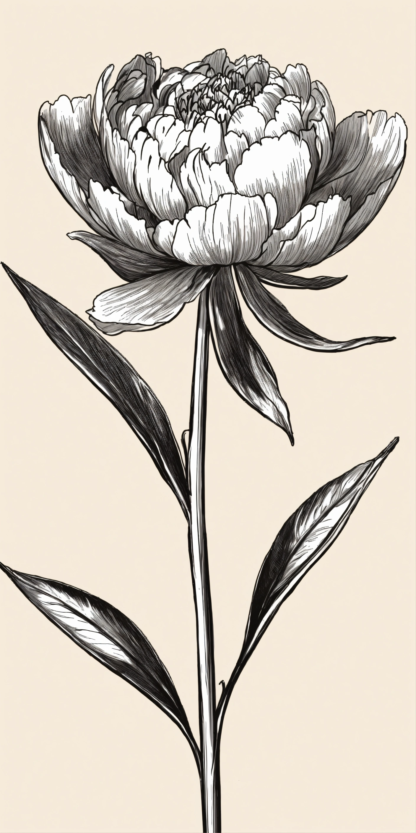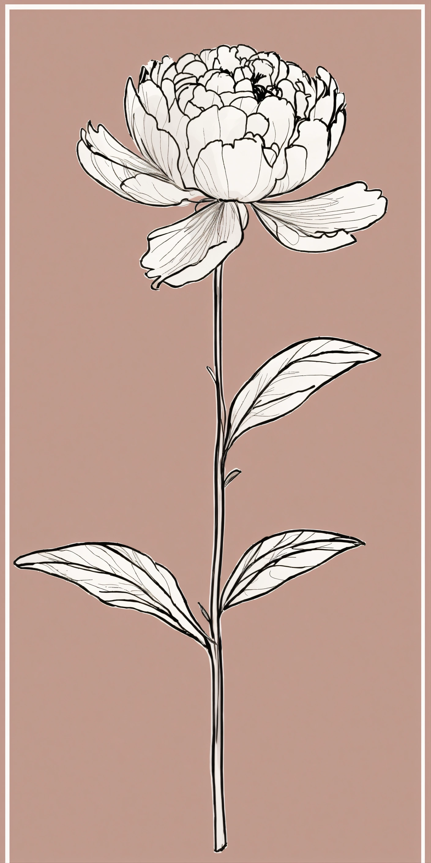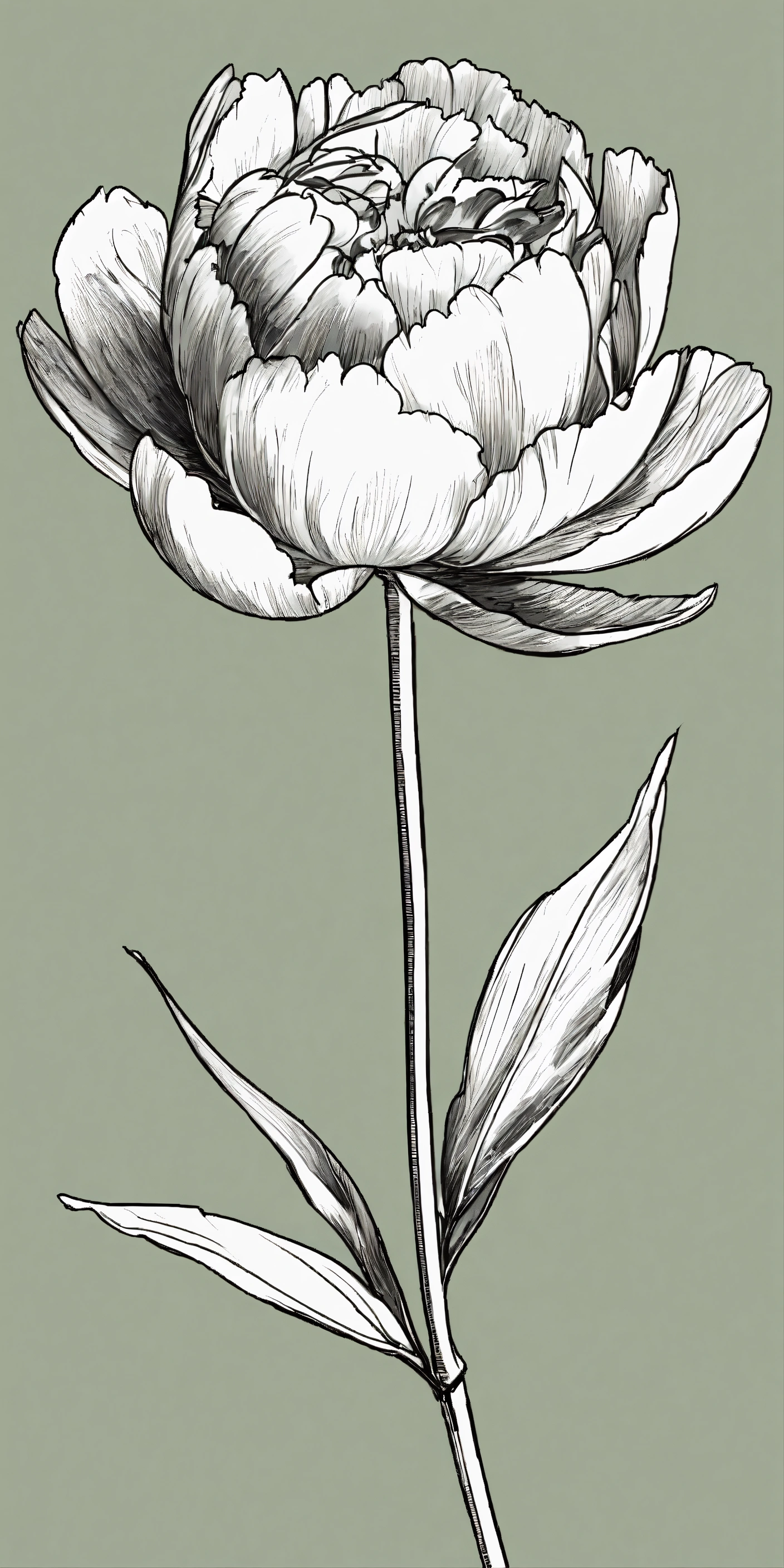Single peony flower with elongated stem with attached leaves, distinct black outline sketch, white scribble line drawing overlay