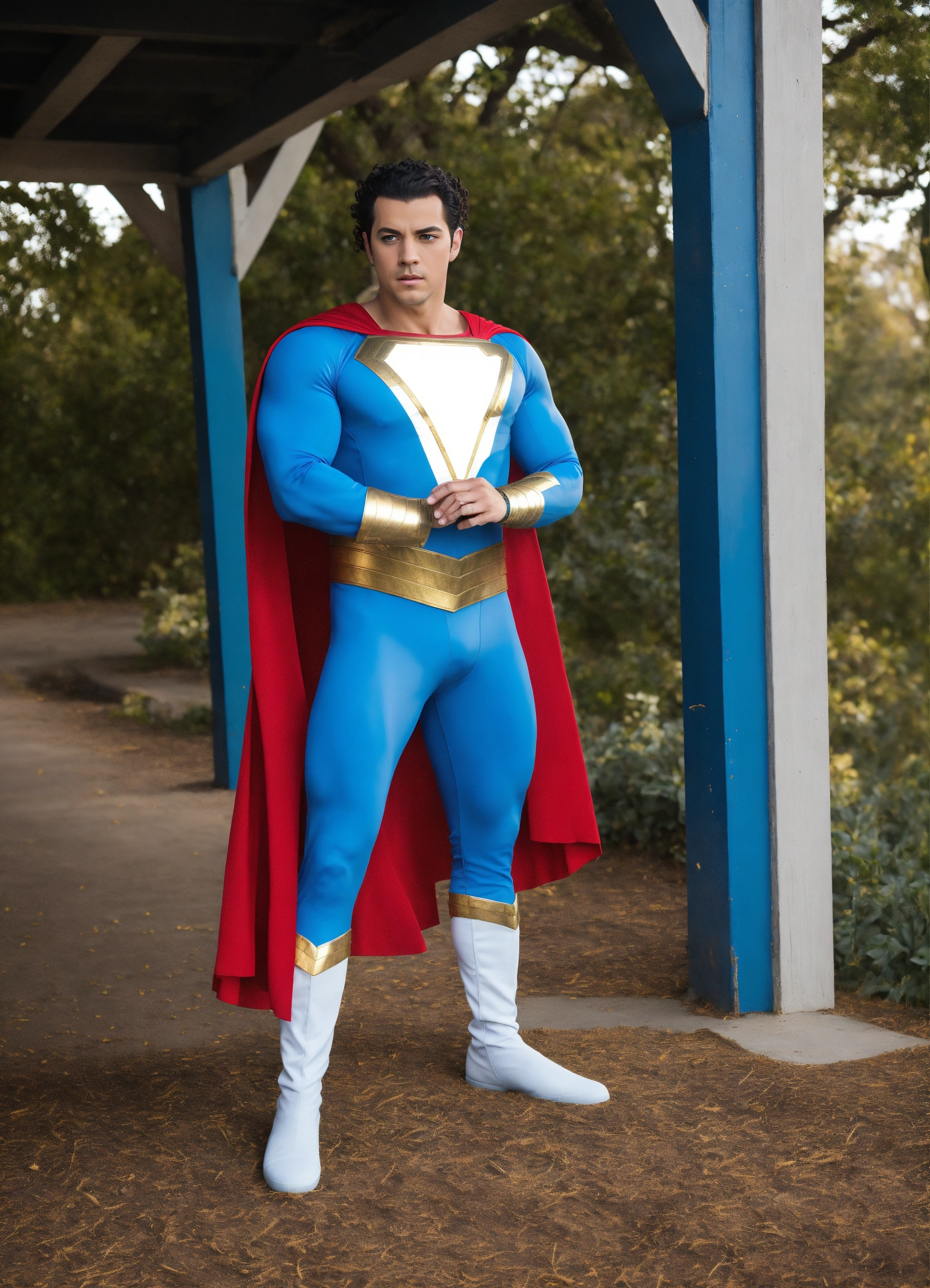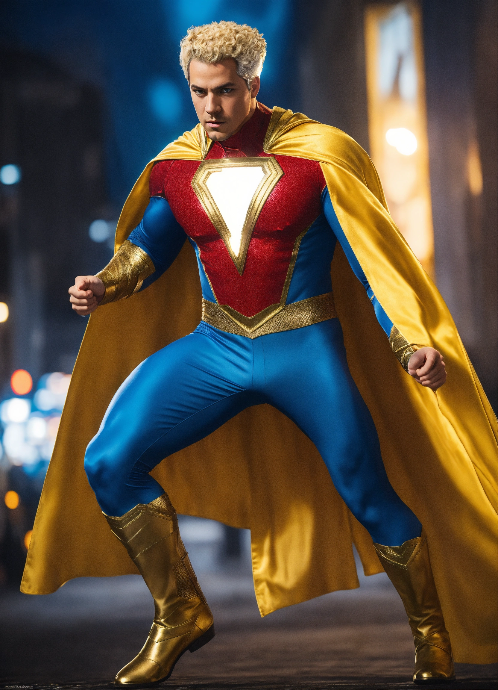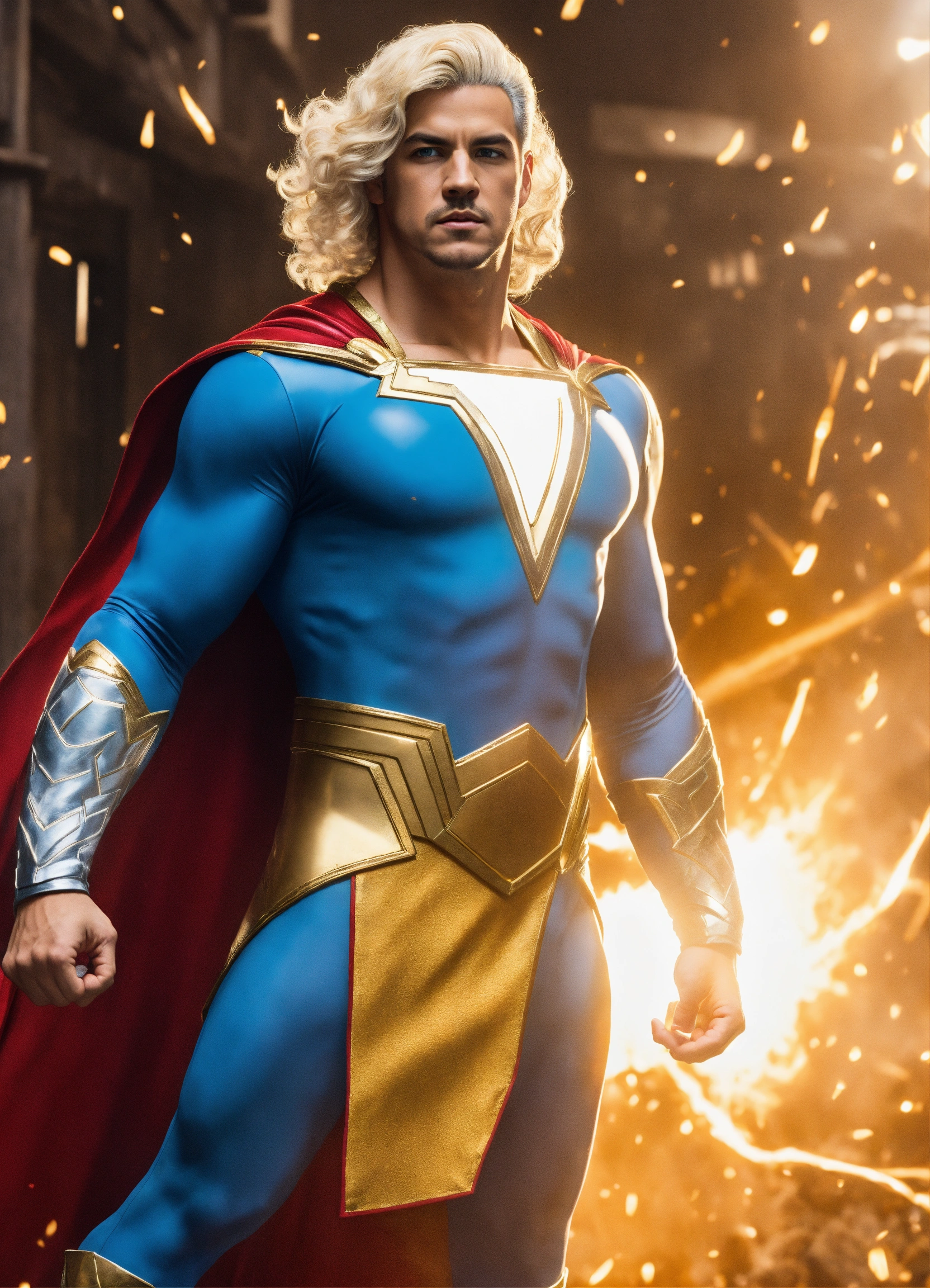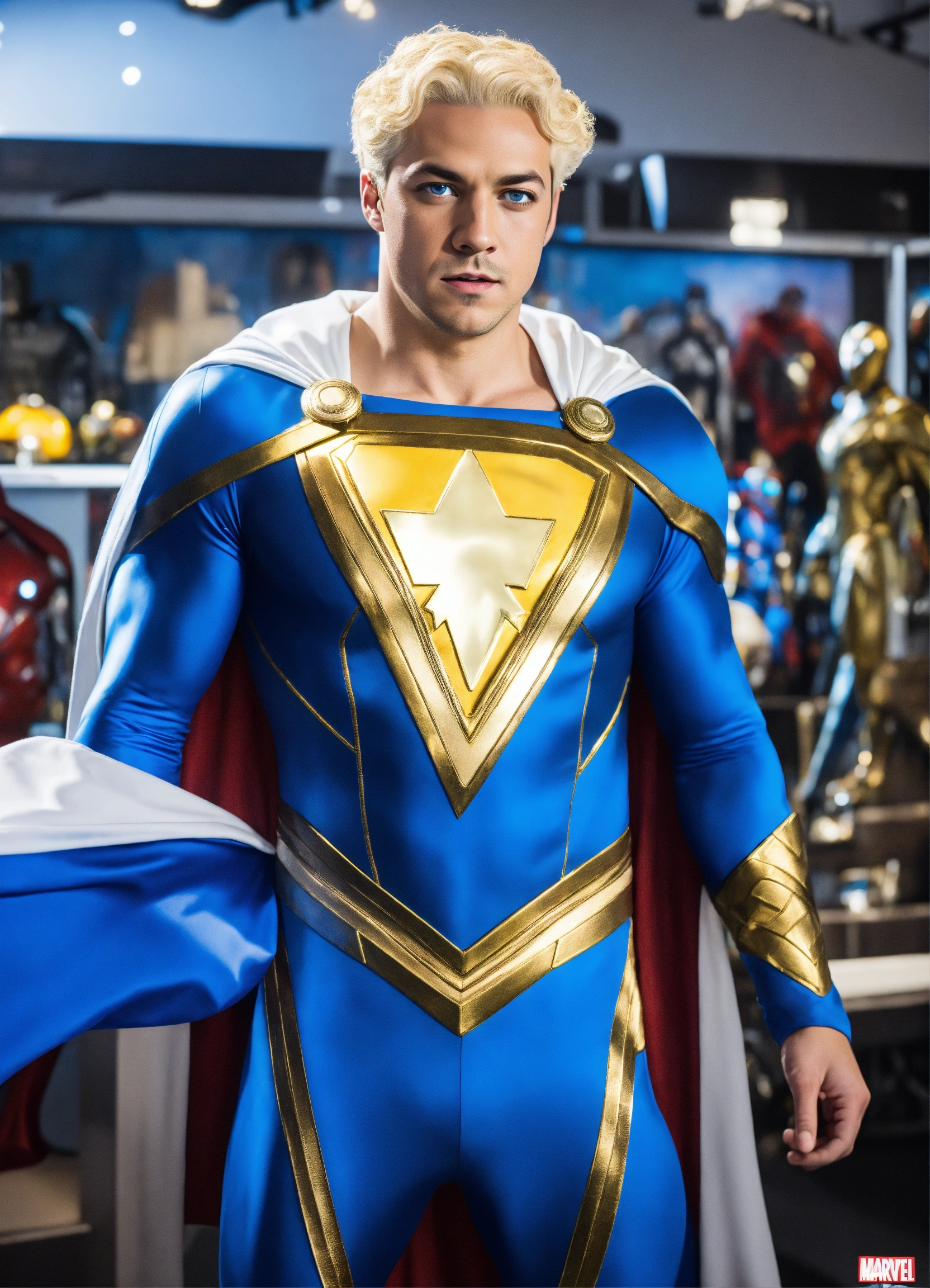 Marvel, highly detailed, blue and white sleek shazam costume, no cape, full body, smooth, sparkling blue eyes, curly blonde hair