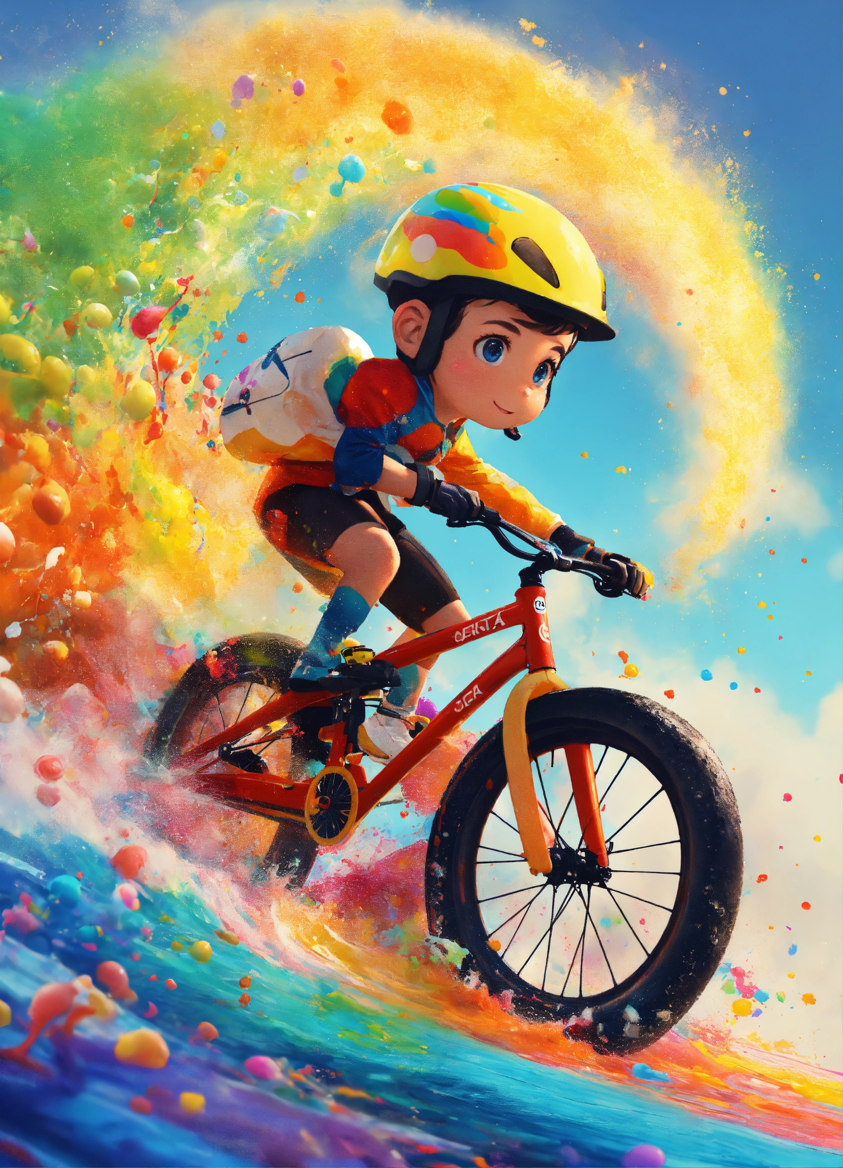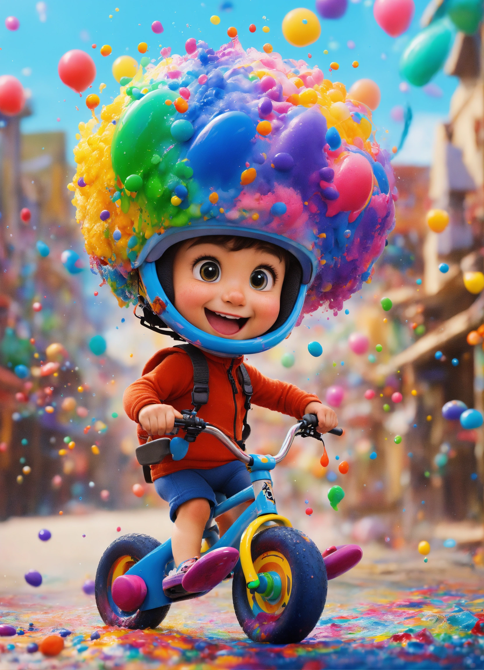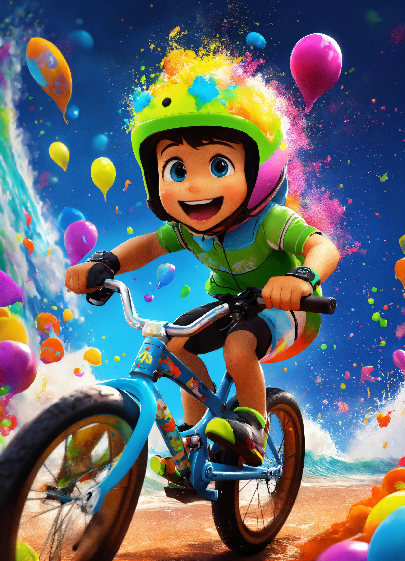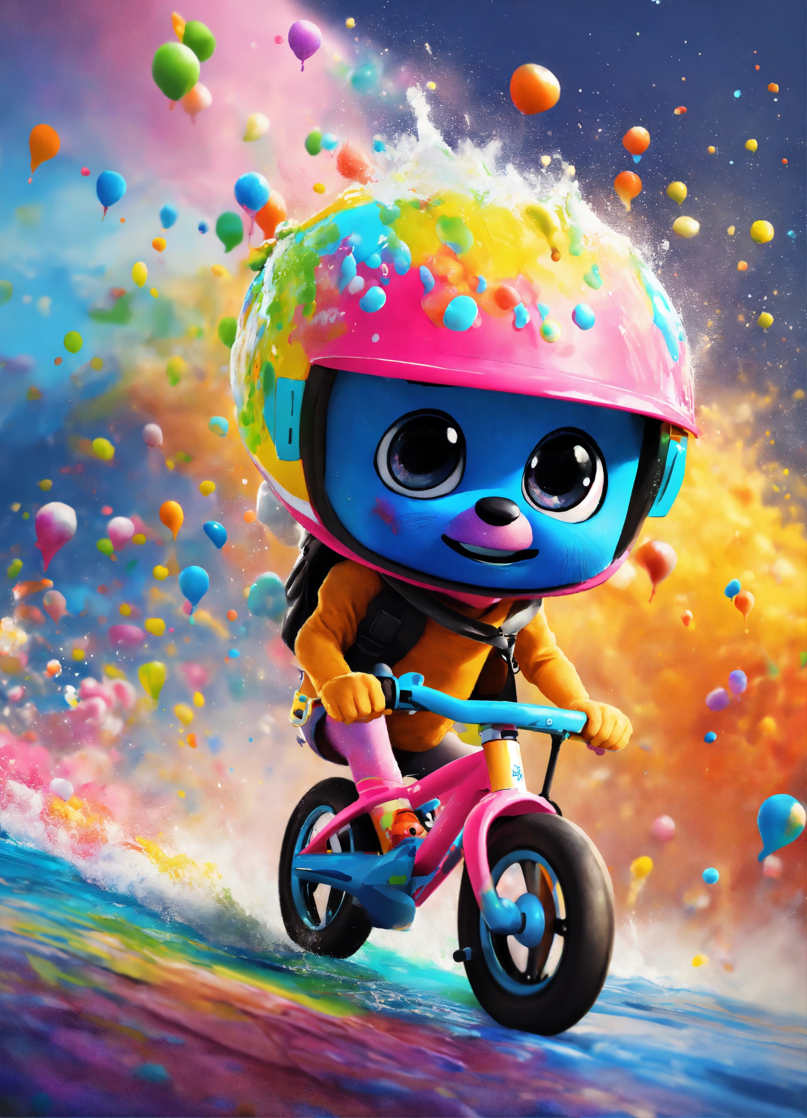 An adorable creature with a helmet in a bicycle surfing a big wave made of paint of many colors, paint splash, many paint drops by pixar.