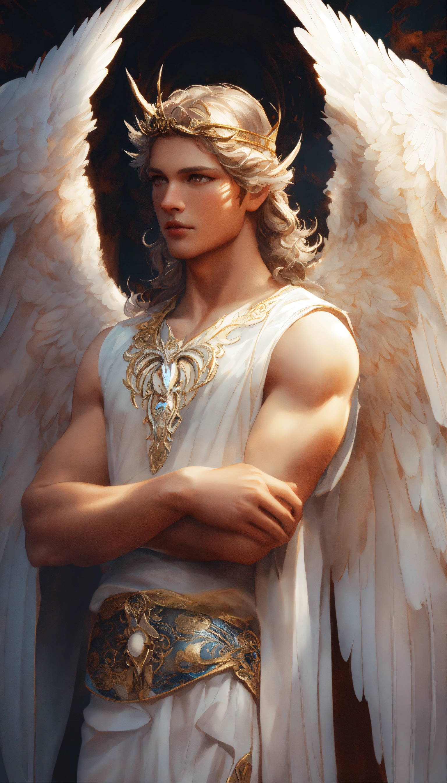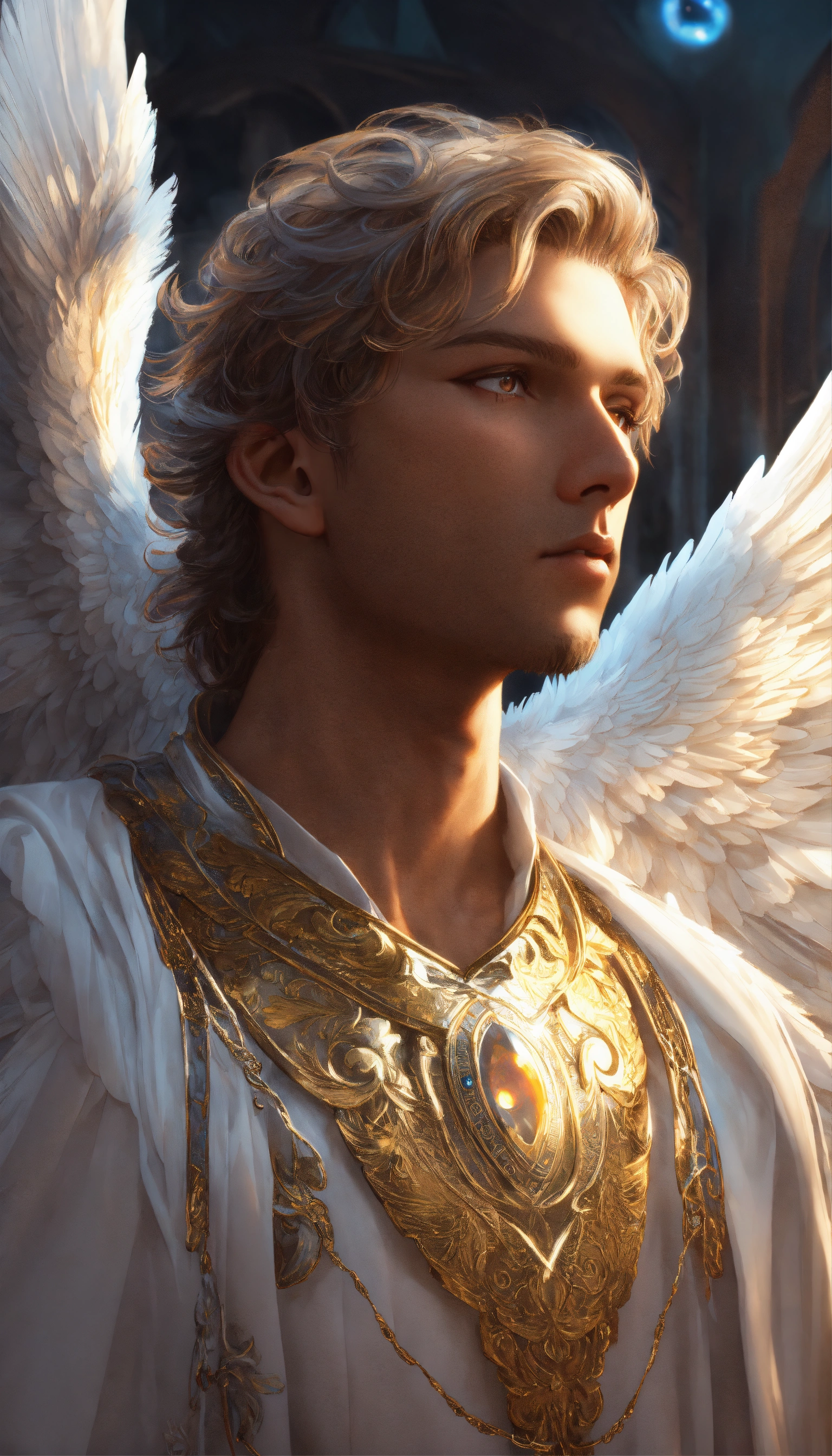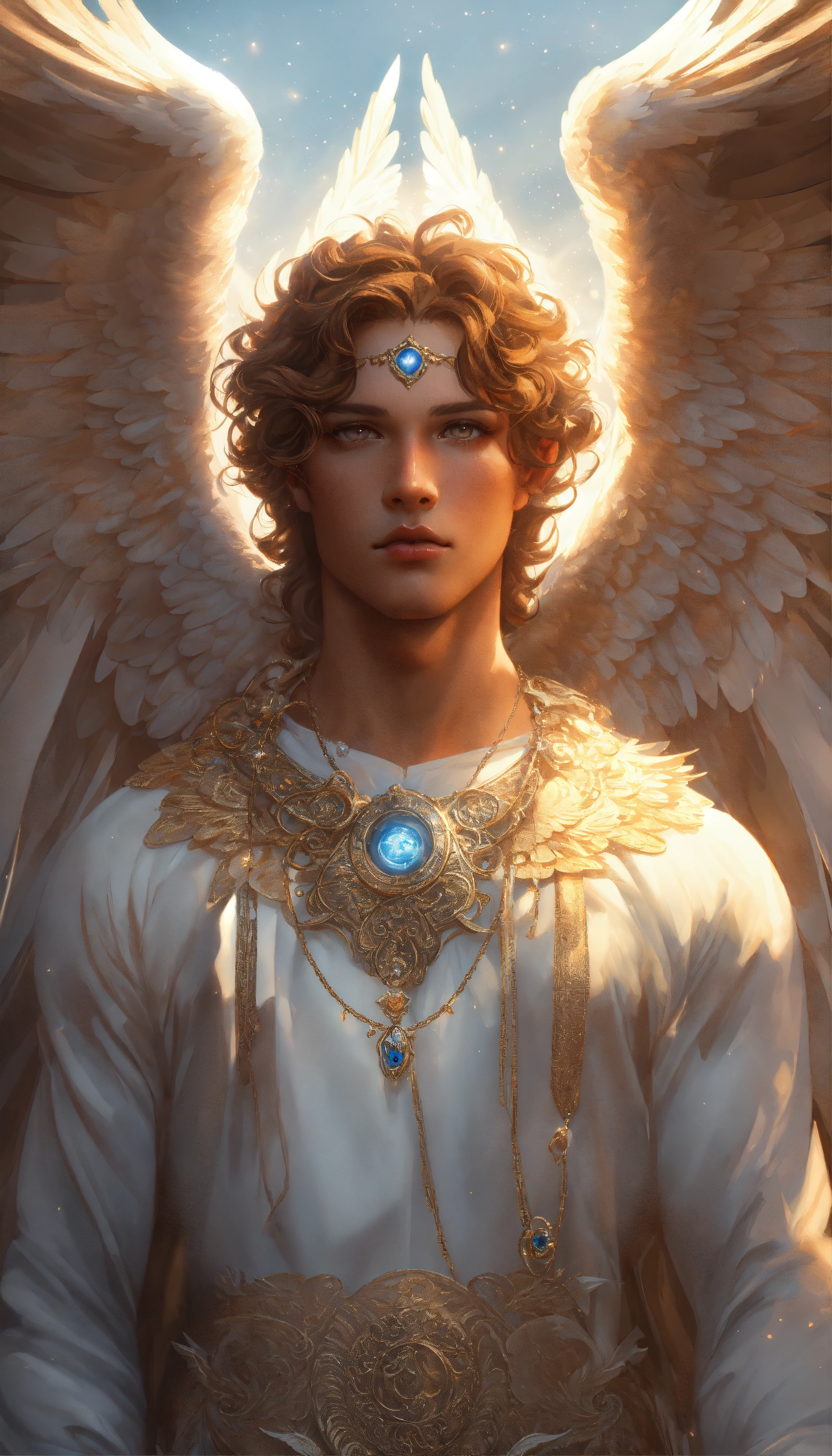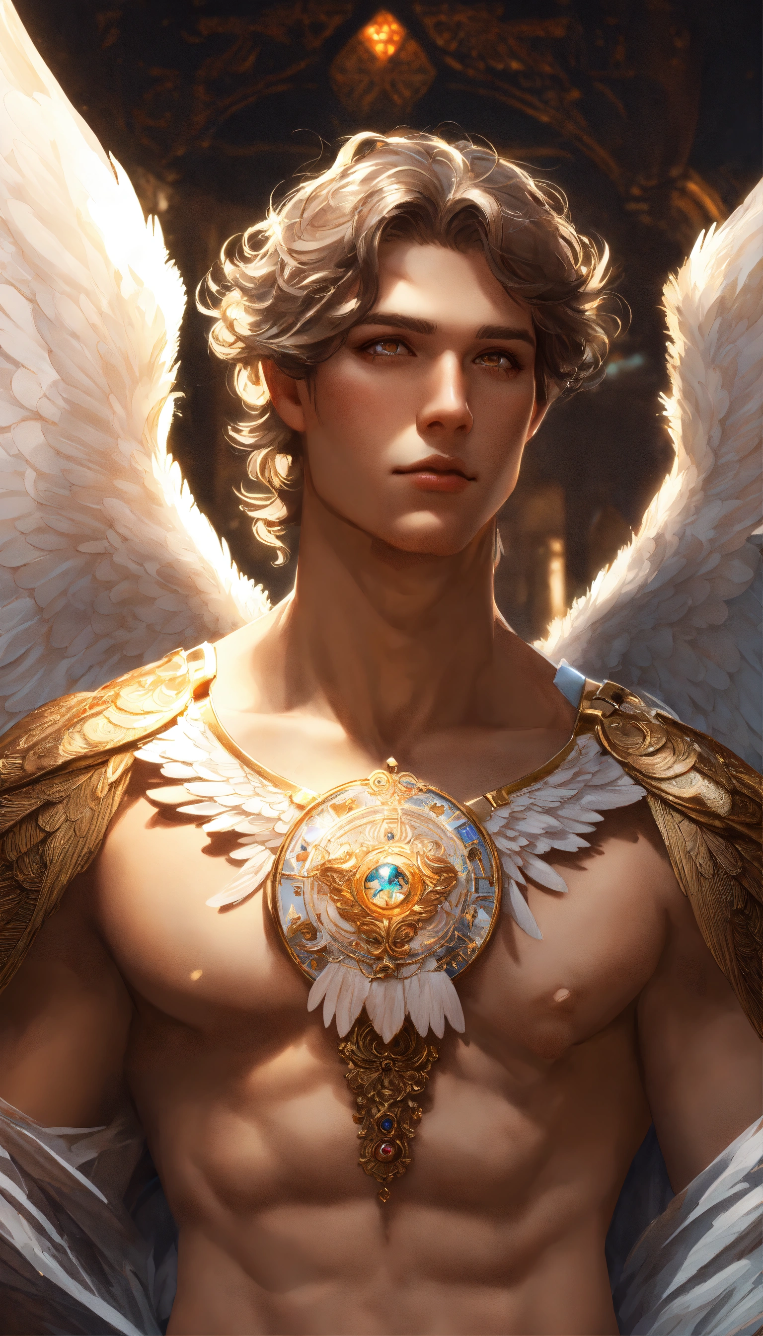 Male angel, wings, intricate, headshot, highly detailed, digital painting, art station, real, 3d, large detailed white wings, white eyes and deep gaze, jewel in third eye, mystical, sharp focus, cinematic lighting, 8k, illustration, art by artgerm and greg rutkowski, alphonse mucha, cgsociety