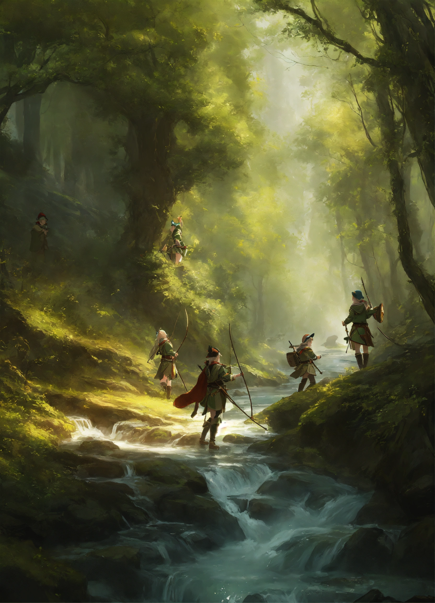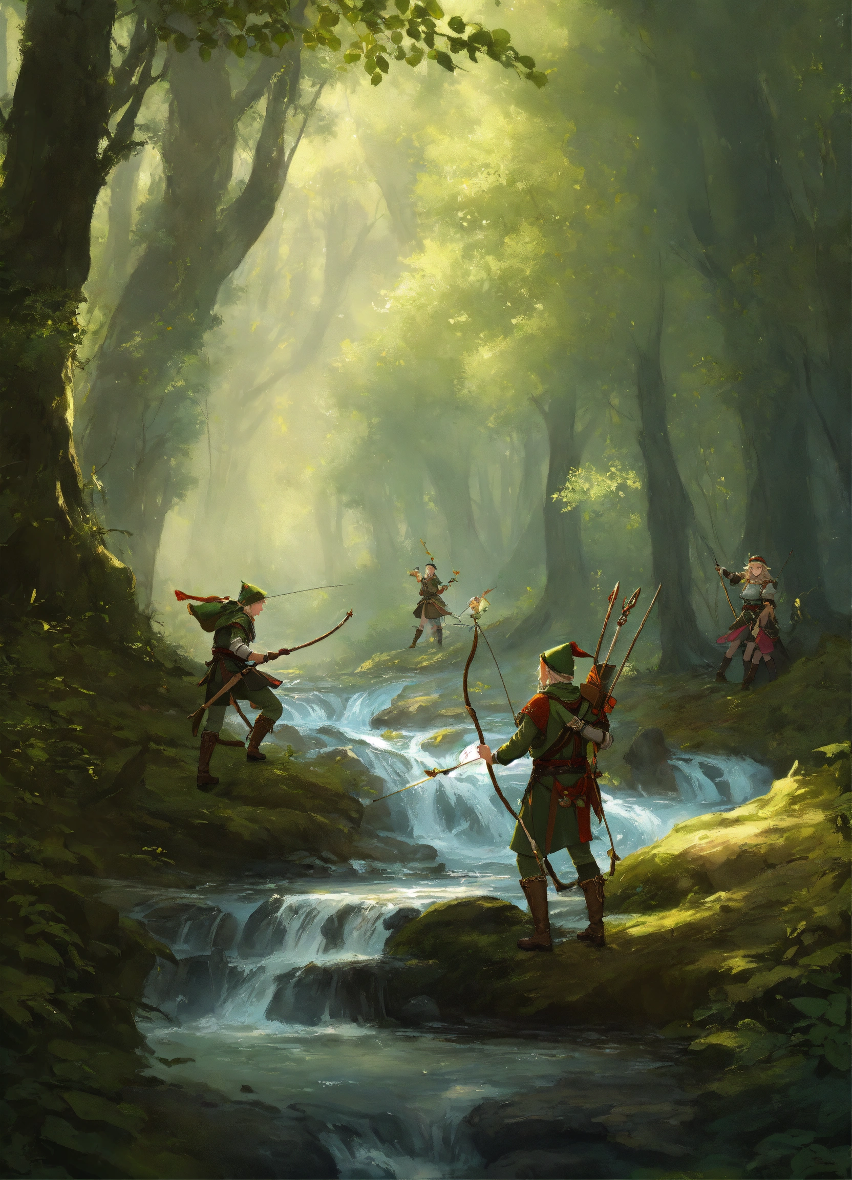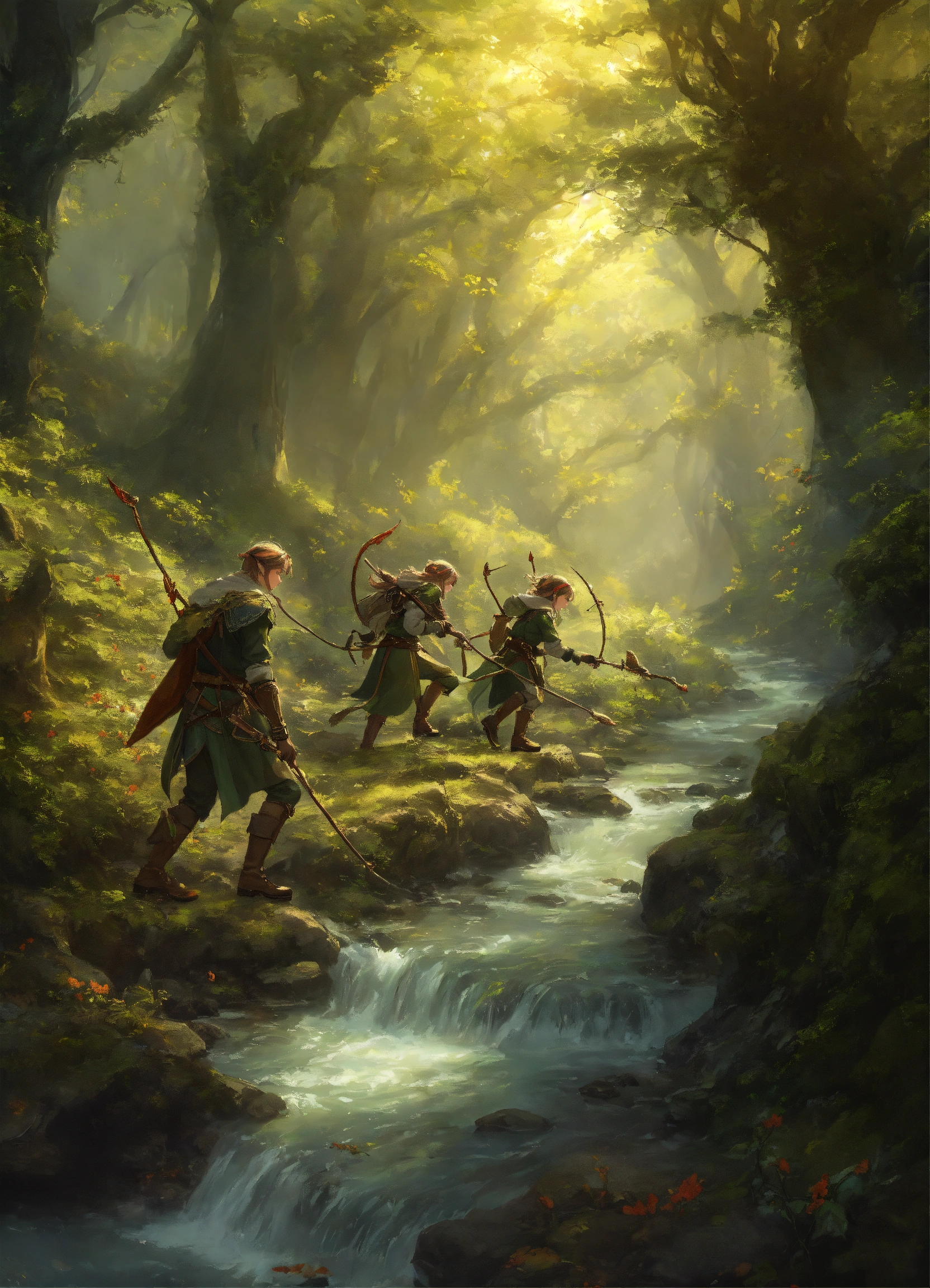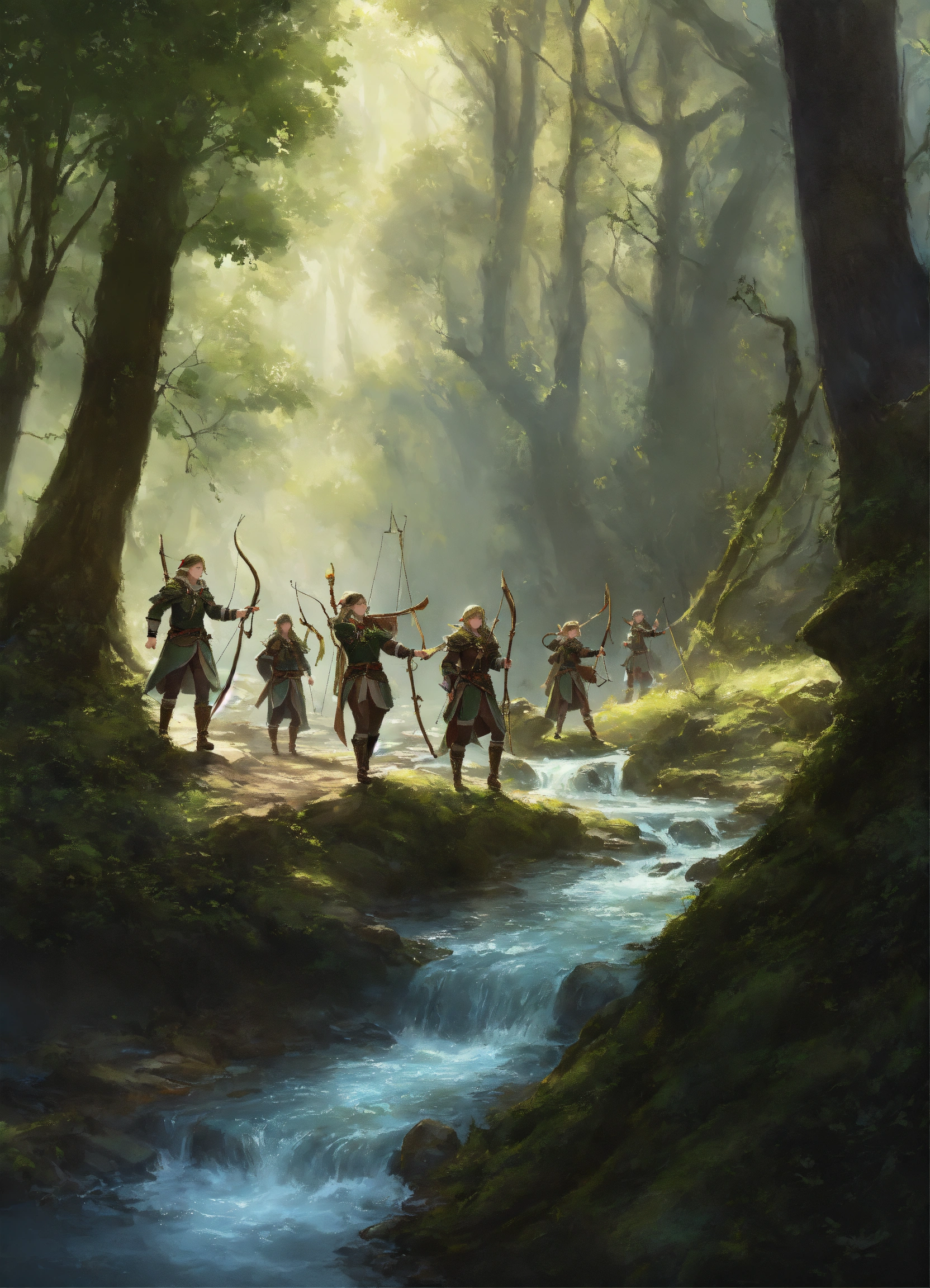 4 elves with bows hunting in a forest with a stream in a forest