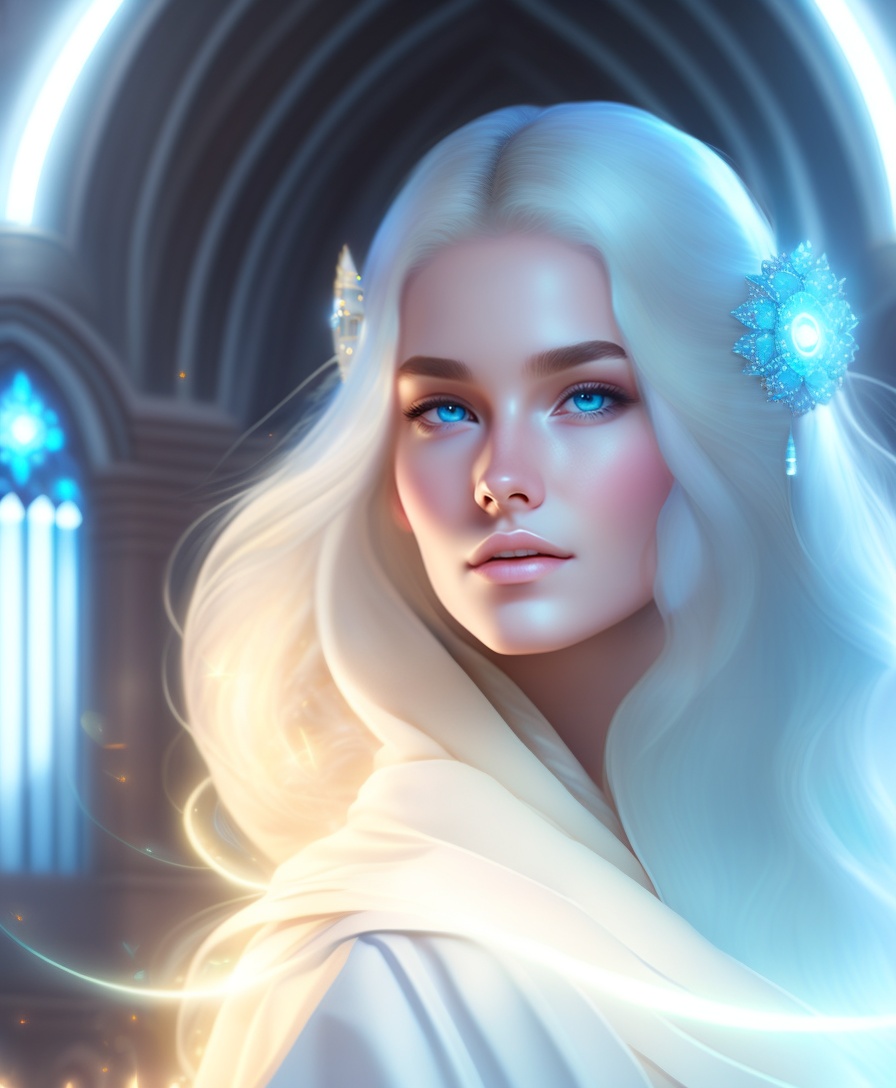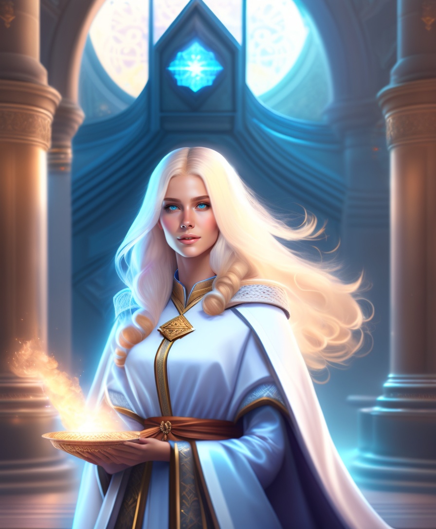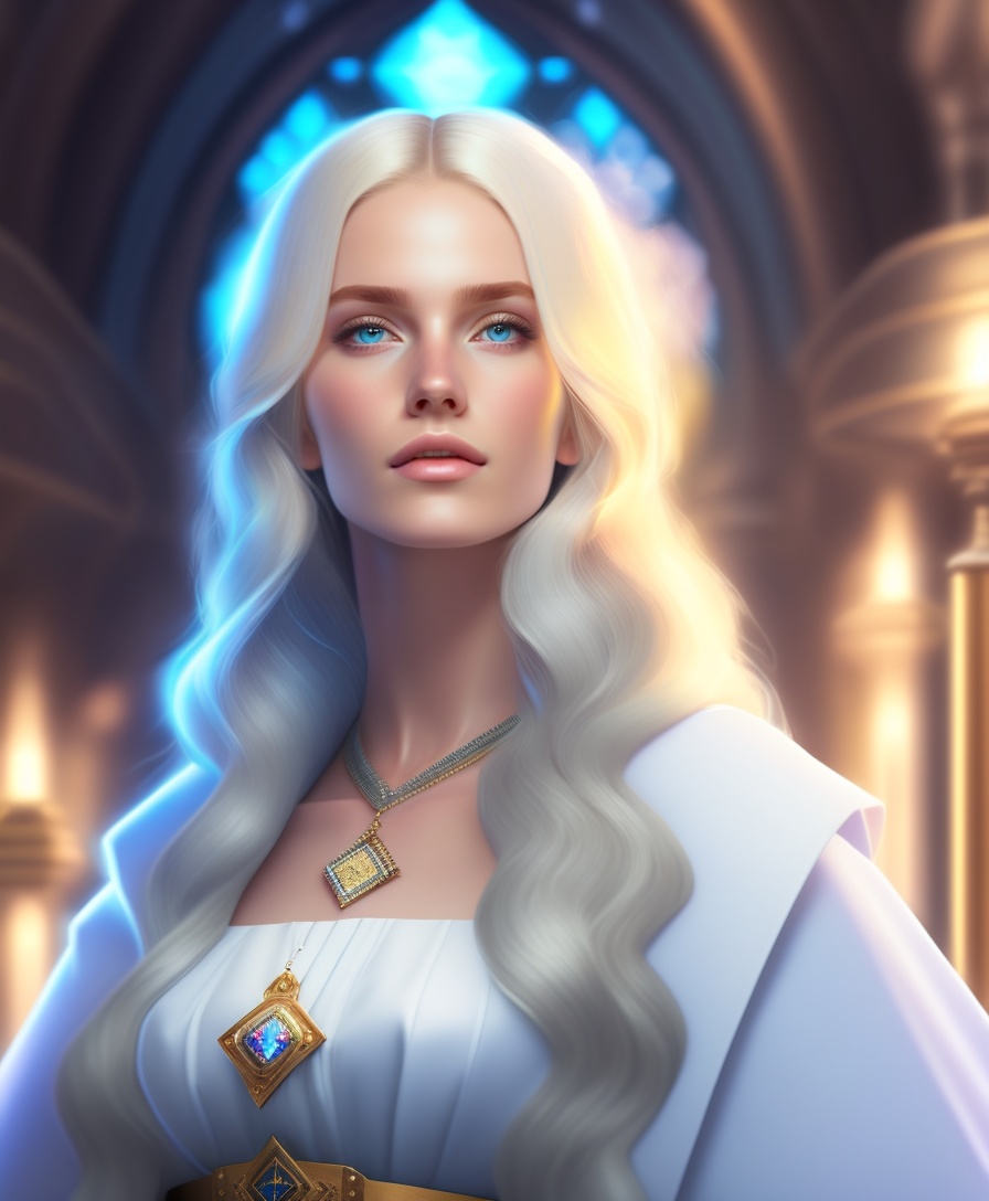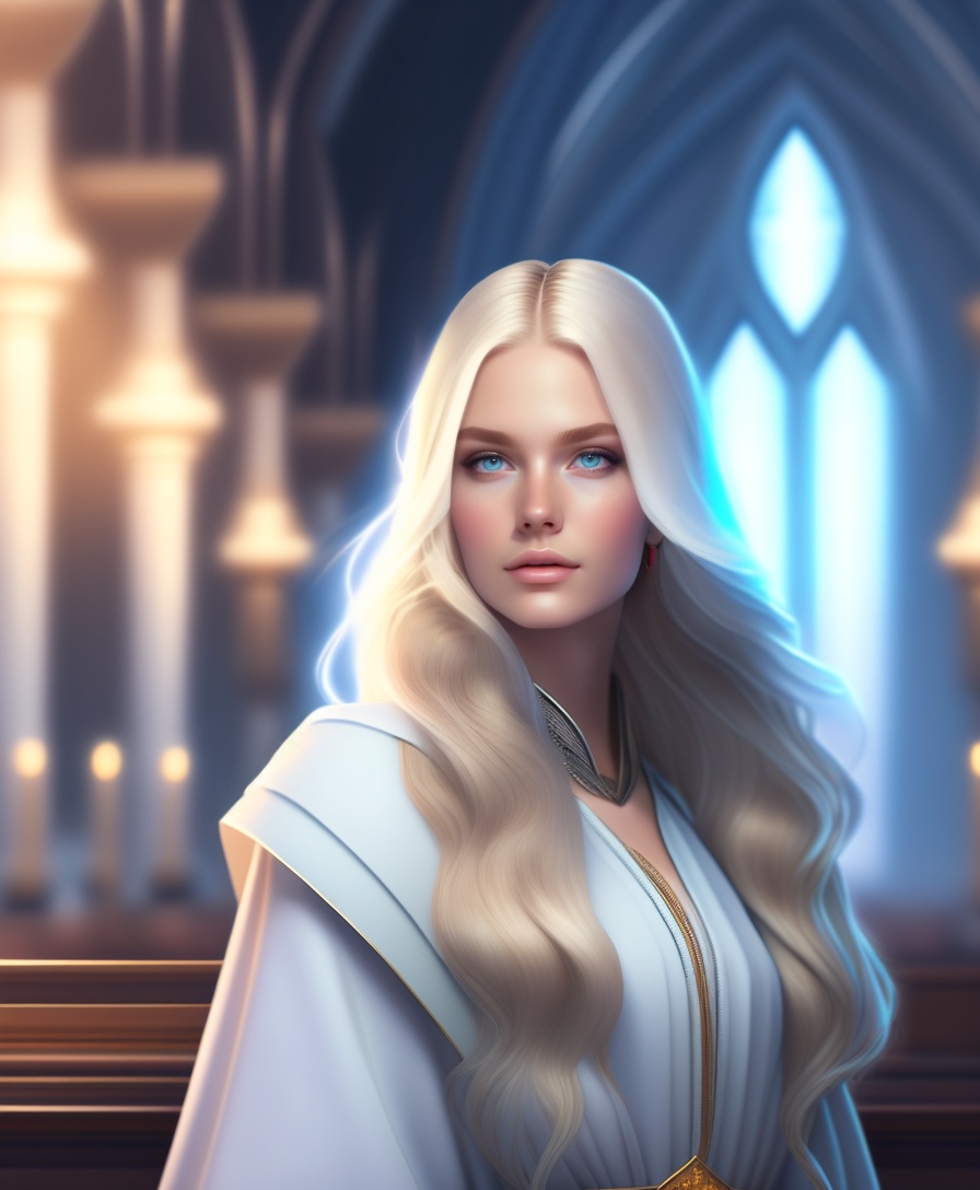 Young priestess of the light, blue eyes, blonde hair, long hair, white robe, bright church, bright atmosphere, octane render
