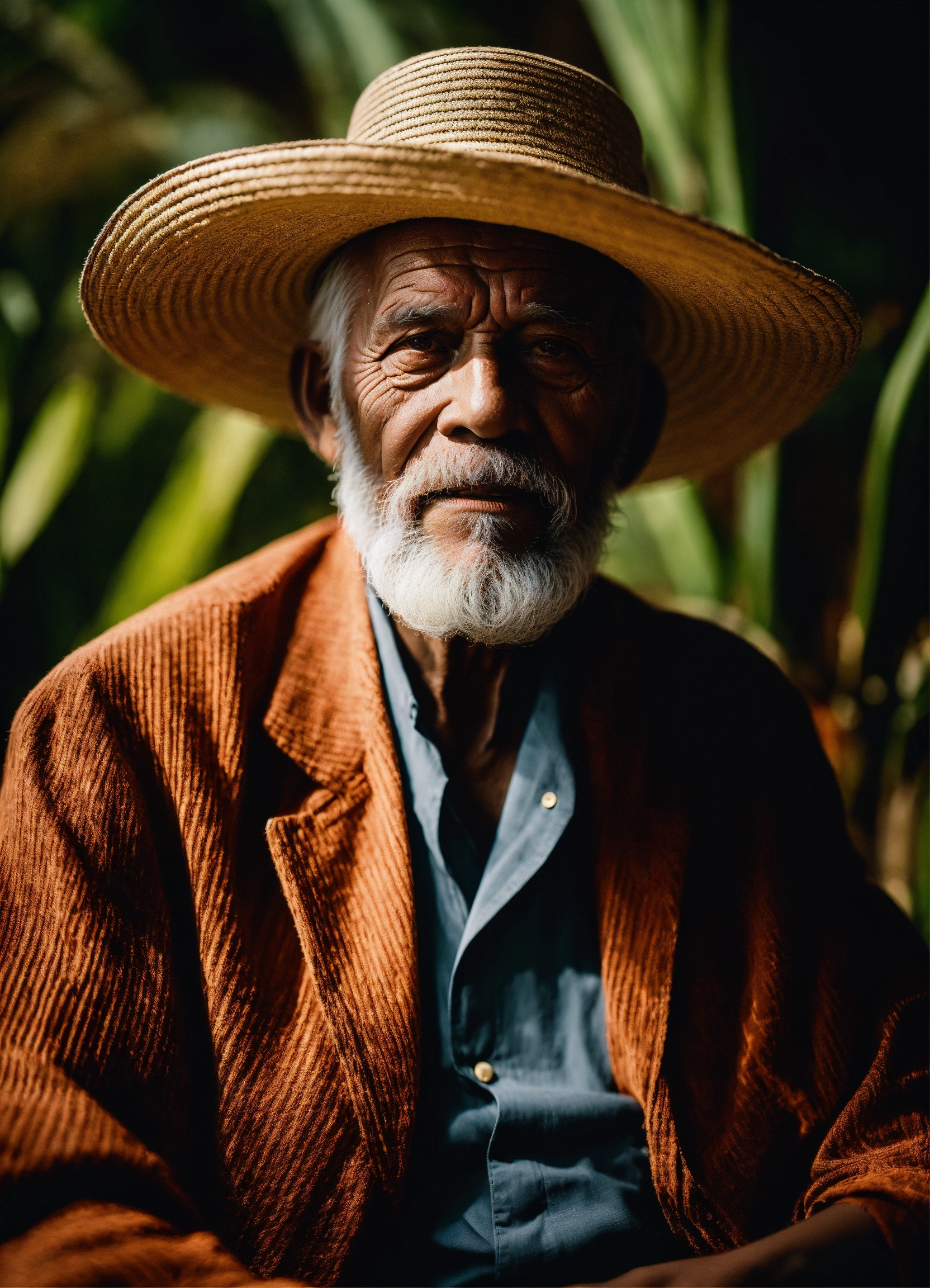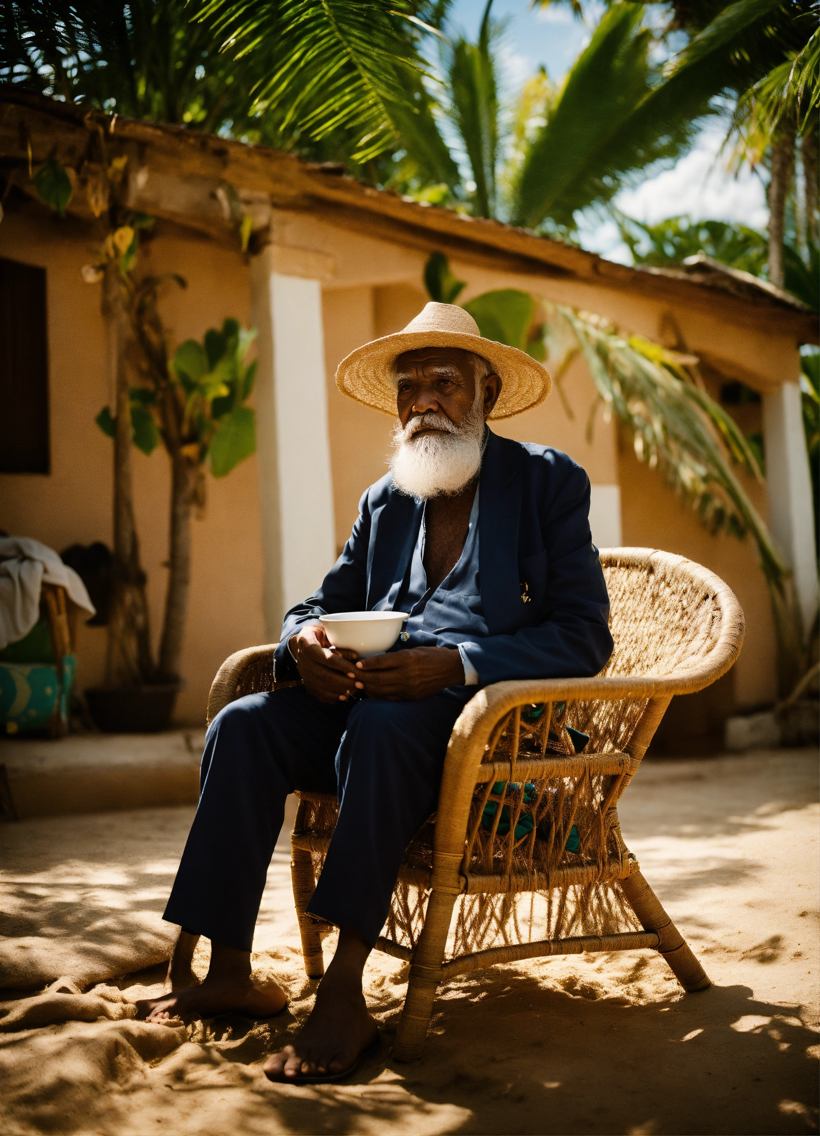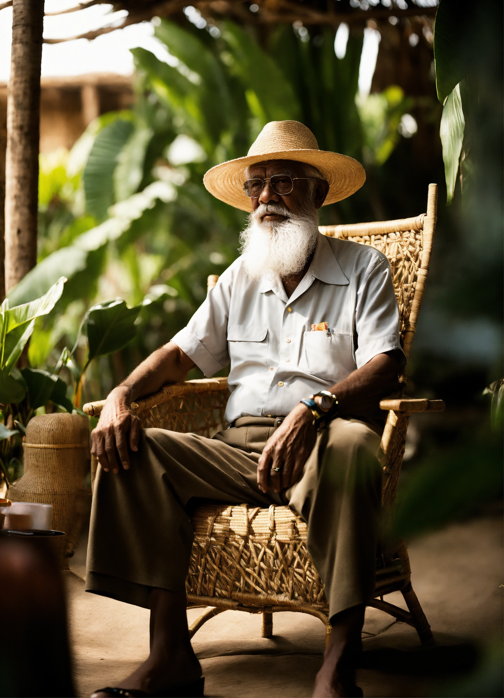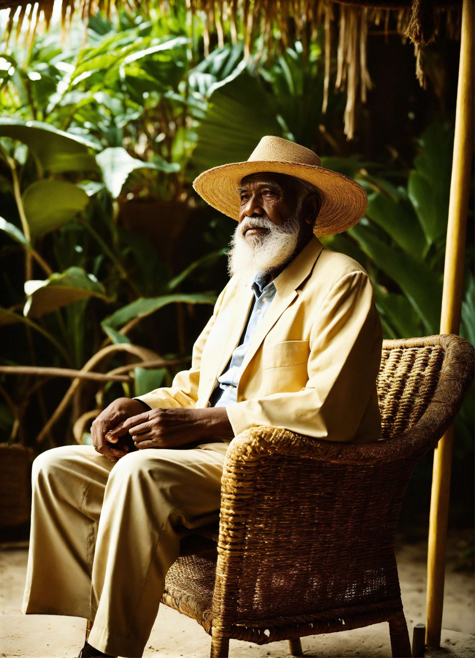 A wise old man with white beard and bakoua hat in a tropical setting, sitting on a straw chair, shot on hasselblad, shadowplay