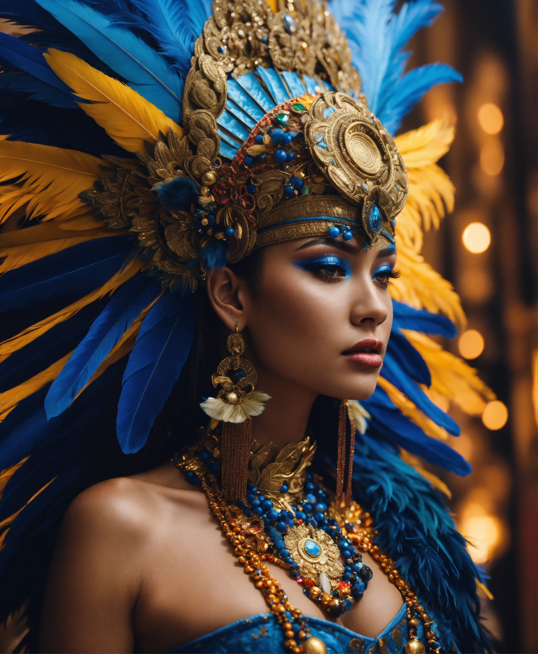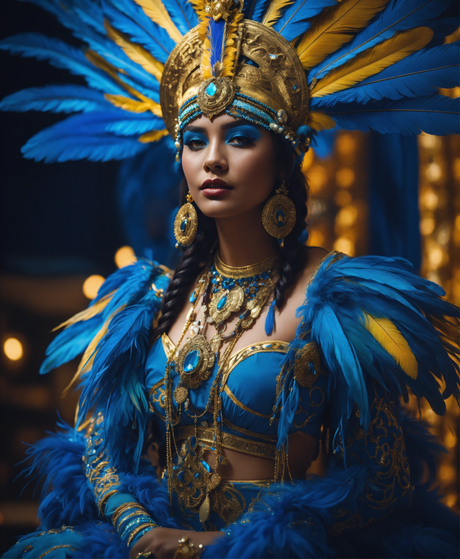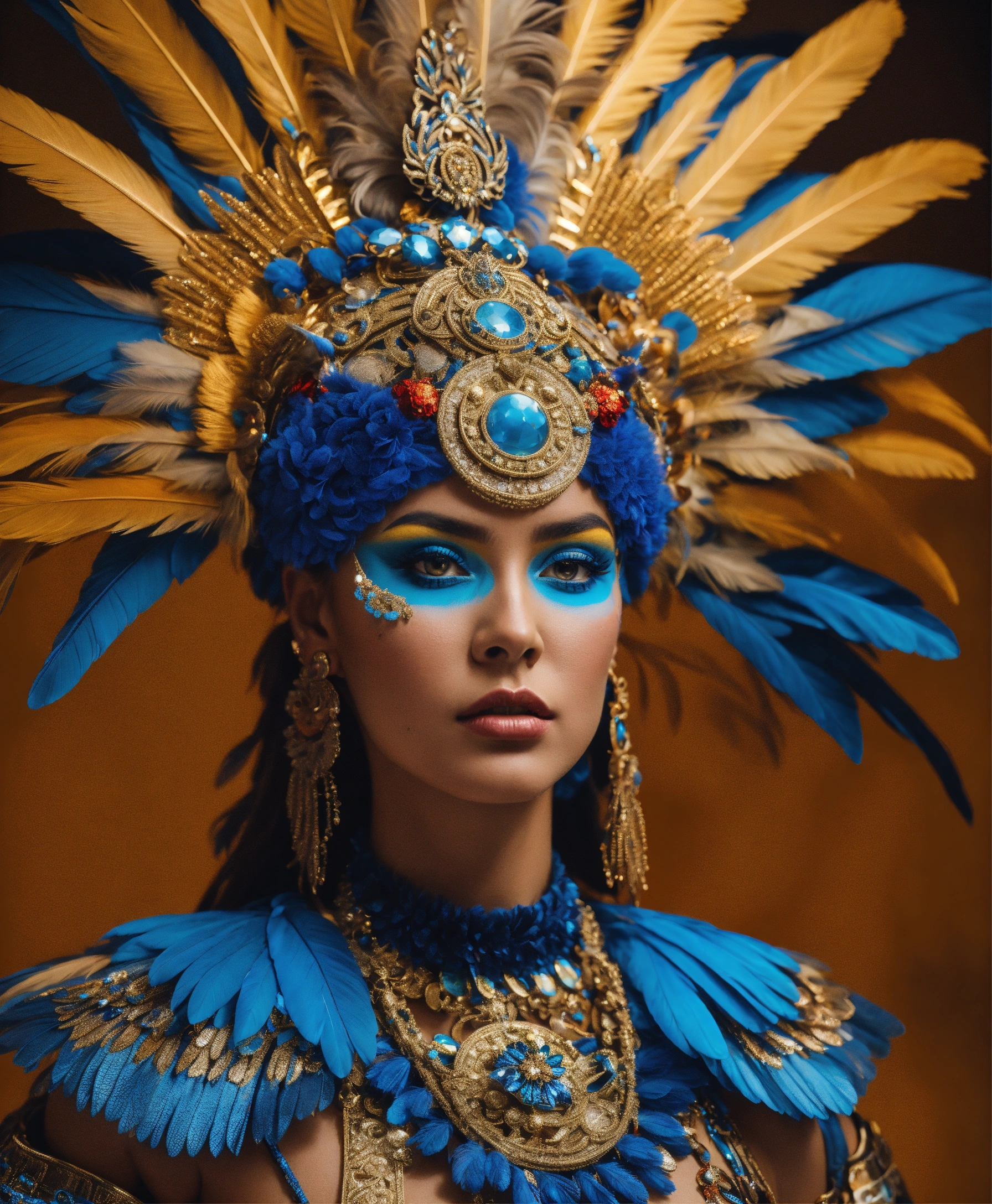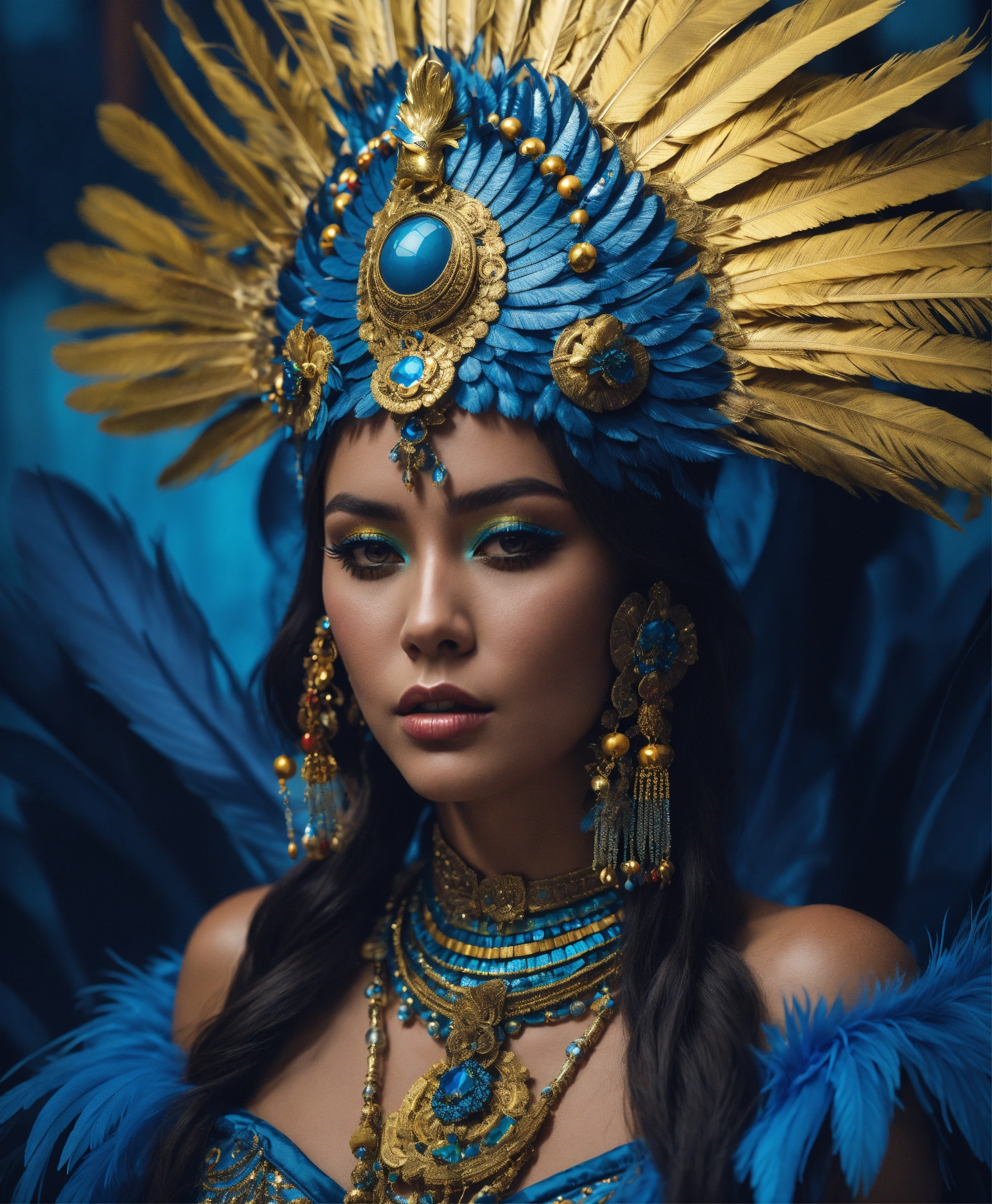A white skin mayan queen all blue and gold elaborate outfit, with huge headpiece center piece, blue/gold makeup with oversized headdress with long bird feathers, with depth of field, fantastical edgy and regal themed outfit, captured in vivid colors, model, 8k resolution, hyper realistic, day, 35mm film, editorial, high fashion, 2023, off white by virgil abloh, beautiful, highly detailed, sharp focus, studio photography, xf iq 4, 150 mp, 50 mm, iso 200, 1/1 60 s, realistic, colorful disco lights, octane render, adobe lightroom, rule of thirds, symmetrical balance, depth layering, polarizing filter, sense of depth, ai enhanced
