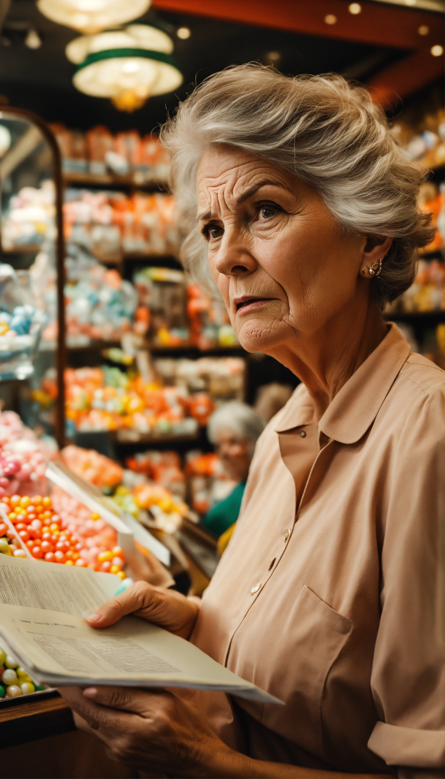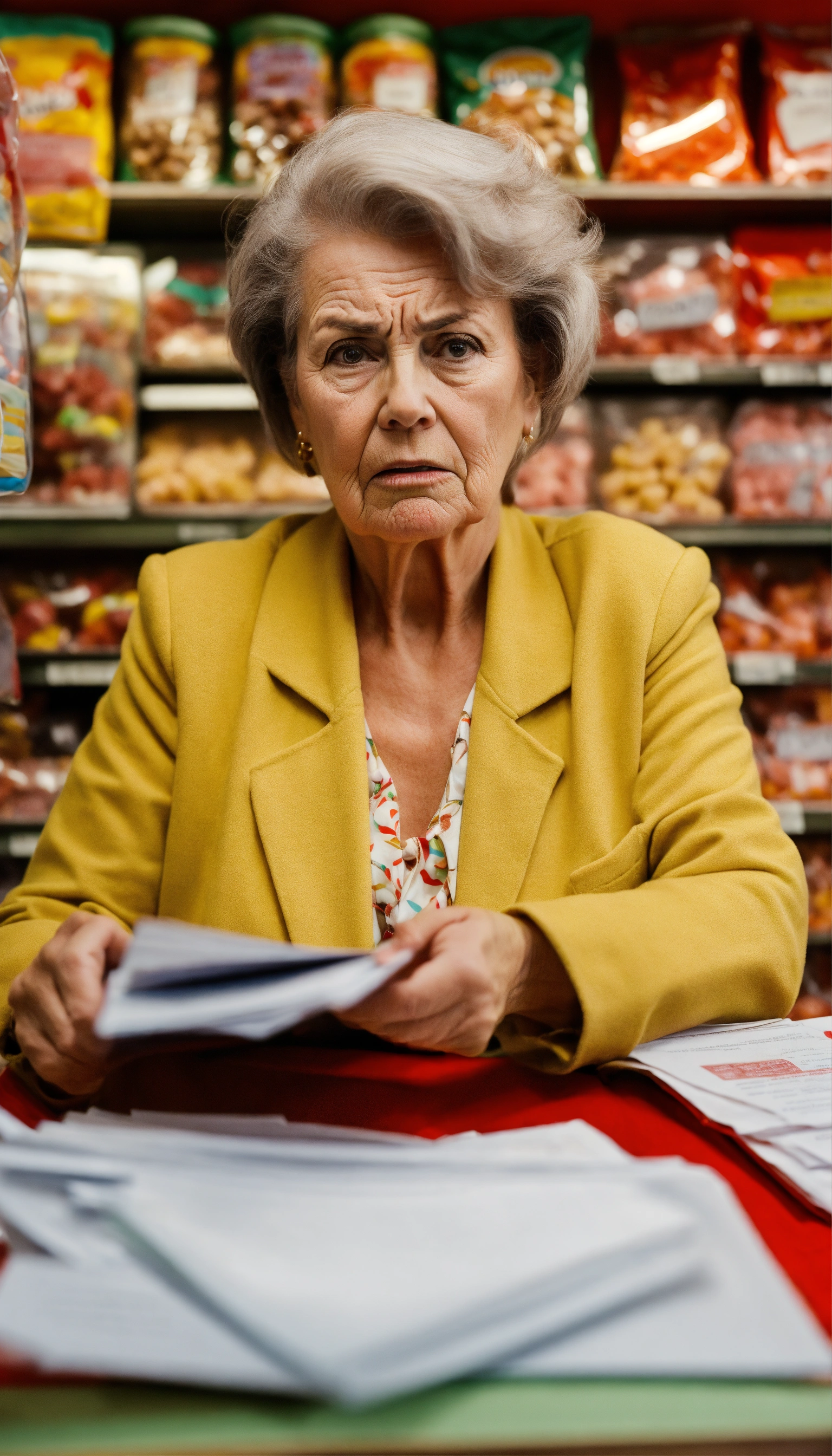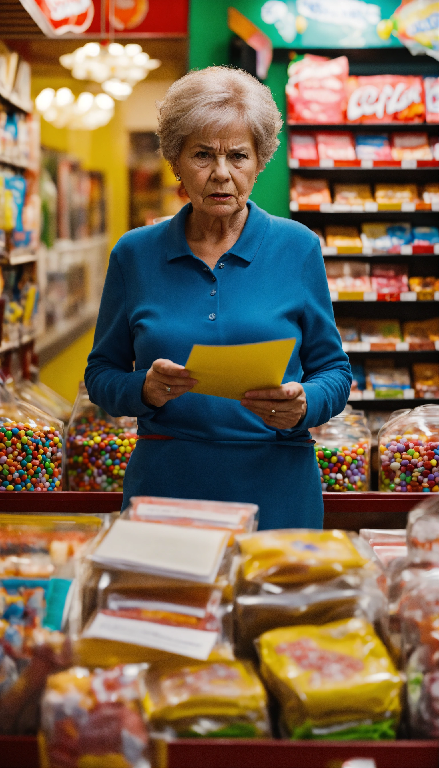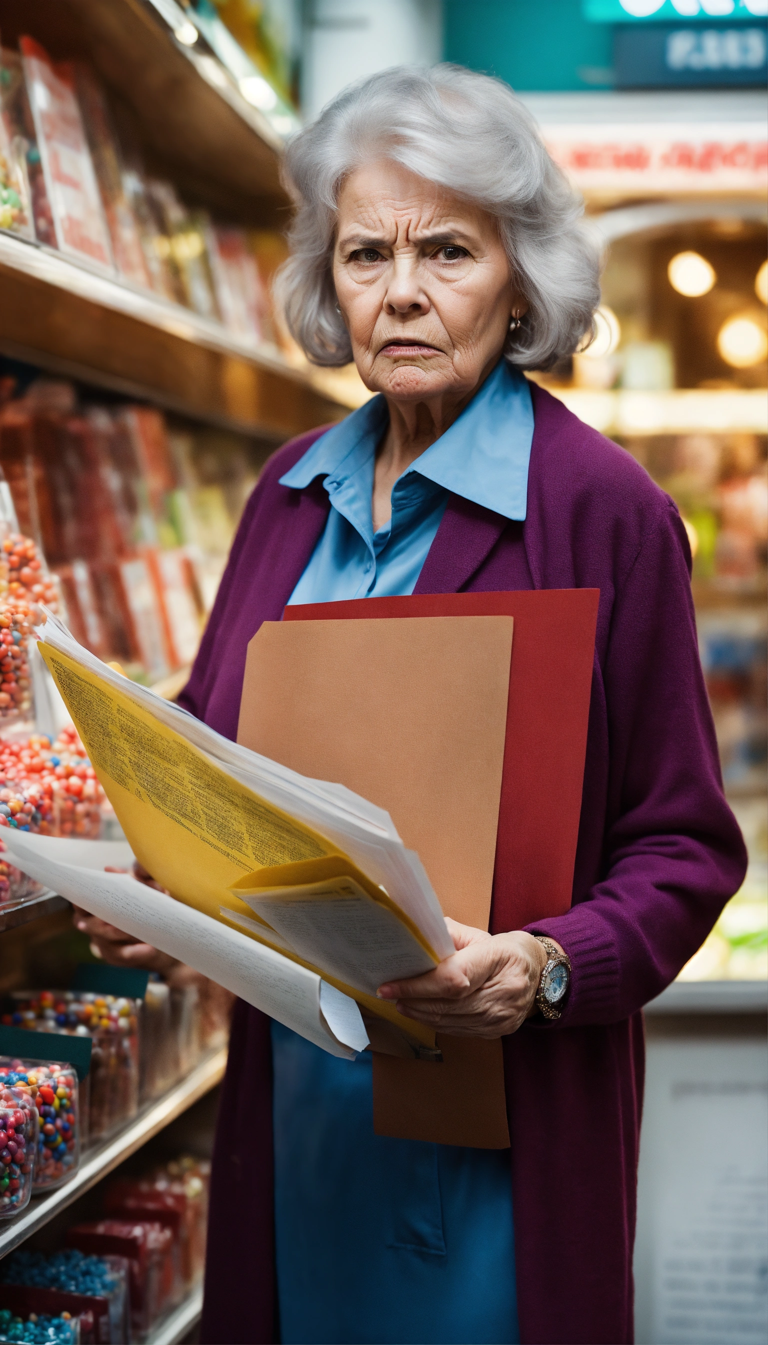 Angry woman in her 60s with documents in her hands looking at the camera, in the background of a candy store, realistic photo