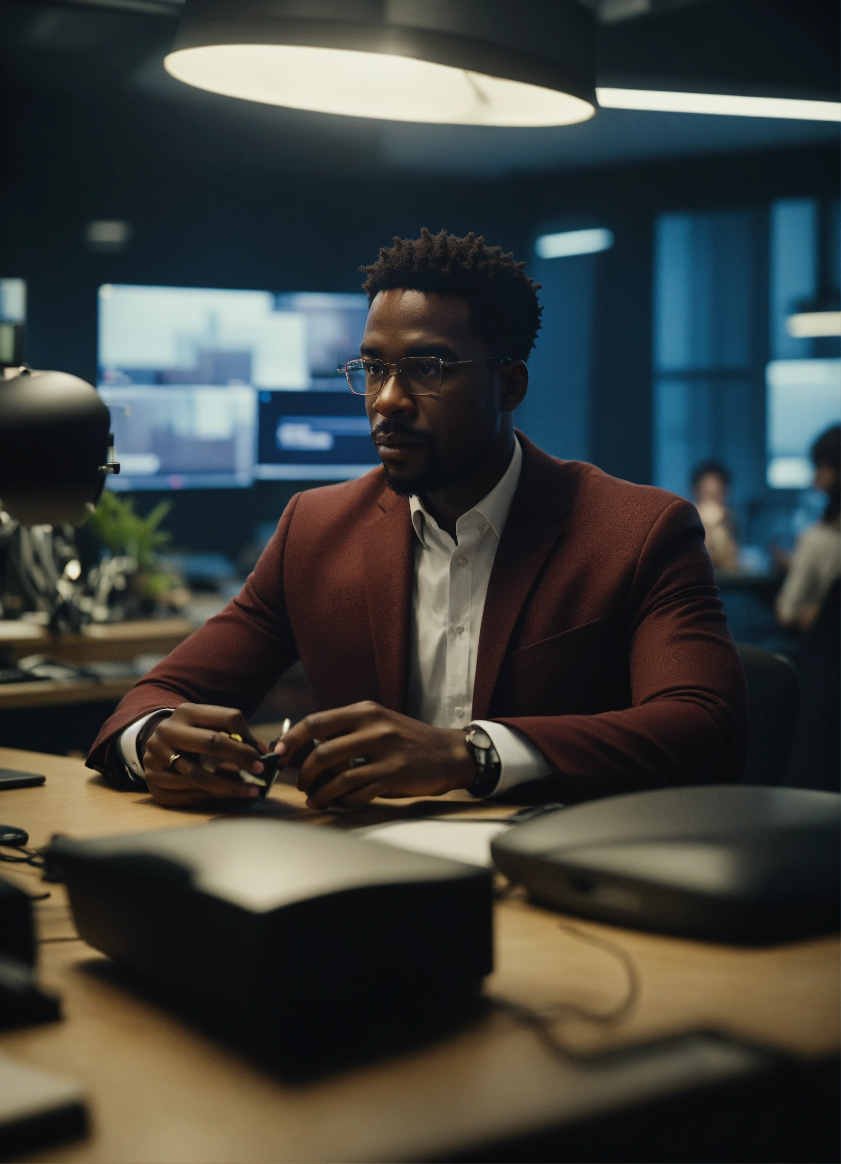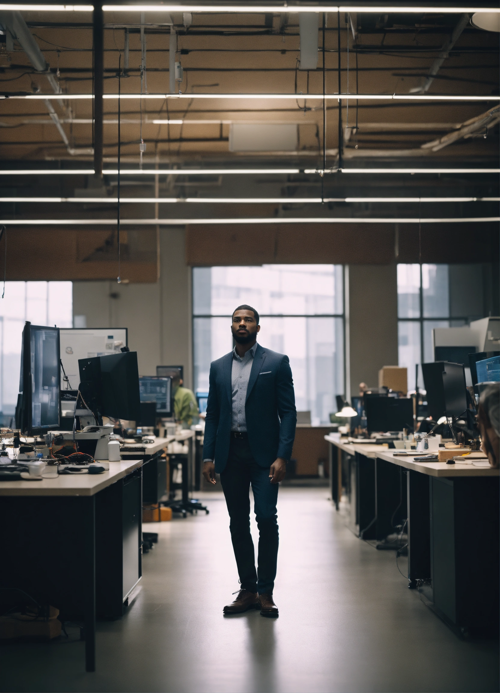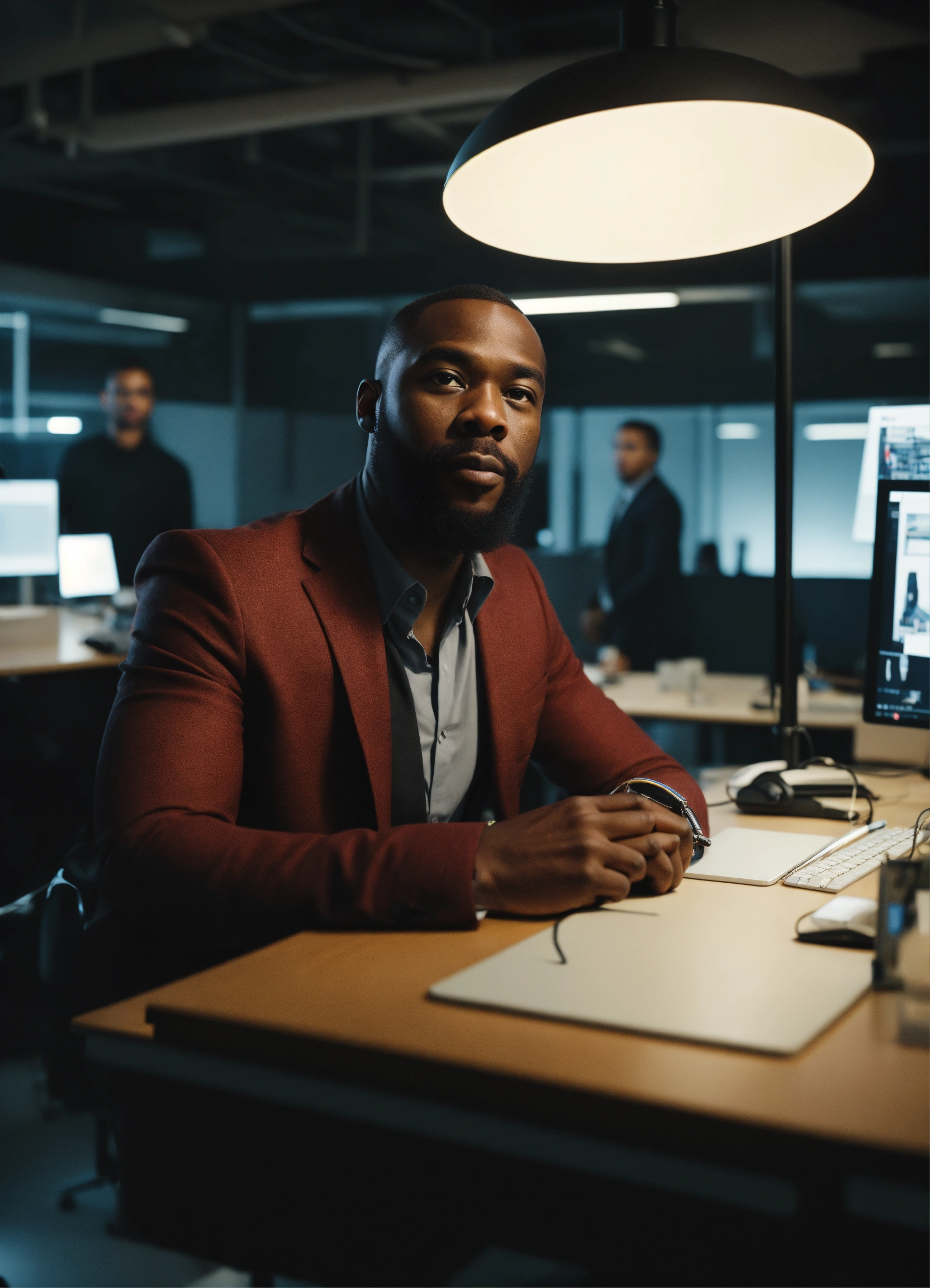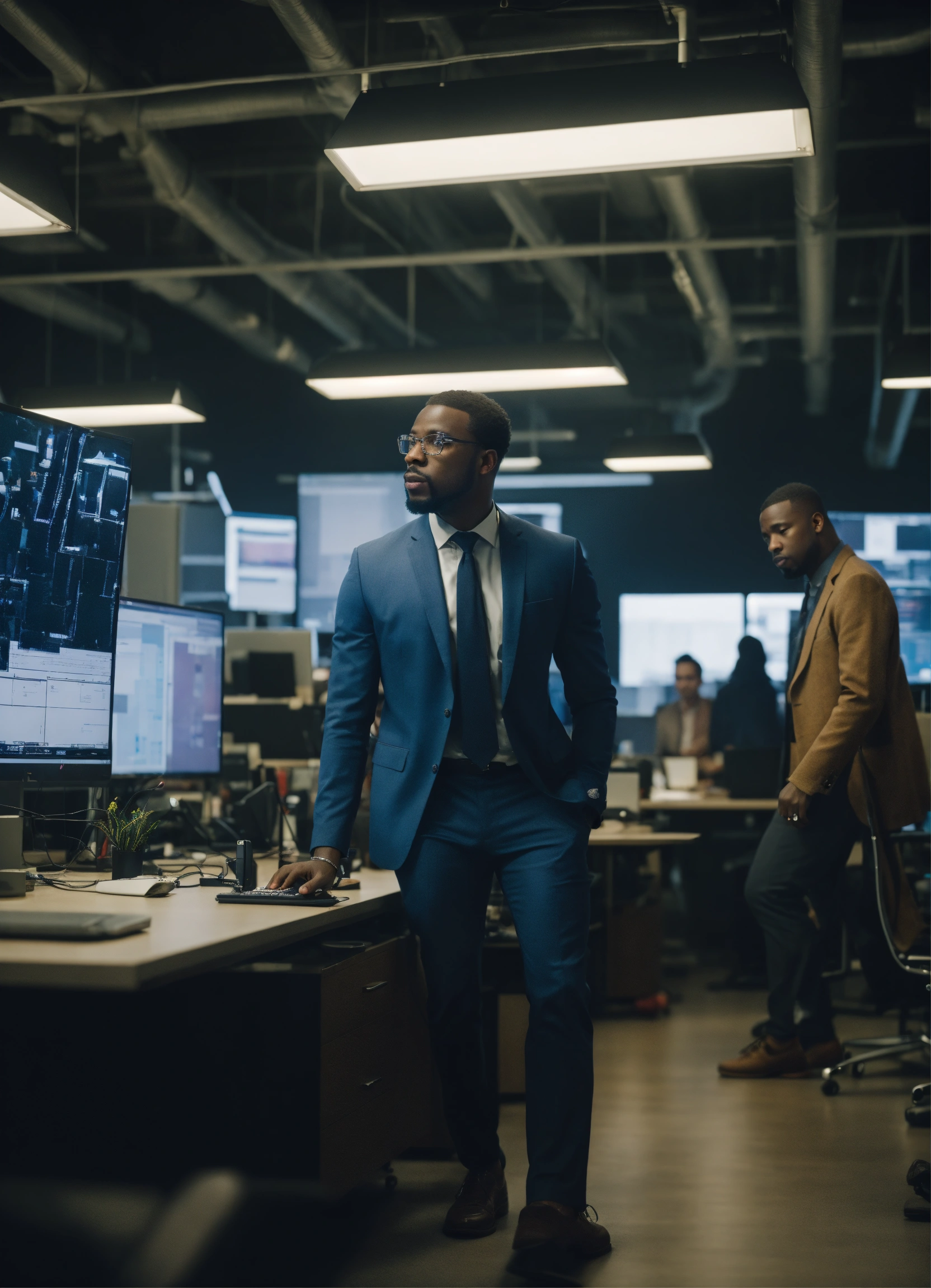 Wide angle environmental shot of black man genius inventor in a high-tech office environment, leading other people, surreal, dramatic, dark, sharp focus, 8k.