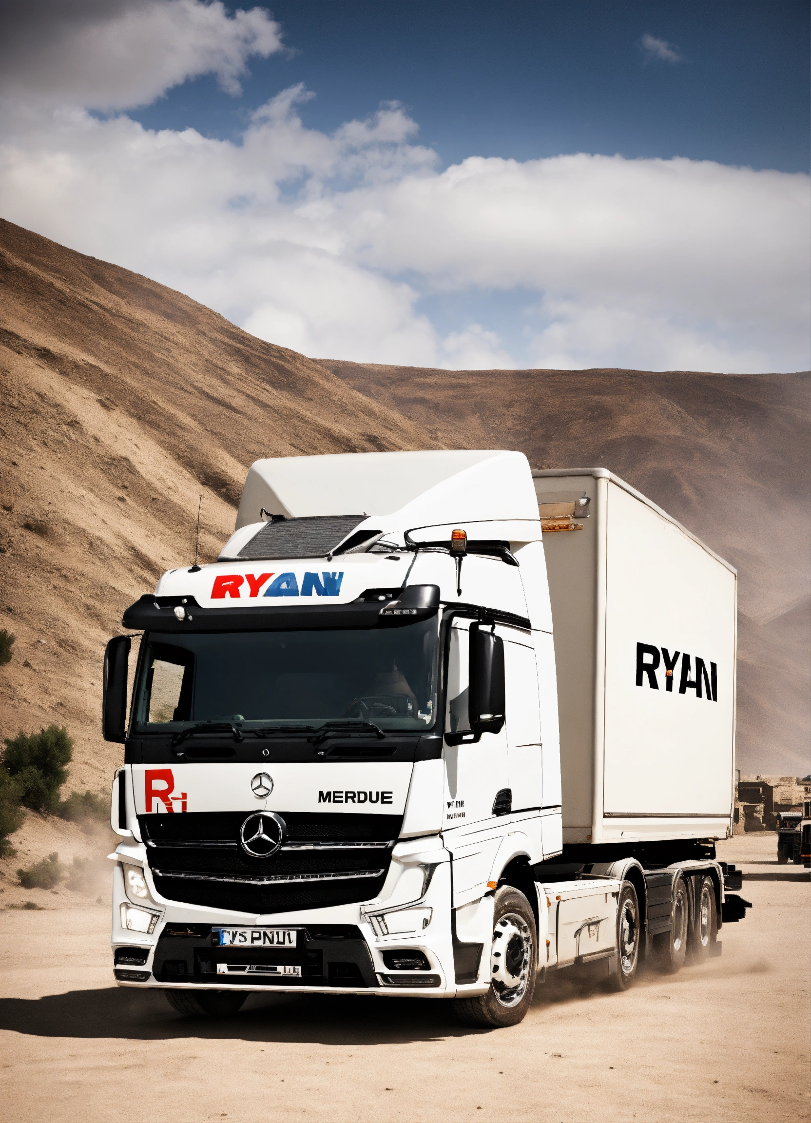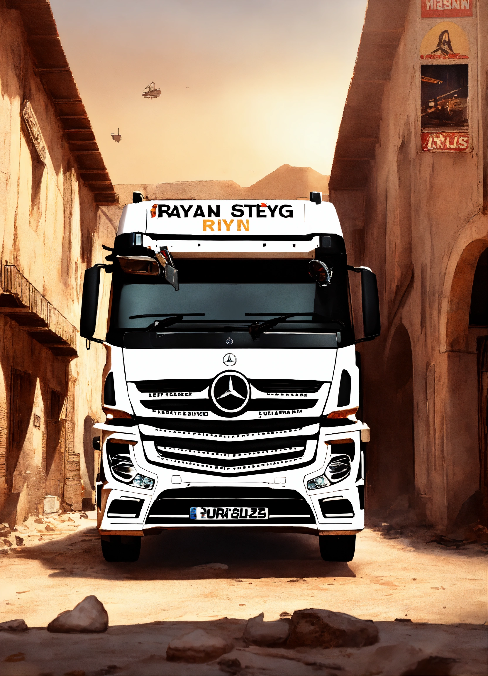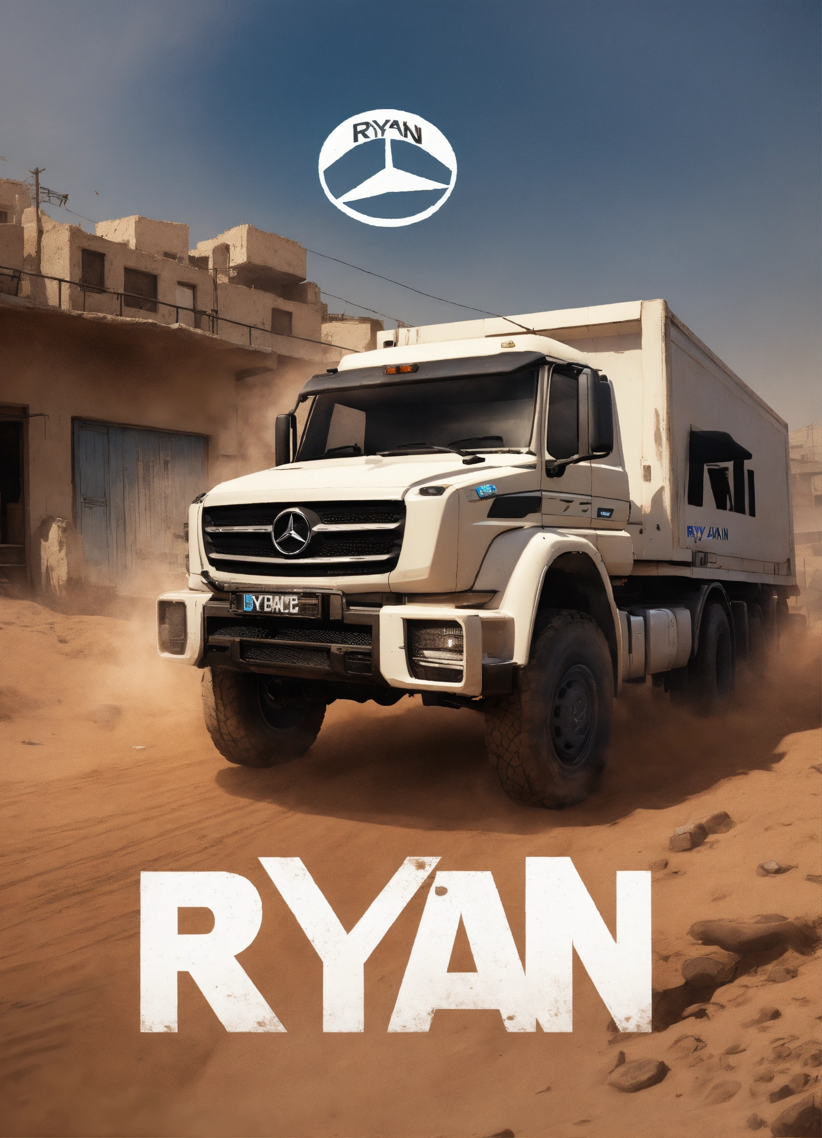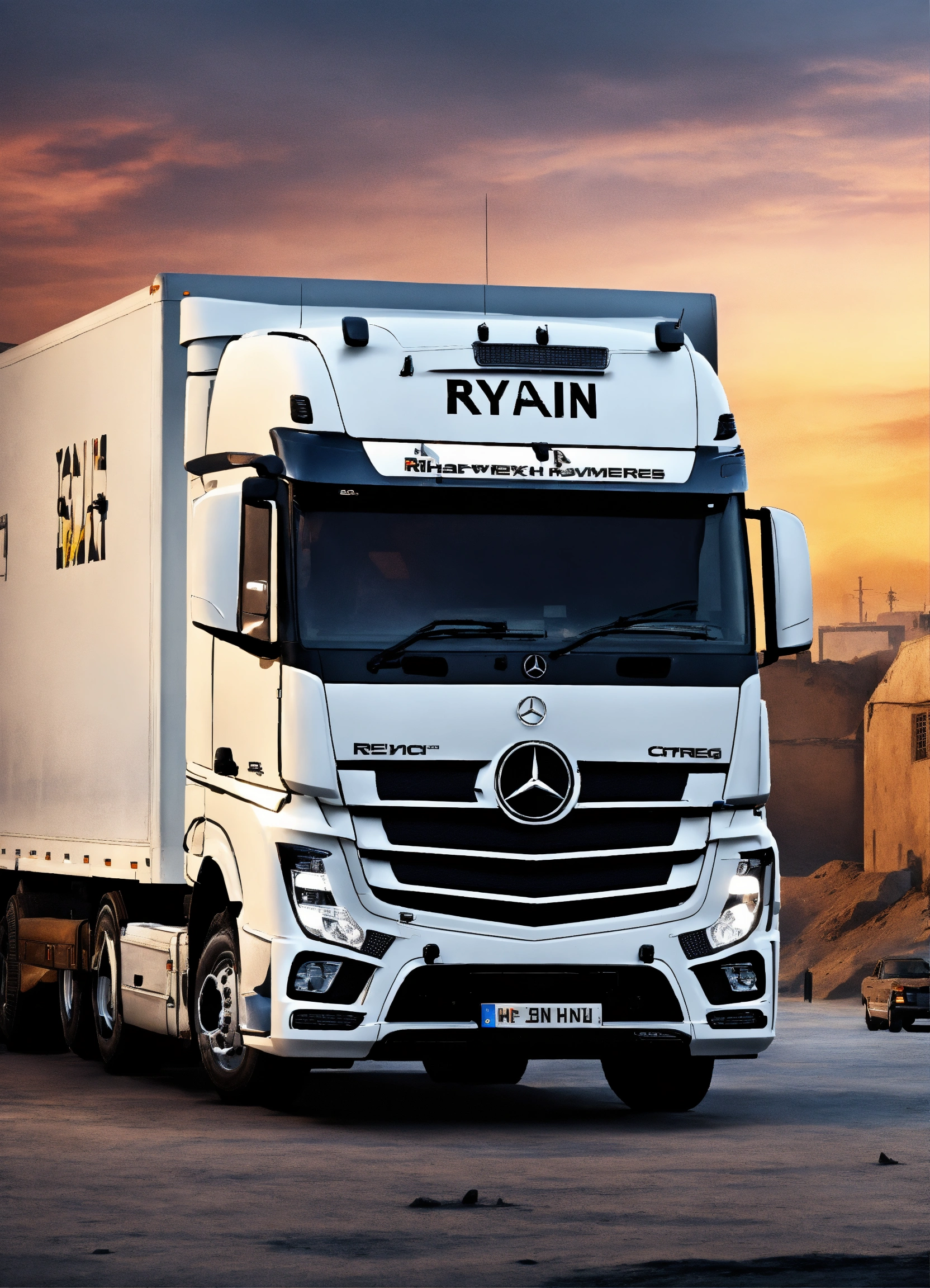 A white mercedes hgv truck with the word ryan on it in the style of counter strike csgo de_dust 2