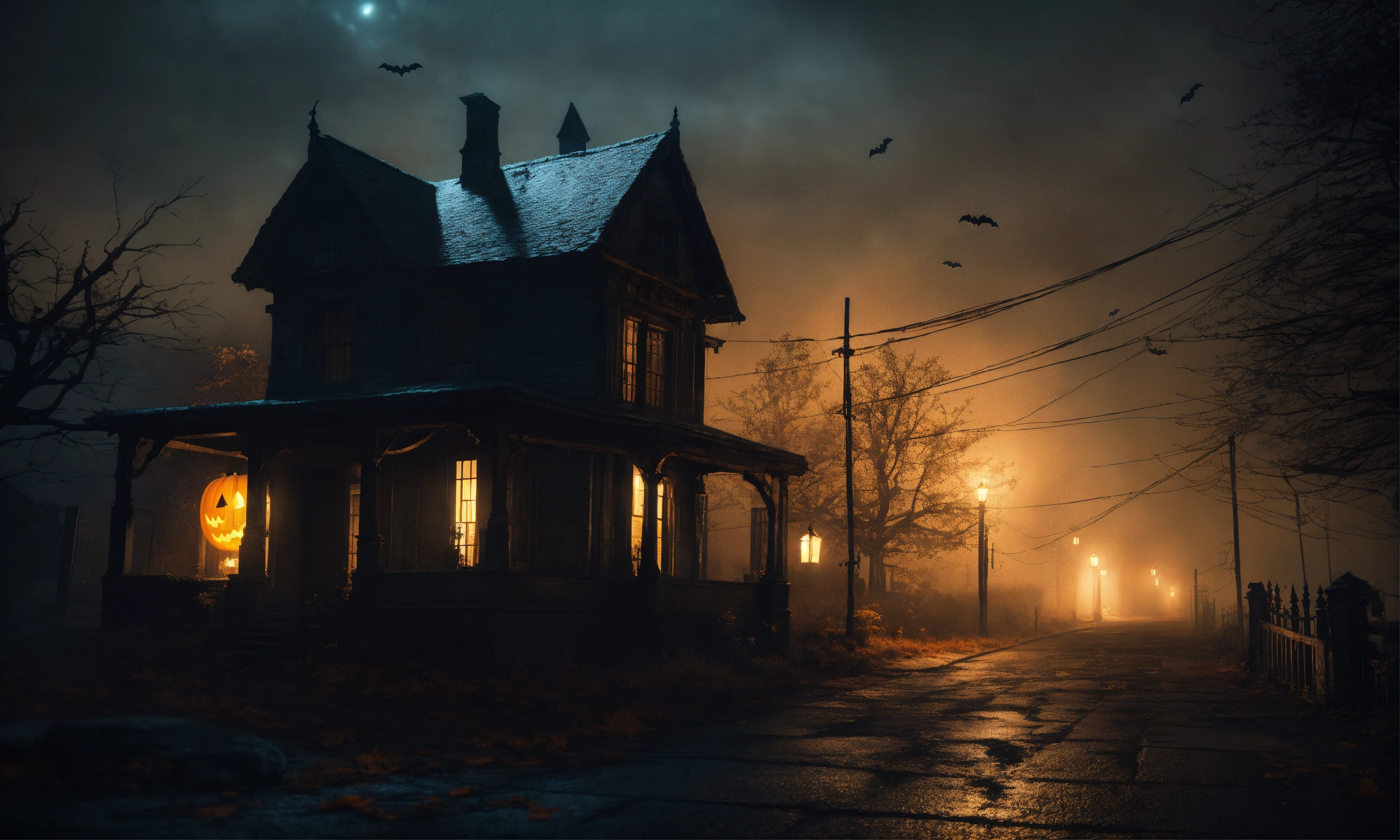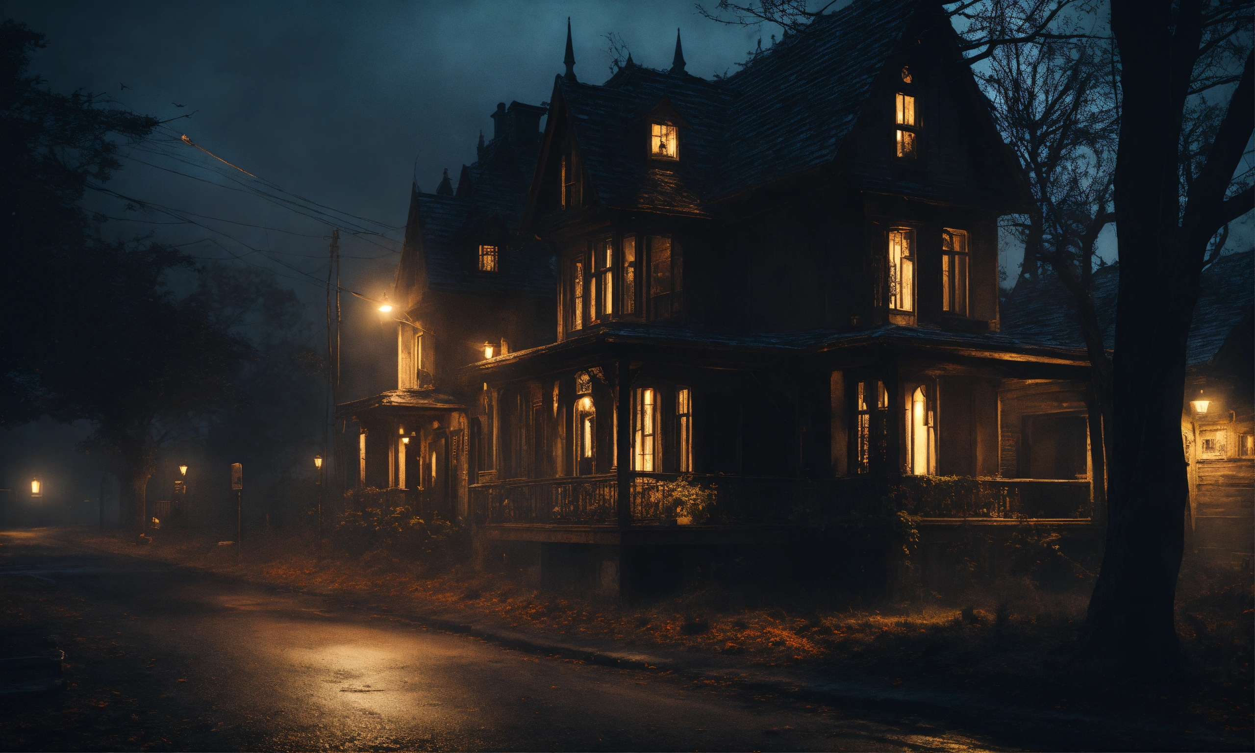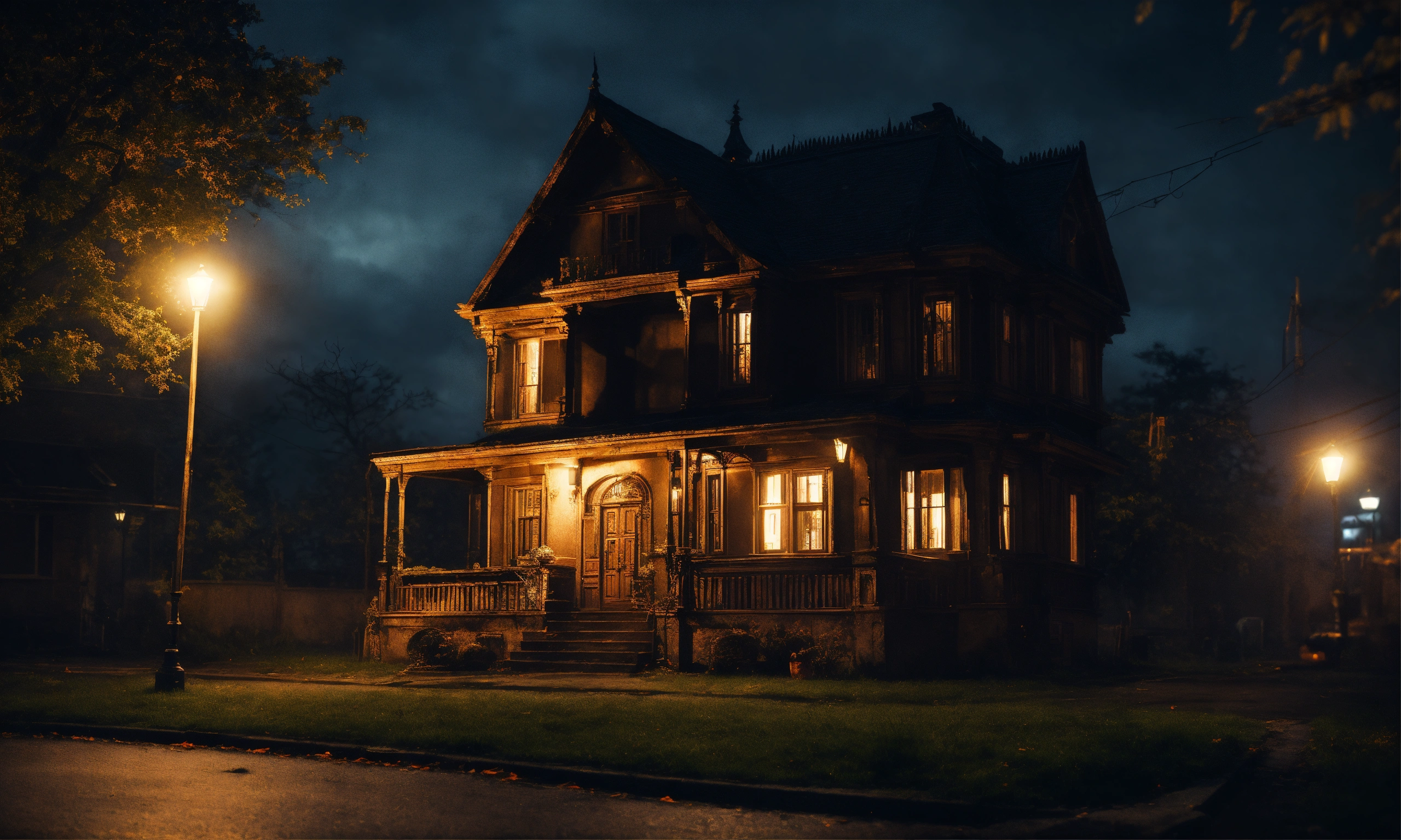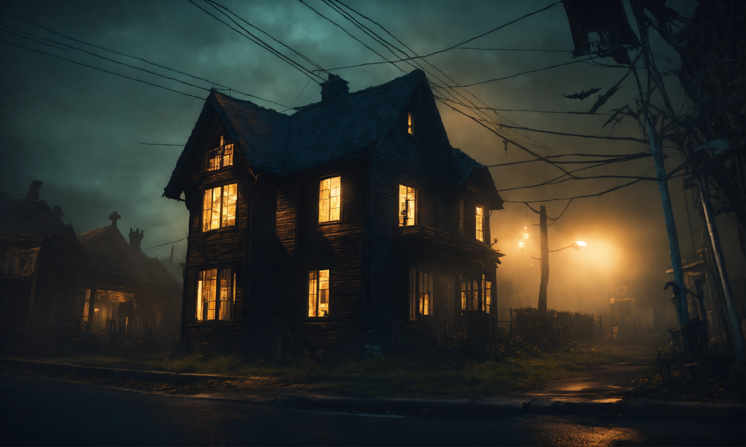 Spooky dark home incorner of street at night; in halloween; scary; realistic;, surreal, highly detailed, sharp focus, clear cold lighting, somber illustration, concept art, masterpiece, fantasy, cinematic lighting, other worldy, surreal 8k photo, moody aesthetic;