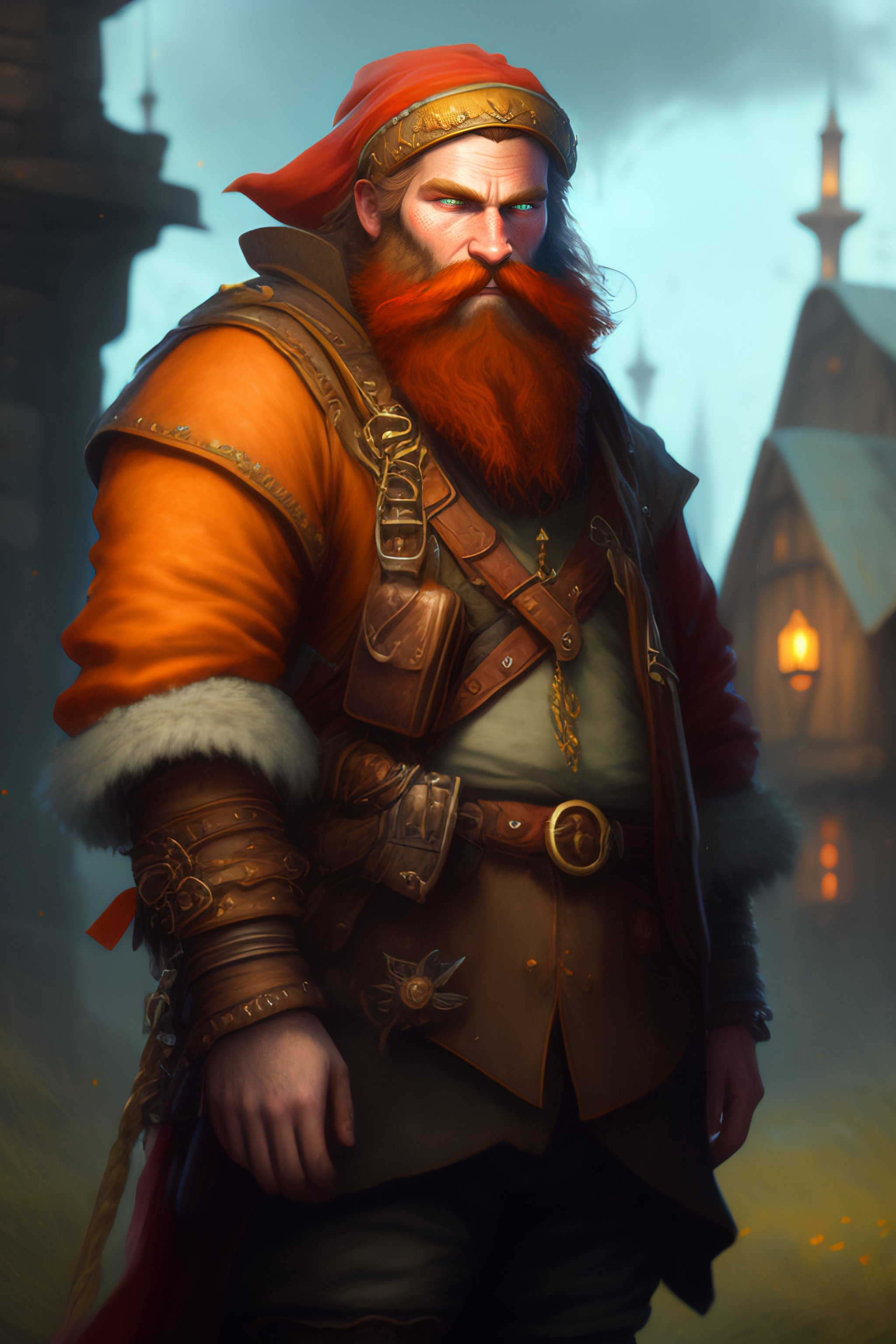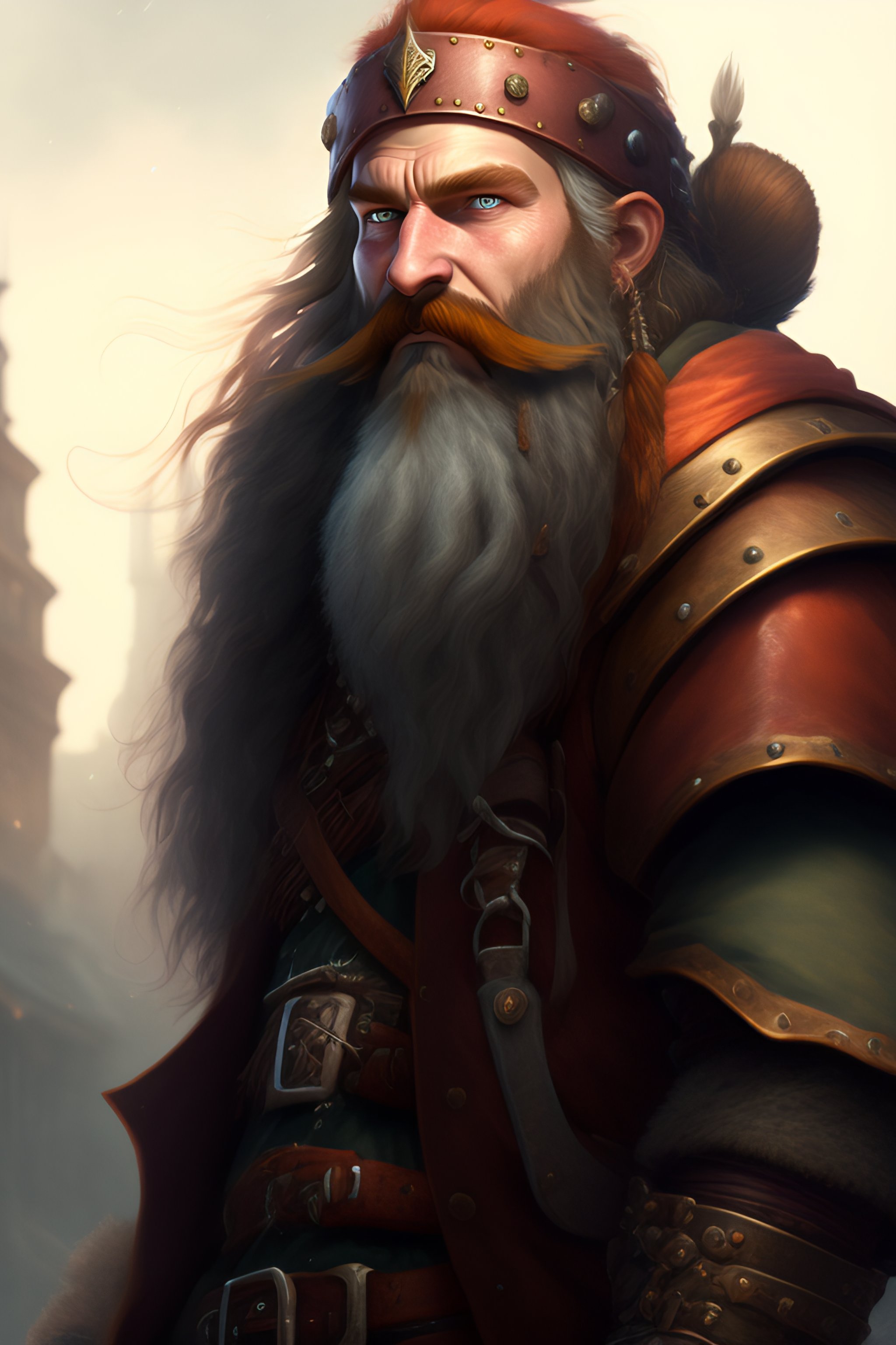 Fantasy dwarf. homeless beggar, has an eyepatch, red hair, long red beard. used to be a cleric but is exiled. wears symbol of bahamut around neck. dark skinned. in the style of rembrandt and akihiko yoshida. intricate. detailed, highly detailed, digital painting, trending on artstation, sharp focus, illustration. sharp. clear. bright and colorful.