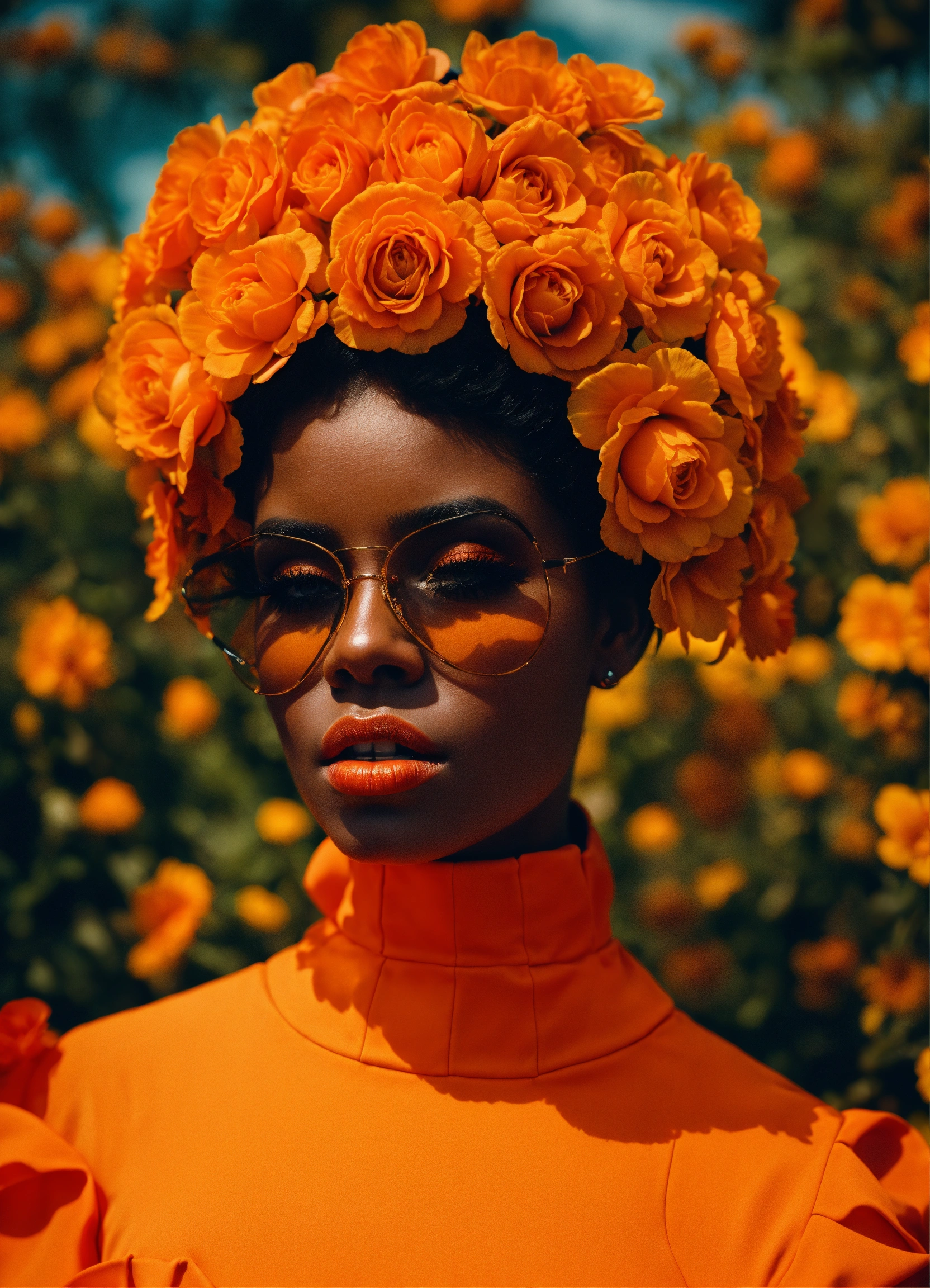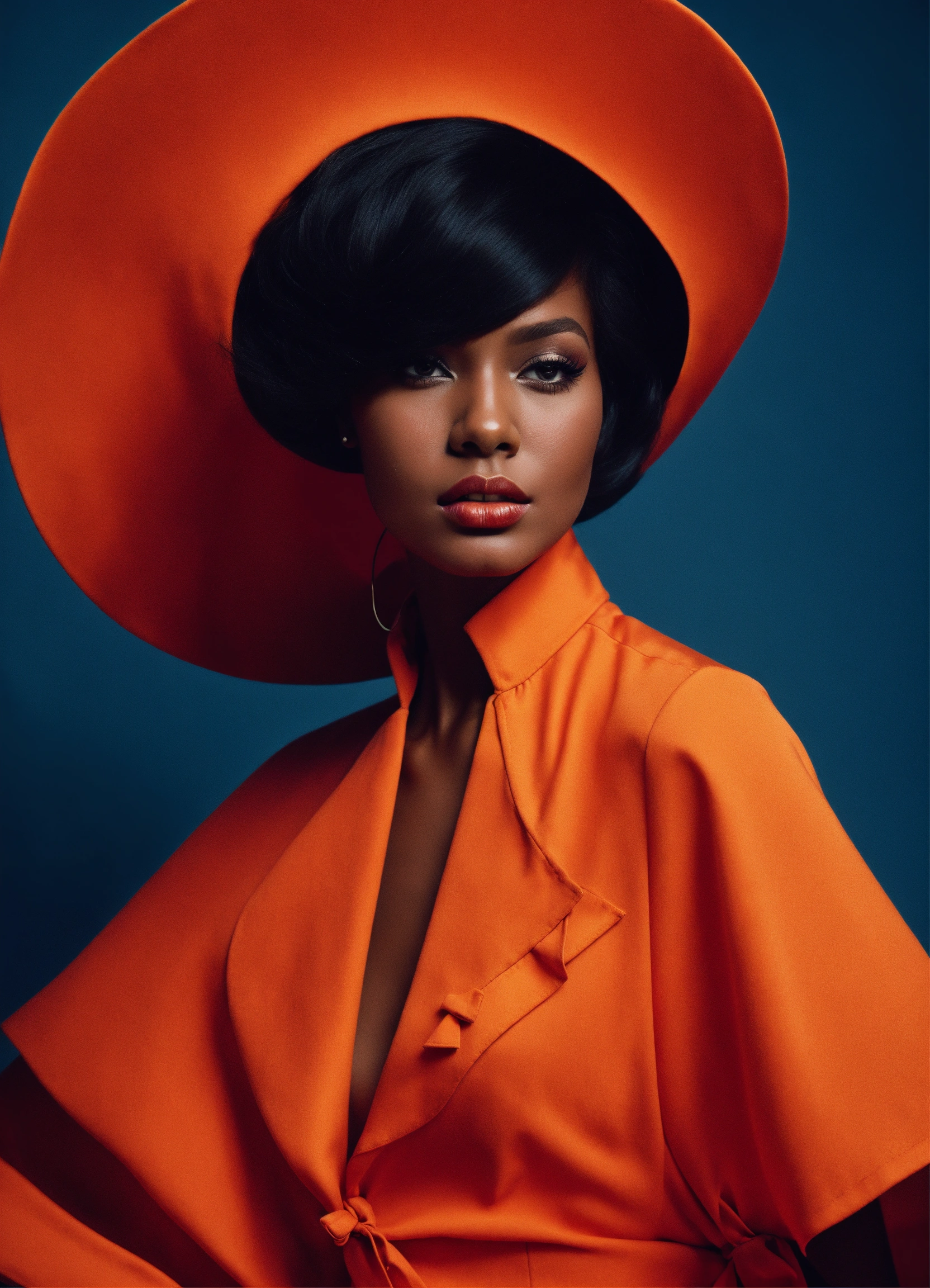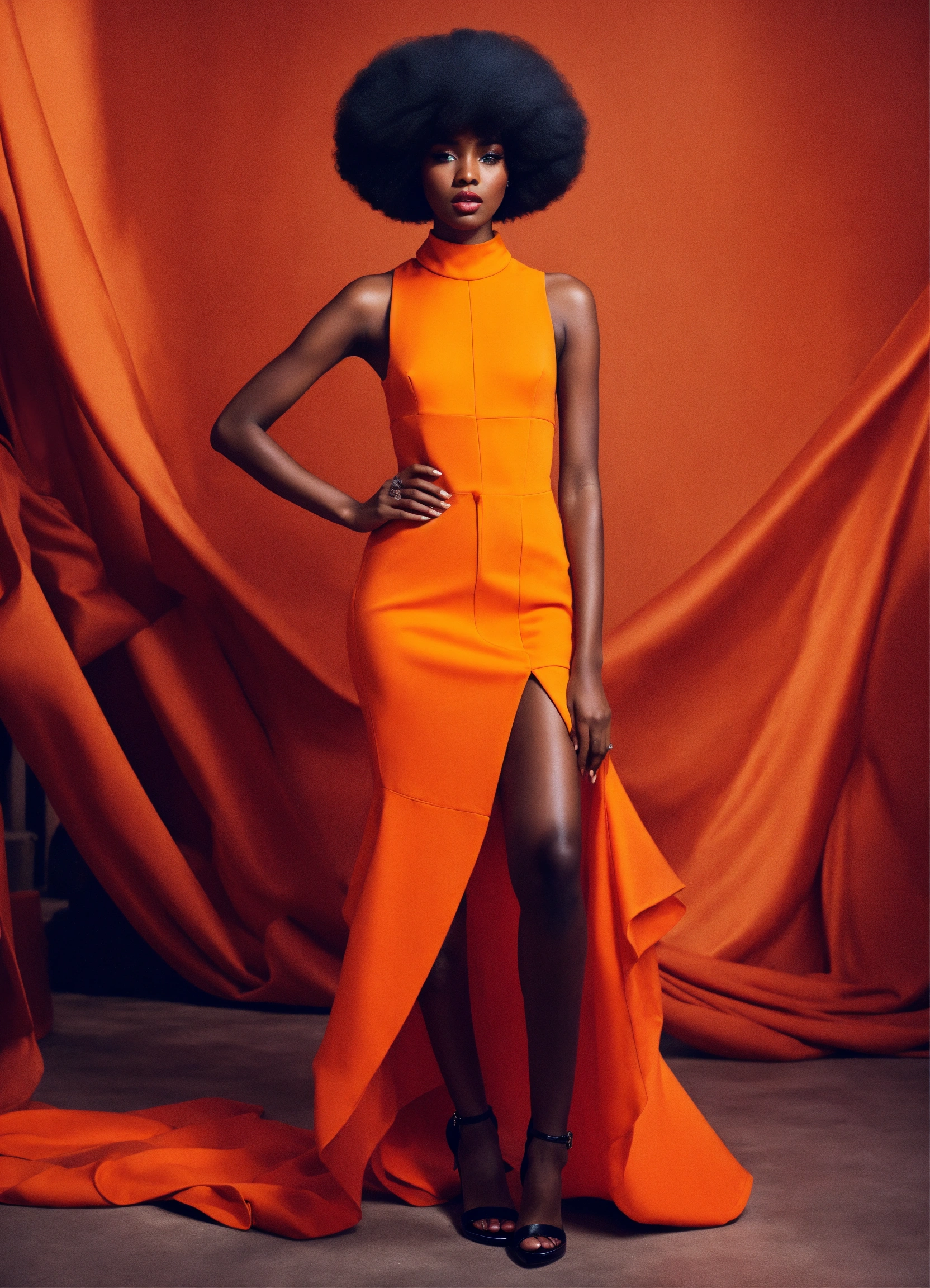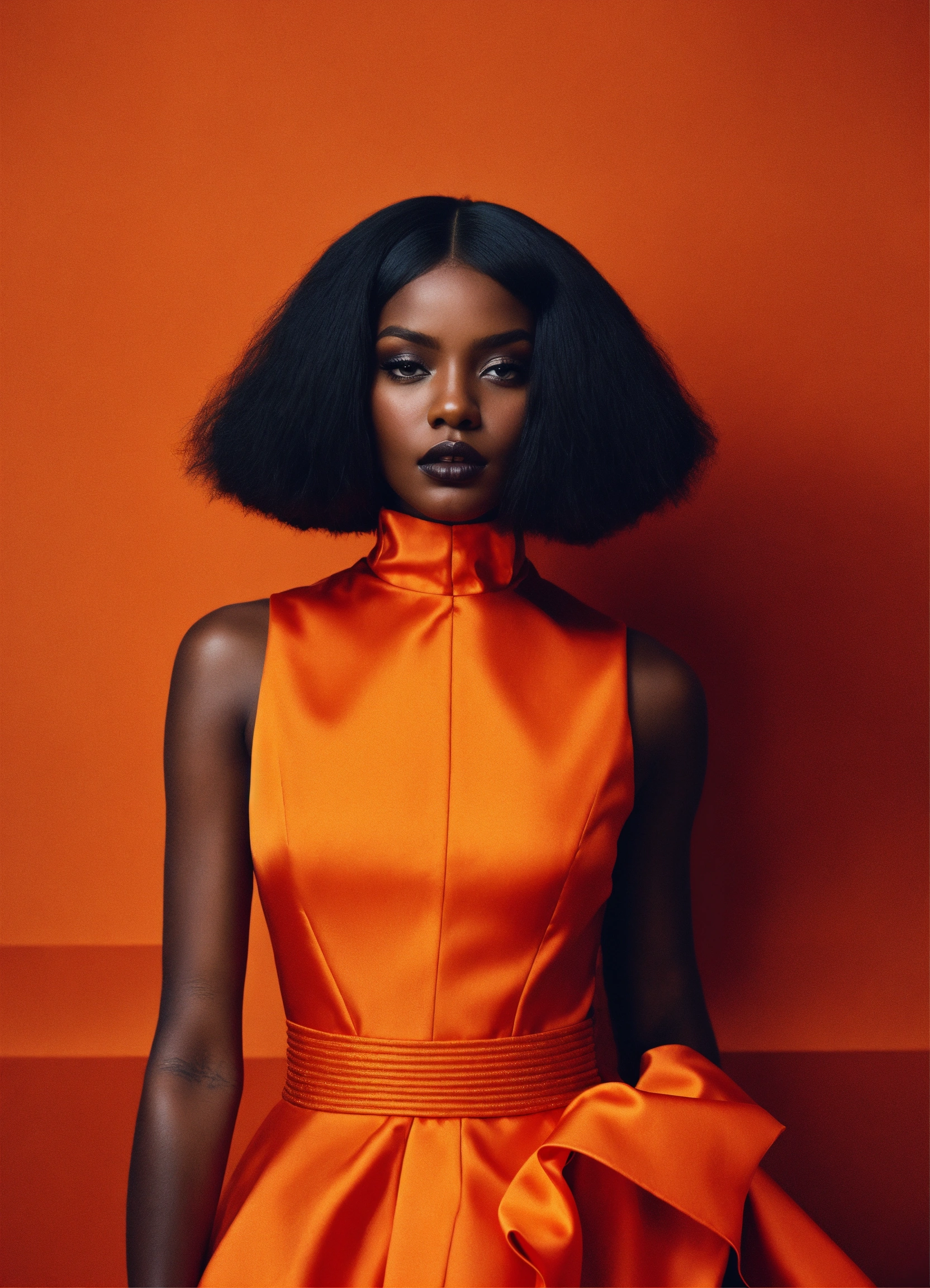 Avante garde high fashion beauty editorial, carmel complexion size 9 black woman dress in orange by flora borsi, style by flora borsi, bold, bright coolers, conceptual bob style hair, ((flora borsi))