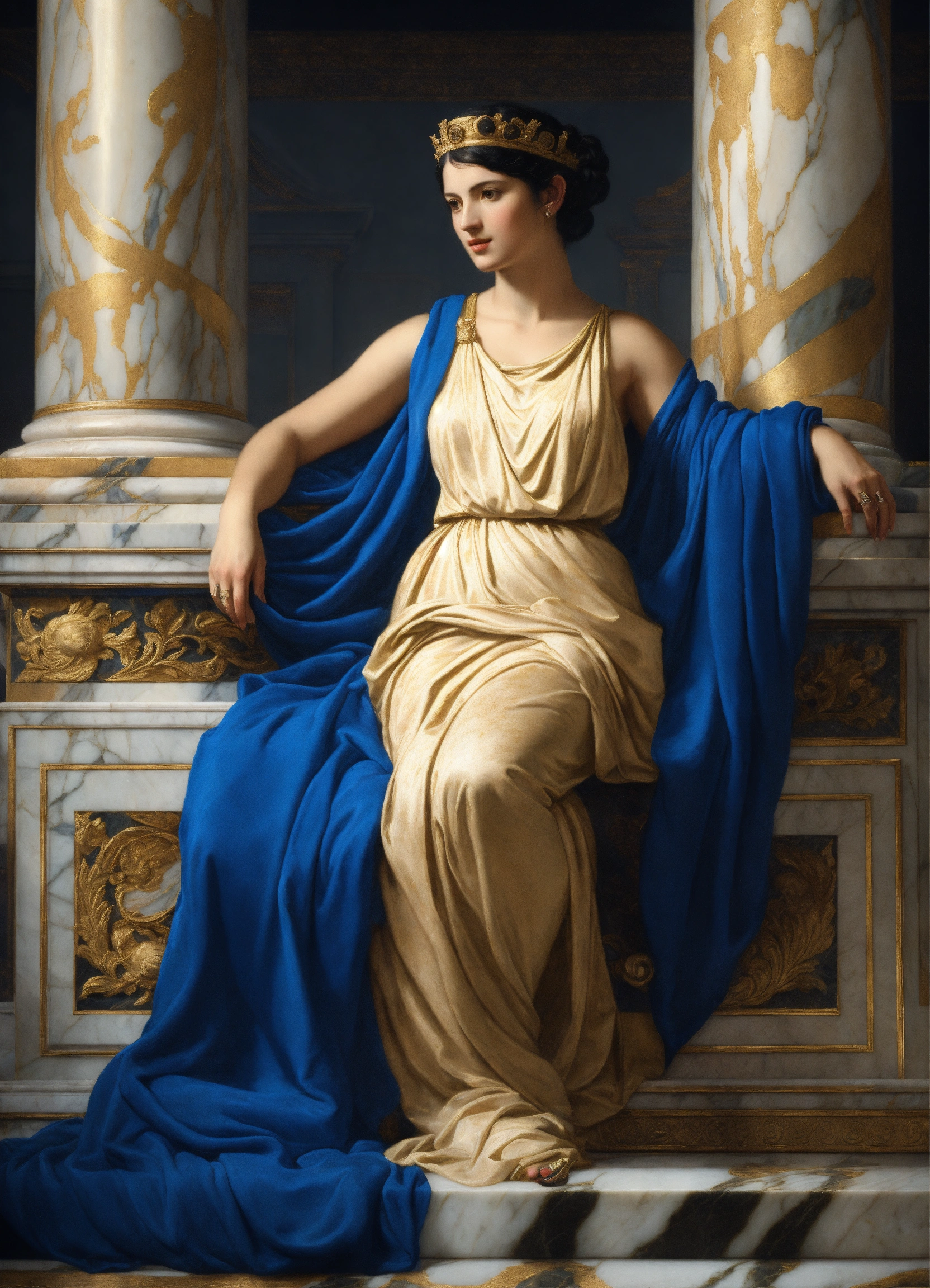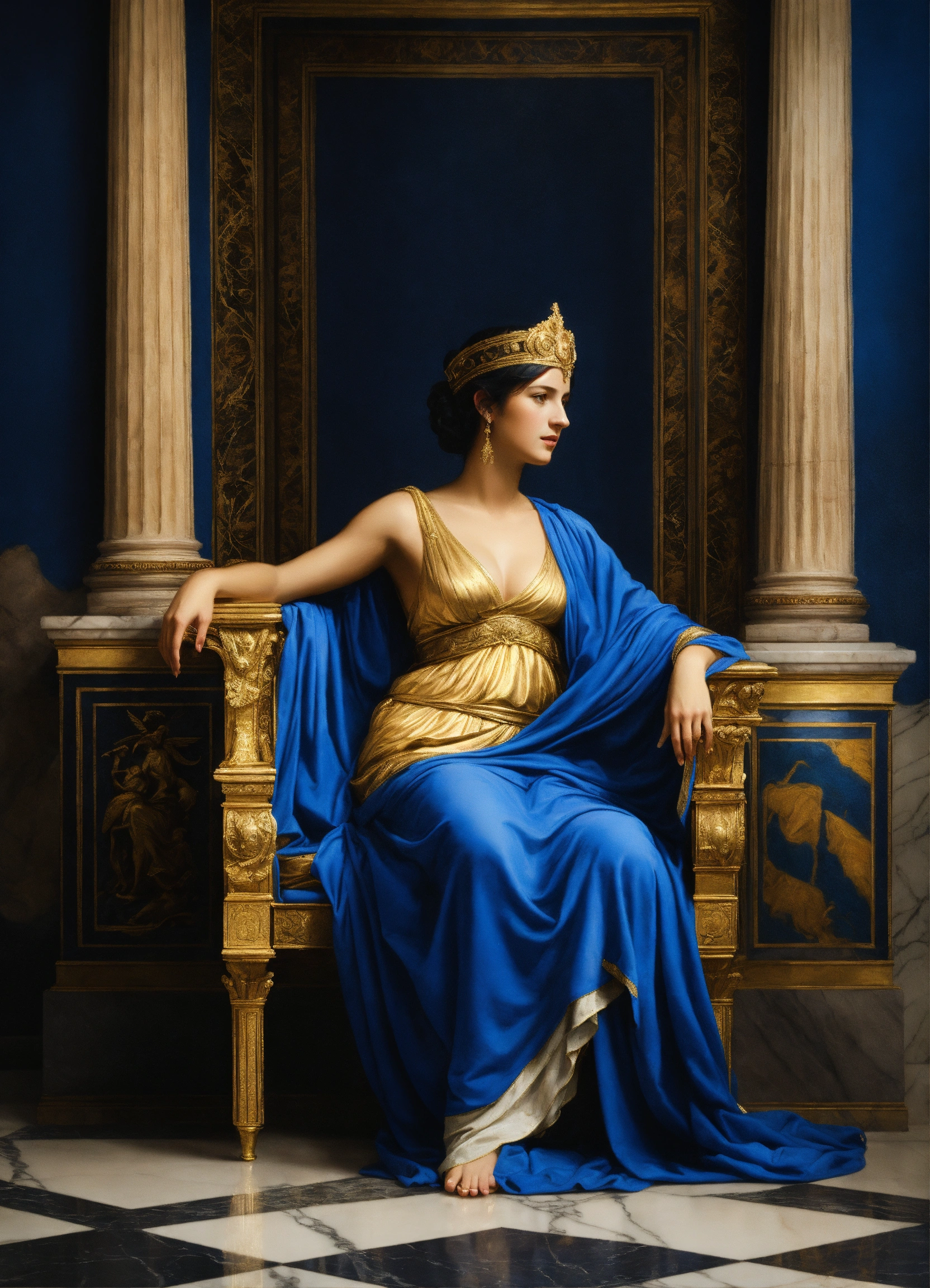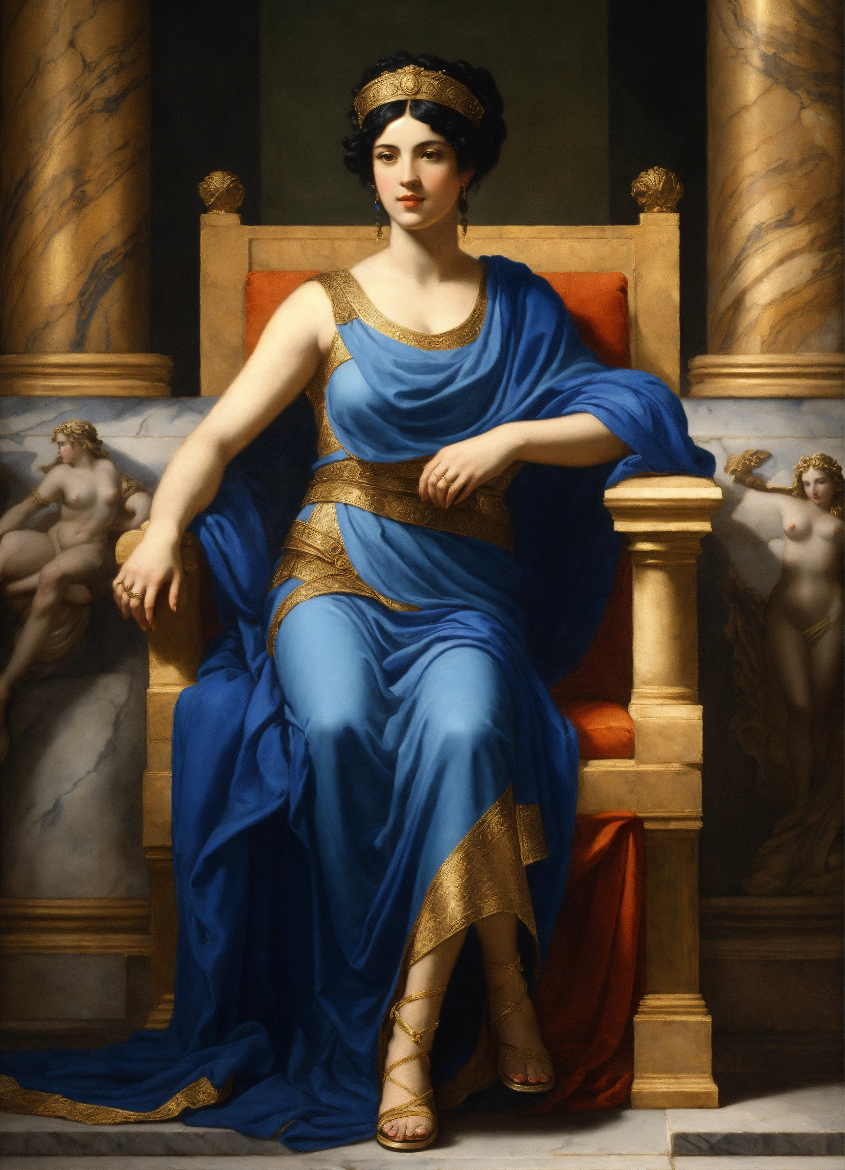 Neoclassical art, neoclassical painting, full body, hera, beautiful middle age woman, greek goddess, black hair, royal blue toga, marble throne