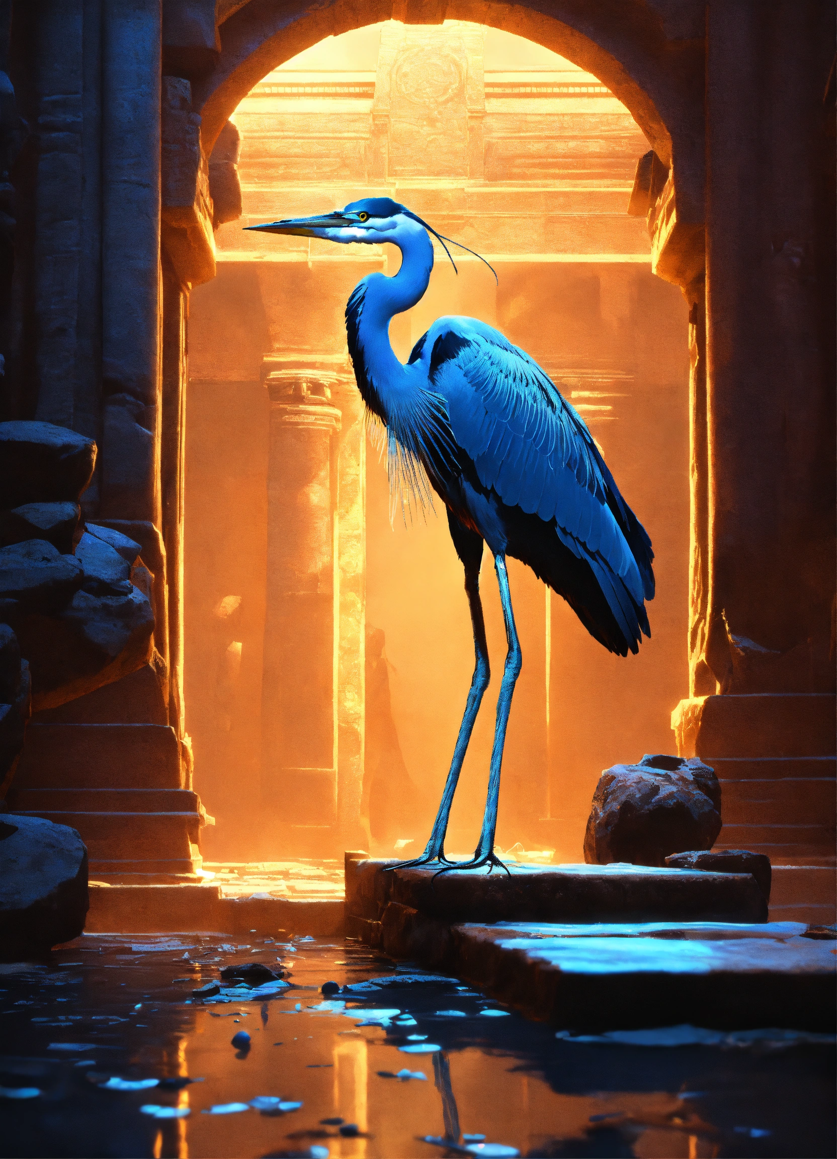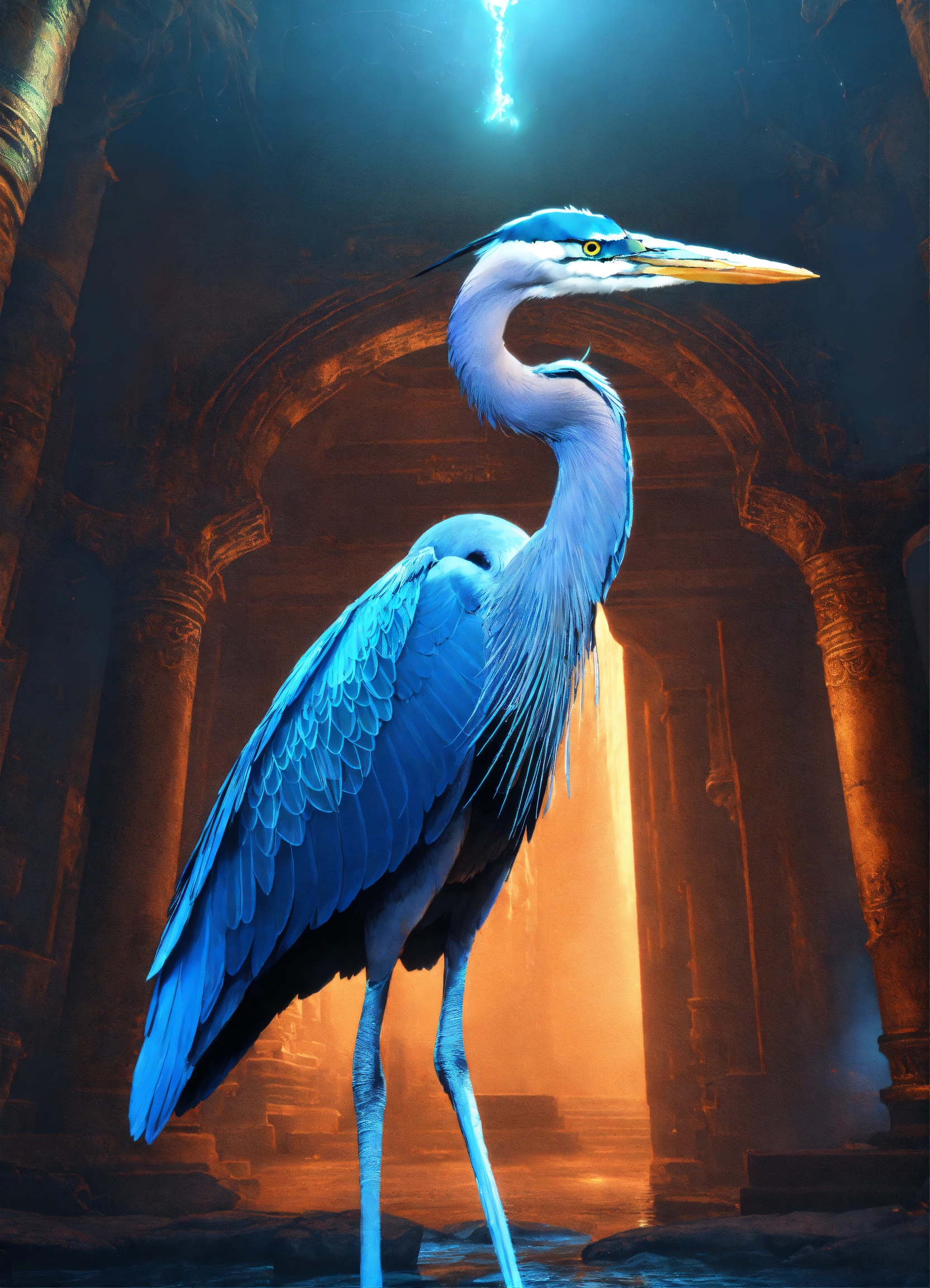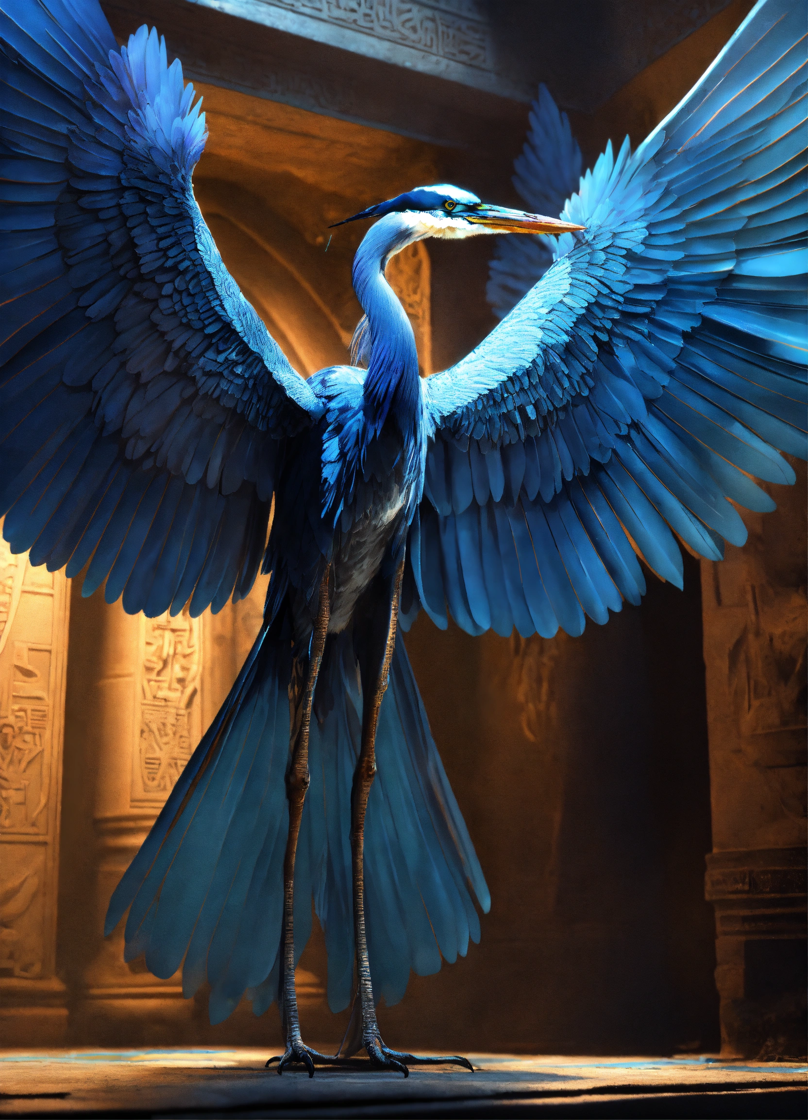 A 3d blue heron emerging from a dark hazy ancient kemet underworld, its wings glowing a blue bioluminescent, spreading its light throughout the halls, accurate animal anatomy.