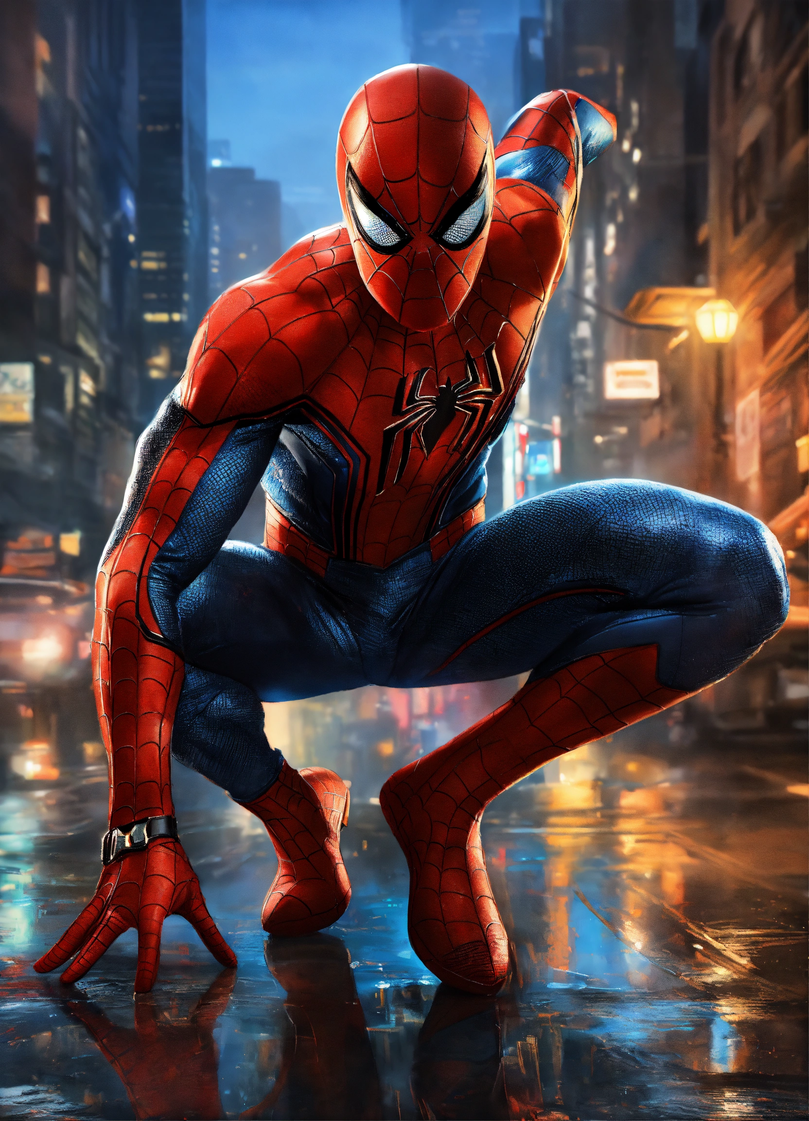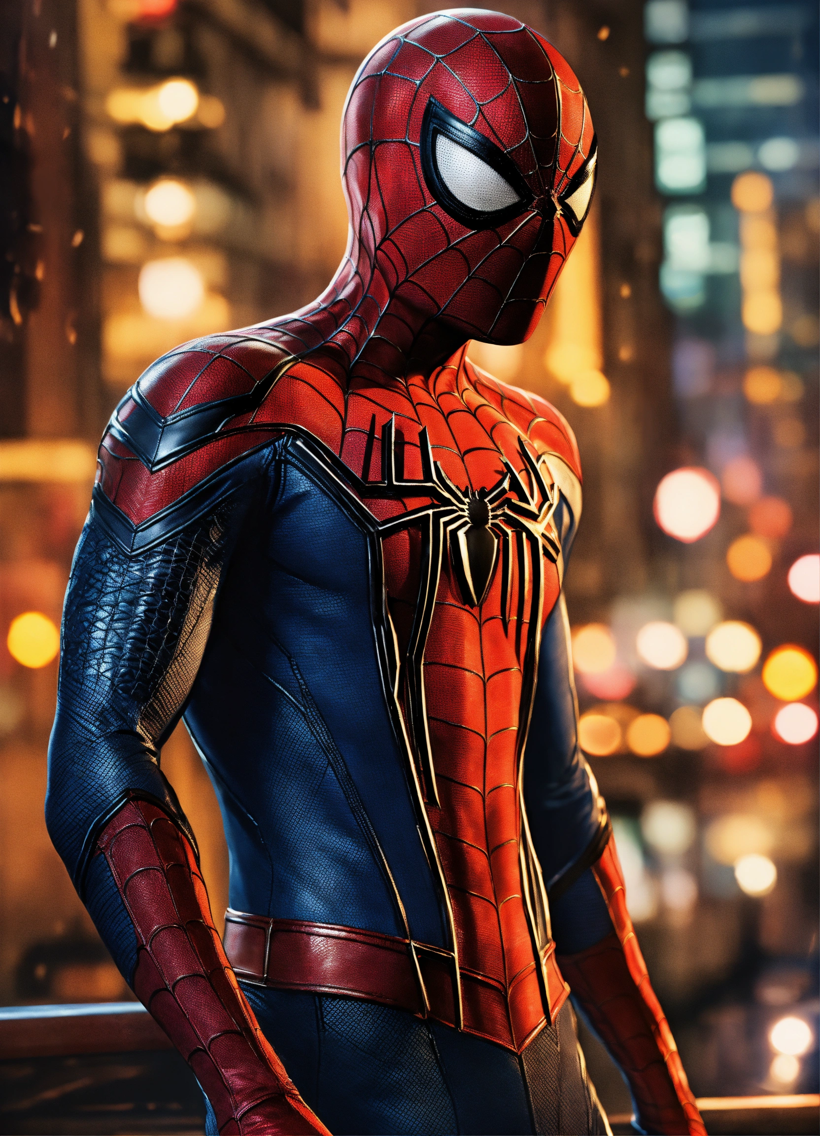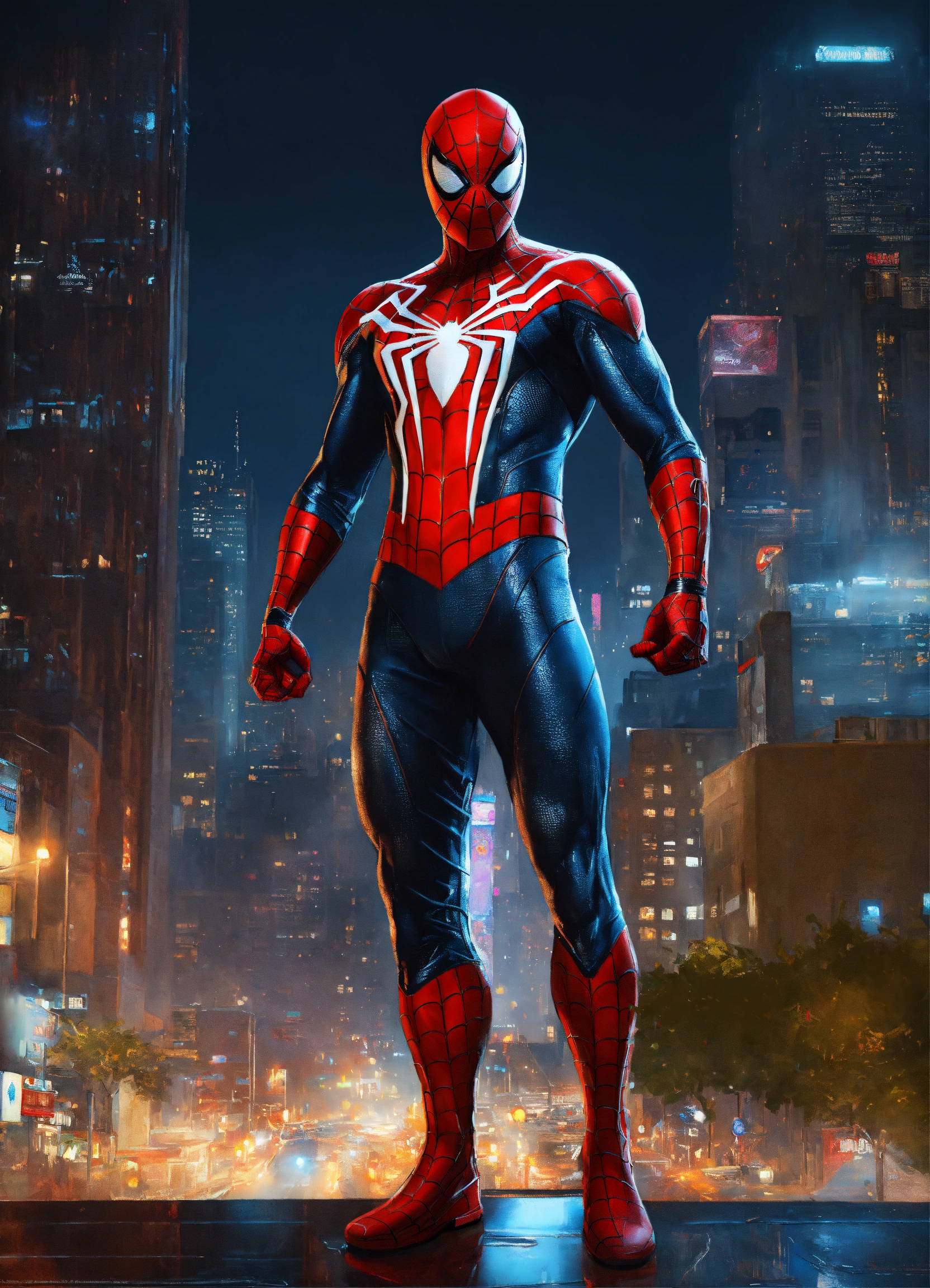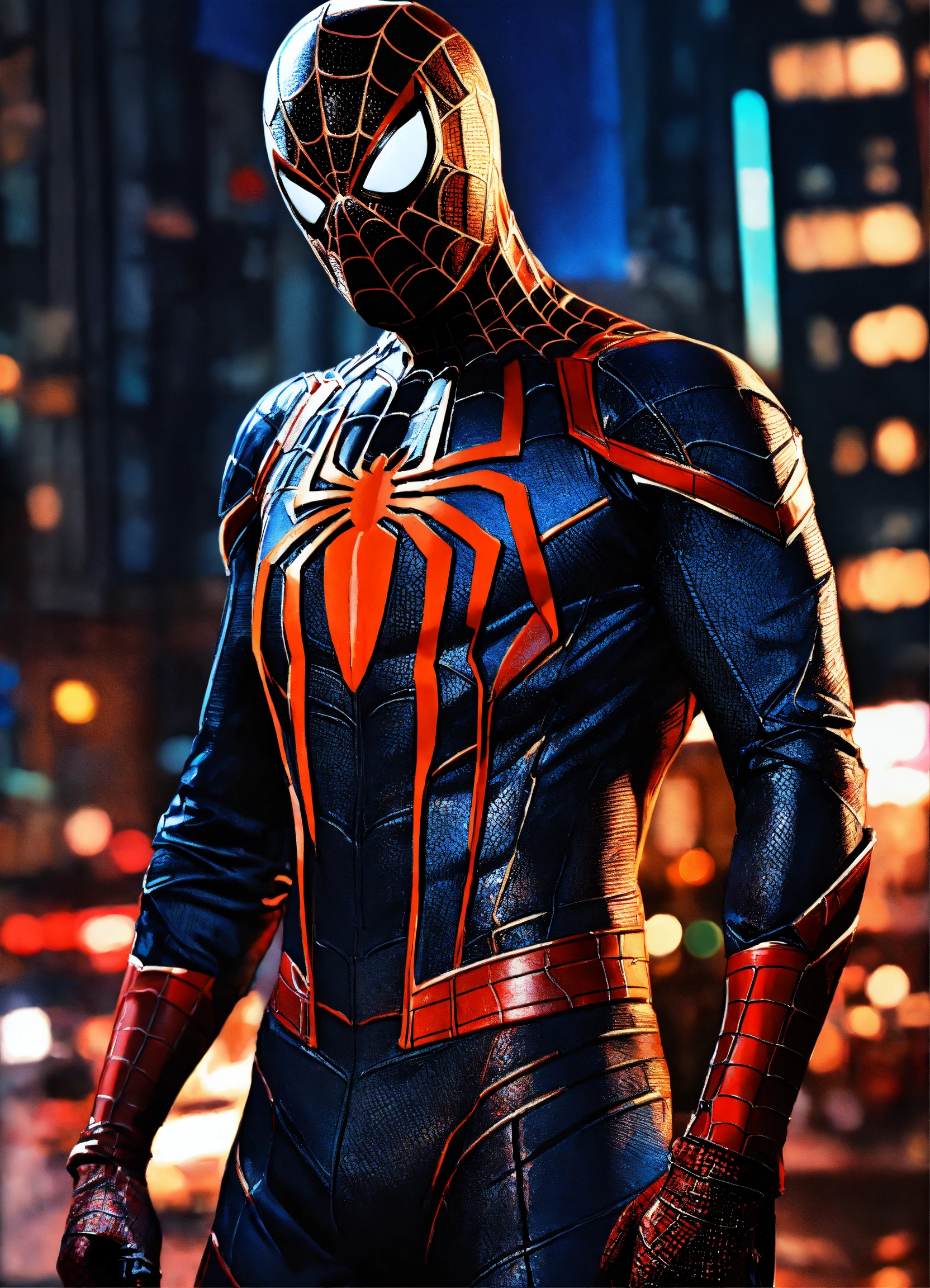 Portrait painting of spider-man wearing a leather suit, ultra realistic, concept art, intricate details, eerie, highly detailed, photorealistic, octane render, 8 k, unreal engine. art by artgerm and jim lee, pen and ink drawing, city scape, full body, night time