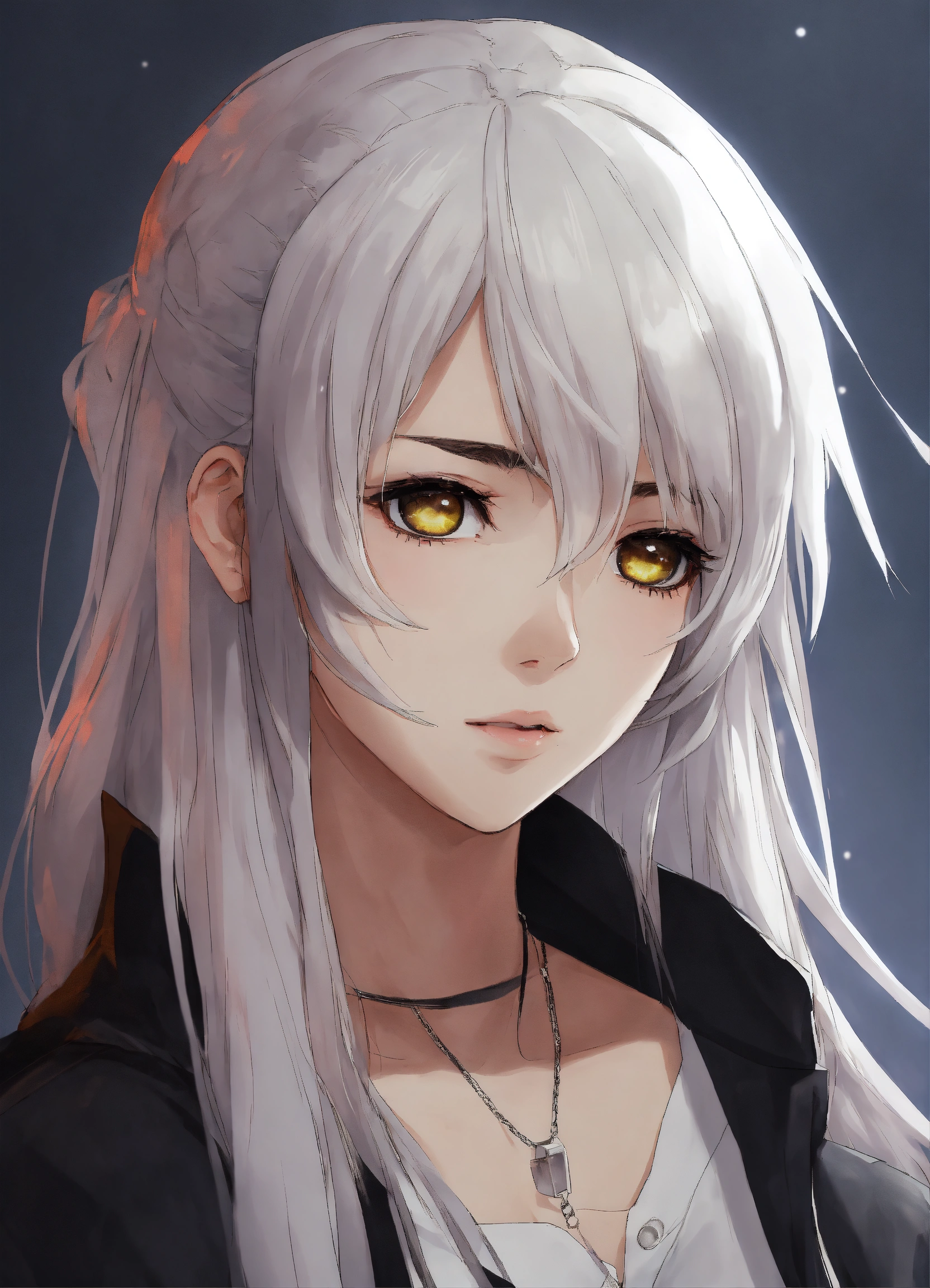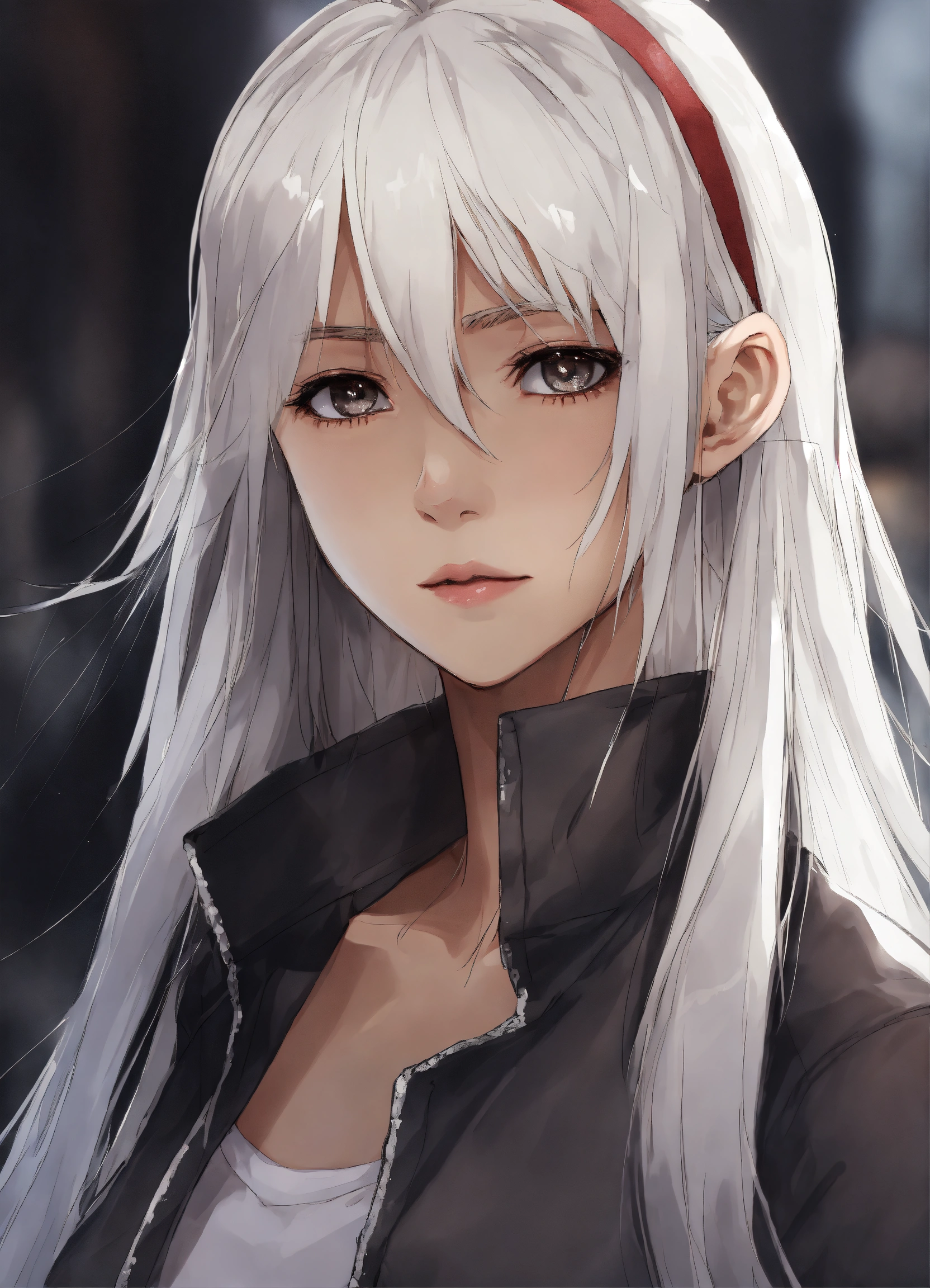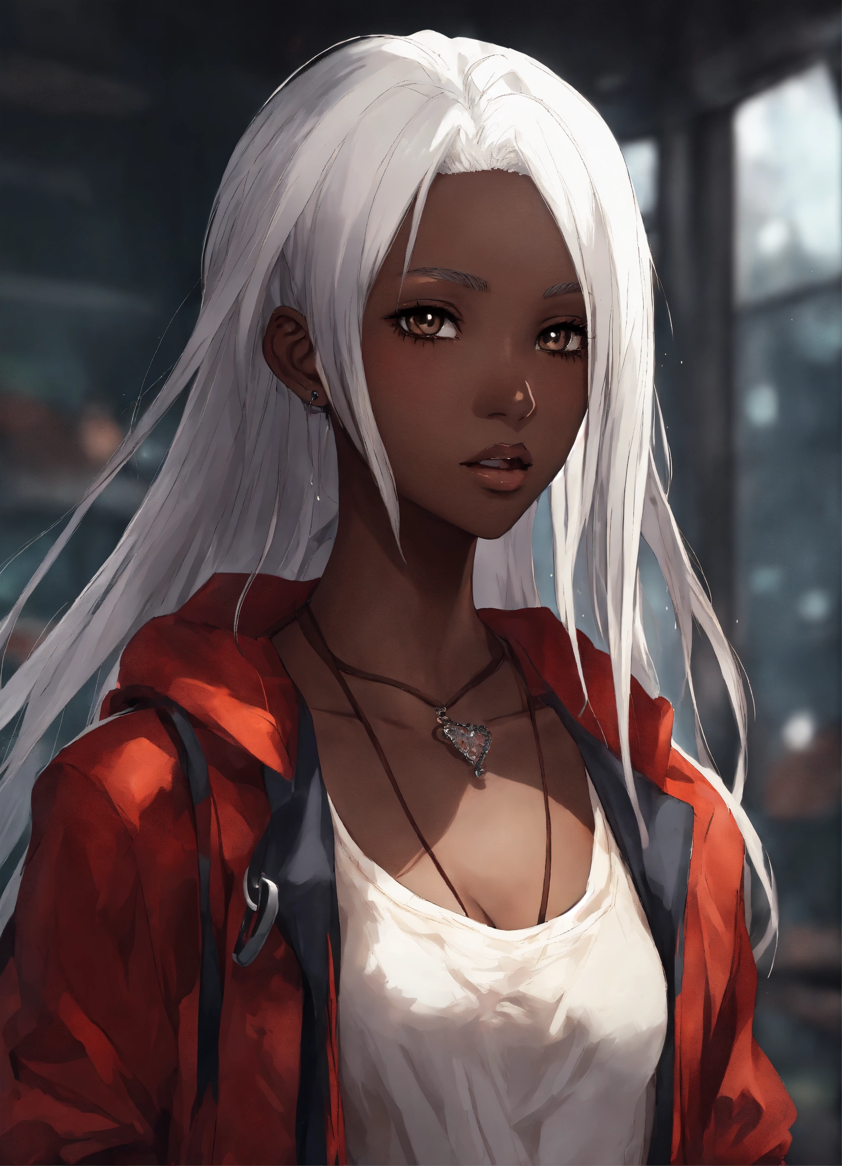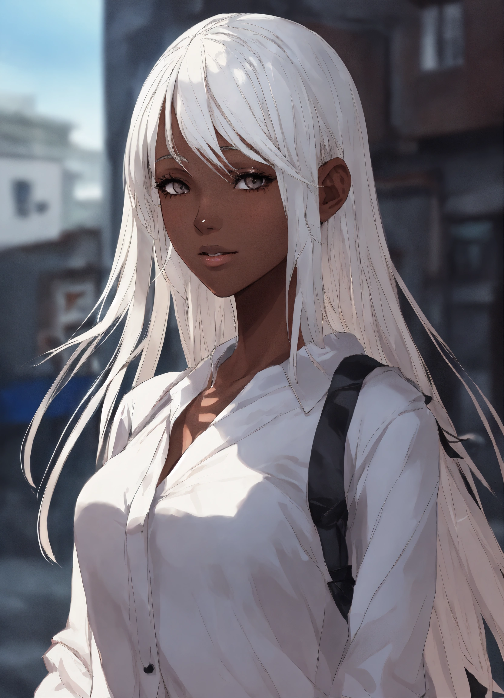 Girl 17 years old, dark skin, black eyes, fragile figure, white straight hair, height 173, anime reskin style