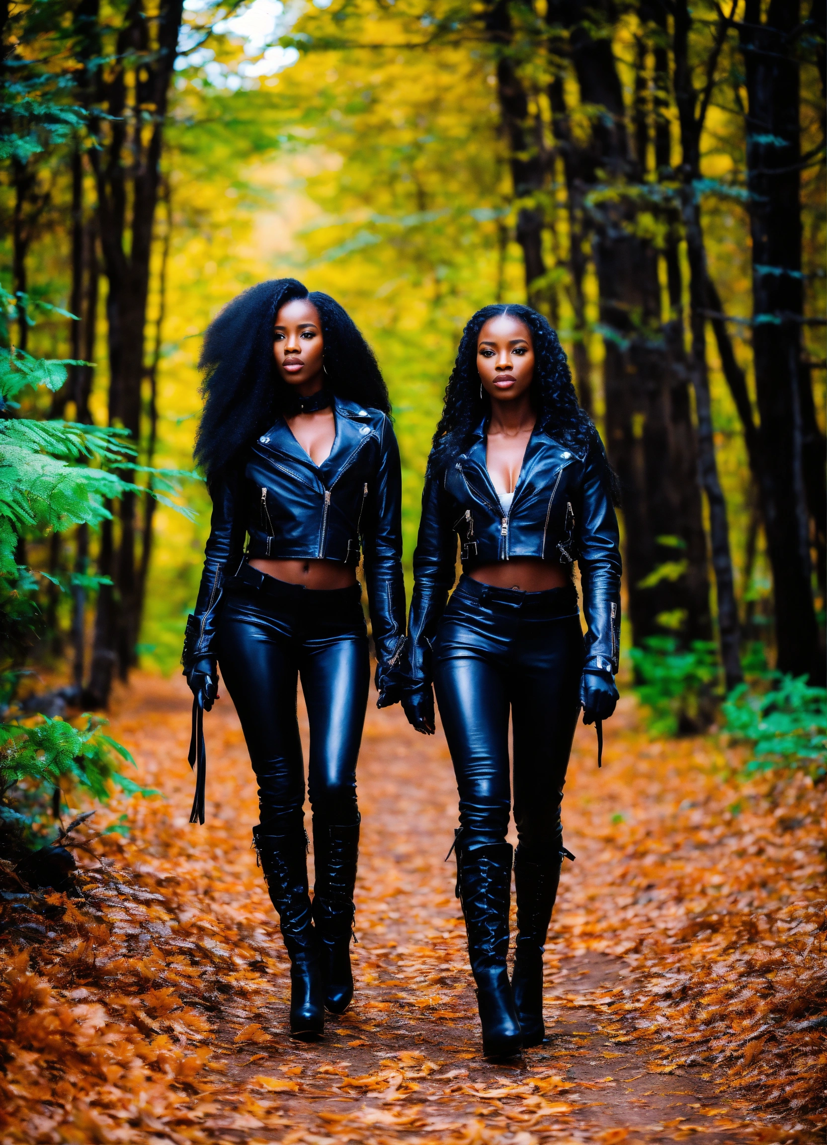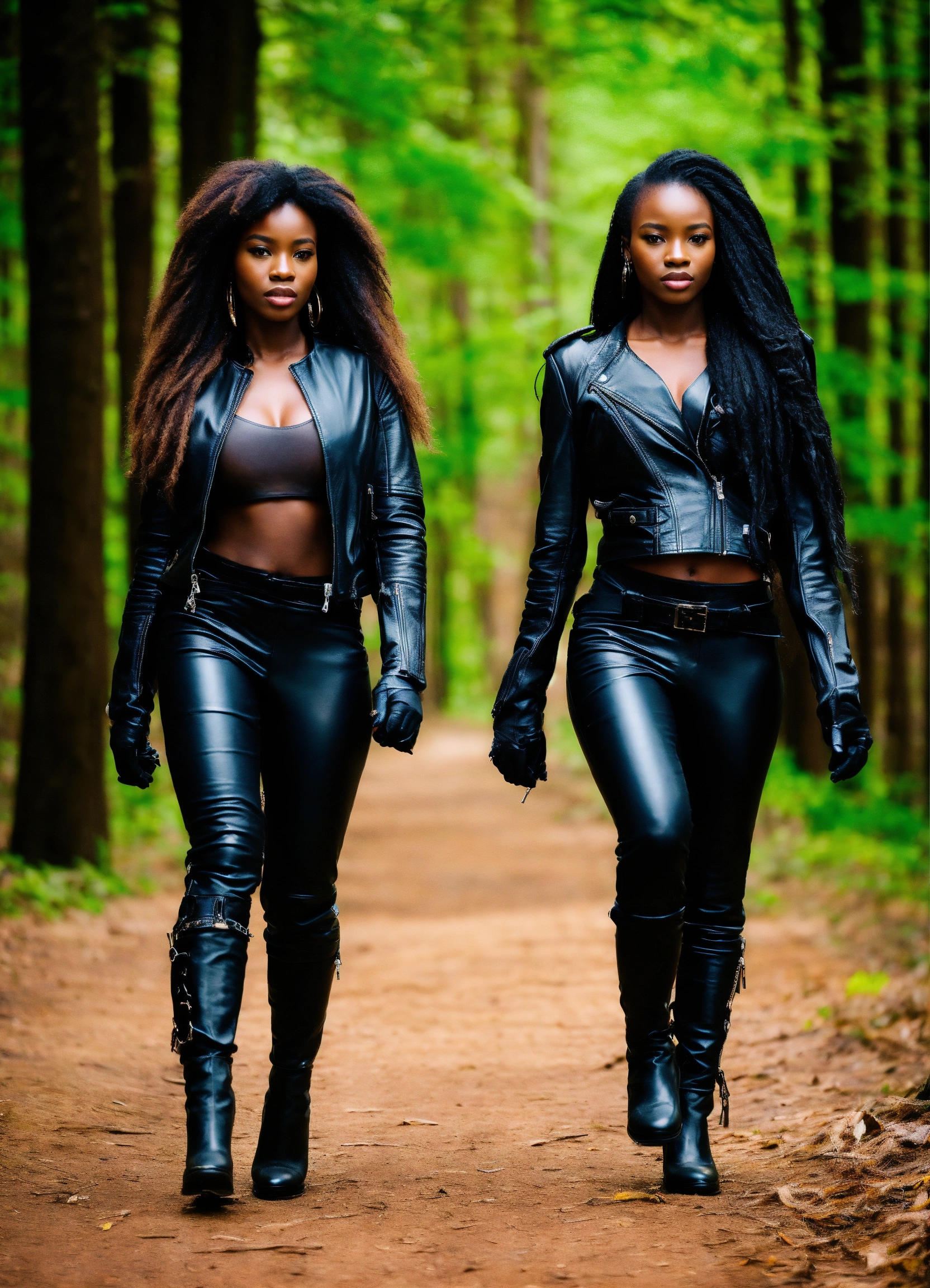 Two beautifull aafrican huntresses wearing black leather jacket, pants and gloves walking throgh the forrest very long hair