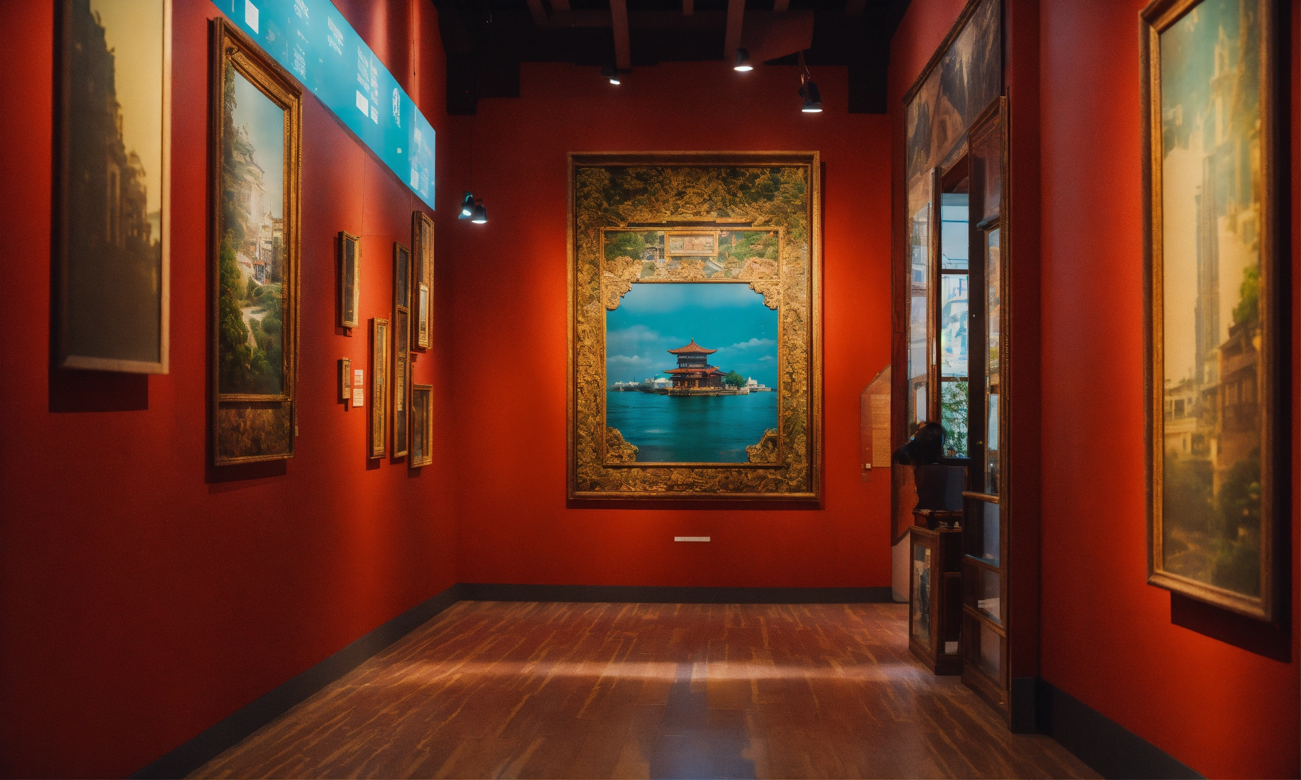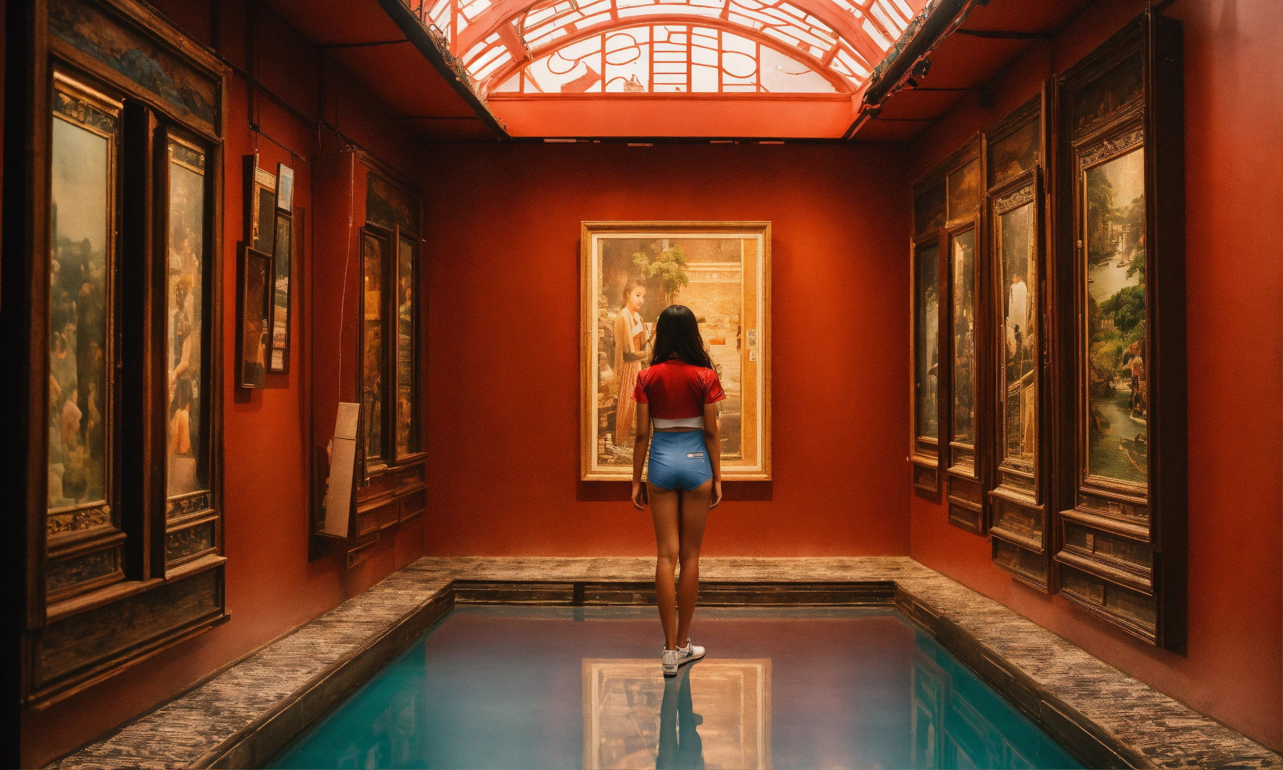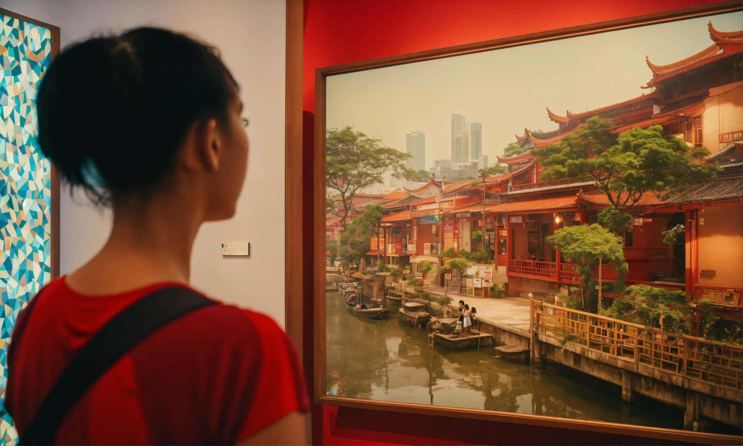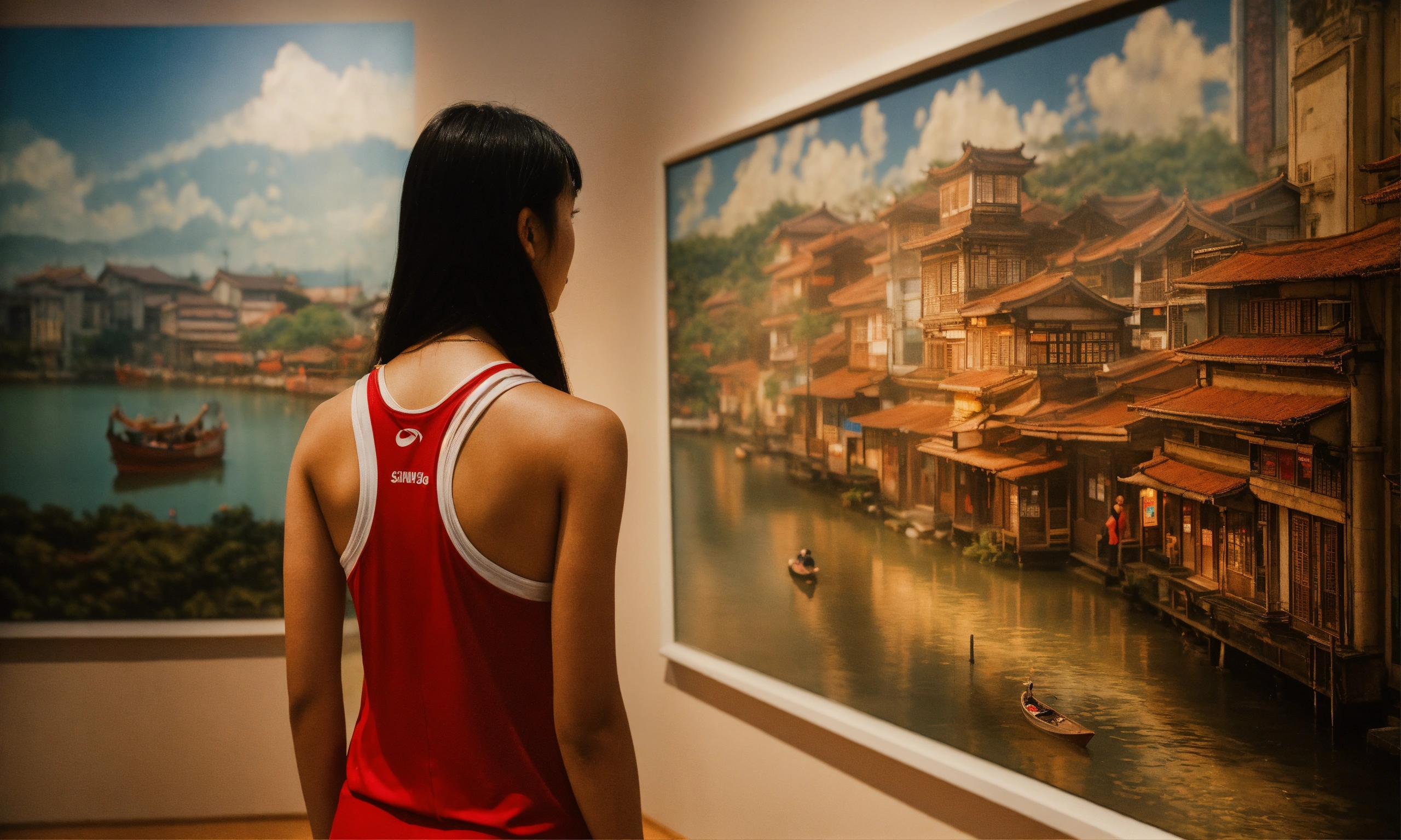 Ultra-realistic back medium shot of a tanned 18-year old asian female athlete, surprise expression, plain red singlet in a next-gen museum in singapore, in a room with highly detailed augmented reality screen as walls playing a fishing village, shophouses, and lee kwan yew, historic, a window at the side of the studio showing showing singapore's old city scape, sci-fi, modern nostalgia, breathtaking, highly detailed, cinematic, 70mm camera, portra 800 film, film grain, reflections on glossy museum floor