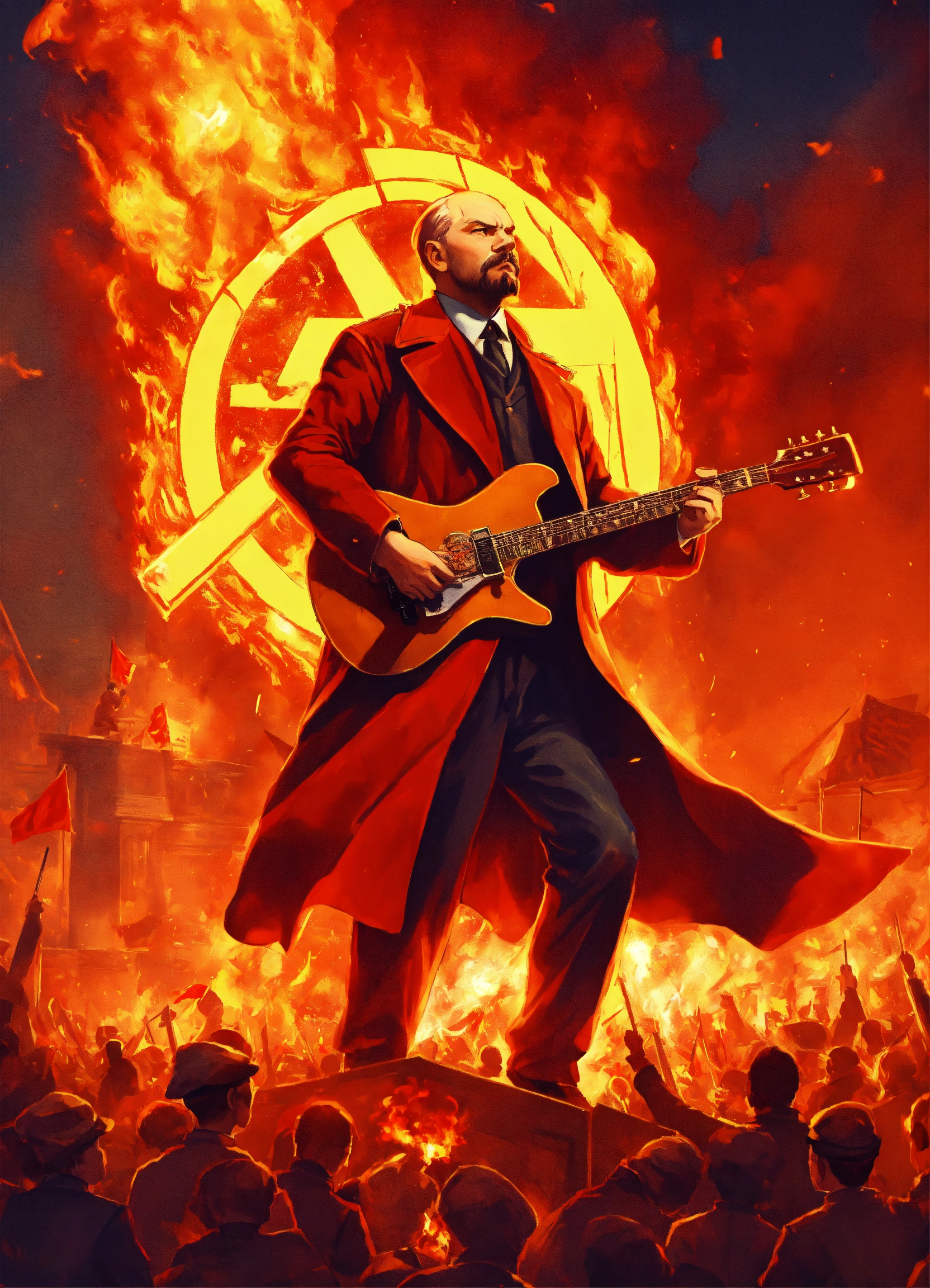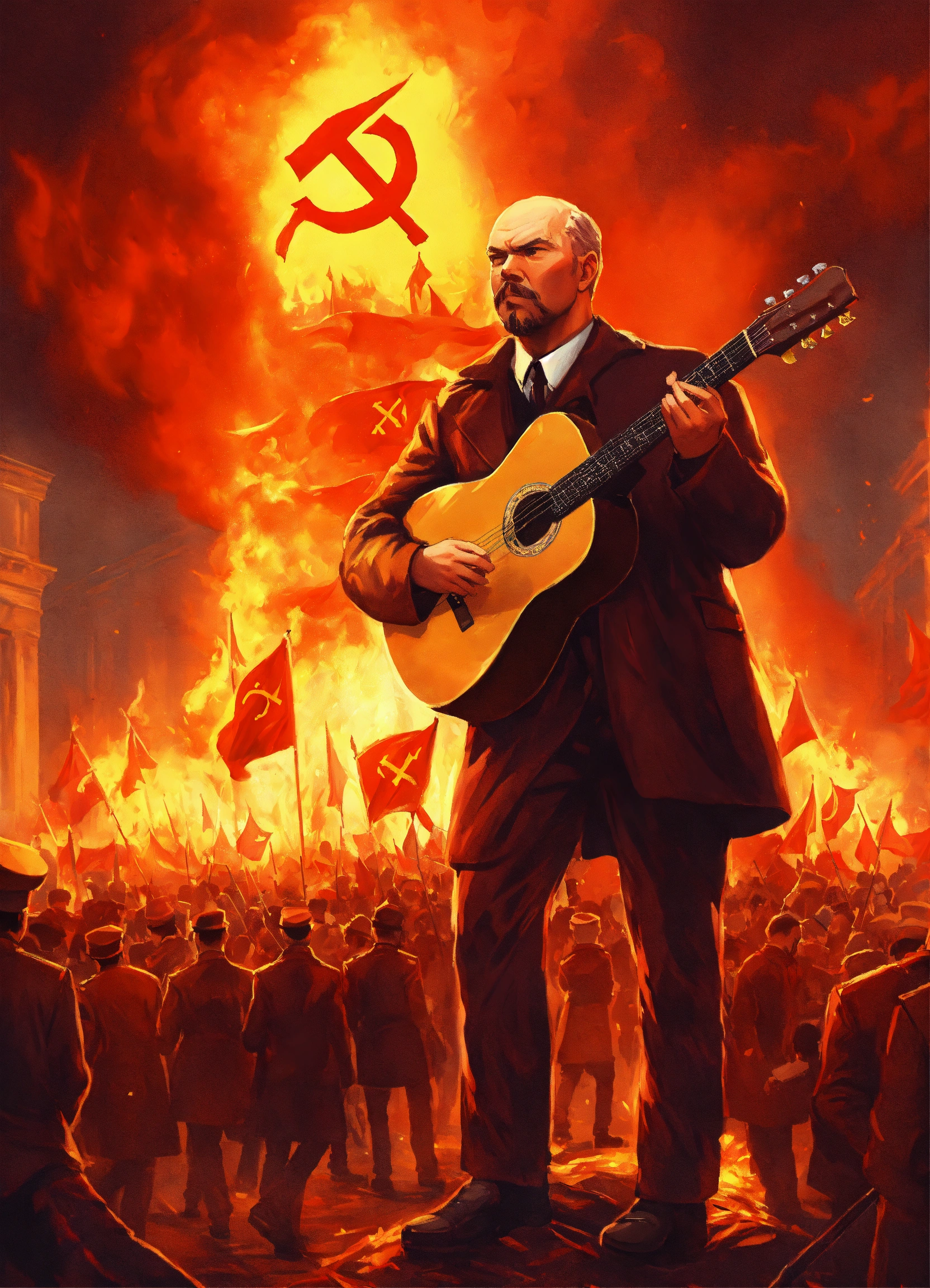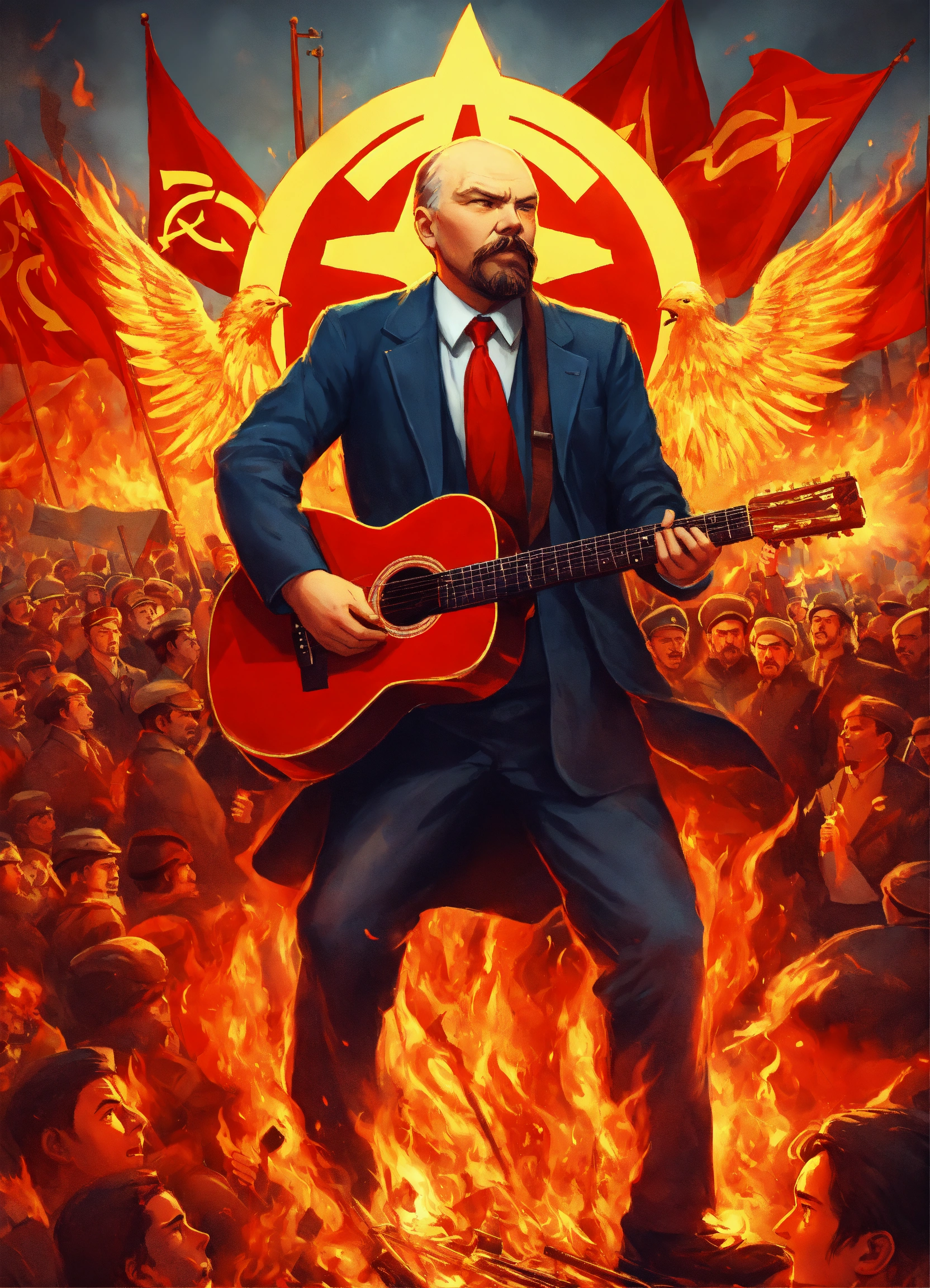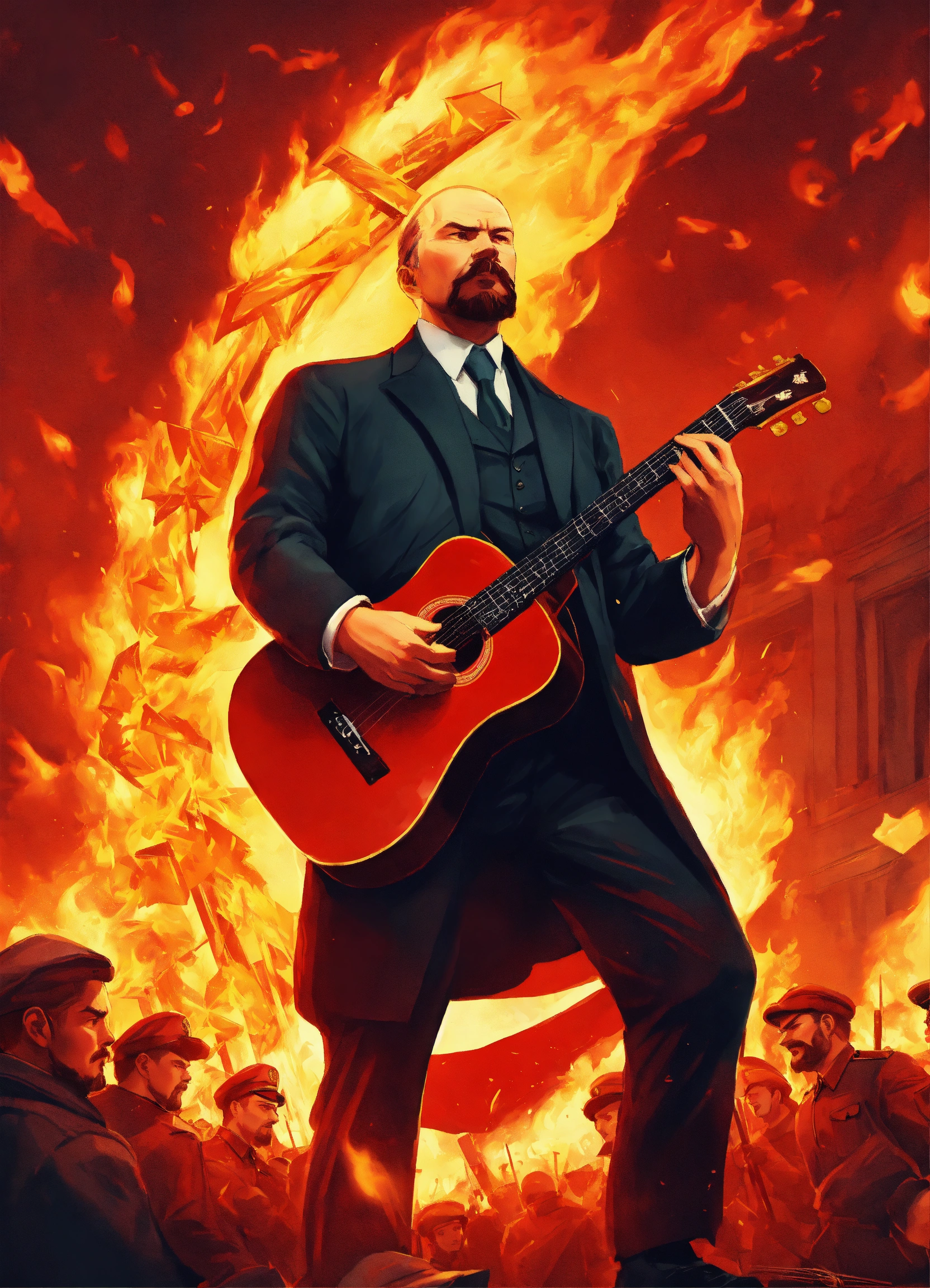 Illustration lenin, with a determined look, is playing a guitar that's ablaze, with the hammer and sickle emblem glowing amidst the flames. the crowd behind is equally fiery, cheering in a revolutionary fervor. with a red flag with the communist symbol in yellow in the background. super realistic 8k image